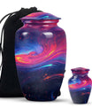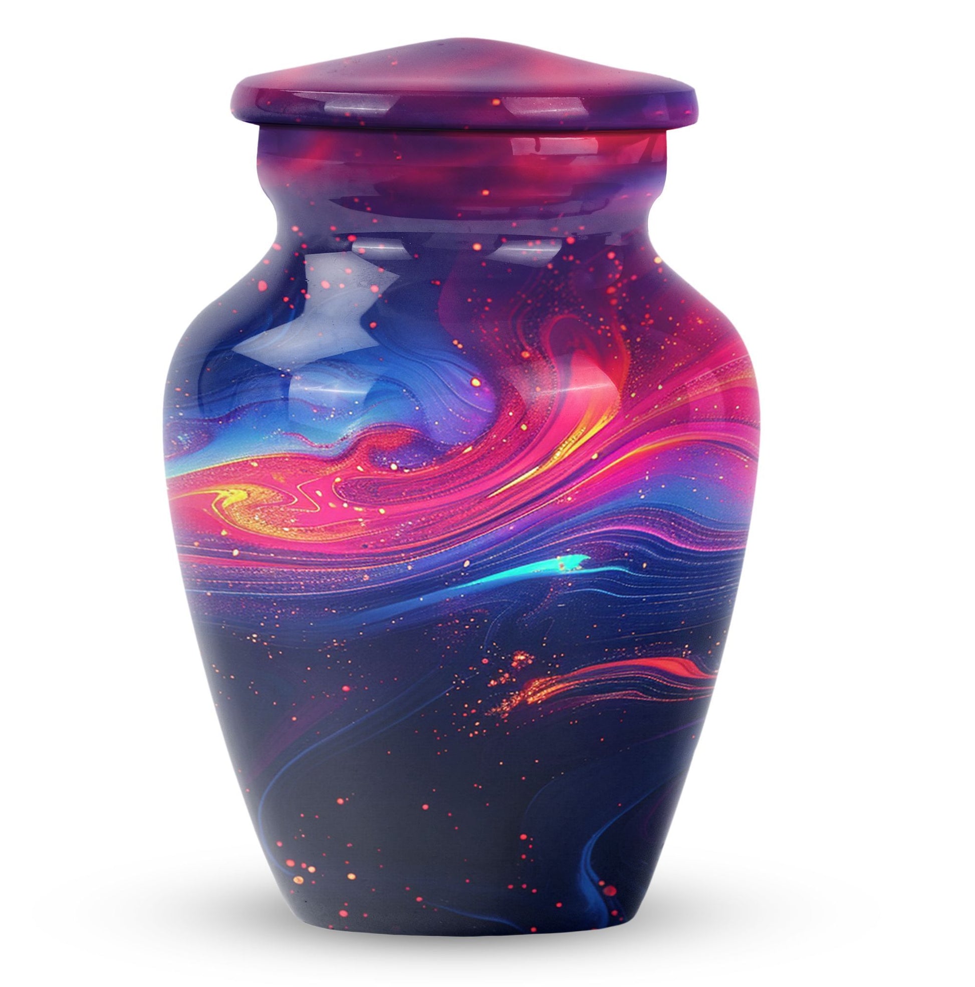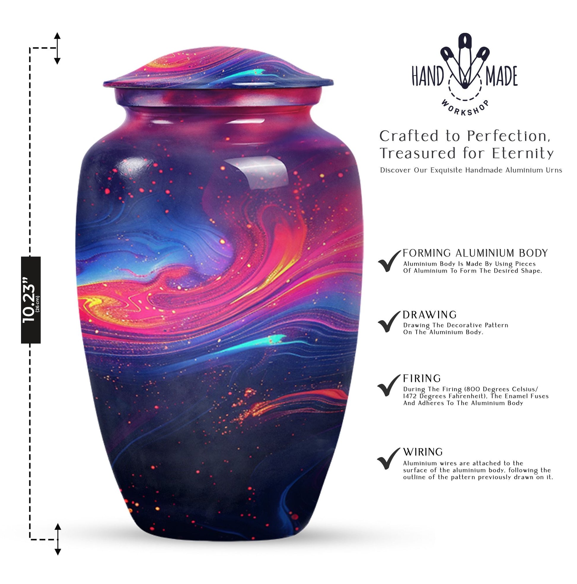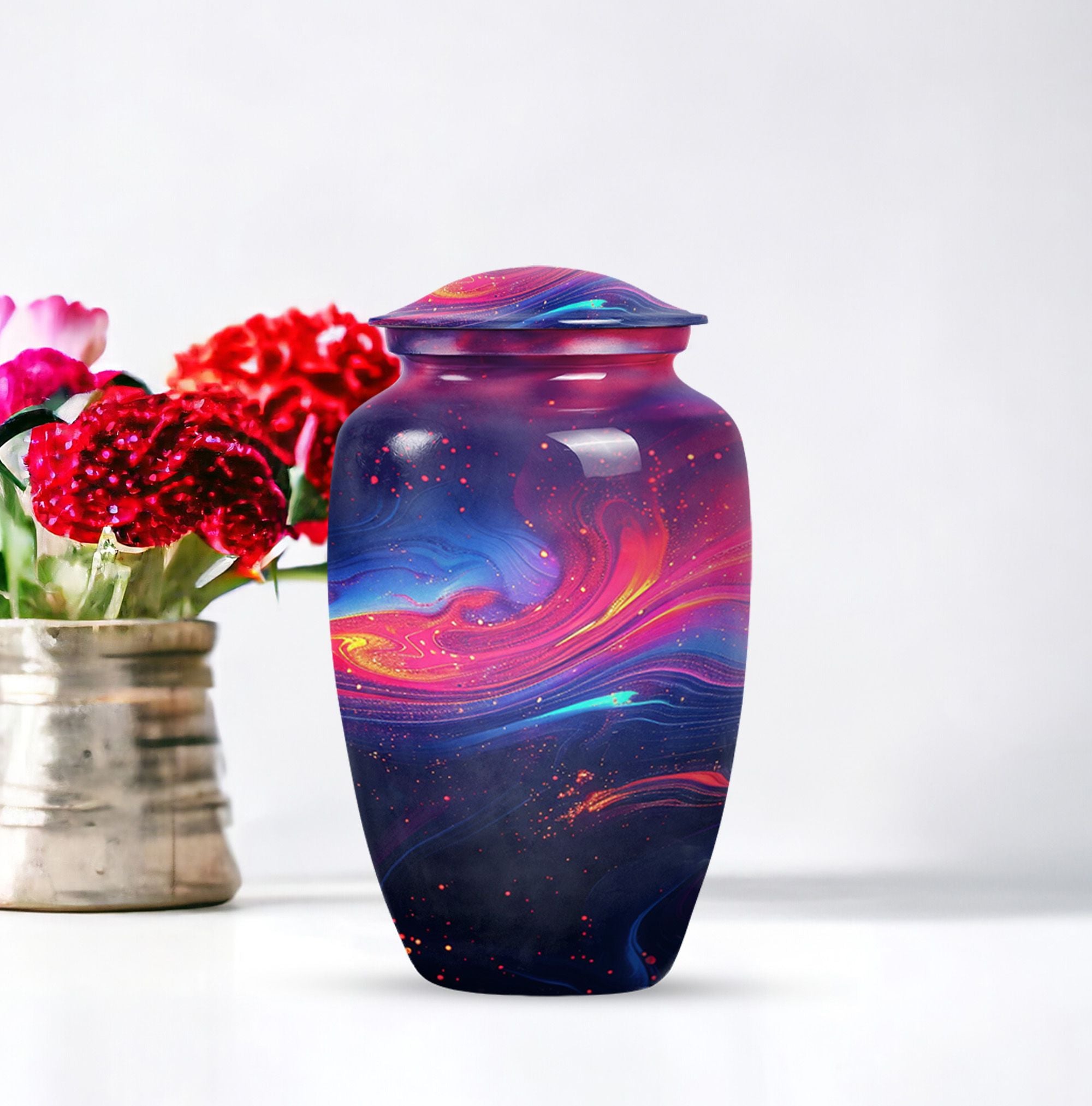 Crafted with utmost respect and dignity to honour loved ones, this Abstract Urn serves as a beautiful memorial medium. Specifically designed for ceremonial use, this large aluminium urn carries up to 200 cubic inches of ashes, its imposing 10-inch height subtly representing the strong presence your loved one had. Forged from high-quality Aluminium, ensuring its durability and longevity. This urn comes with customization options so that you may personalize it with engraved names, giving a personal and intimate touch to this vital memorial piece. Encased in a velvety pouch, it maintains the integrity of the ashes while adding an extra layer of protection. The classic-style abstract urn is a poignant piece, weighty at 3.3 pounds, yet instilling a sense of enduring love, and capturing indelible memories within its sacred walls. This urn is likely to be appreciated in searches involving keywords like 'funeral burial urn's', 'cremation urns for human ashes', and other similar phrases. Let's respect and remember our lost ones with this dignified ceremonial supply.