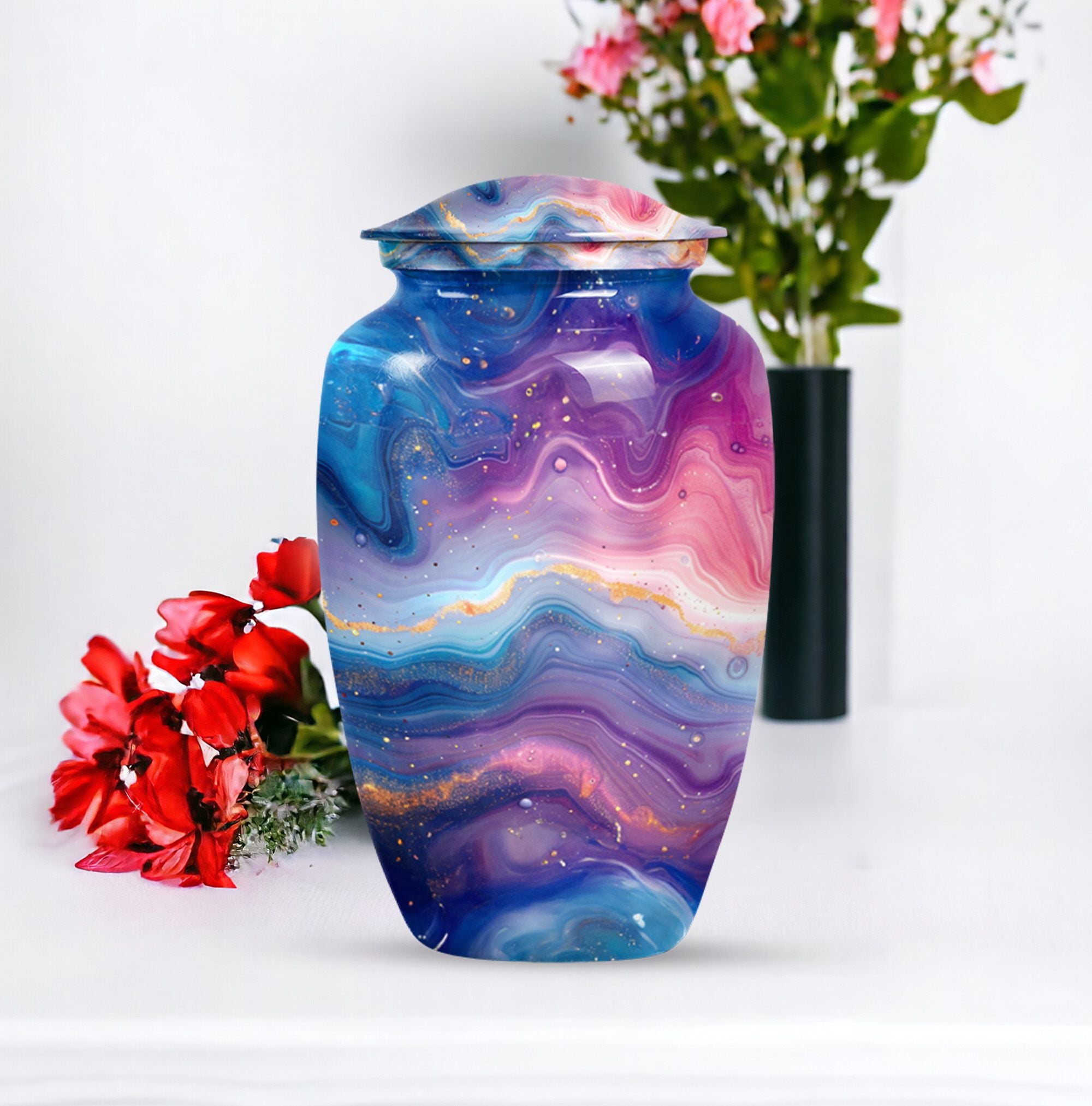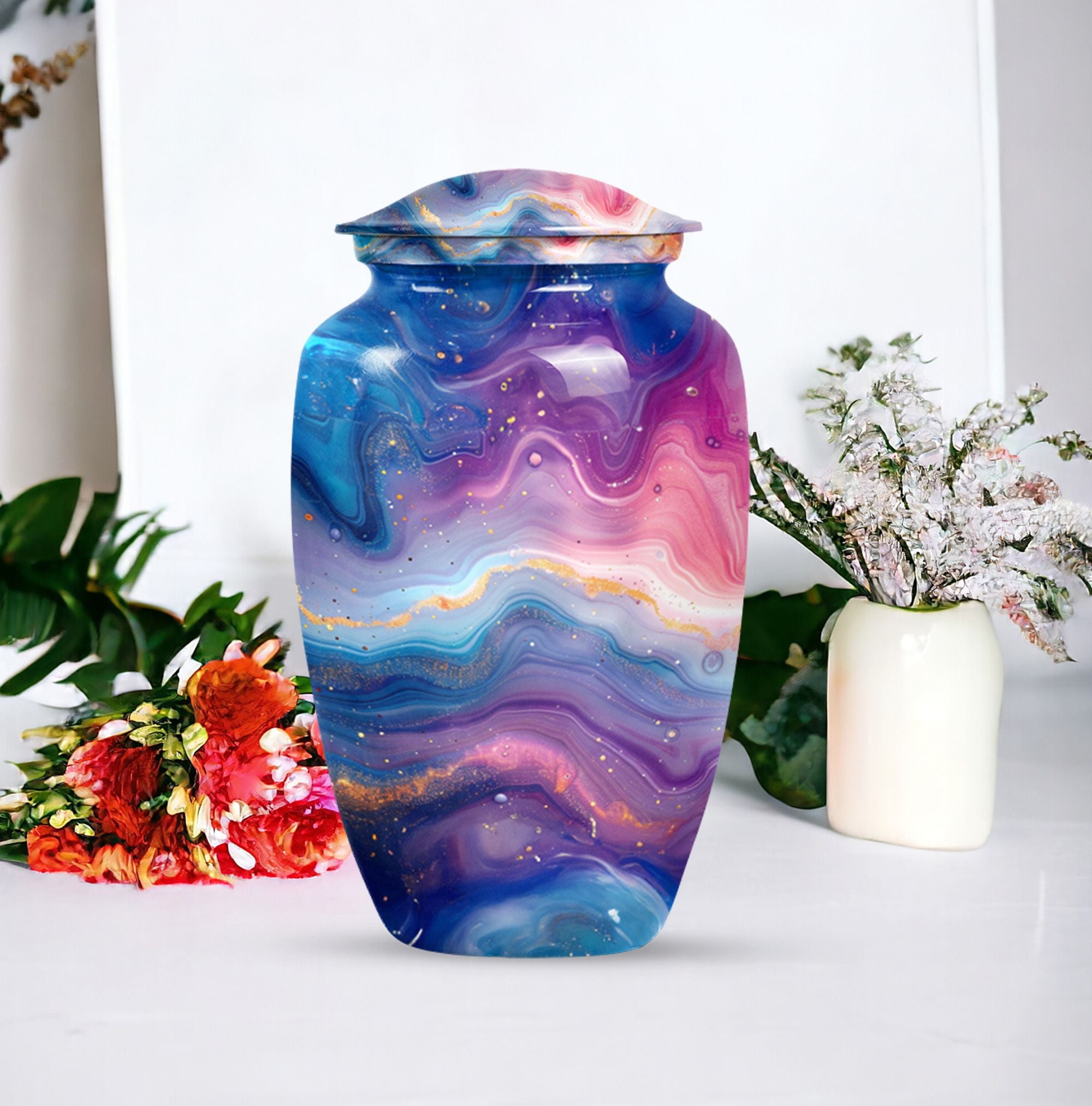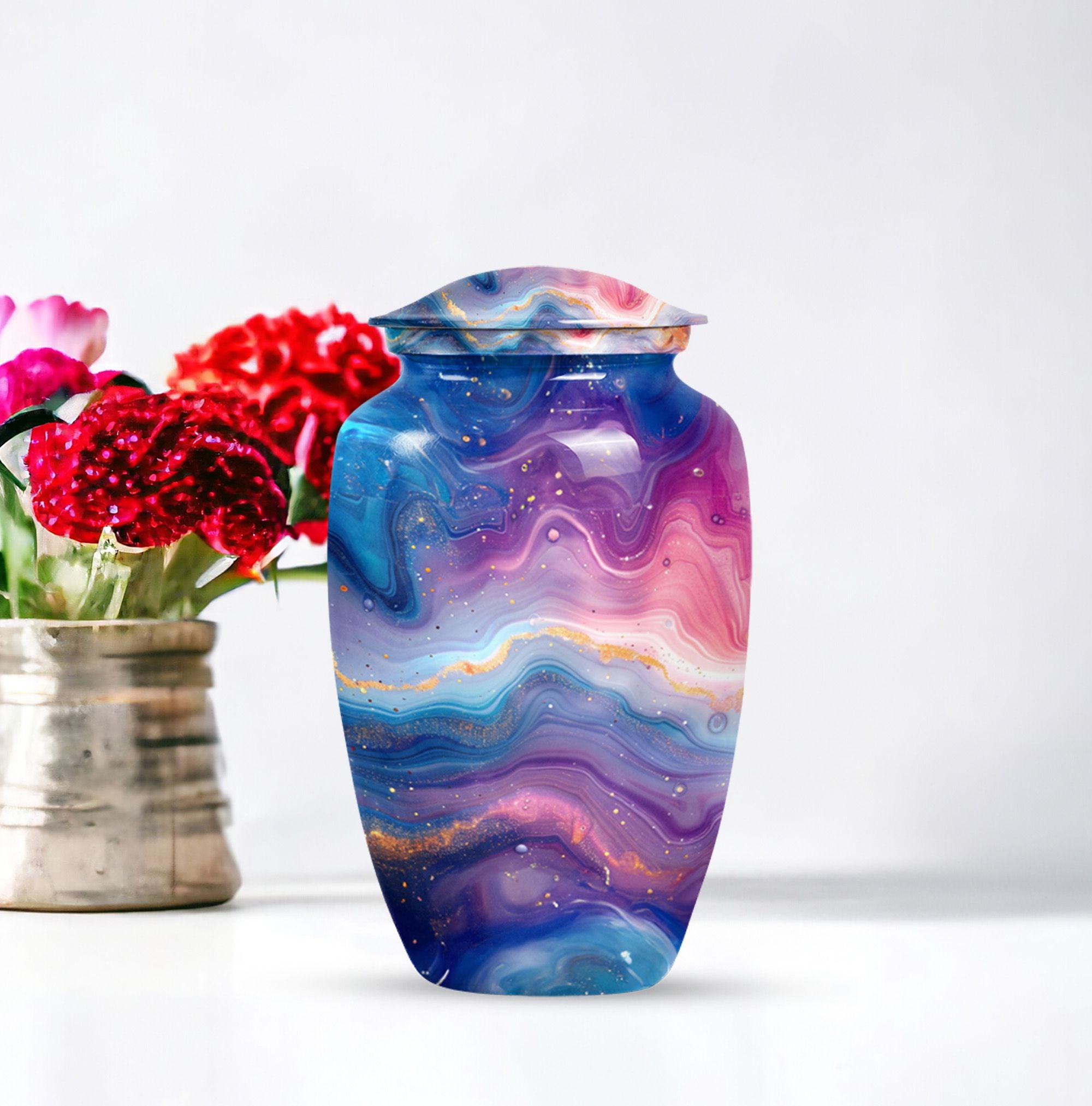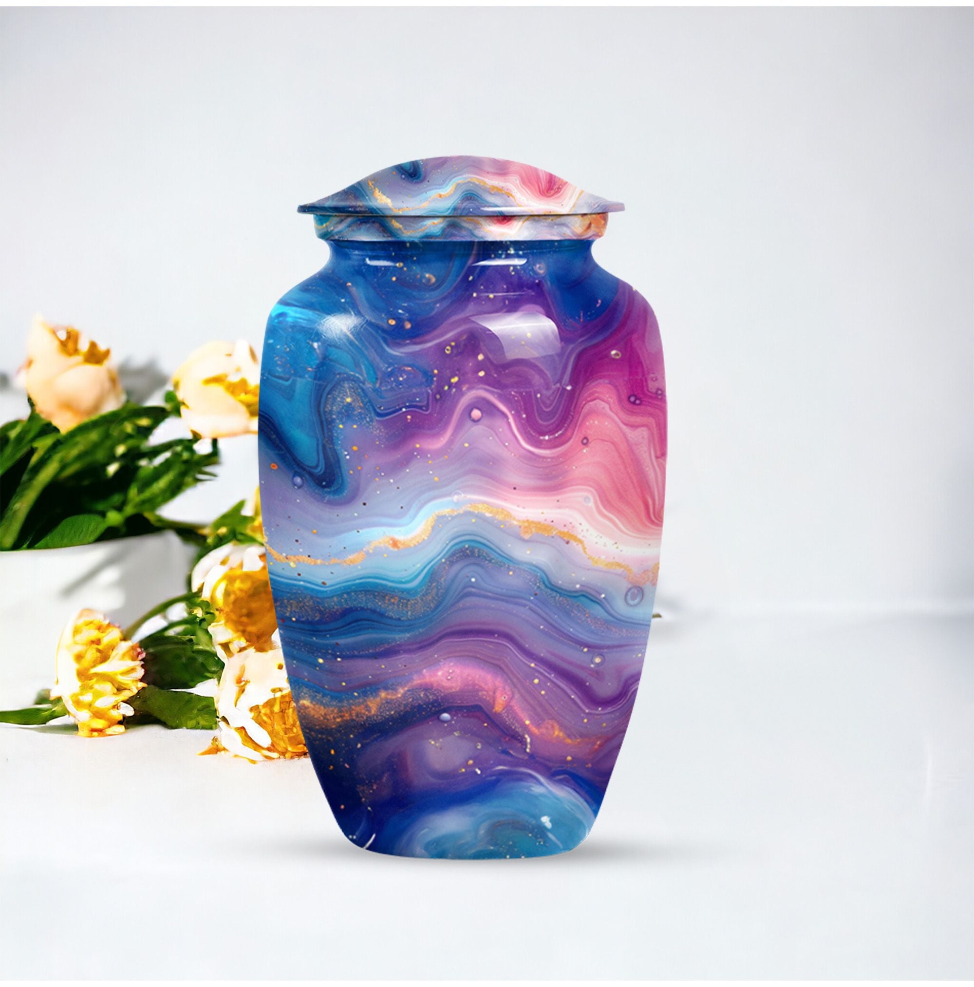 Introducing the Abstract Urn, a compelling accessory crafted especially for the memory of your beloved. This memorial large urn categorically stands in the cremation urn category. Carefully handcrafted, this stunning 10-inch Classic Urn brings a beautiful rendition of an abstract theme. It can comfortably hold 200 cubic inches of ashes, signifying a respectful tribute to the departed soul. Its robust construction from aluminum symbolizes endurance and constancy, while its impressive weight of 3.3 pounds portrays the substantial value it holds. The package includes a sensitive velvet pouch carefully designed for the containment of ashes. The urn allows customization options where you can personalize it with engraved names making the tribute even more special. Focus your search to include 'funeral urn for women's ashes,' or 'handcrafted urns for artistic souls' for similar designs in the collection. This is truly a noteworthy option for people in search of memorial urns or a large urn.