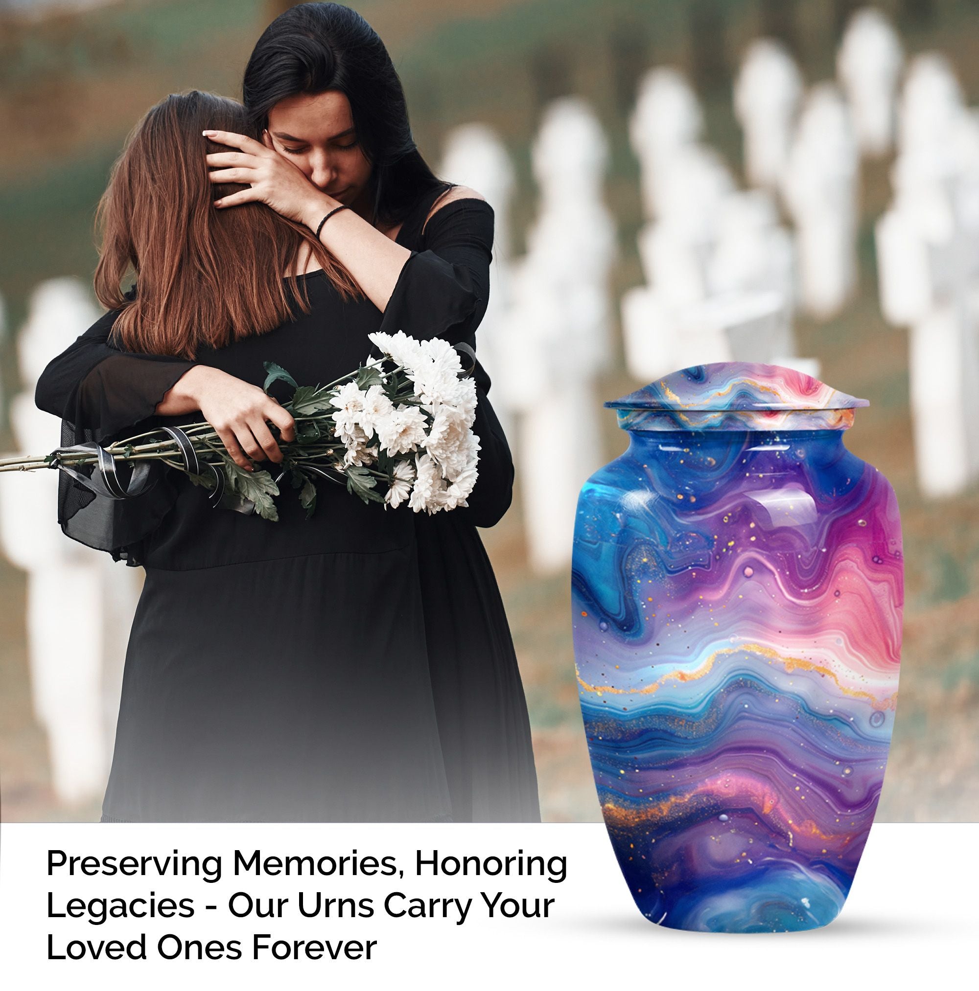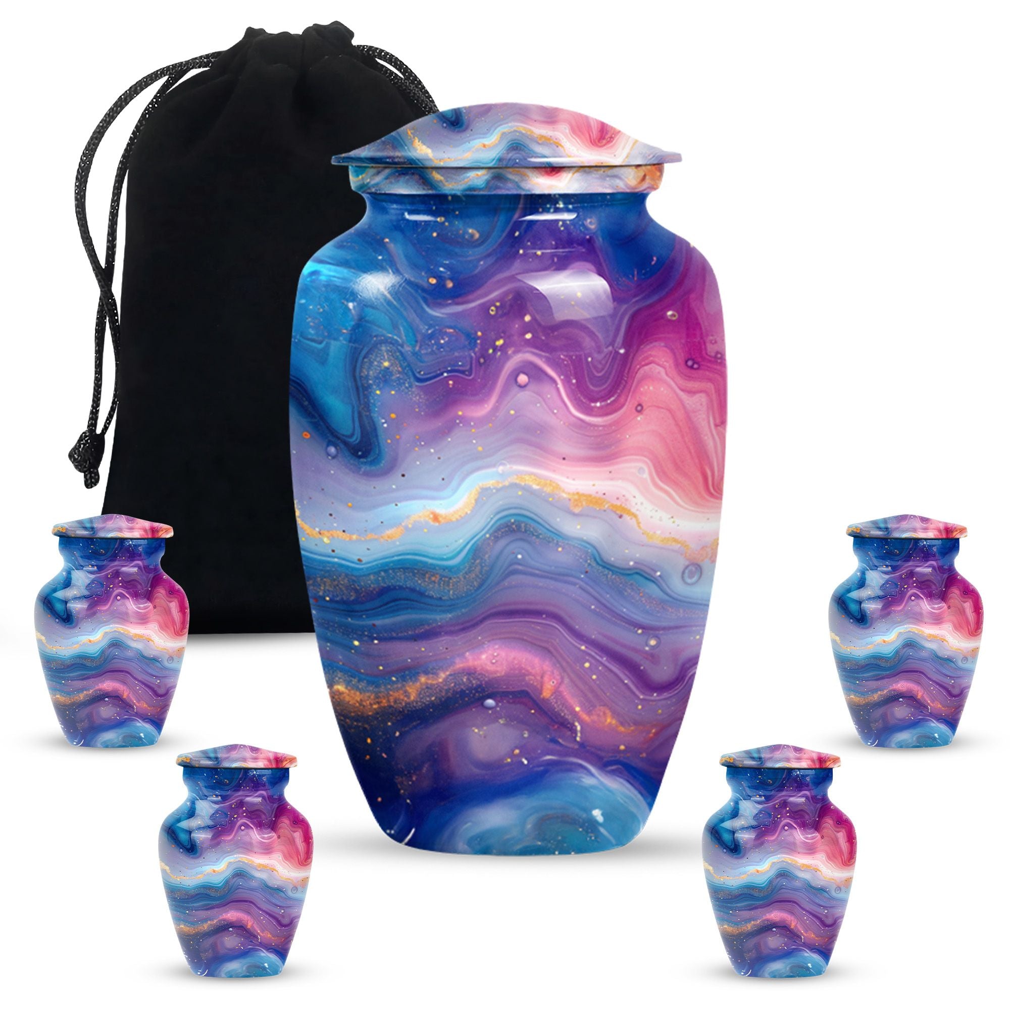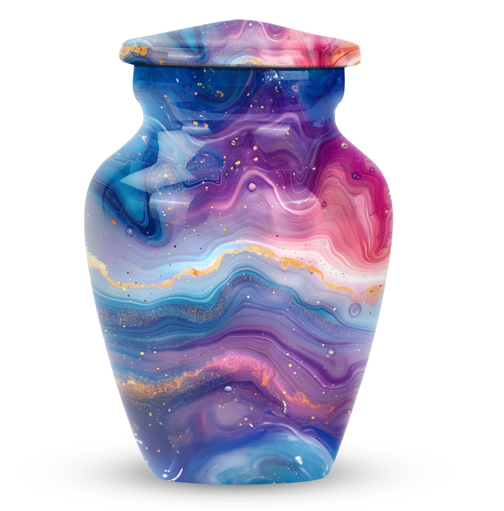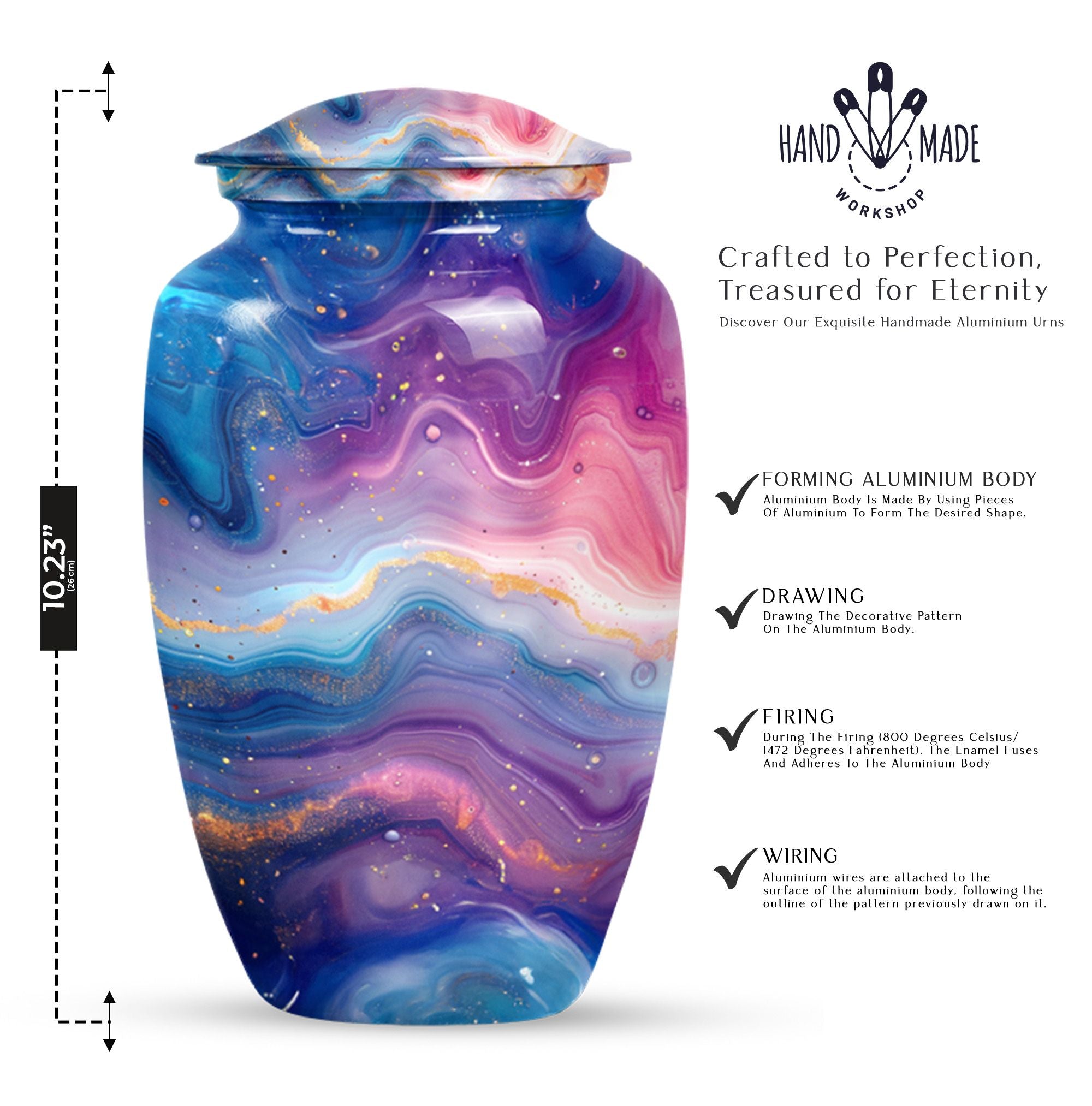 Introducing the Abstract Urn, a compelling accessory crafted especially for the memory of your beloved. This memorial large urn categorically stands in the cremation urn category. Carefully handcrafted, this stunning 10-inch Classic Urn brings a beautiful rendition of an abstract theme. It can comfortably hold 200 cubic inches of ashes, signifying a respectful tribute to the departed soul. Its robust construction from aluminum symbolizes endurance and constancy, while its impressive weight of 3.3 pounds portrays the substantial value it holds. The package includes a sensitive velvet pouch carefully designed for the containment of ashes. The urn allows customization options where you can personalize it with engraved names making the tribute even more special. Focus your search to include 'funeral urn for women's ashes,' or 'handcrafted urns for artistic souls' for similar designs in the collection. This is truly a noteworthy option for people in search of memorial urns or a large urn.