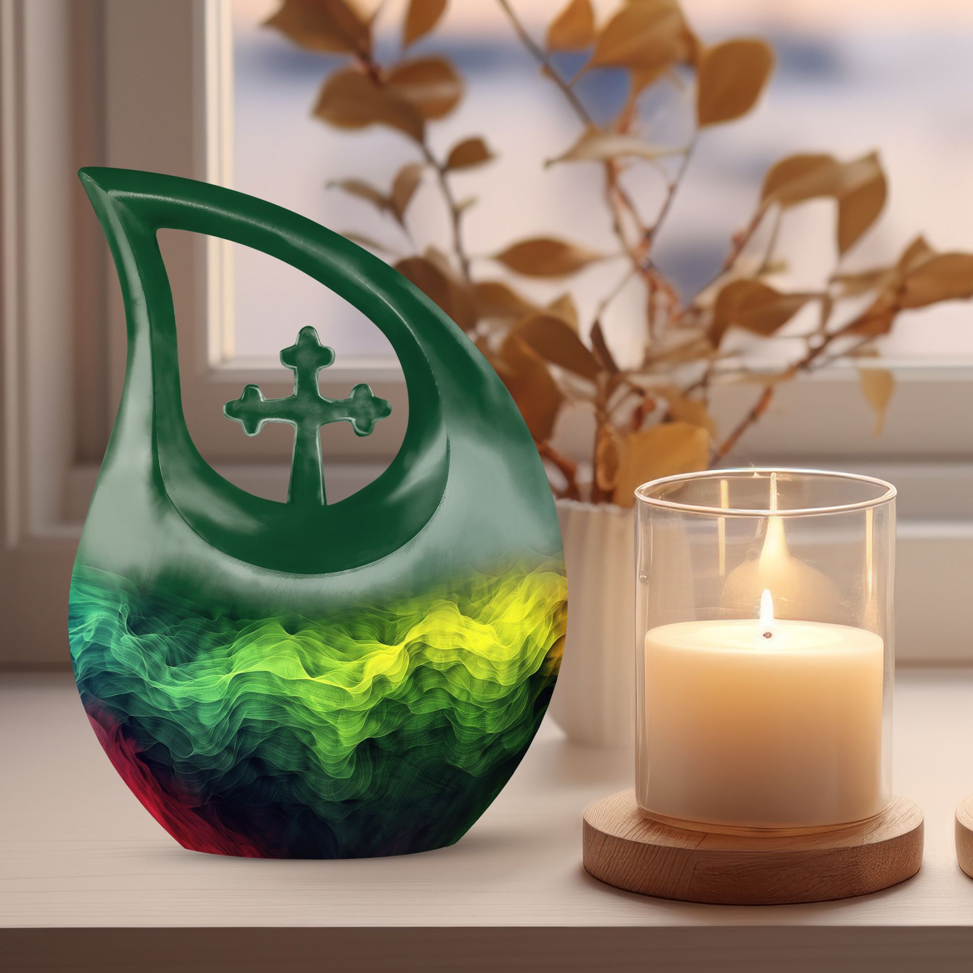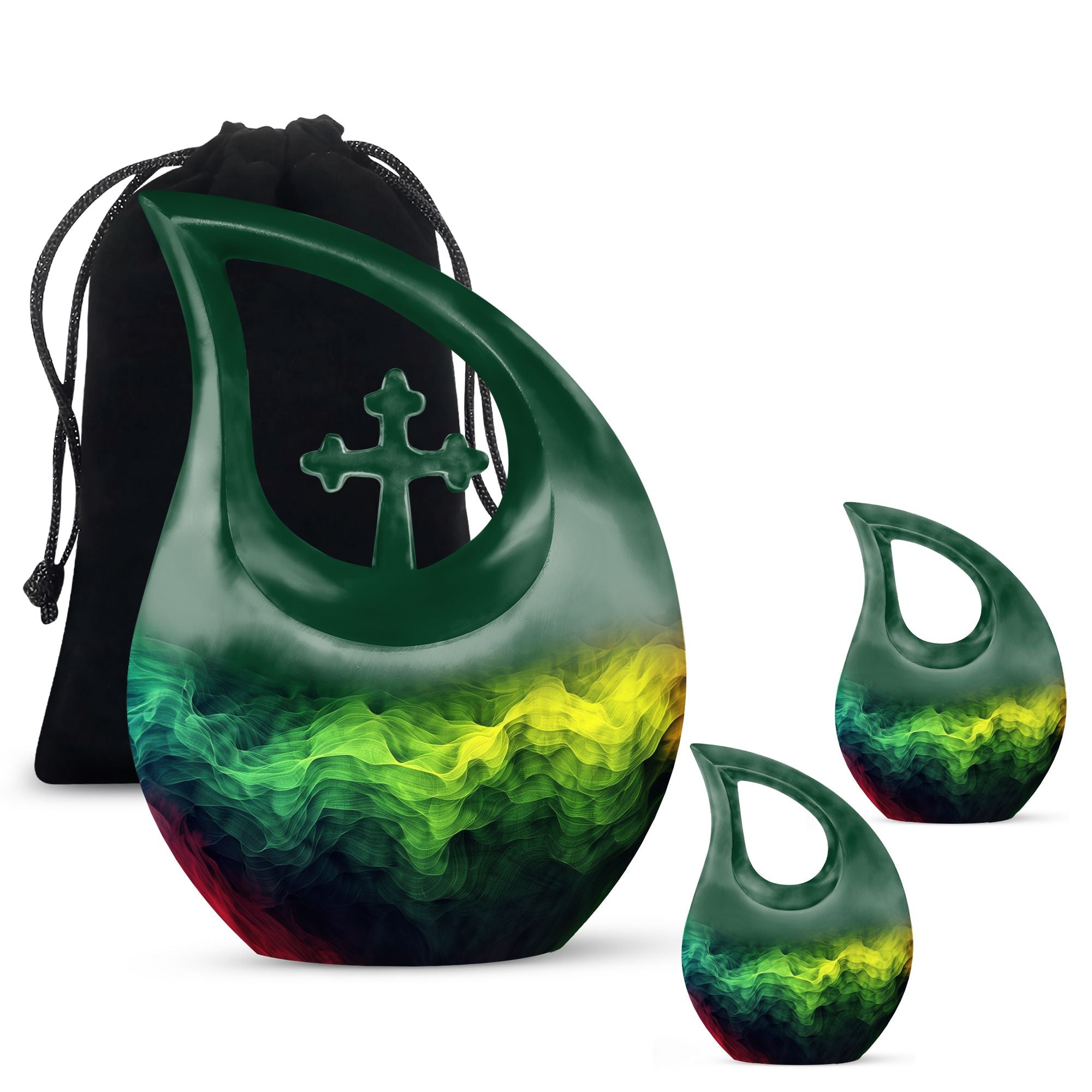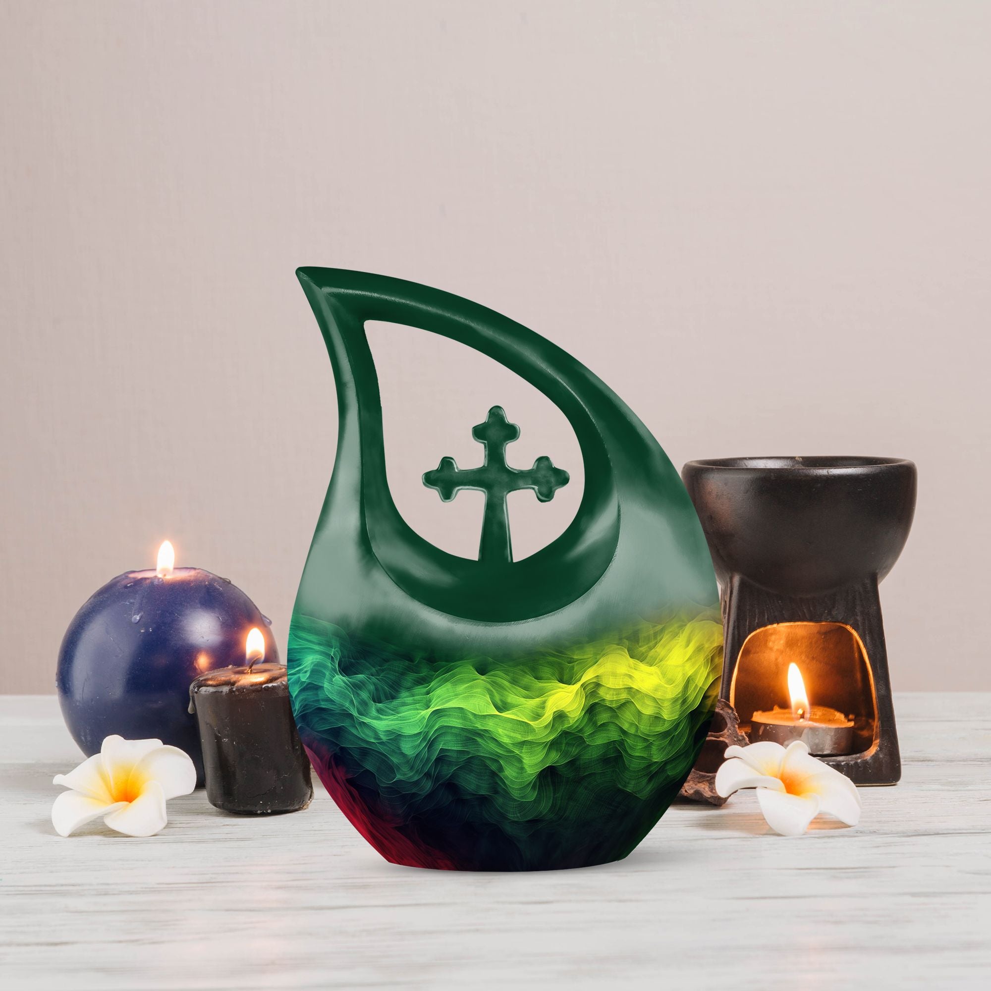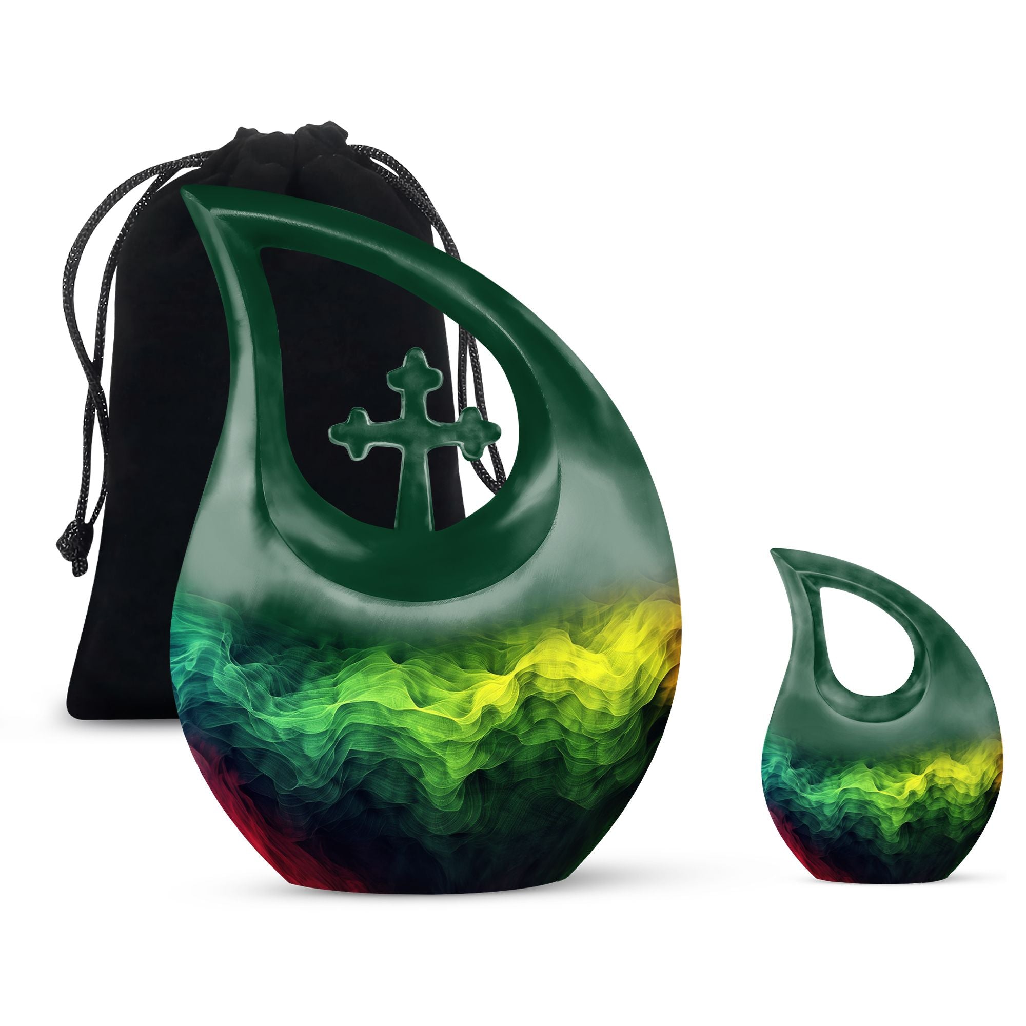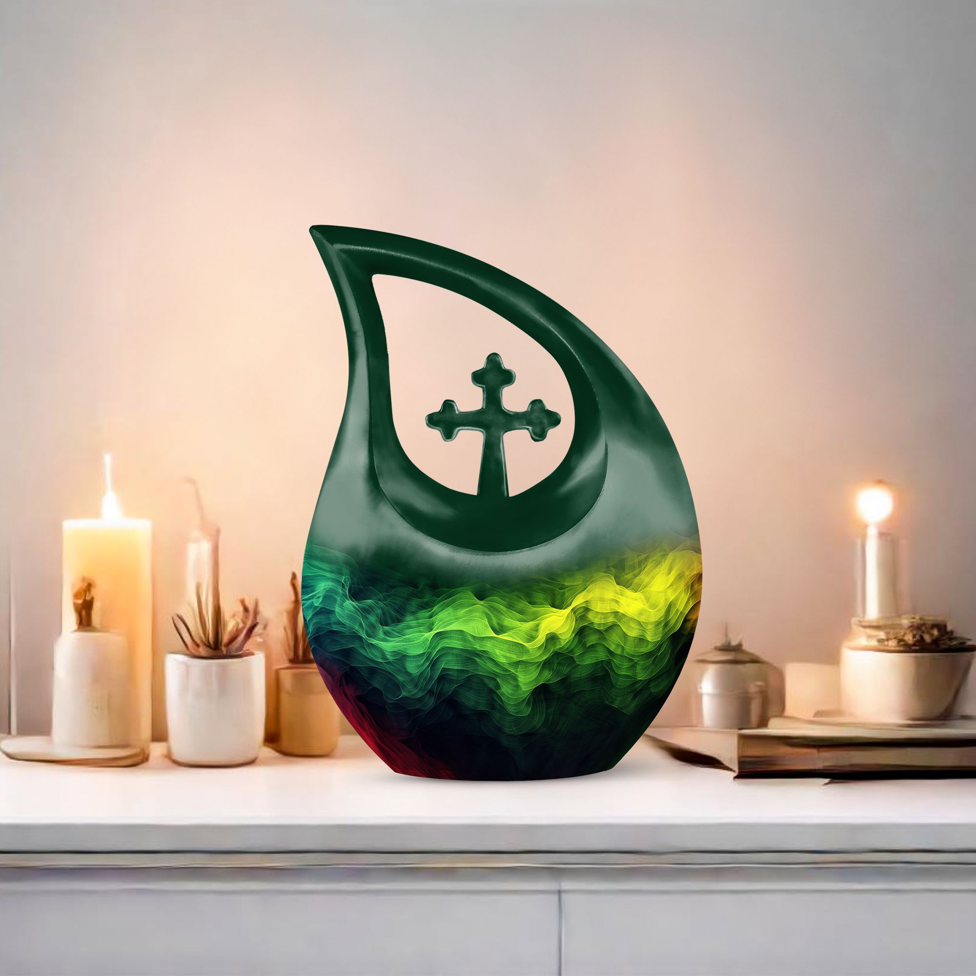 Delve into a spiritual and enduring tribute to your loved ones with our Abstract Urn. This 10-inch tall piece, finely crafted from aluminium, weighs a sturdy 3.3 pounds. Its Cross Drop theme emanates a unique sense of peace and respect. A large urn with a capacity of 200 cubic inches, it's ideal for memorializing adults and seniors, with ample space to contain their ashes. Each purchase includes a velvet pouch, adds an extra touch of dignity to this important rite. Our urn offers the option of personalization. You may choose to engrave names on it, creating an even more heart-rending tribute. Whether you are searching for Extra Large Urns, Cremation Monuments, Unique Urns For Dad, or Custom Made Urns For Ashes, this abstract urn presents a distinct choice. Honor your dear ones in solemn, enduring style with the Cross Drop Abstract Urn. Please note that we avoid using design details in our descriptions.