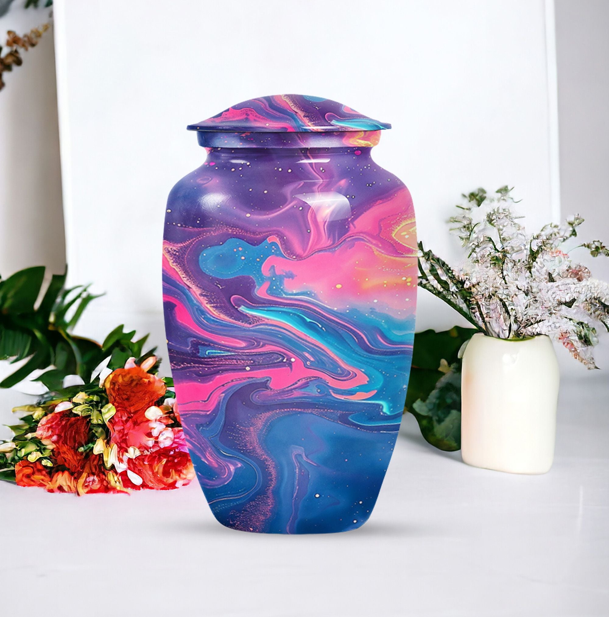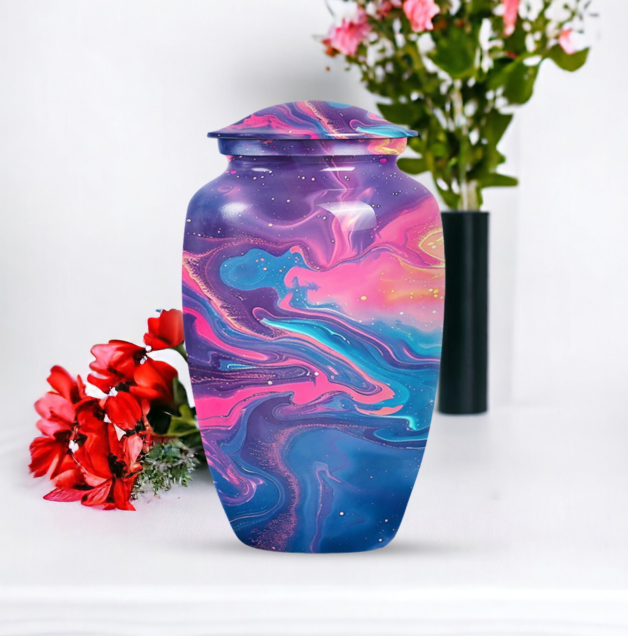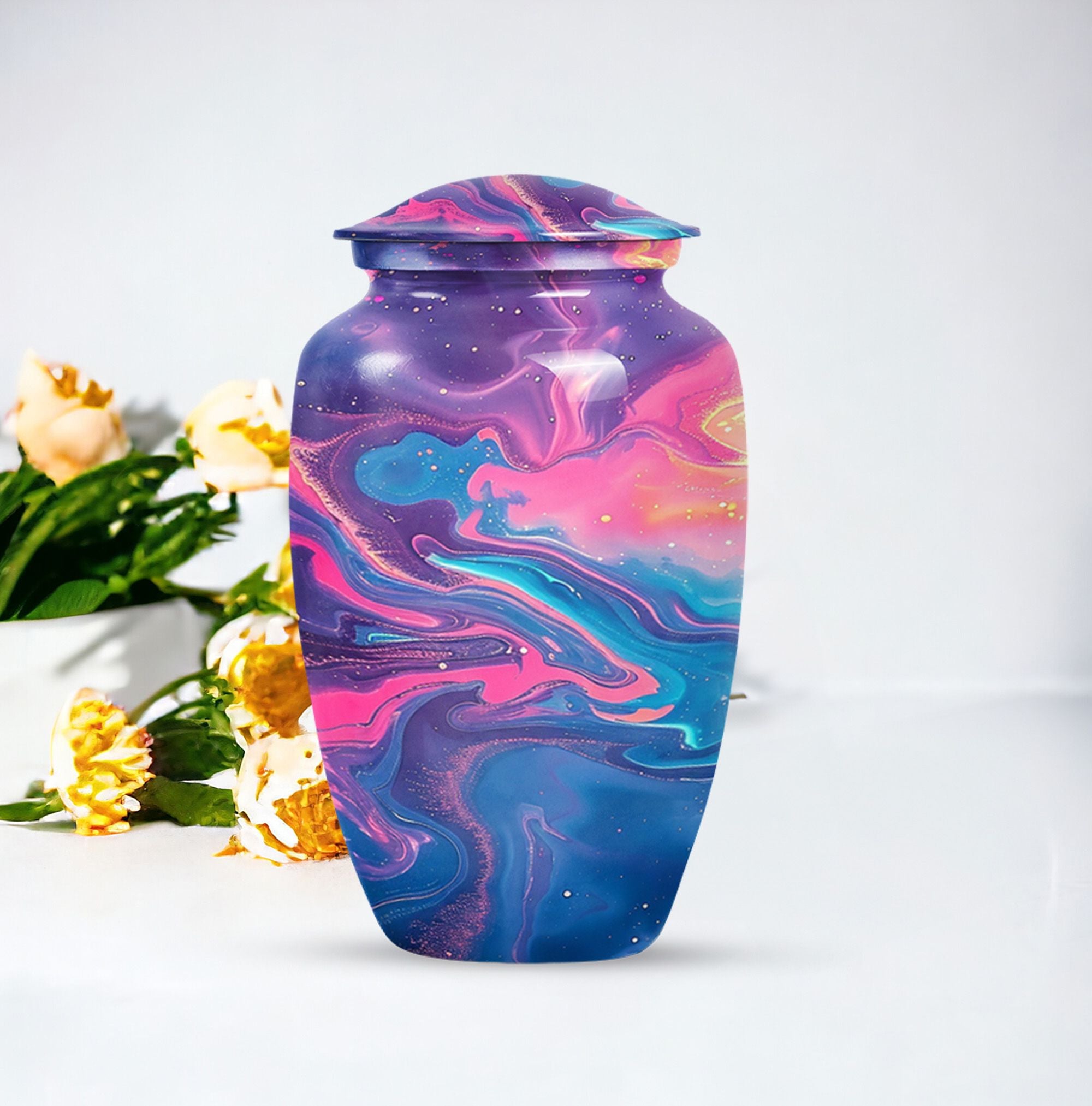 Standing at 10 inches in height and weighing a solid 3.3 pounds, this Abstract Urn is a large, artistic yet practical choice for maintaining the ashes of a loved one. Crafted meticulously from enduring aluminium, this burial urn for cremation ashes can securely hold 200 cubic inches of remains, making it suitable for adult male ashes or female ashes. The urn comes thoughtfully packed with a velvet pouch for containment of ashes, ensuring safekeeping of the dear departed. The cremation urn presents a visually striking abstract theme that doubles as a tasteful décor piece for urban homes. Notably, this cremation urn permits personalization - you can engrave names onto it, transforming this vessel into a heartfelt, everlasting memorial. As a prominent piece of memorial ceremony supplies, this Classic Urn transcends typical designs with its uncommon abstract motif, offering a unique artistic perspective while upholding its primary purpose with dignity.