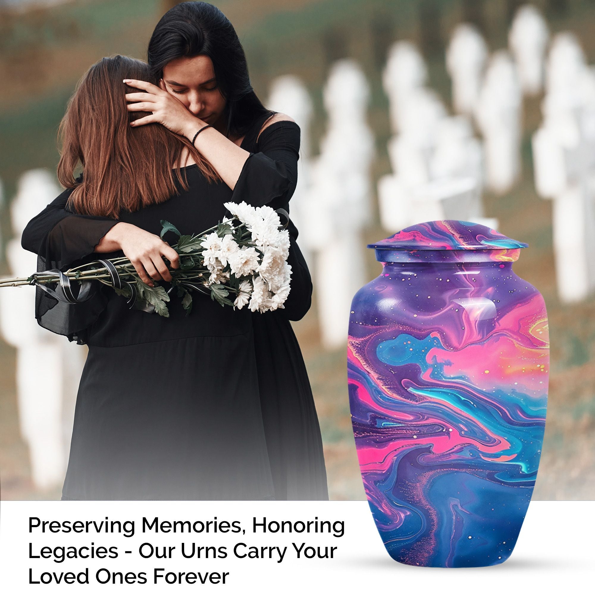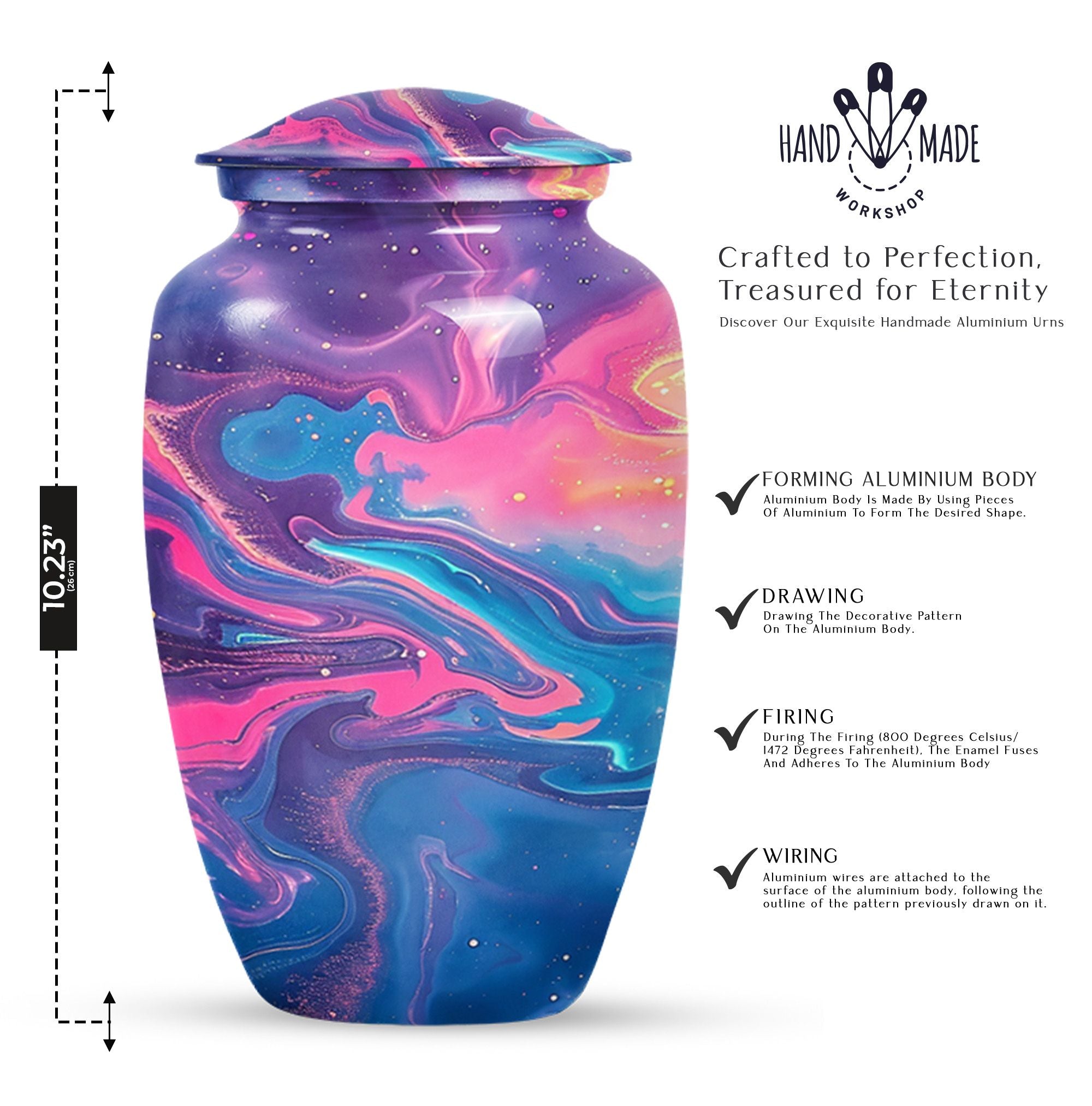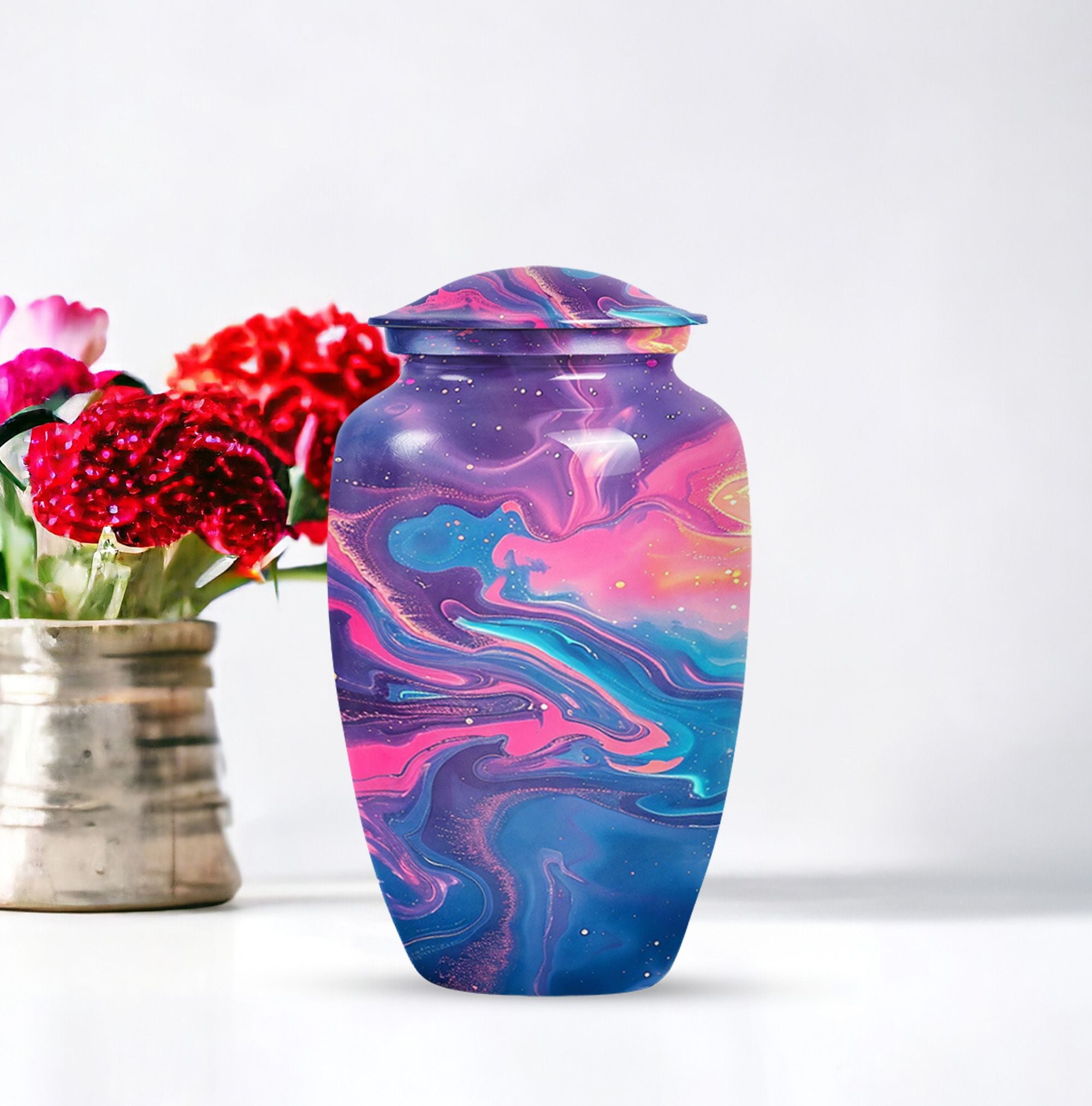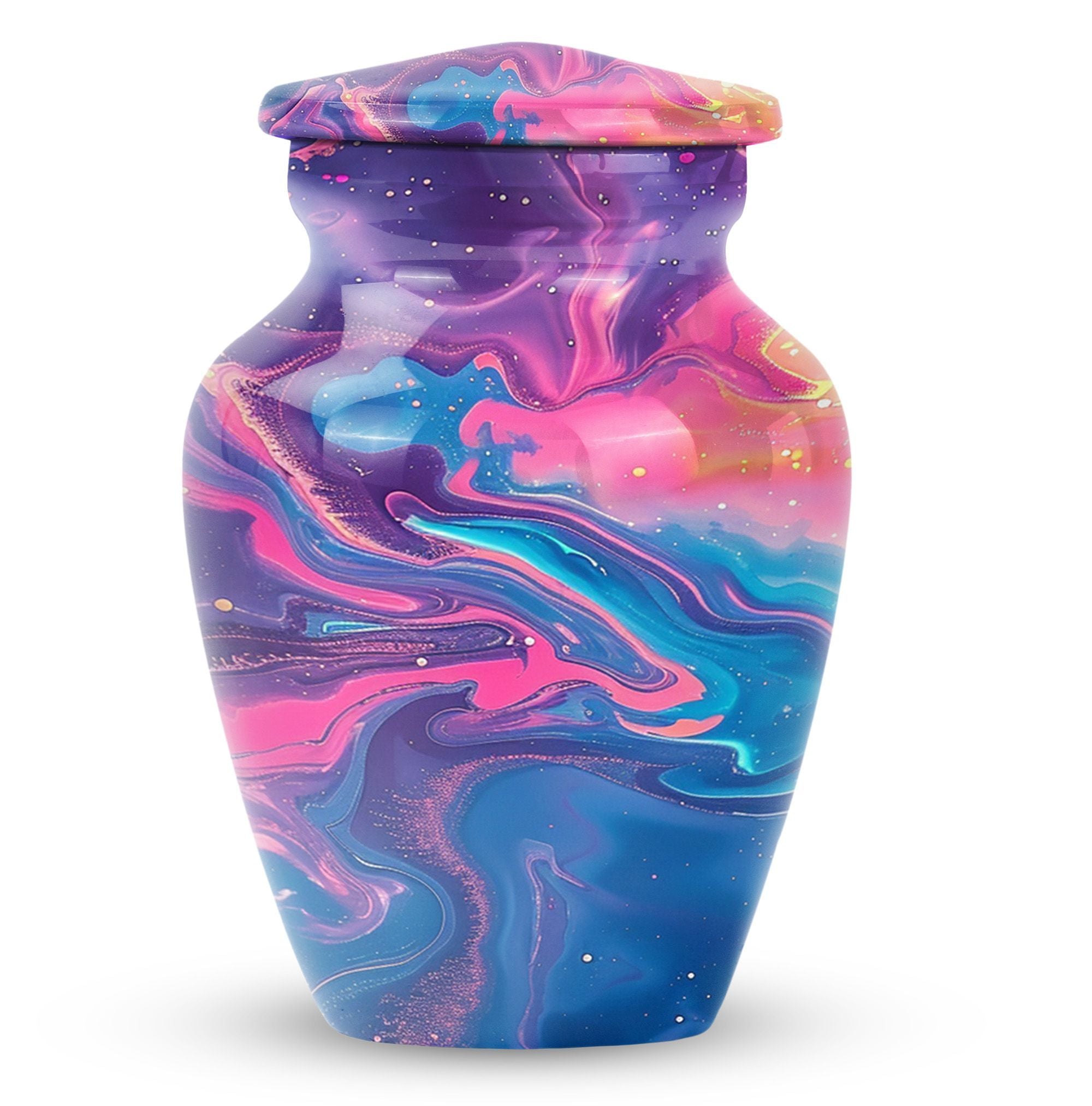 Standing at 10 inches in height and weighing a solid 3.3 pounds, this Abstract Urn is a large, artistic yet practical choice for maintaining the ashes of a loved one. Crafted meticulously from enduring aluminium, this burial urn for cremation ashes can securely hold 200 cubic inches of remains, making it suitable for adult male ashes or female ashes. The urn comes thoughtfully packed with a velvet pouch for containment of ashes, ensuring safekeeping of the dear departed. The cremation urn presents a visually striking abstract theme that doubles as a tasteful décor piece for urban homes. Notably, this cremation urn permits personalization - you can engrave names onto it, transforming this vessel into a heartfelt, everlasting memorial. As a prominent piece of memorial ceremony supplies, this Classic Urn transcends typical designs with its uncommon abstract motif, offering a unique artistic perspective while upholding its primary purpose with dignity.