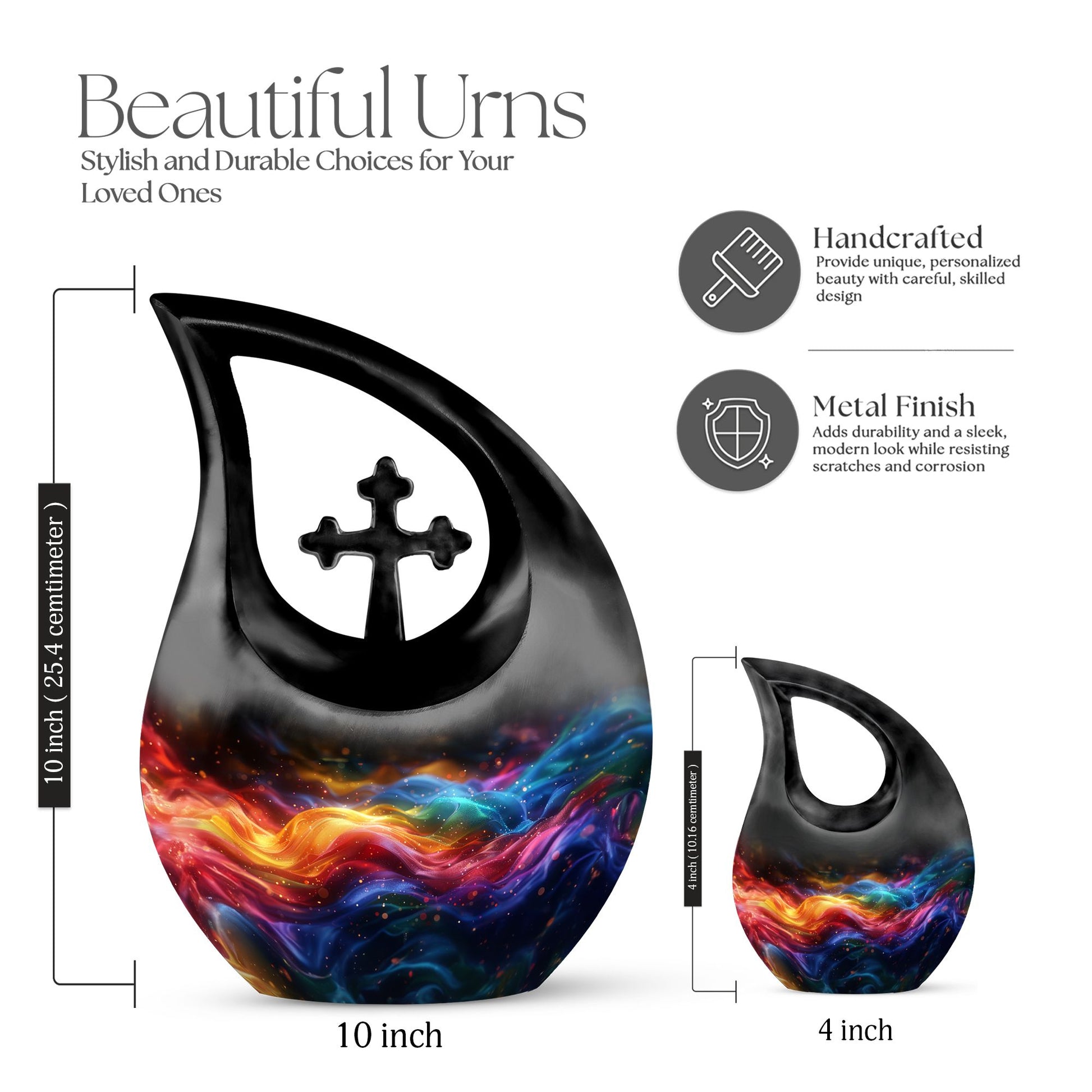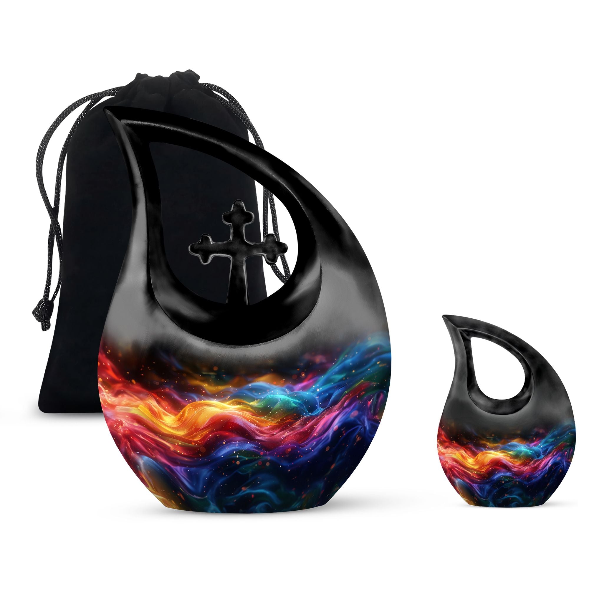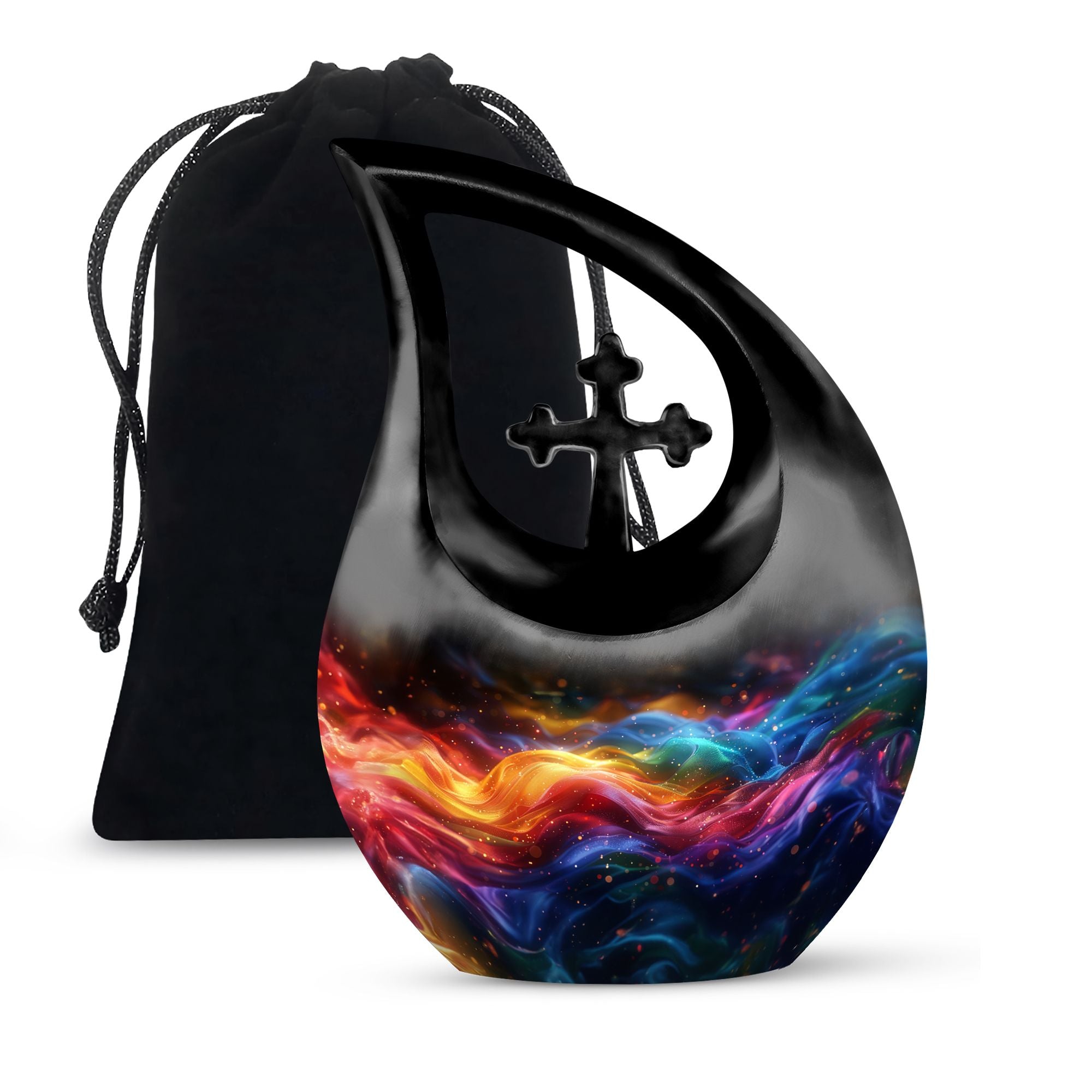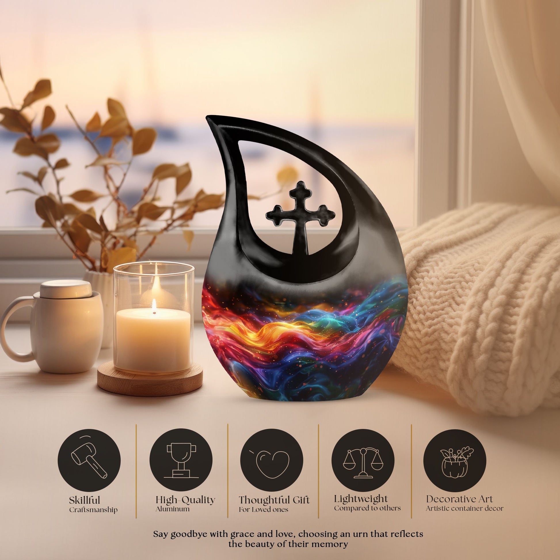 Summon a sense of serenity in remembrance with our special 'Cross Drop' Abstract Urn. This extra large urn is tailored for adults, standing 10 inches in height and having a well-proportioned weight of 3.3 pounds. Crafted skillfully from aluminium, it has a melancholy beauty that mirrors the profound sorrow of loss. Inside, it provides a generous capacity of 200 cubic inches for secure containment of ashes, bundled with a velvet pouch for additional protection. Further adding a personal touch, this unique urn offers the option to customize it with engraved names. Whether you are searching for memorial urns for human ashes, or personalized urns specifically for a beloved dad's ashes, this artful 'Cross Drop' Urn fits the bill. Lose yourself in its thoughtful abstract theme, a gentle reminder of the boundless love and memories shared with the departed.
