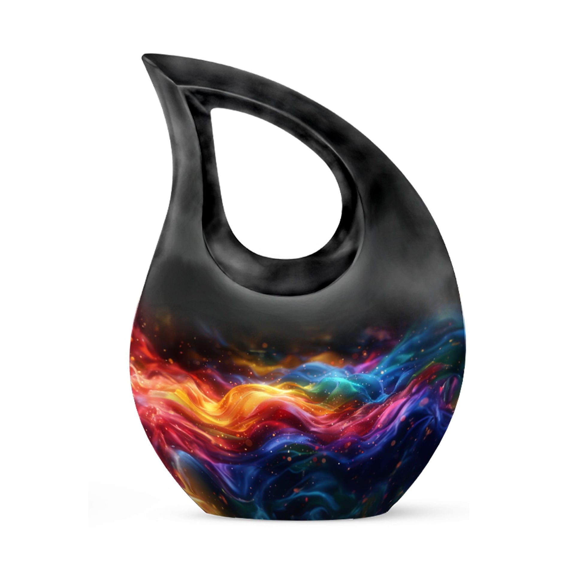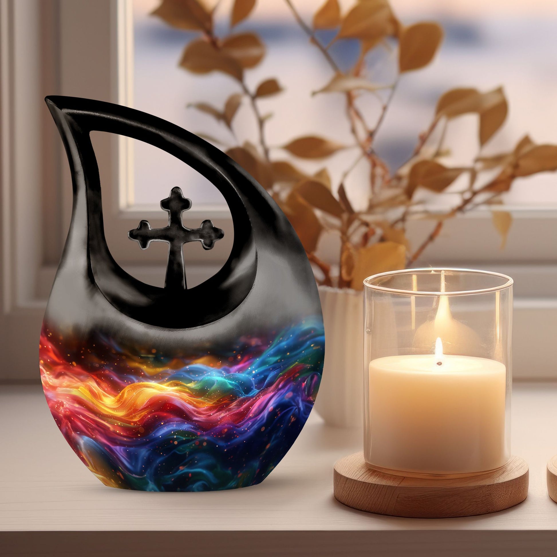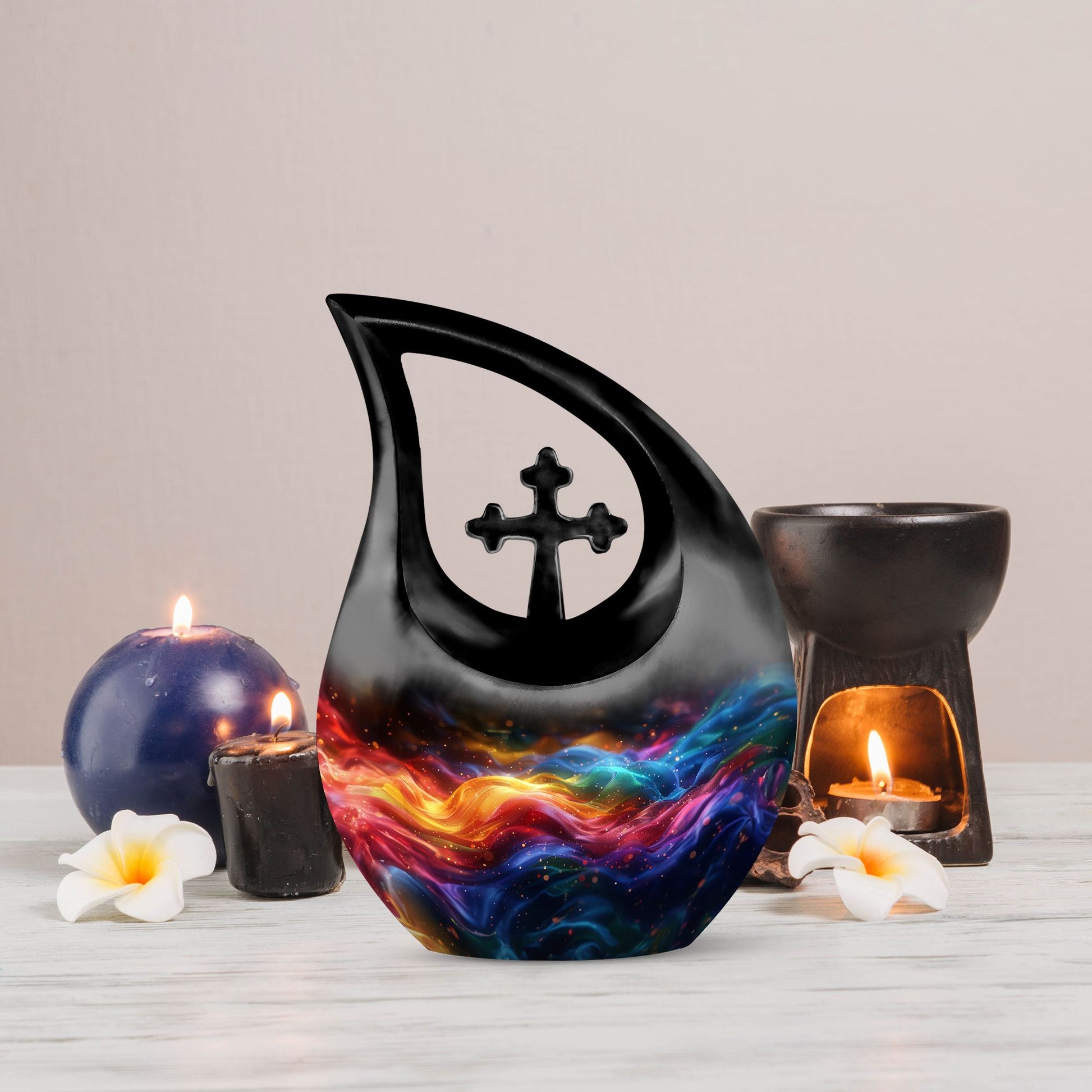 Summon a sense of serenity in remembrance with our special 'Cross Drop' Abstract Urn. This extra large urn is tailored for adults, standing 10 inches in height and having a well-proportioned weight of 3.3 pounds. Crafted skillfully from aluminium, it has a melancholy beauty that mirrors the profound sorrow of loss. Inside, it provides a generous capacity of 200 cubic inches for secure containment of ashes, bundled with a velvet pouch for additional protection. Further adding a personal touch, this unique urn offers the option to customize it with engraved names. Whether you are searching for memorial urns for human ashes, or personalized urns specifically for a beloved dad's ashes, this artful 'Cross Drop' Urn fits the bill. Lose yourself in its thoughtful abstract theme, a gentle reminder of the boundless love and memories shared with the departed.