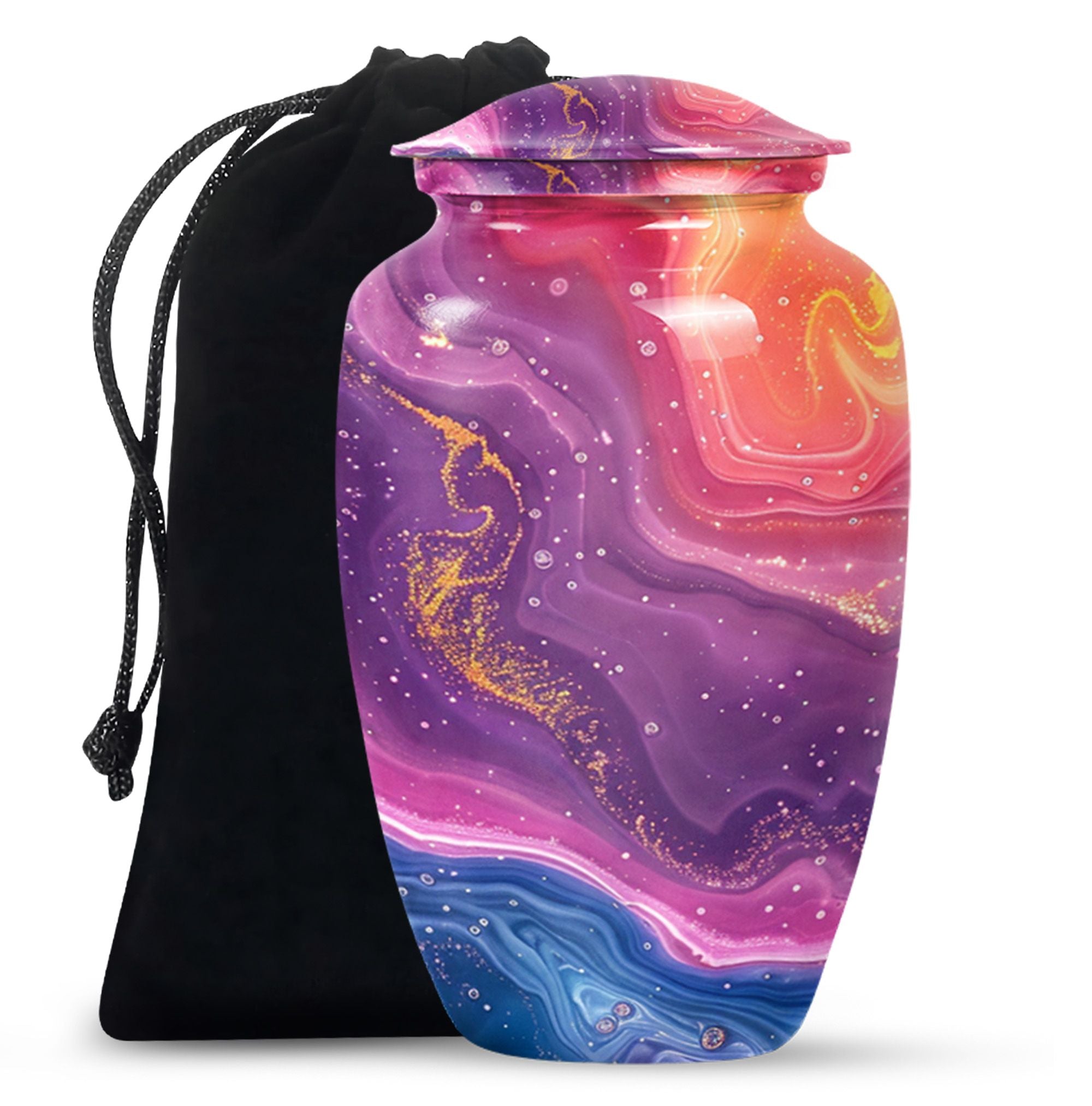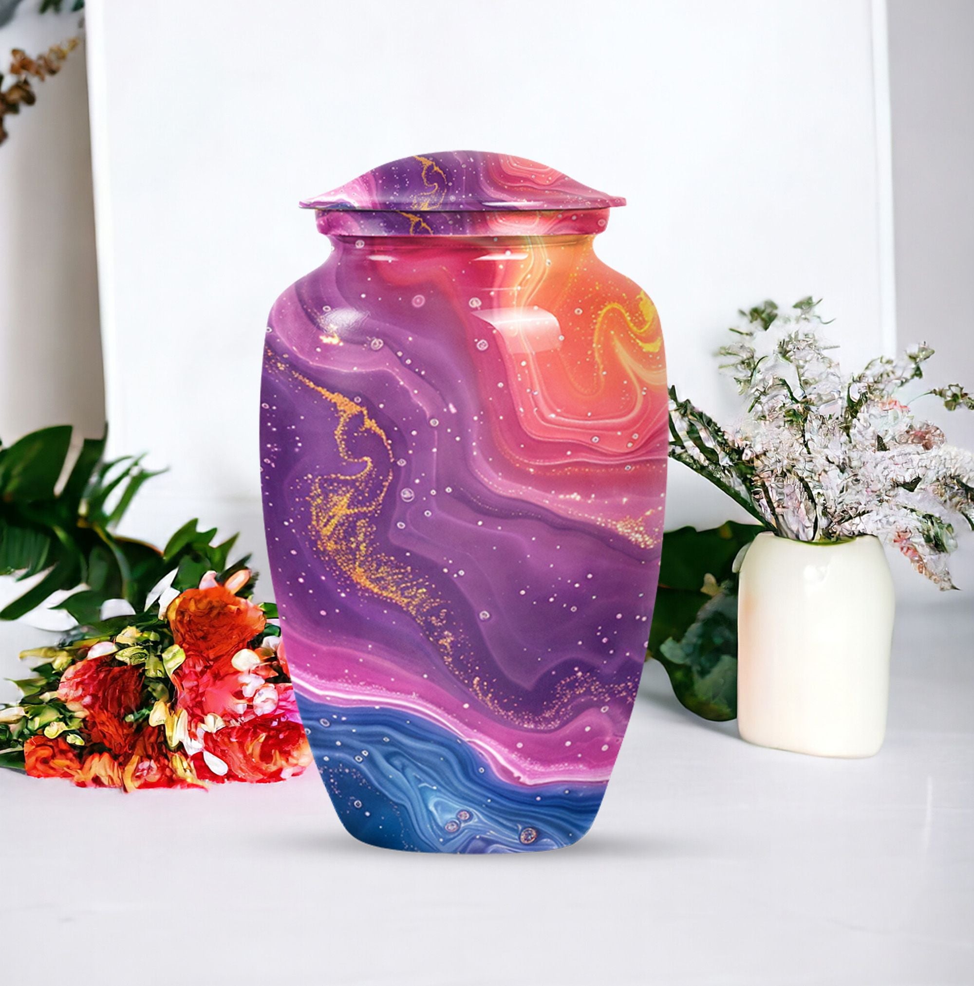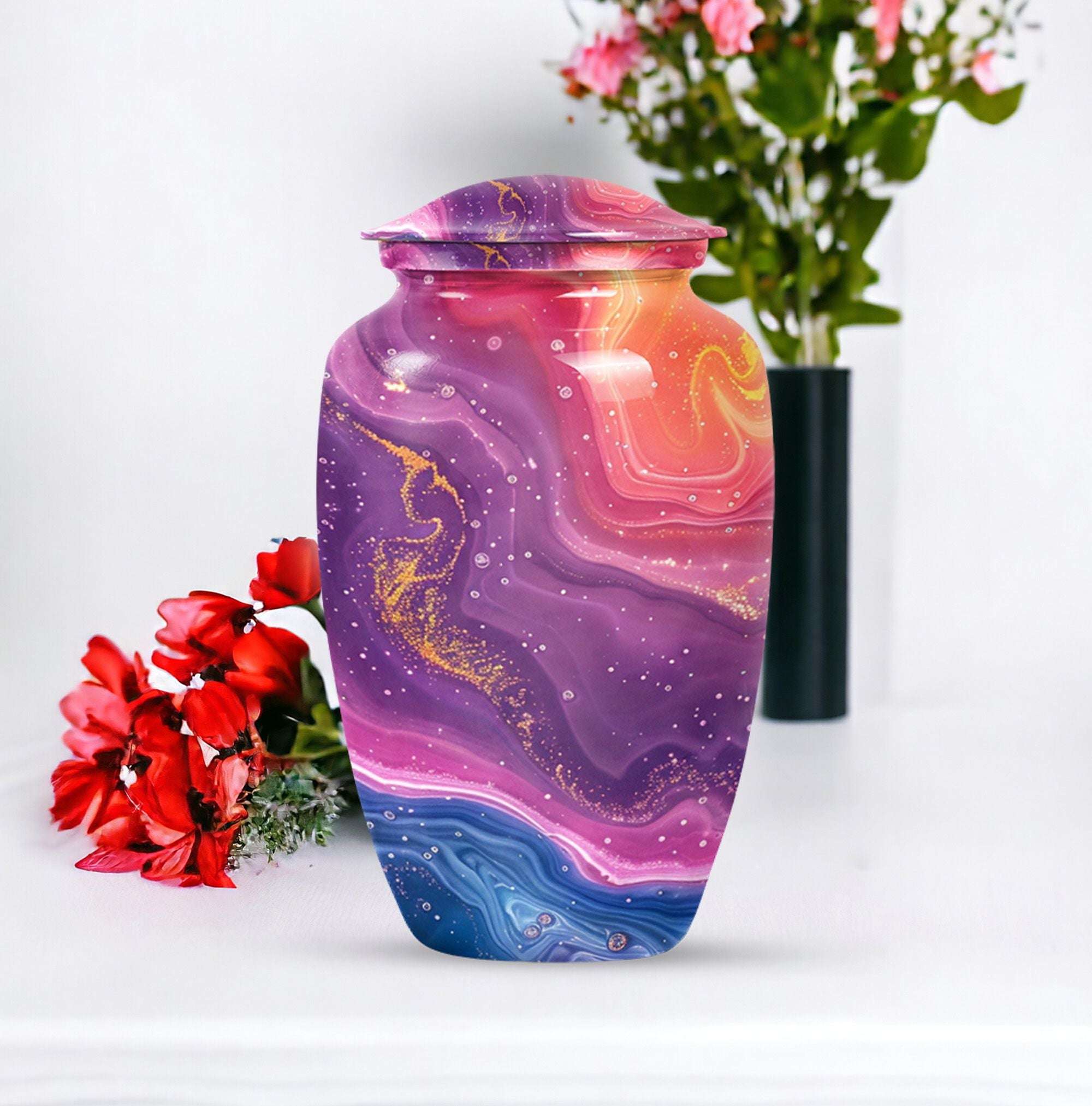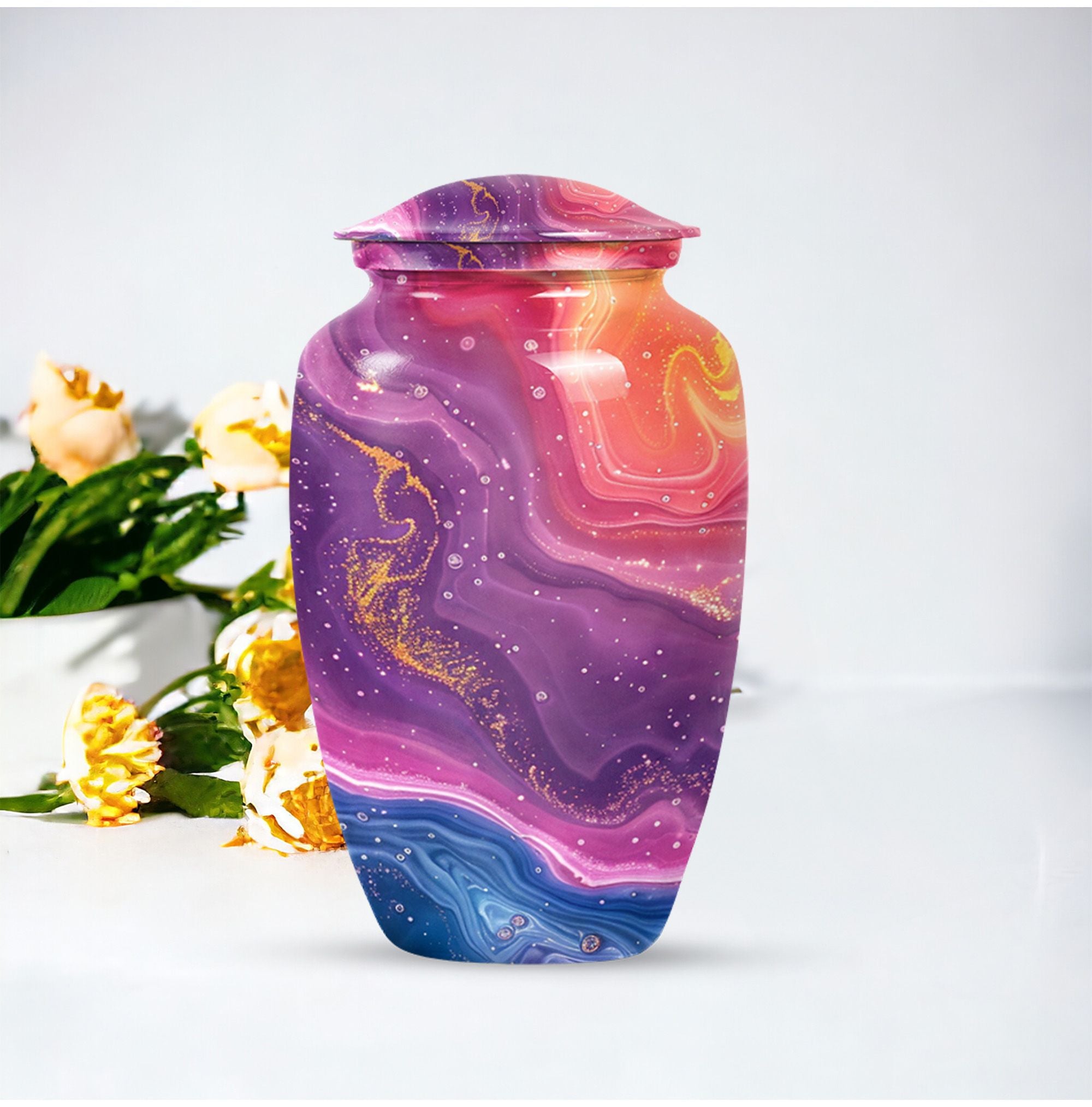 Honor your loved one with a dignified final gesture. Our Abstract Urn - an exclusive piece in our range of large-size, aluminium cremation urns designed to safeguard human ashes. Crafted to measure 10 inches in height and weighing a solid 3.3 pounds, this elegant urn not only respects the seriousness of its purpose but also adds a touch of sophistication. Boasting an impressive capacity of 200 cubic inches, it can comfortably accommodate the ashes of an adult. This cremation urn comes thoughtfully shipped in a velvet pouch, presenting a tender solution for the containment of ashes. Plus, the feature of personalization is available, permitting the engraving of names for a more personal touch. Our choice of material underlines our commitment to longevity, as the metal endures, so will the memory of your dearly departed. A remarkable 'cremation urn' indeed, designed exclusively for men, women, and ideal for funeral ceremonies. Its abstract theme adds a unique appeal to it, celebrating the life of your loved one.