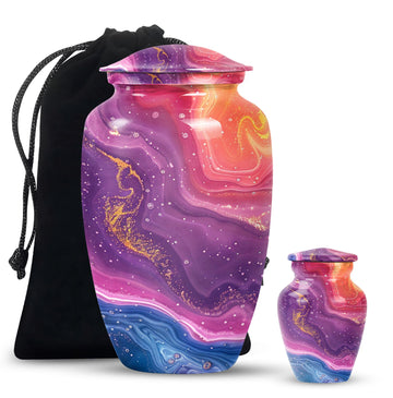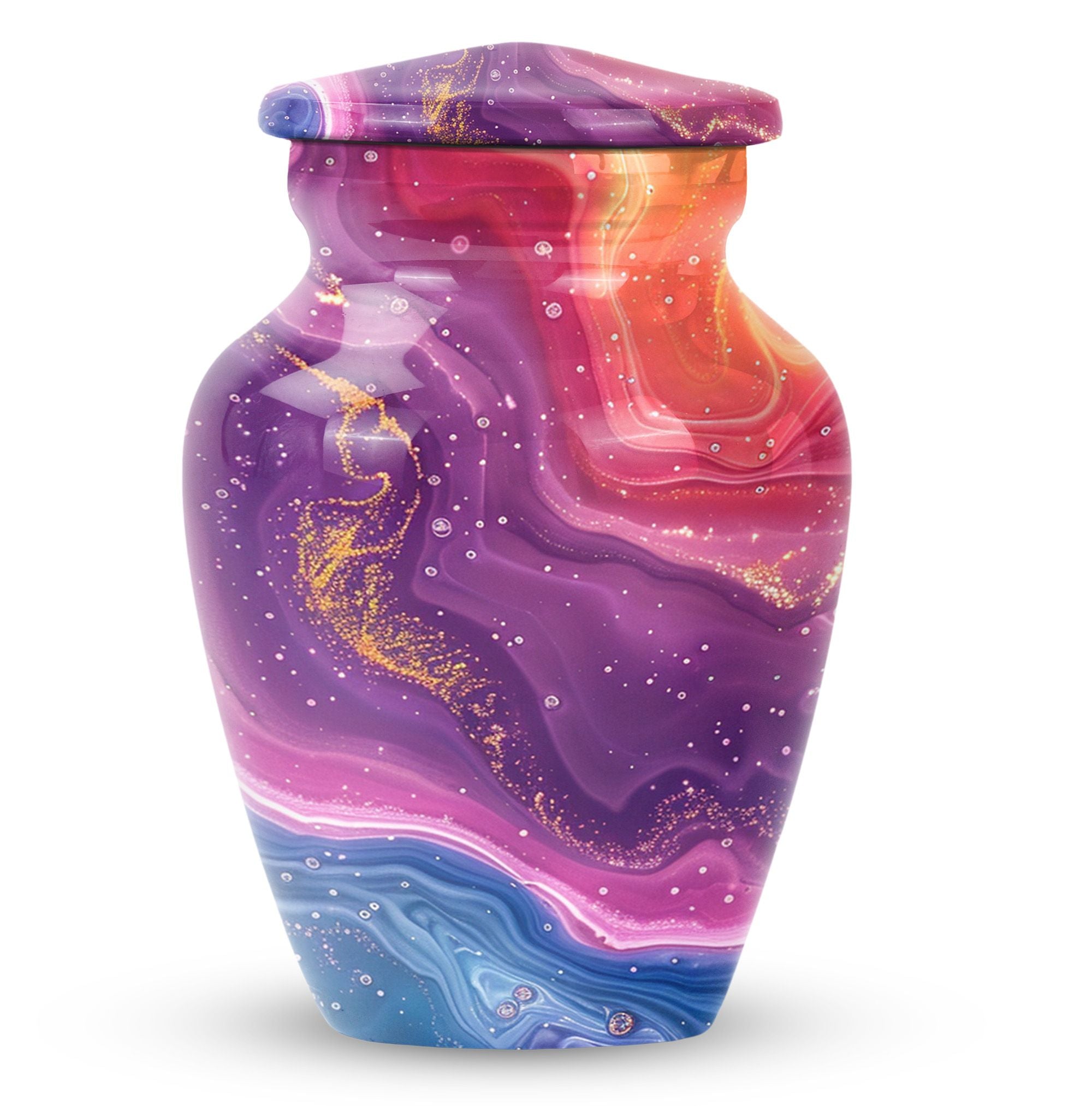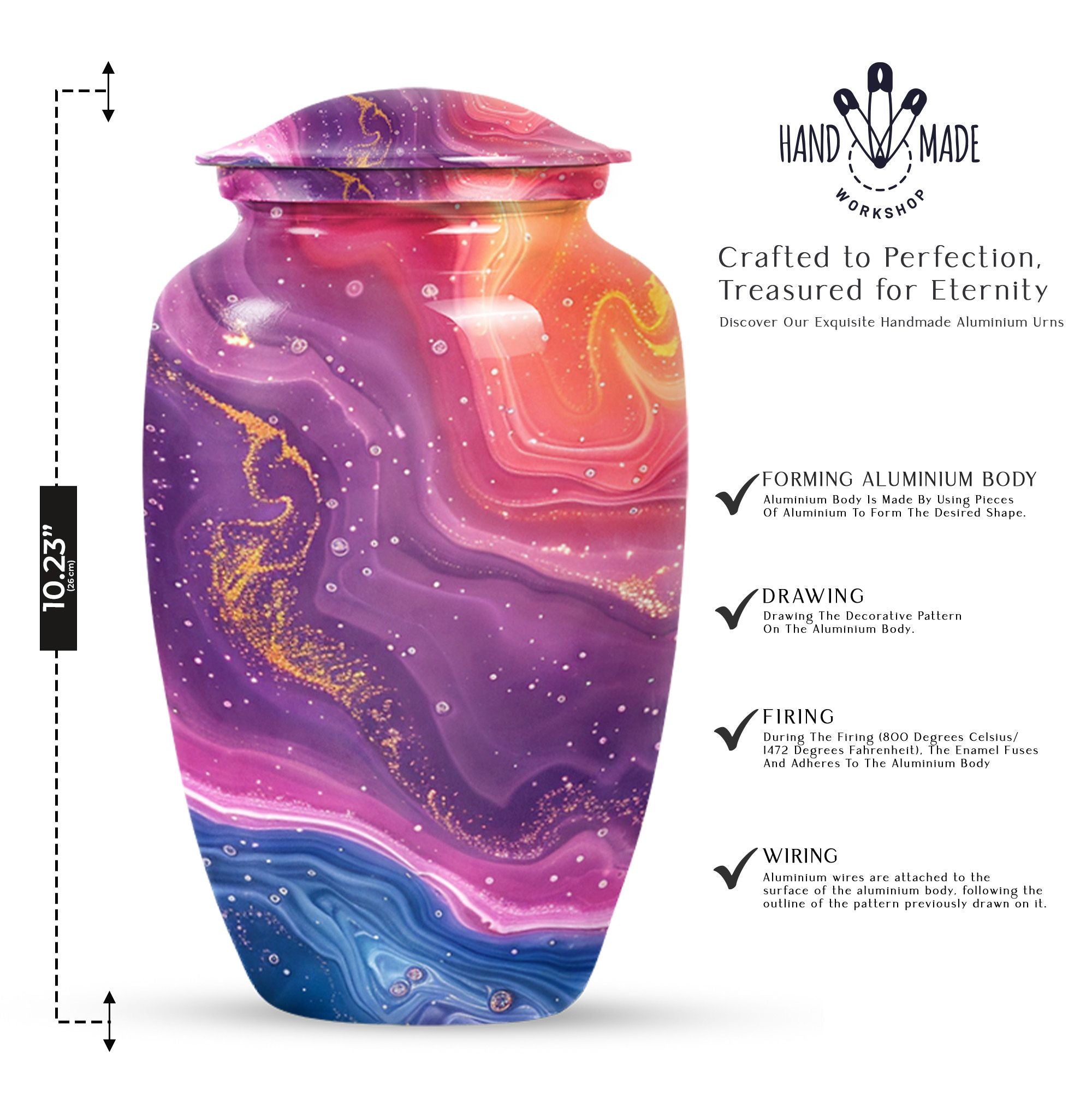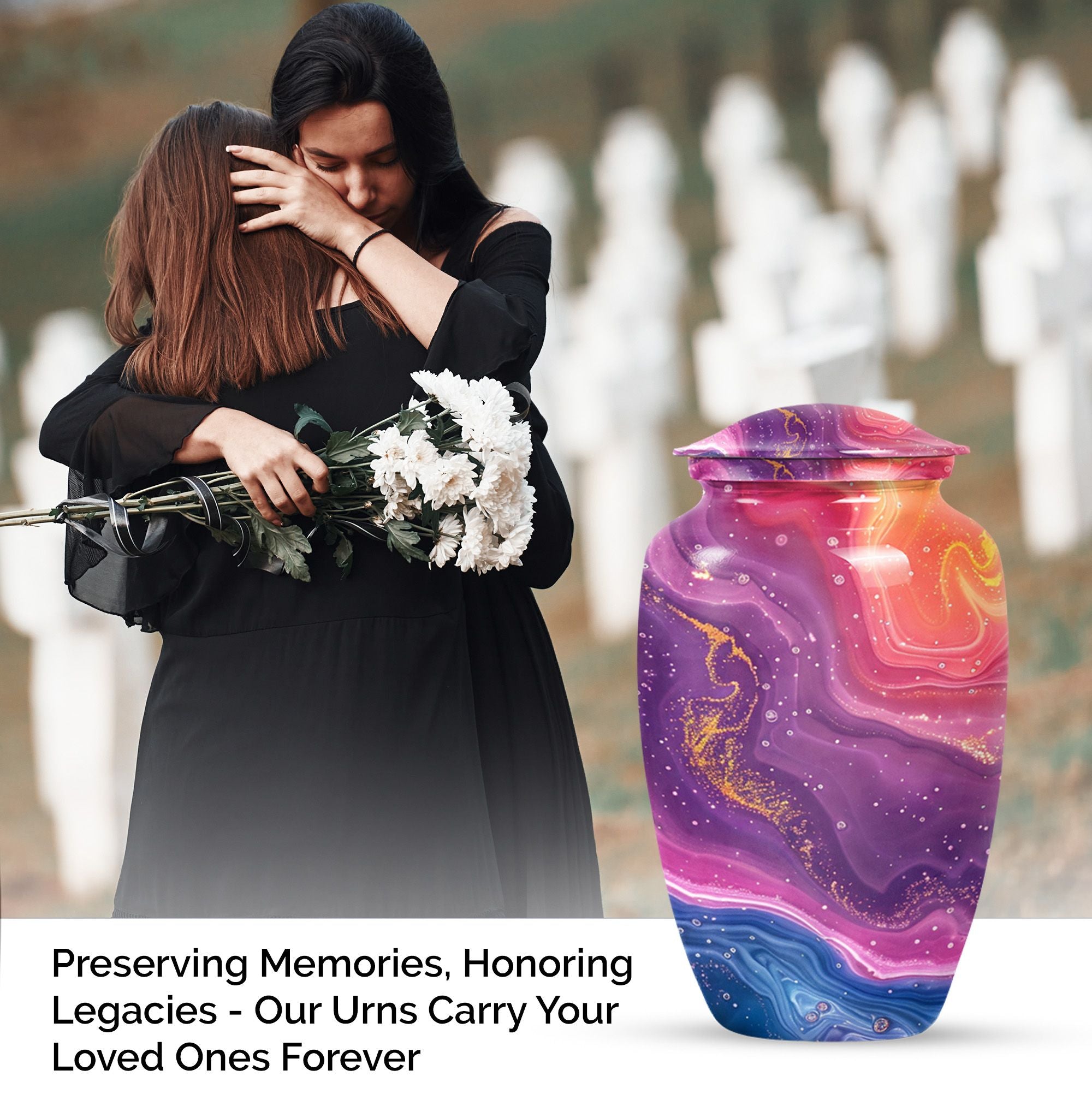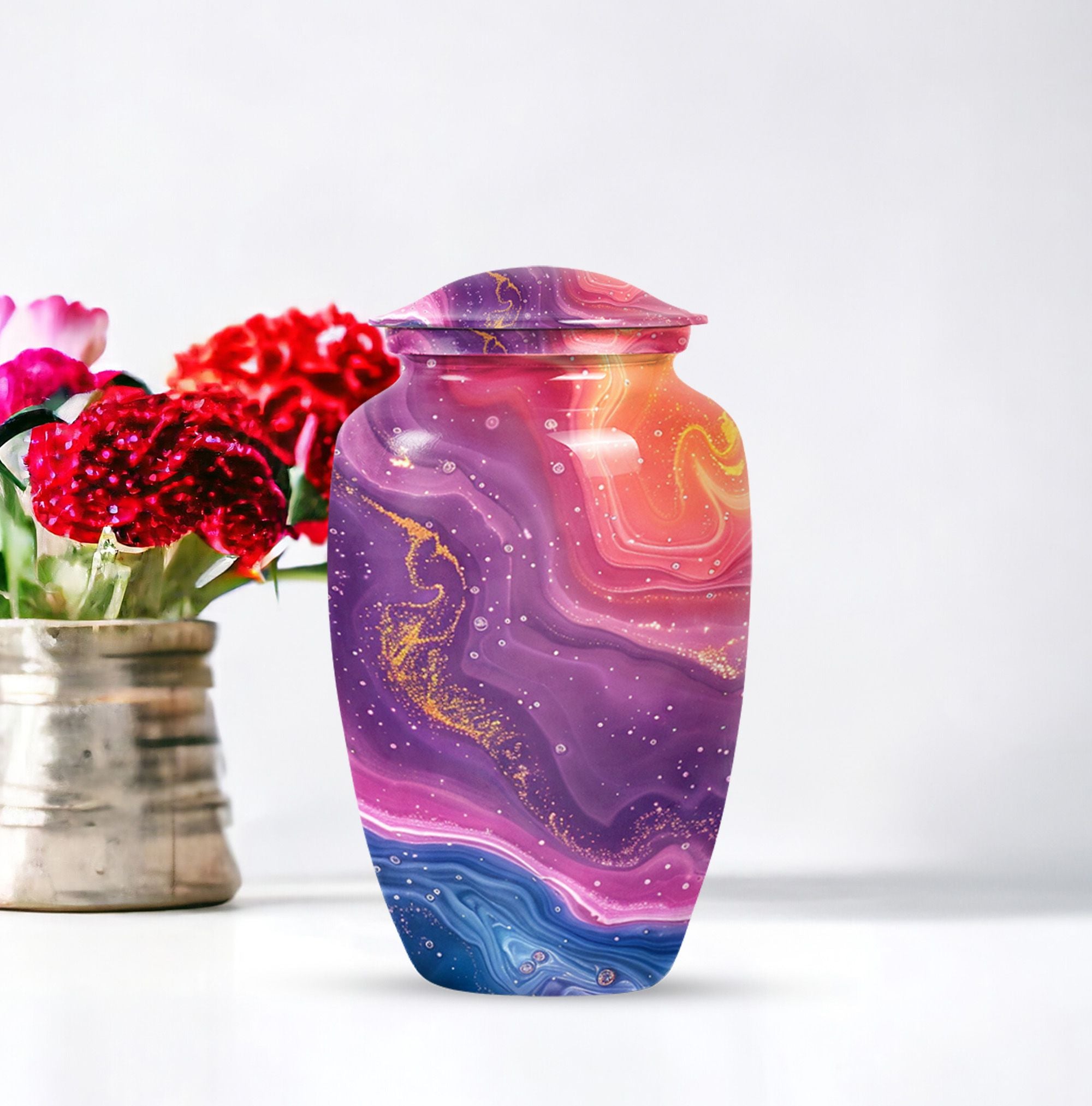 Honor your loved one with a dignified final gesture. Our Abstract Urn - an exclusive piece in our range of large-size, aluminium cremation urns designed to safeguard human ashes. Crafted to measure 10 inches in height and weighing a solid 3.3 pounds, this elegant urn not only respects the seriousness of its purpose but also adds a touch of sophistication. Boasting an impressive capacity of 200 cubic inches, it can comfortably accommodate the ashes of an adult. This cremation urn comes thoughtfully shipped in a velvet pouch, presenting a tender solution for the containment of ashes. Plus, the feature of personalization is available, permitting the engraving of names for a more personal touch. Our choice of material underlines our commitment to longevity, as the metal endures, so will the memory of your dearly departed. A remarkable 'cremation urn' indeed, designed exclusively for men, women, and ideal for funeral ceremonies. Its abstract theme adds a unique appeal to it, celebrating the life of your loved one.