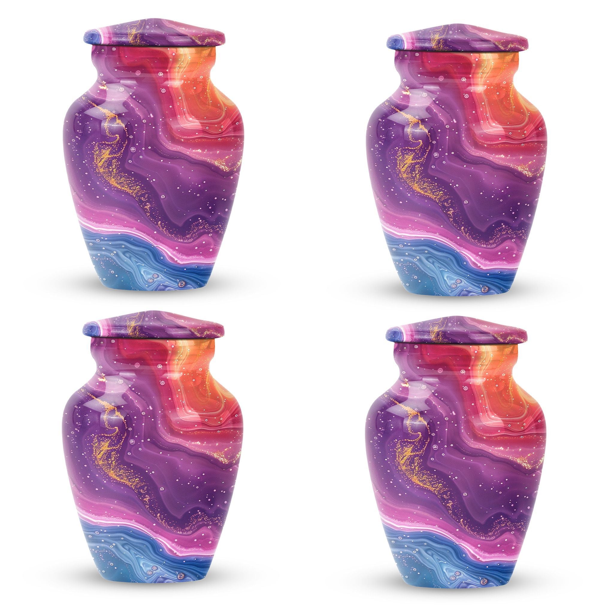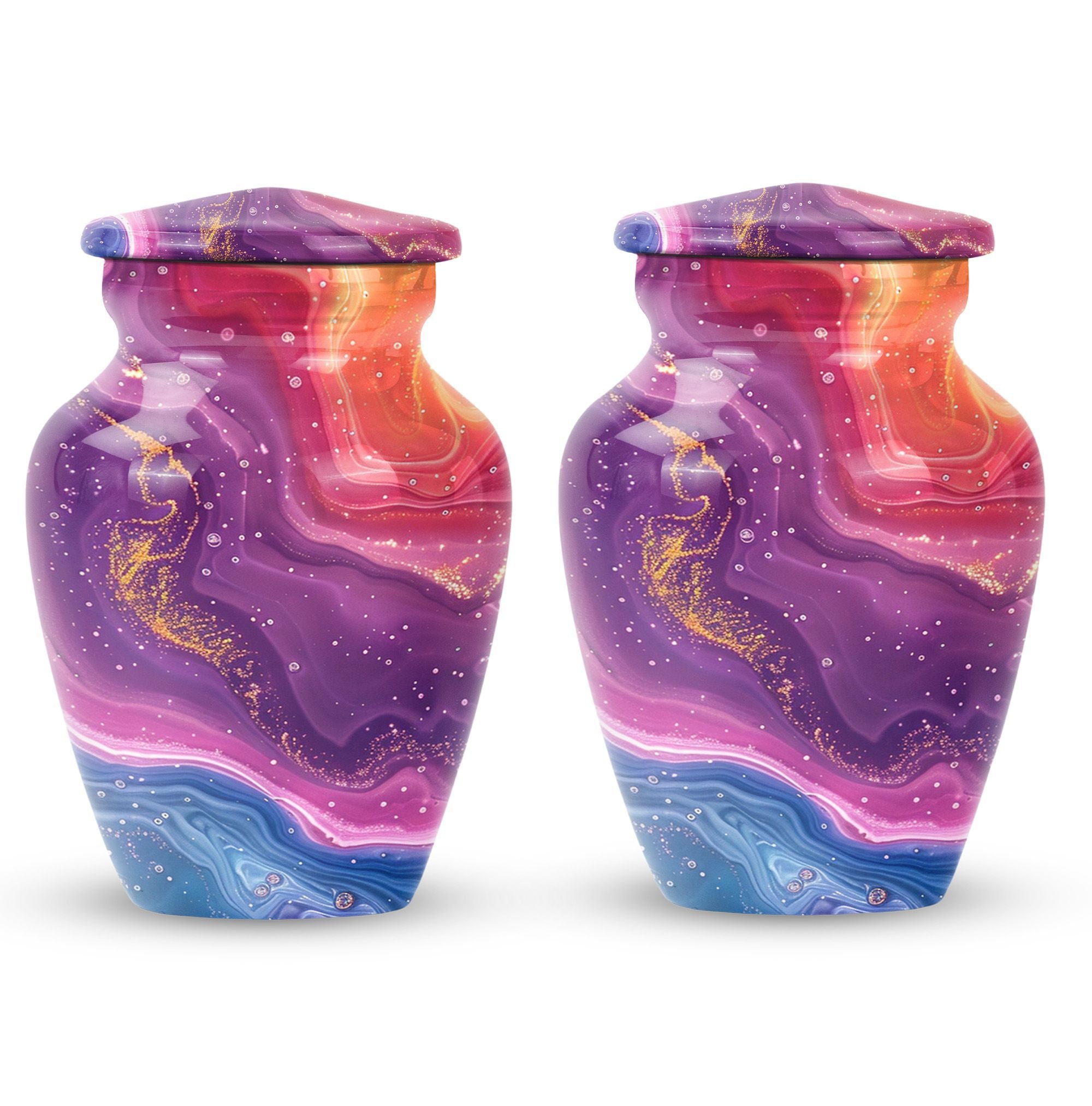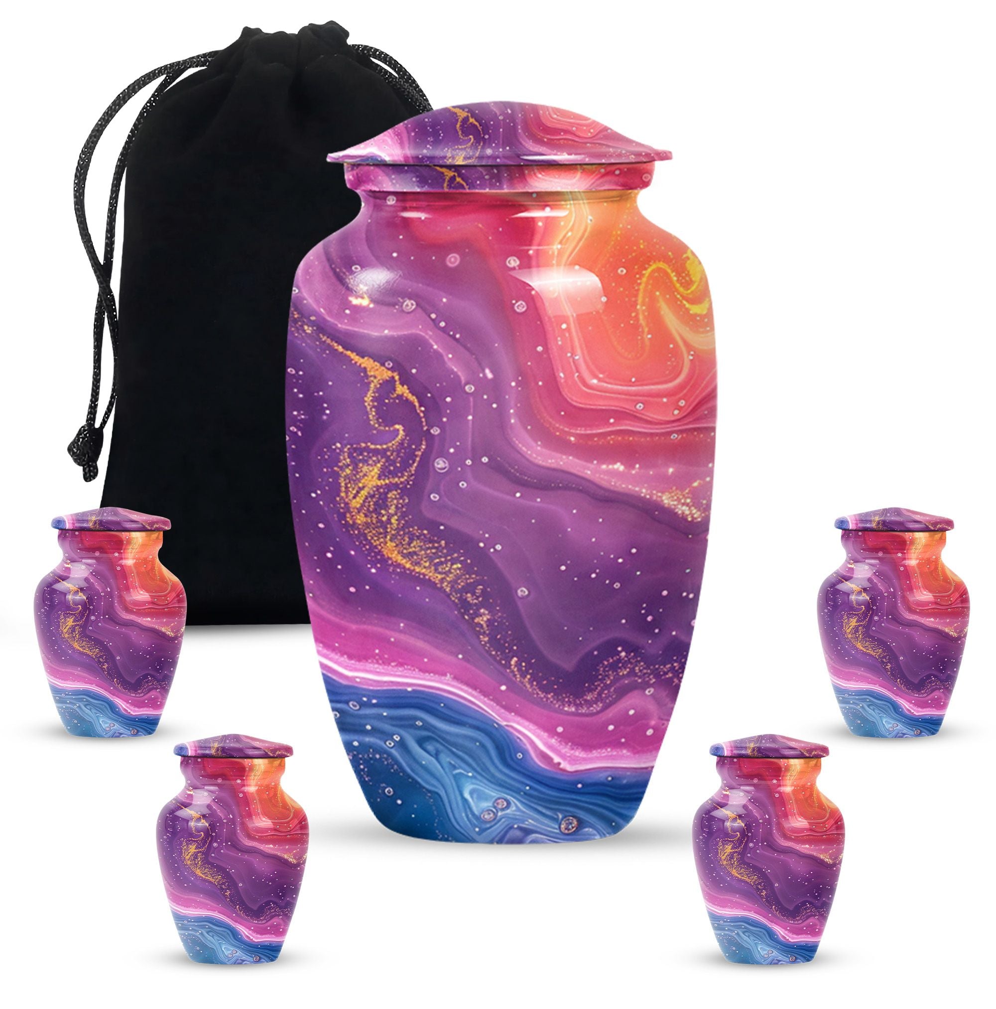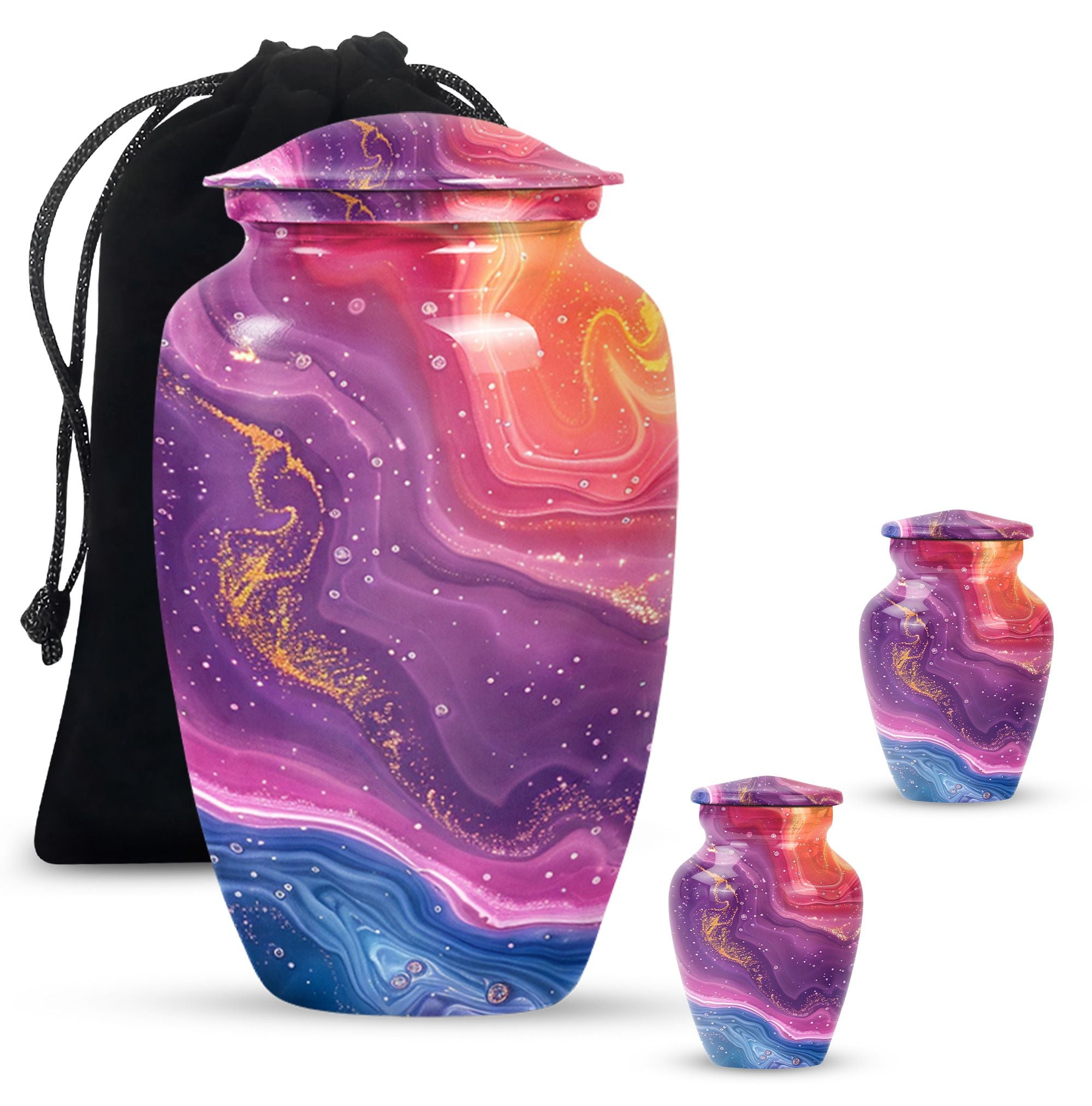 Honor your loved one with a dignified final gesture. Our Abstract Urn - an exclusive piece in our range of large-size, aluminium cremation urns designed to safeguard human ashes. Crafted to measure 10 inches in height and weighing a solid 3.3 pounds, this elegant urn not only respects the seriousness of its purpose but also adds a touch of sophistication. Boasting an impressive capacity of 200 cubic inches, it can comfortably accommodate the ashes of an adult. This cremation urn comes thoughtfully shipped in a velvet pouch, presenting a tender solution for the containment of ashes. Plus, the feature of personalization is available, permitting the engraving of names for a more personal touch. Our choice of material underlines our commitment to longevity, as the metal endures, so will the memory of your dearly departed. A remarkable 'cremation urn' indeed, designed exclusively for men, women, and ideal for funeral ceremonies. Its abstract theme adds a unique appeal to it, celebrating the life of your loved one.
