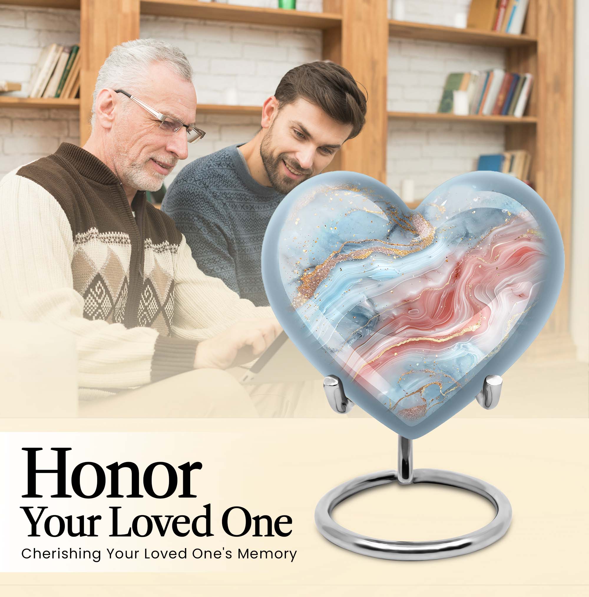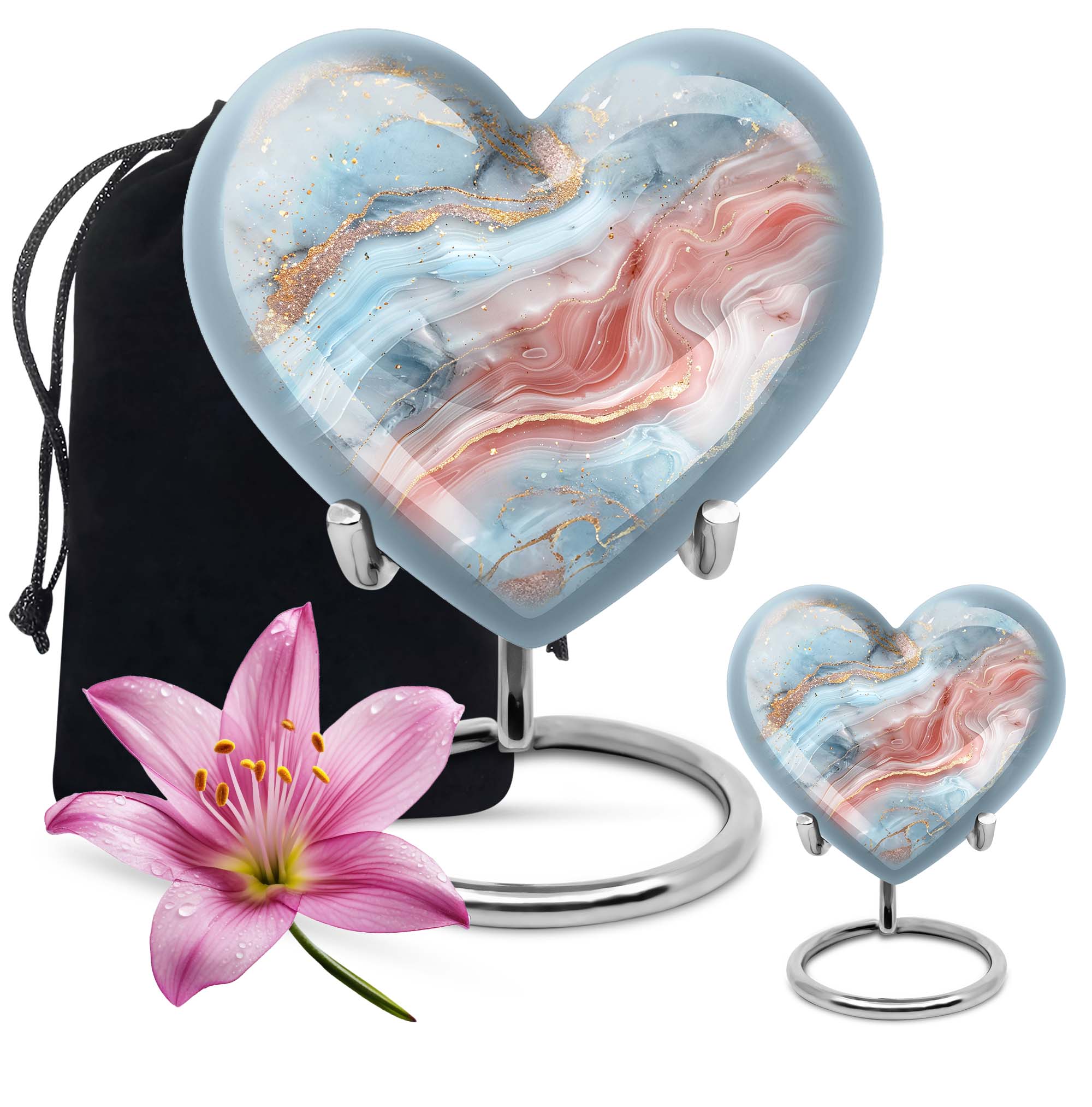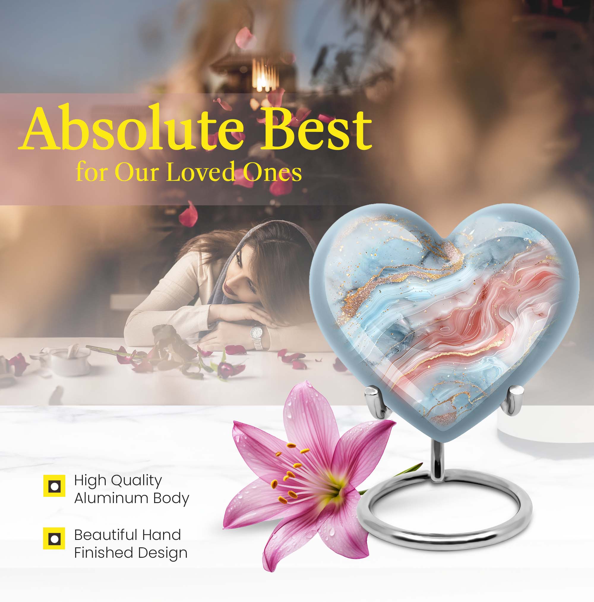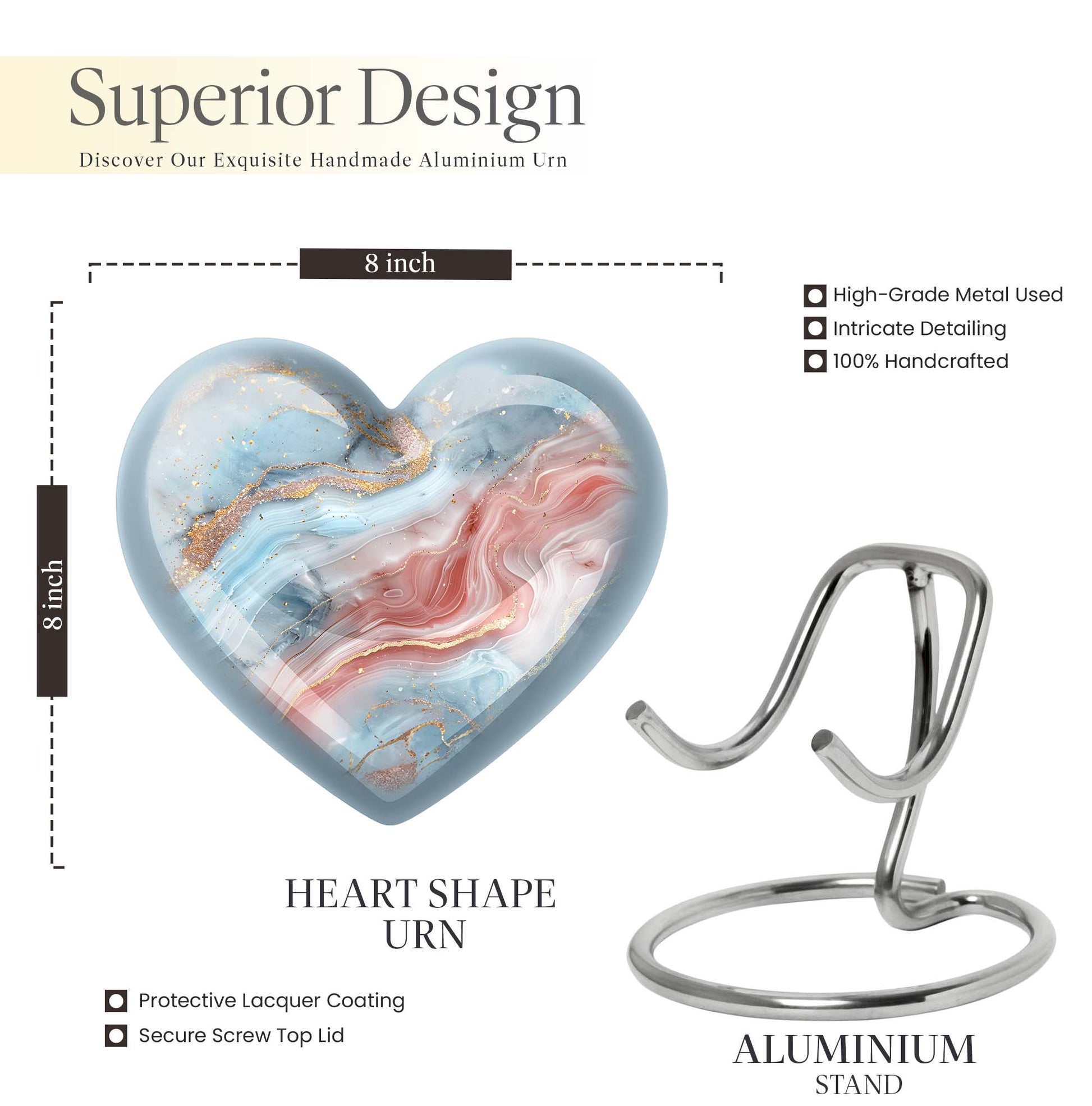 Treasure the memories of your loved one with our tastefully crafted Abstract Urn, an optimal choice for cremation urns for ashes suited for adult males. Constructed from high-quality Aluminium, these large-sized Memorial urns have a height of 10 inches. Weighing just 3.3 pounds, these Urns boast a capacity of 200 cubic inches, ideal for the respectful containment of ashes. What makes our Abstract Urn stand out is the degree of personalization it offers. Customize your order with engraved names, rendering it a heartfelt homage to the departed. It comes with a comforting velvet pouch to safely house the ashes. Its abstract theme and stunning heart shape make it a dignified homage piece. An additional advantage of this urn is its portability, which makes it an ideal pick for travel. It is tasteful, touchingly personal, and thoughtful - a fitting tribute to the memory of your loved one.