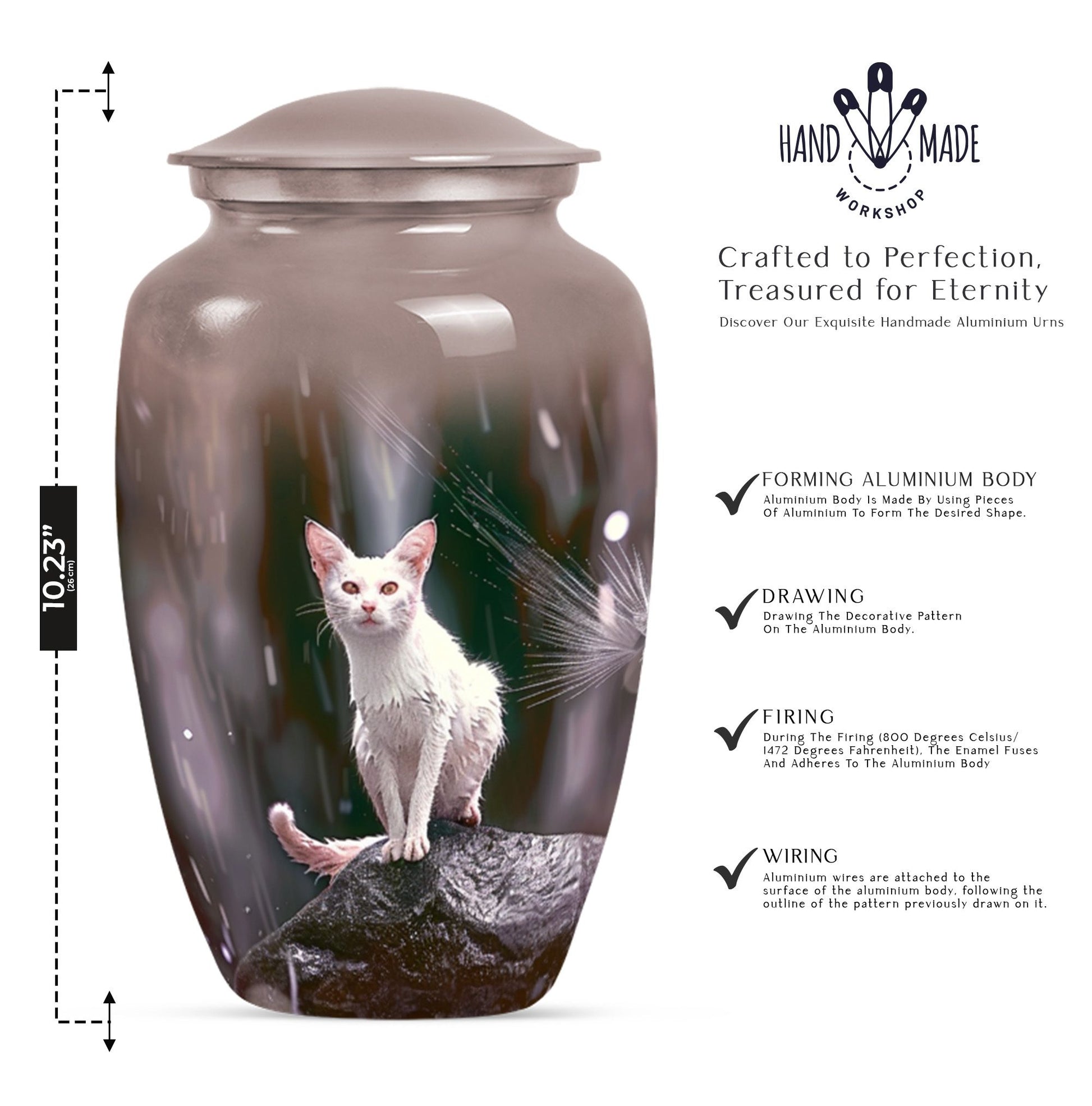 This impeccable 10-inch white cat urn is an excellent embarking of honoring the life of a loved one. Crafted meticulously from premium quality, lightweight aluminium, this funeral large urn provides a durable and elegant resting place for human adult male ashes. It boasts a capacity of 200 cubic inches which adeptly holds ashes and weighs only 3.3 pounds. The package comes complete with a luxurious velvet pouch designed for containment of the ashes in the urn. The urn honors the 'Abstract' theme thereby making it more elaborative and appealing. A standout feature is the possibility of adding that extra personal touch by engraving names of your choice. Note, this offering is also suitable as memorial urns for ashes of adult female hence providing a beautiful representation for both genders. Known for its durability, this urn cumulatively caters to all sexes and stands out as a resplendent piece of corporality among other cremation, companion urns. In memoriam, purchase our unique urn to cherish the unforgettable memories of the departed soul.