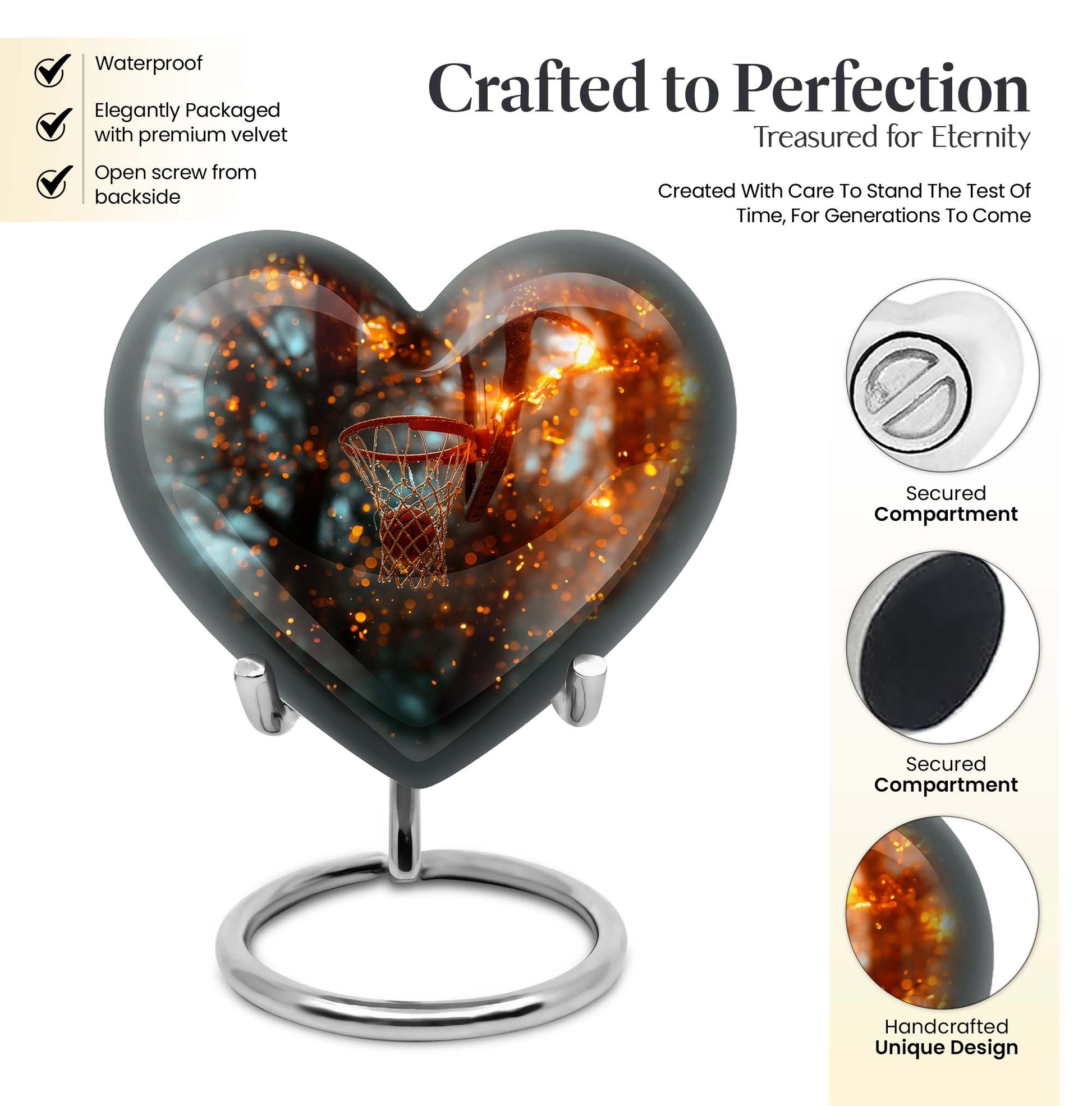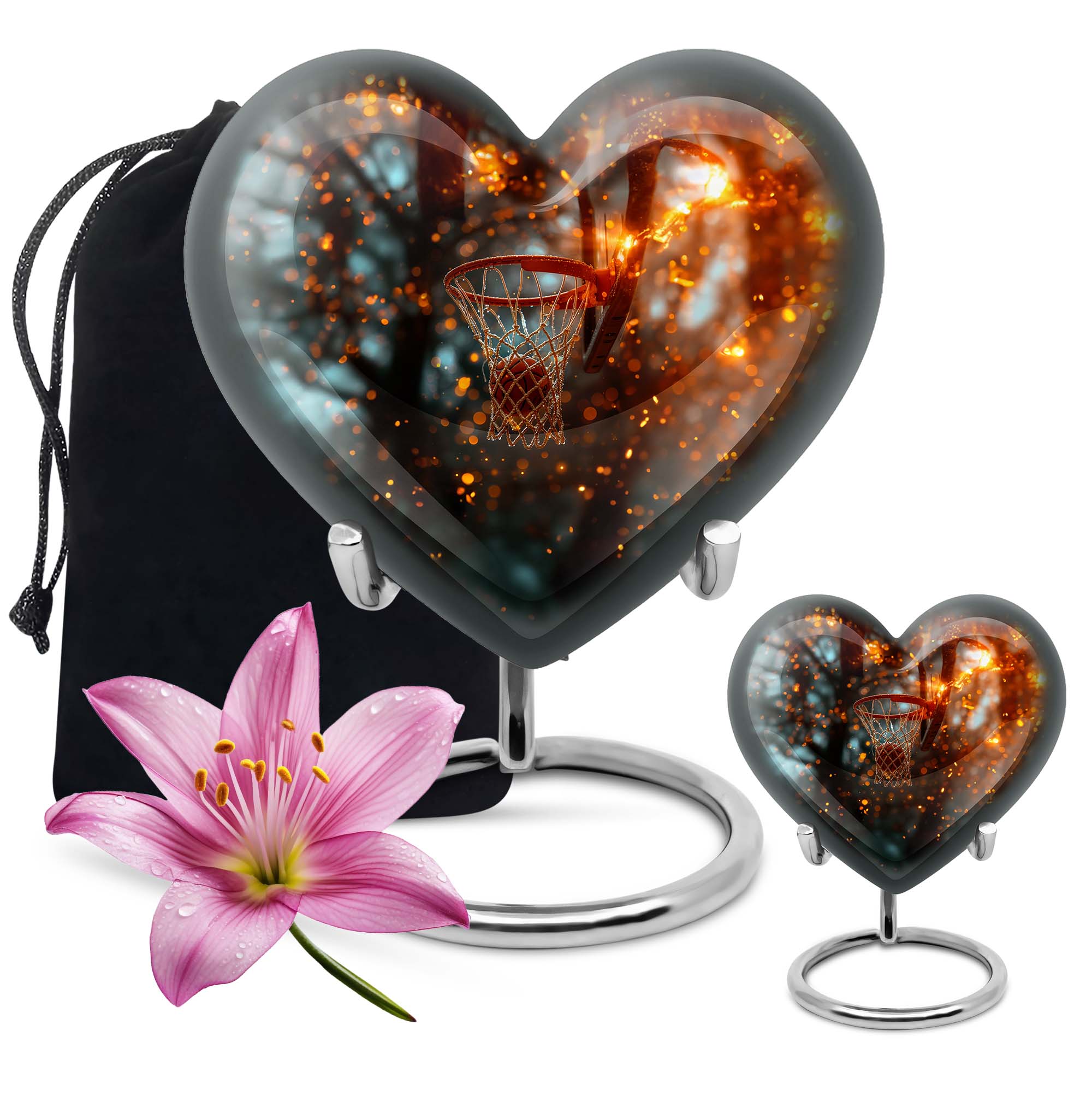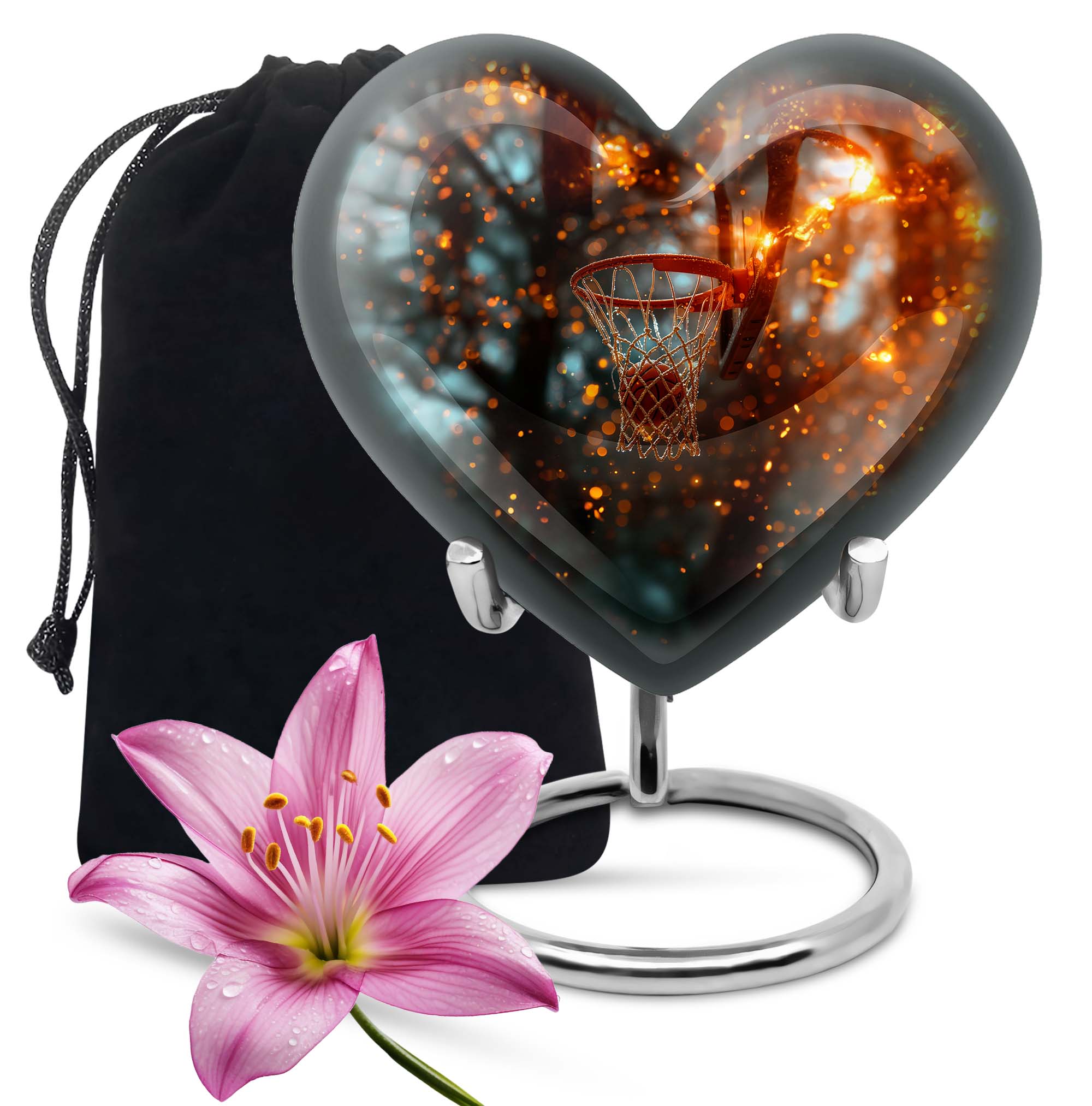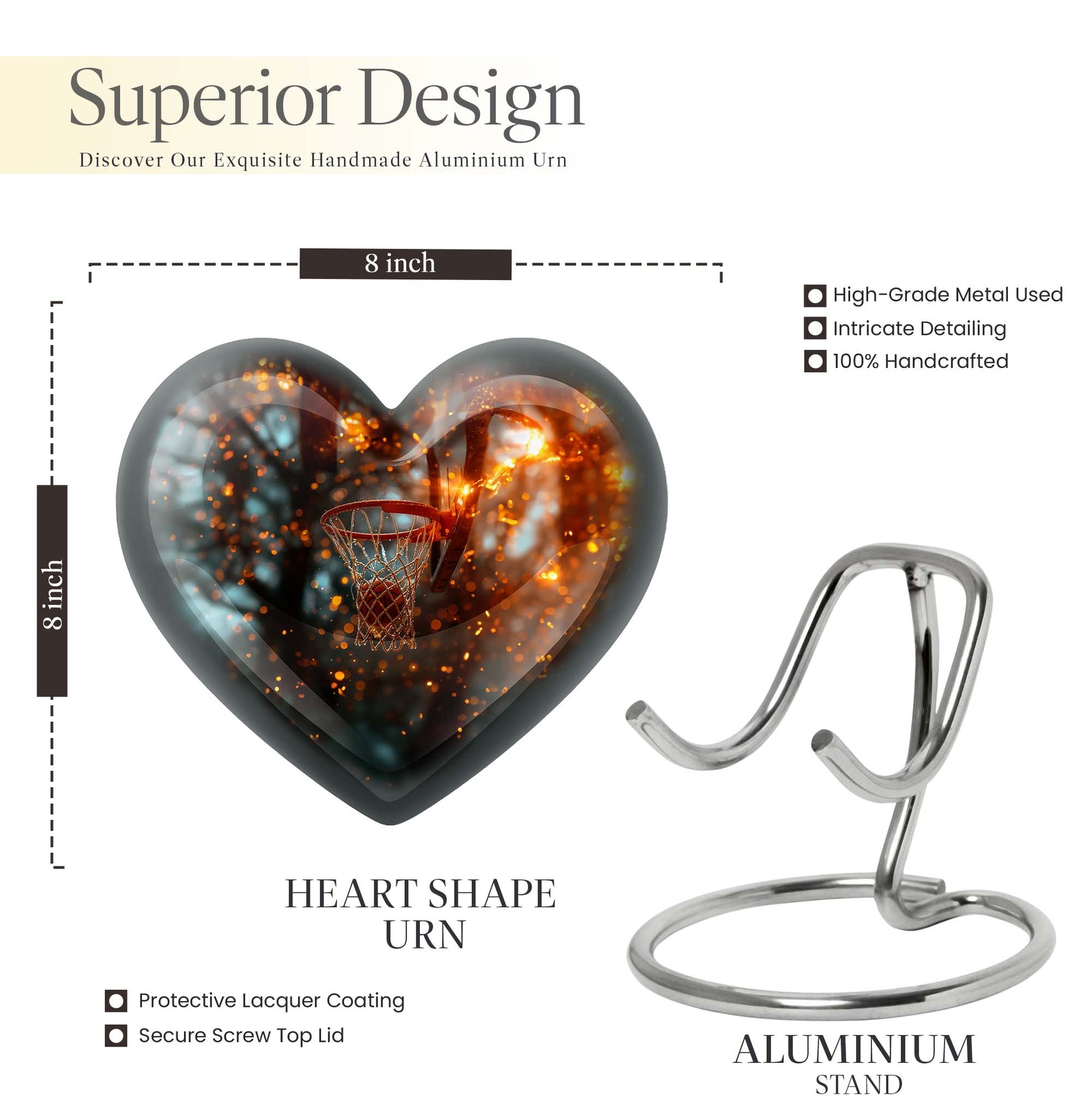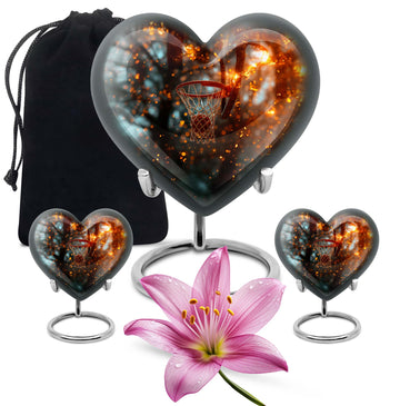 Honor the memory of your dearly departed with our unique contemporary Aurora Borealis themed Heart Urn. This 10-inch Large Urn showcases an appealing and sophisticated Aluminium body –, an innovative departure from conventional urn designs; it contains an expansive capacity of 200 cubic inches. The urn is expertly crafted, weighing 3.3 pounds, testament to its top-tier durability. This Basketball Urn serves as a beautiful gesture of love, a ceremonial tribute to the eternal journey of the departed. With a calming Aurora Borealis theme, this crescendo of emotions are encased within a robust exterior. It employs a secure velvet pouch for the dignified containment of ashes. This cremation urn for ashes is customizable, offering you the ability to personalize it with engraved names. Doubling as a compelling home decor, it stands out subtly among the homely atmosphere. Note: This urn does not include the 'Design' attribute. Boost your memorial affection with our meticulously curated cremation offerings. Perfect for senior adults seeking modern, quality burial urns for adult female ashes.
