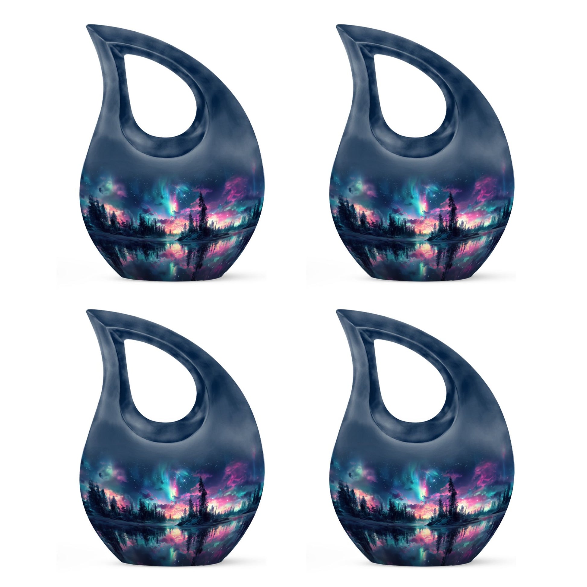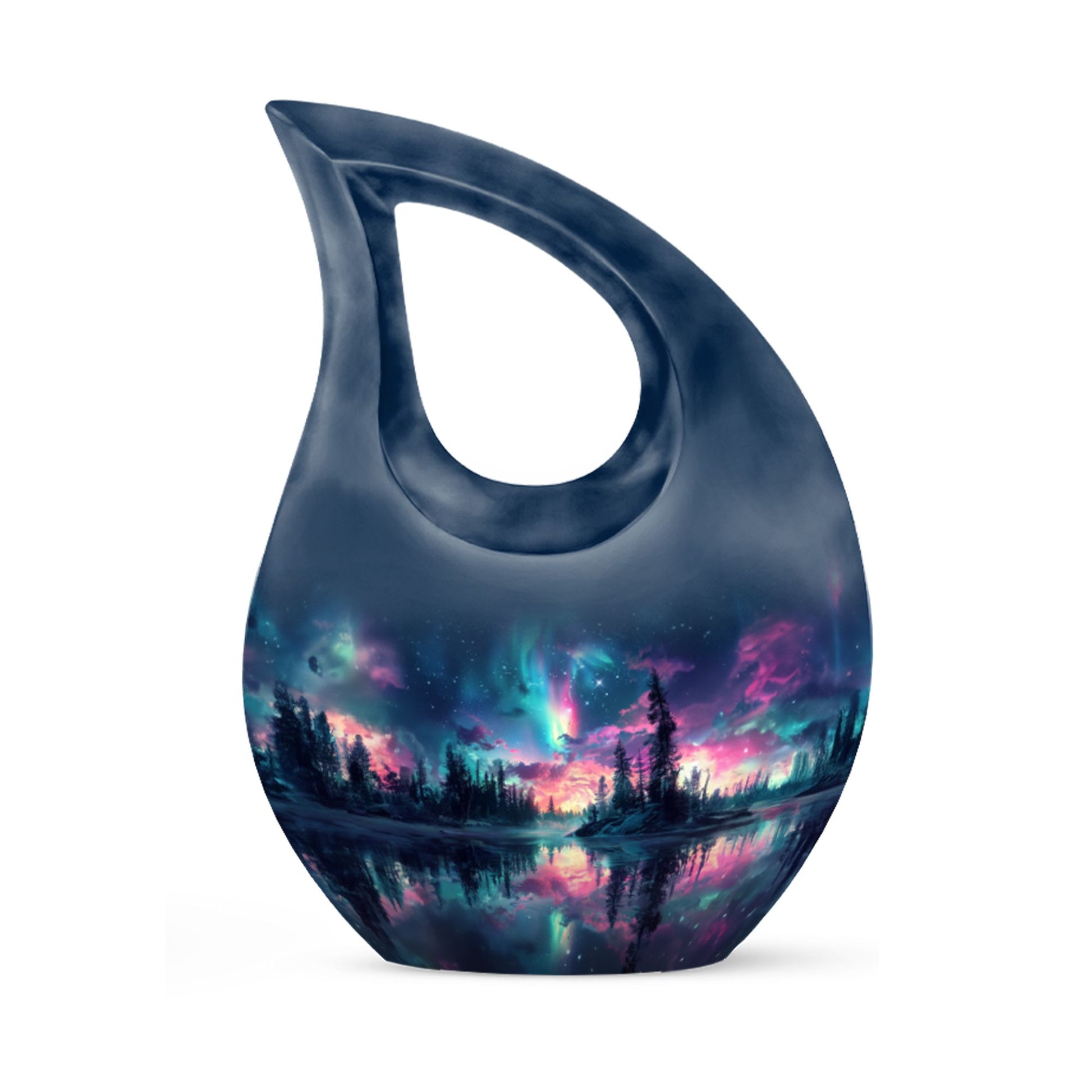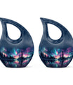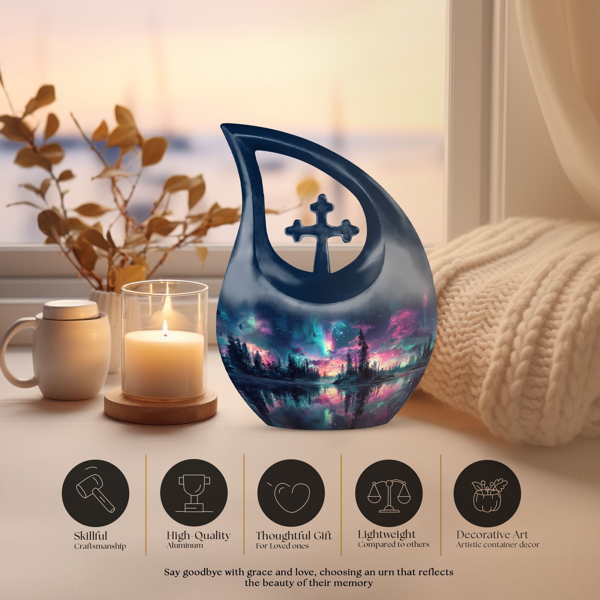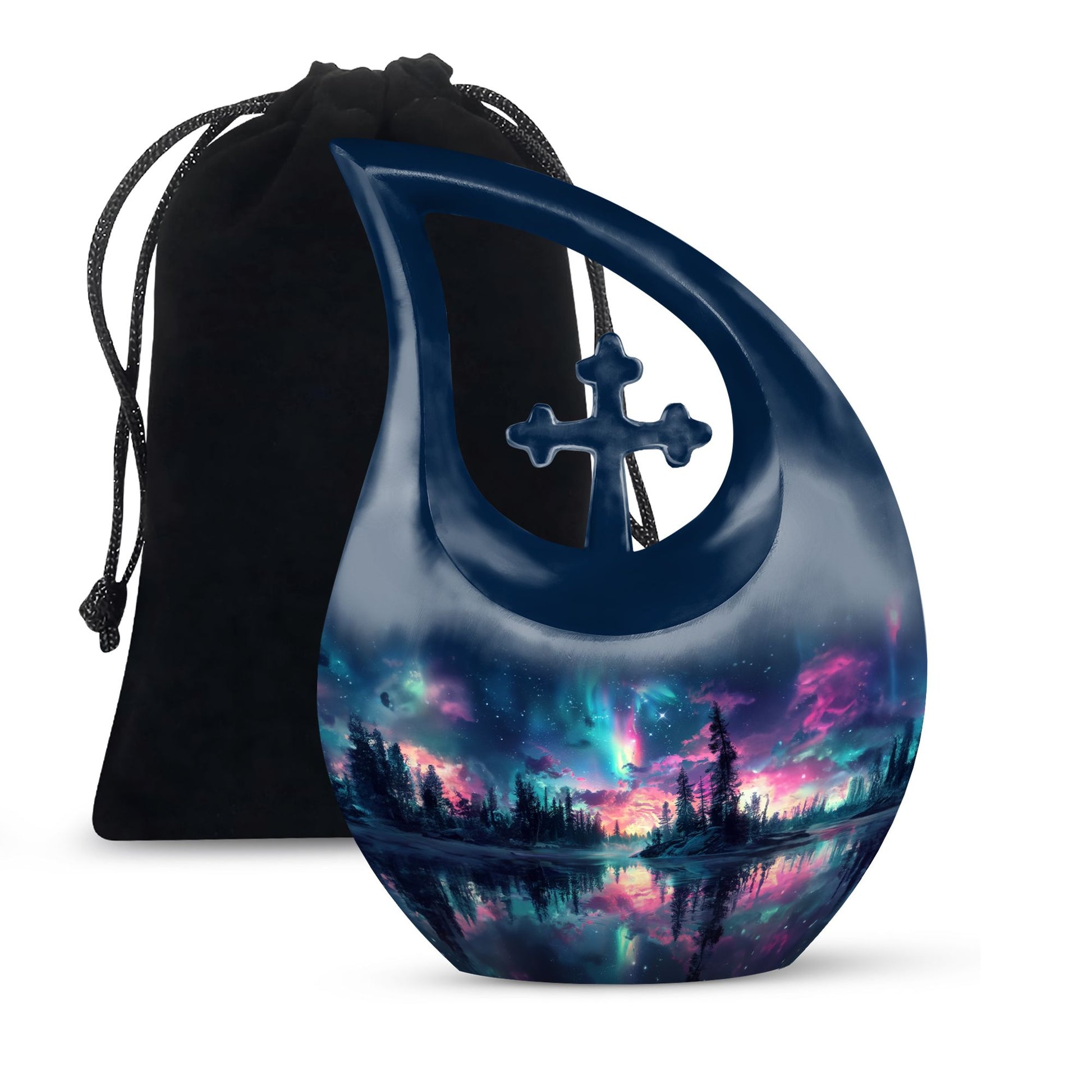 Elevate your testament to love eternal with our unique Arora Borealis Urn. Crafted from sturdy aluminium, this premier memorial urn is a shining exemplar of honor and reverence. Standing 10 inches tall, the urn weighs 3.3 pounds, balancing durability with elegance. The urn's 'Cross Drop' theme imbues it with a solemn air of respect fitting for a cherished memory. Designed to secure up to 200 cubic inches of remains, it comfortably accommodates adult-size quantities. Each purchase includes a velvet pouch providing a dignified containment for the ashes. Additionally, the urn offers an opportunity to personalize your testament with an engraved name, turning this urn into a unique and touching memento. Our Arora Borealis Urn is not just another item from the ‘Urns For Sale’ category, it is a large, affordable cremation urn that encapsulates devotion. Tranquil yet grandiose, it is a befitting artifact that nurtures the remembrance of lives well lived.