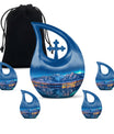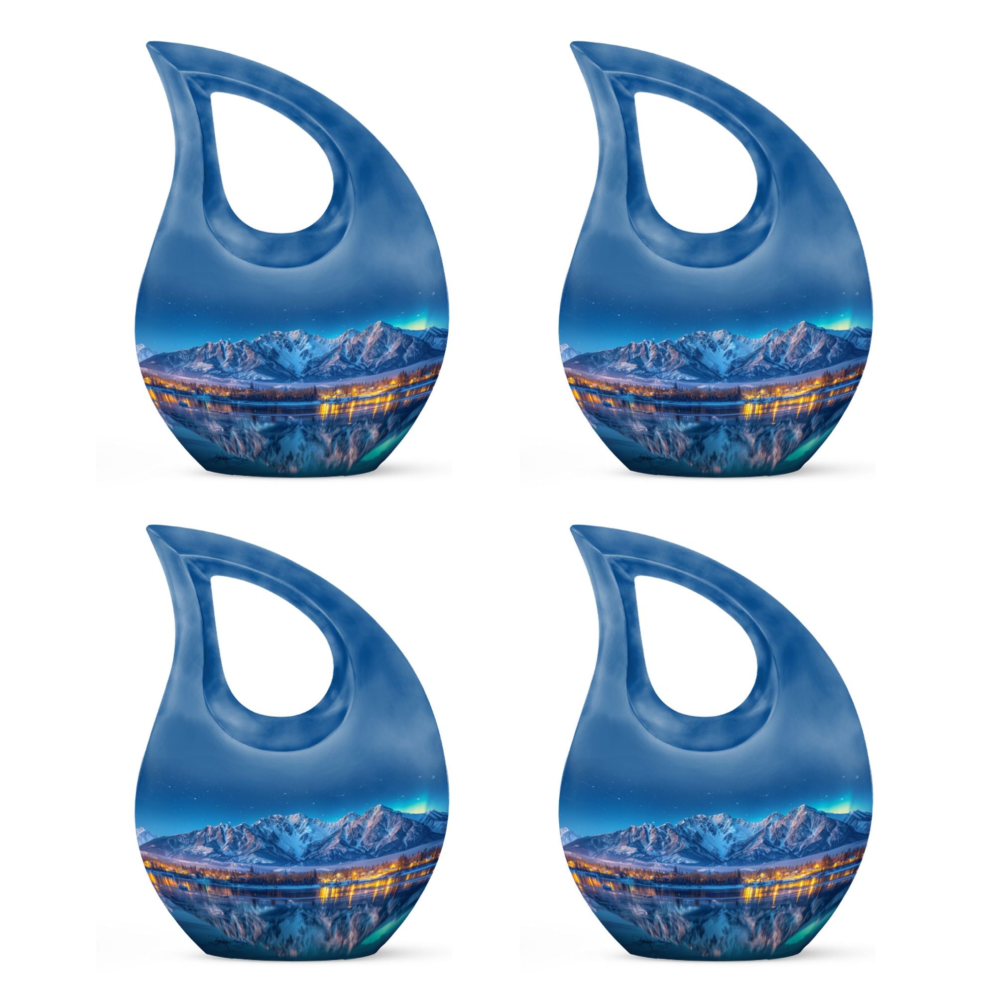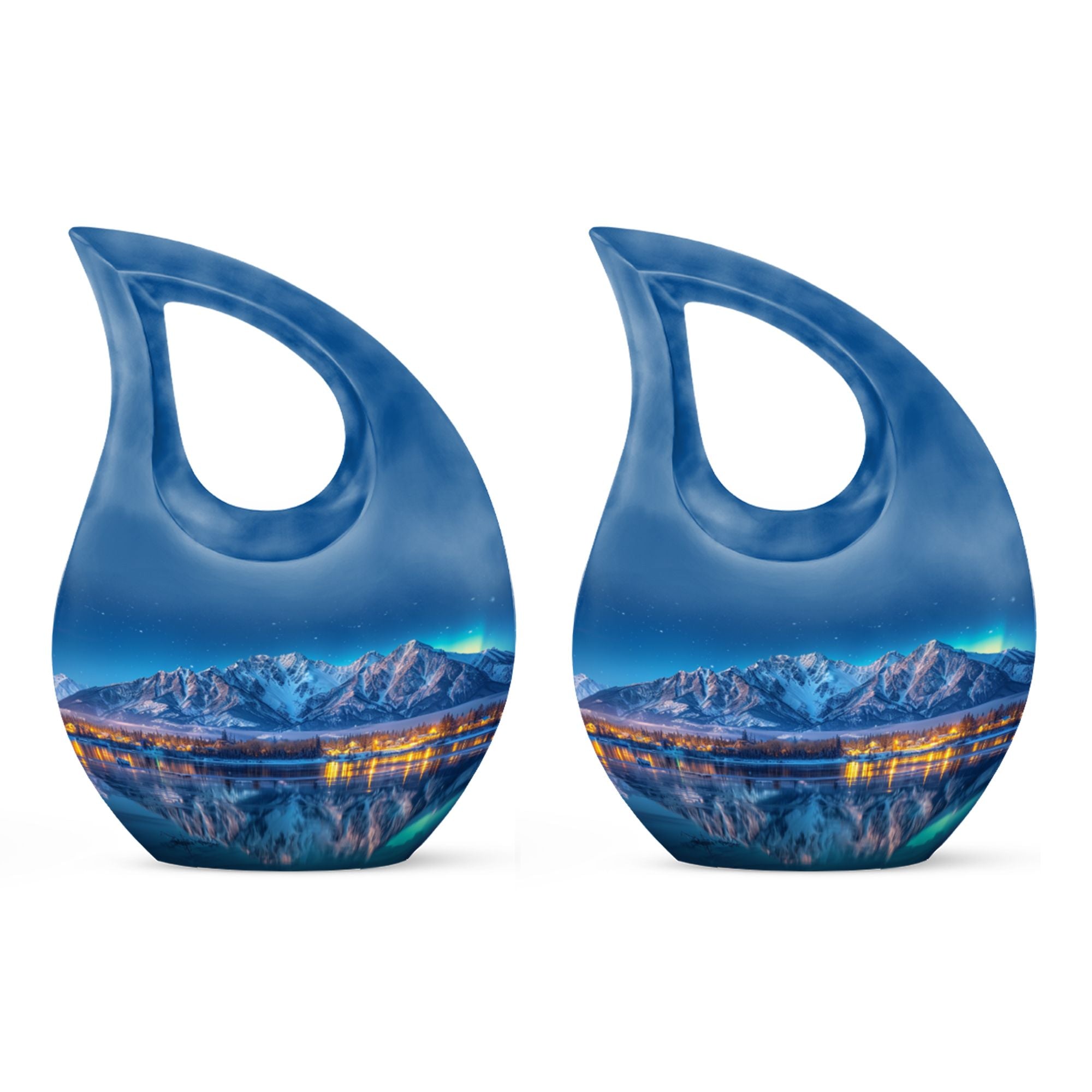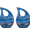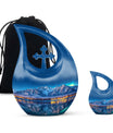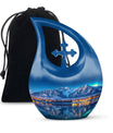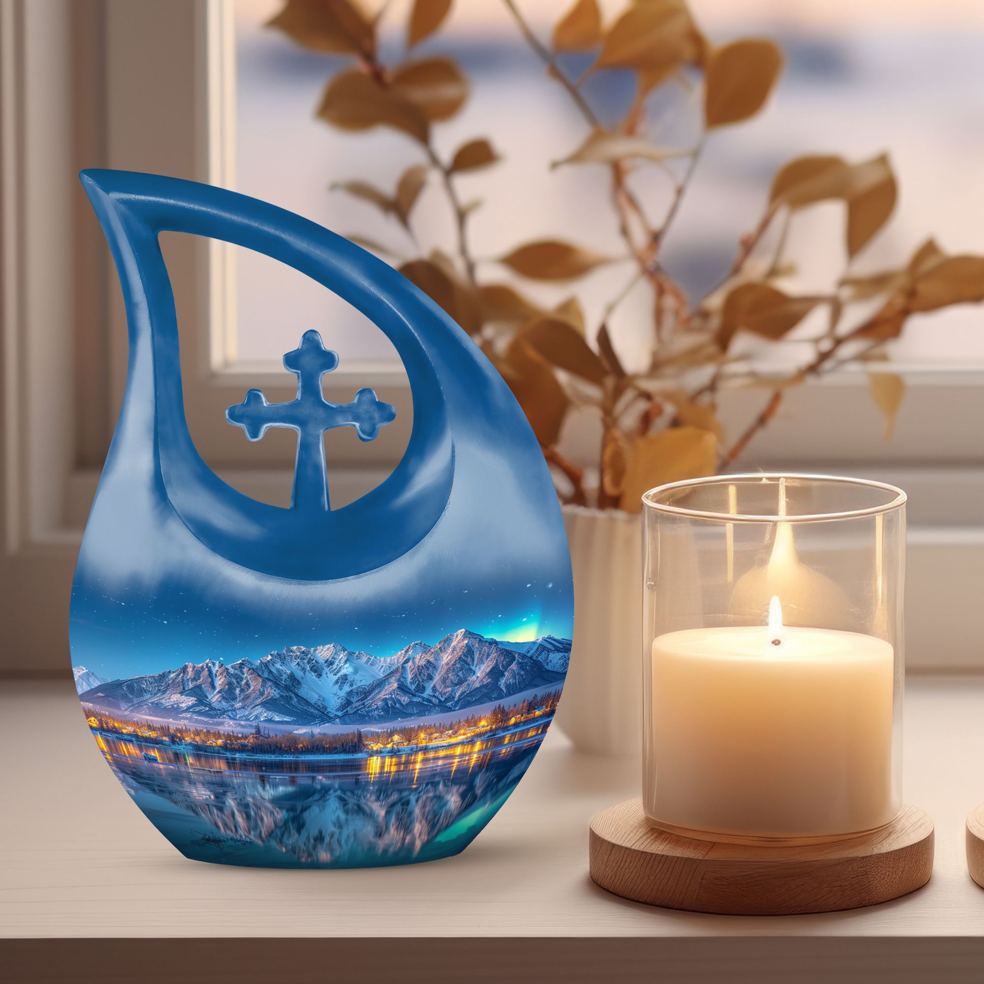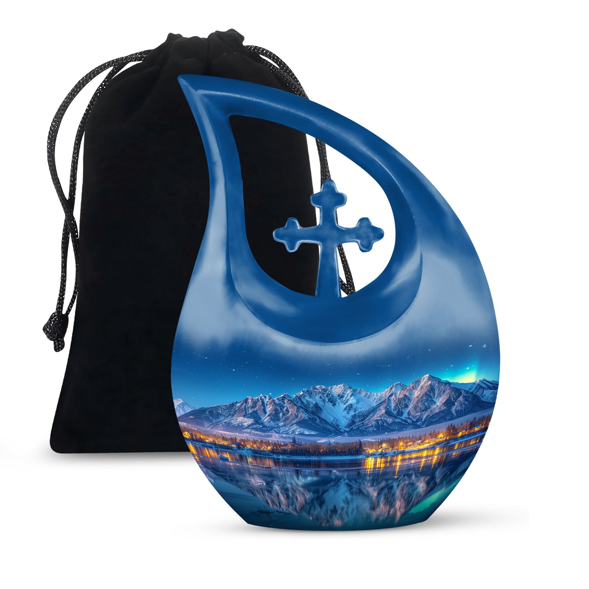 Divine serenity meets ethereal beauty with our Arora Borealis Cross Drop Urn. Sized at a substantial 10 inches and weighing a sturdy 3.3 pounds, this Large Urn is not just a memorial, but a testament to a loved one's life, radiating an incomparable aura of tranquility. Crafted with high-quality aluminium, it exhibits durability that complements its striking aesthetics. Accompanied with a velvet pouch, it ensures safe containment and respectful preservation of about 200 cubic inches of ashes. The epitome of respectful remembrance, this Affordable Funeral Urn allows for your personal touch with optional engraved names, making it uniquely yours. Amongst Cremation Urns, our Cross Drop urn stands out, capturing the essence of an unforgettable sunset with its Arora Borealis theme. A poignant choice for those in search of Cheap Cremation Urns, it stays forever as a comforting presence. Ideal for those wanting to memorialize their loved ones in a distinct way, this Cremation Container is a tangible symbol of timeless regard.