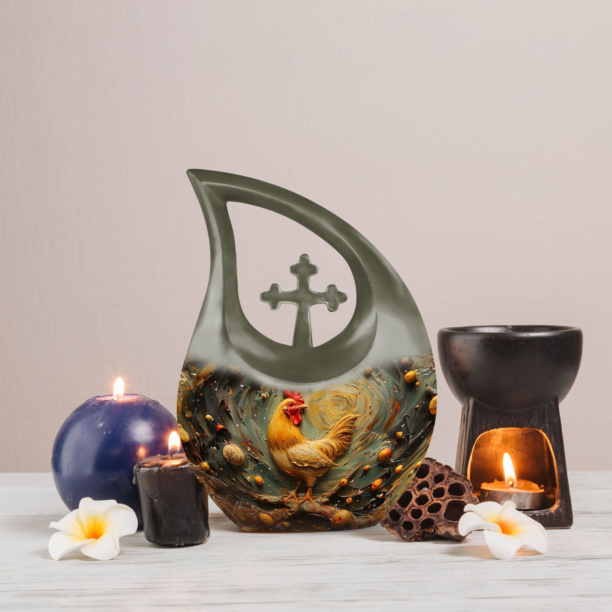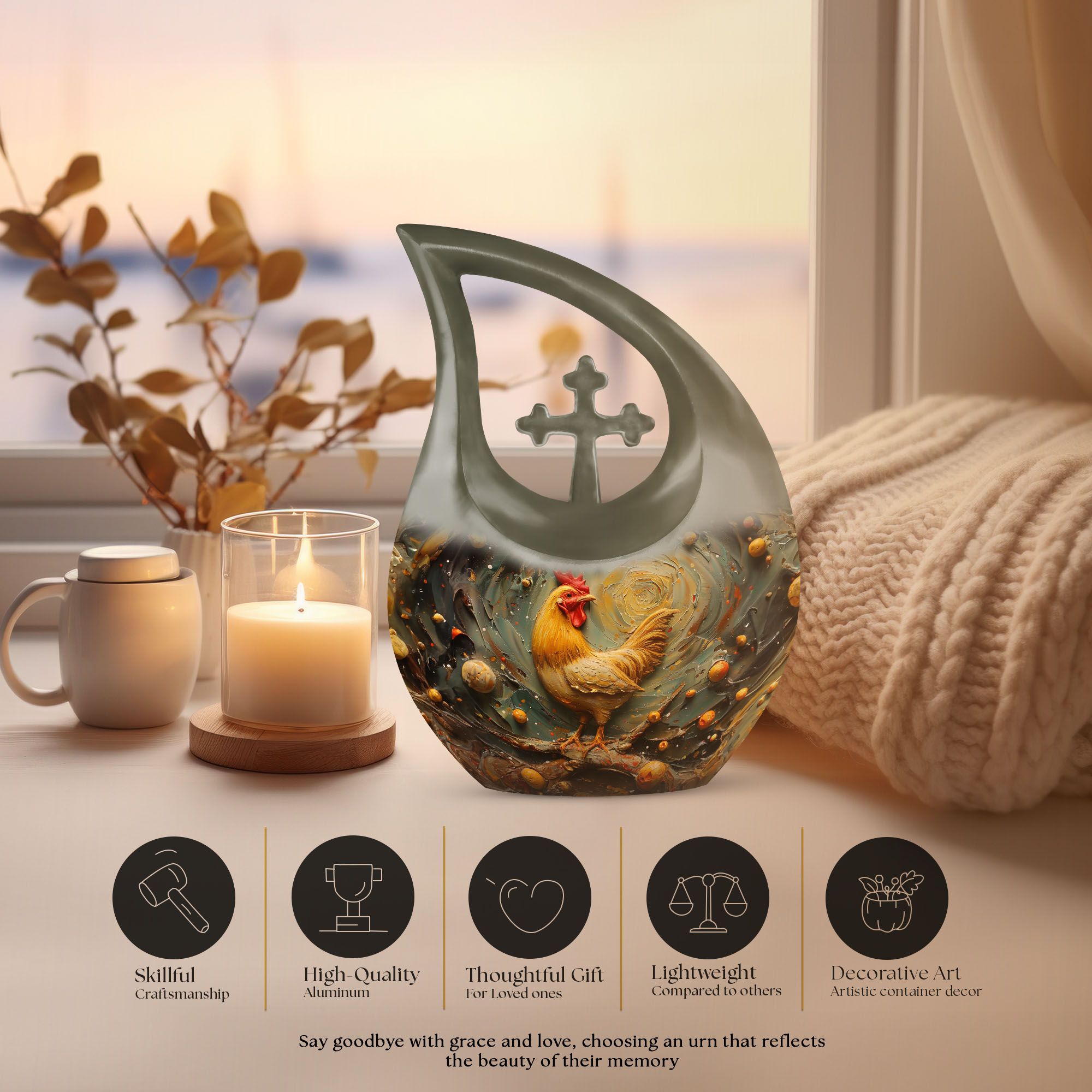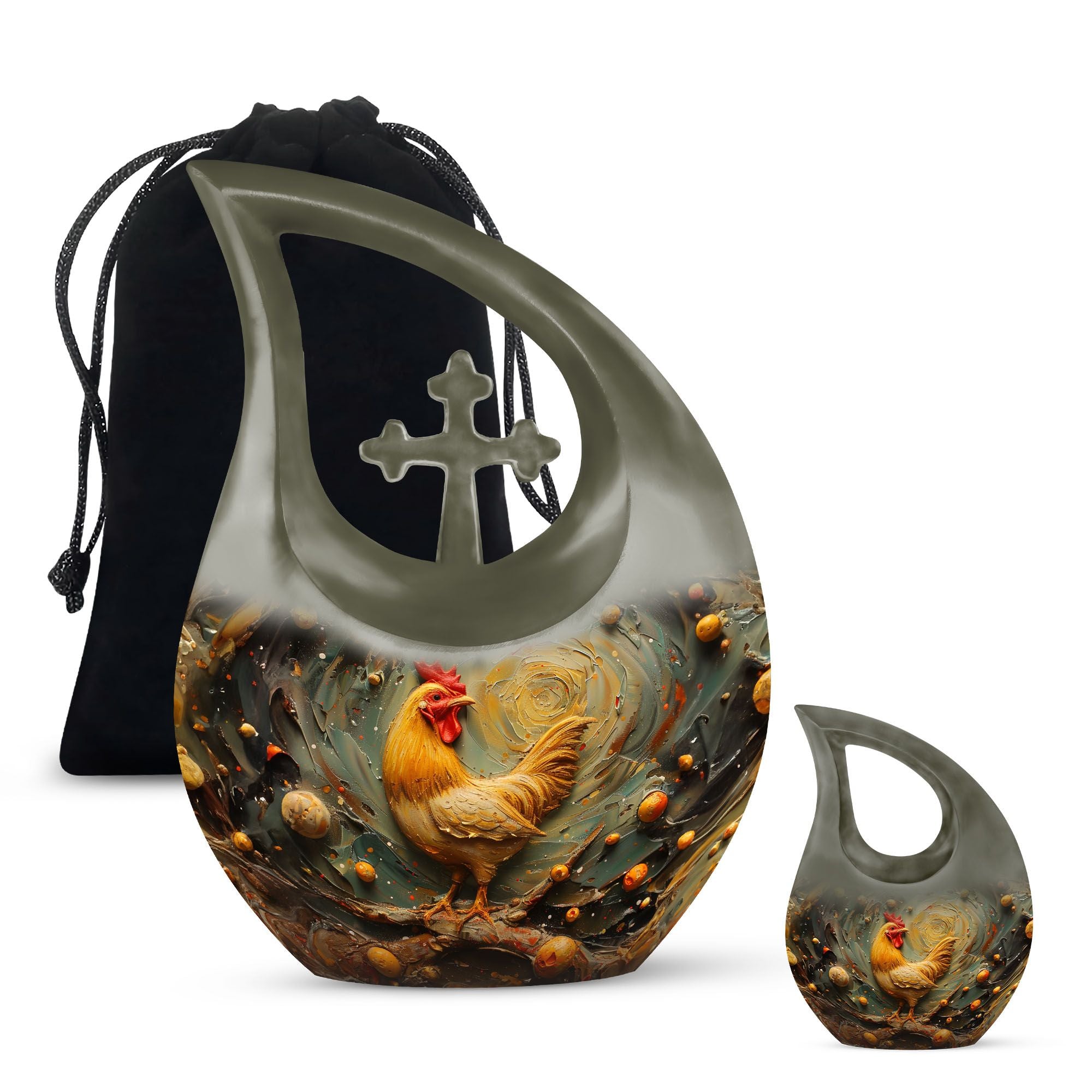 Fulfill your commemorative needs with an affordable, tastefully crafted Chicken Urn. Weaving a connection of faith and devotion, our 'Cross Drop' engraved, 10-inch aluminium urn is a large-sized token of enduring love that could be personalized with names. Its lightweight design at just 3.3 pounds, ensures easy repositioning, should you wish. With a unique offering of a complimentary velvet pouch, containment of ashes is solemnized, ensuring a dignified resting place. The unique 'Chicken' theme offers a heartwarming touch for those appreciating the simpler charm. Suitable for a volume of 200 cubic inches, our Low-cost Cremation Urns or memorial urns find a perfect place in your heart and home. Befitting for use as Cremation Containers and Urns For Ashes, their uniqueness lies in balancing sentiment with subtle elegance. Embrace a distinct ceremonial choice with this unique urn.