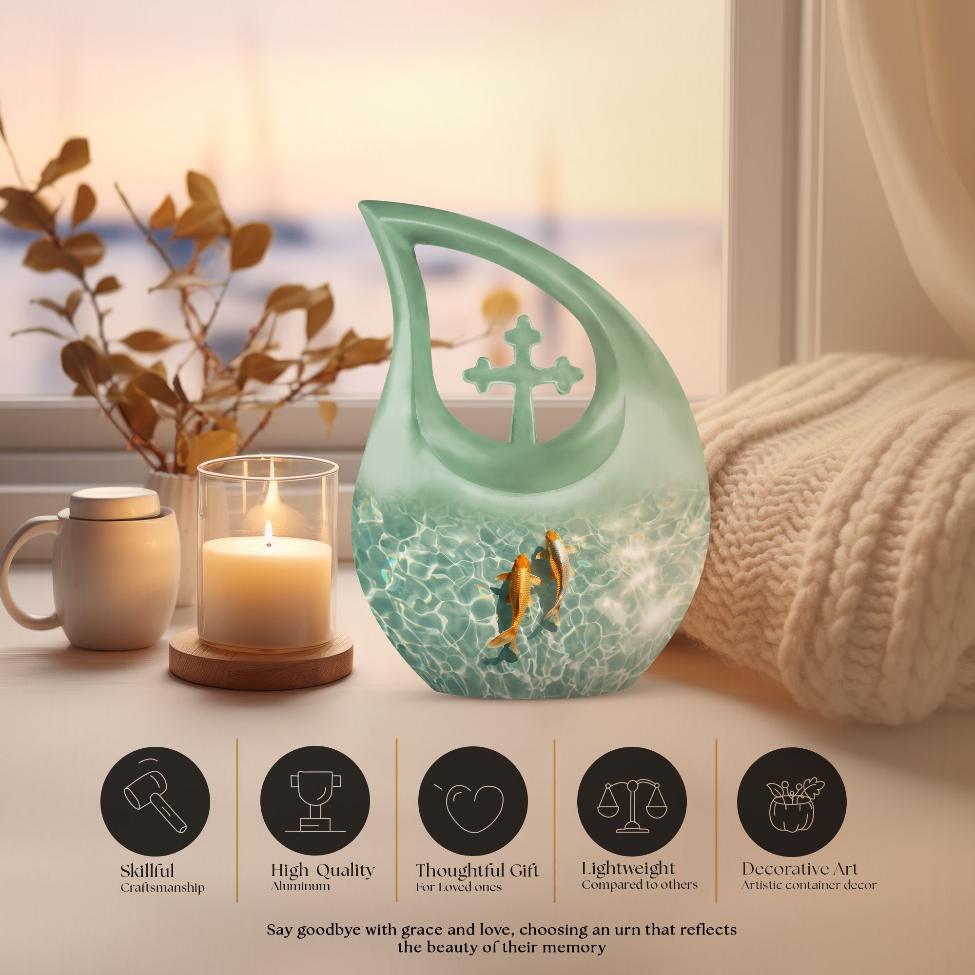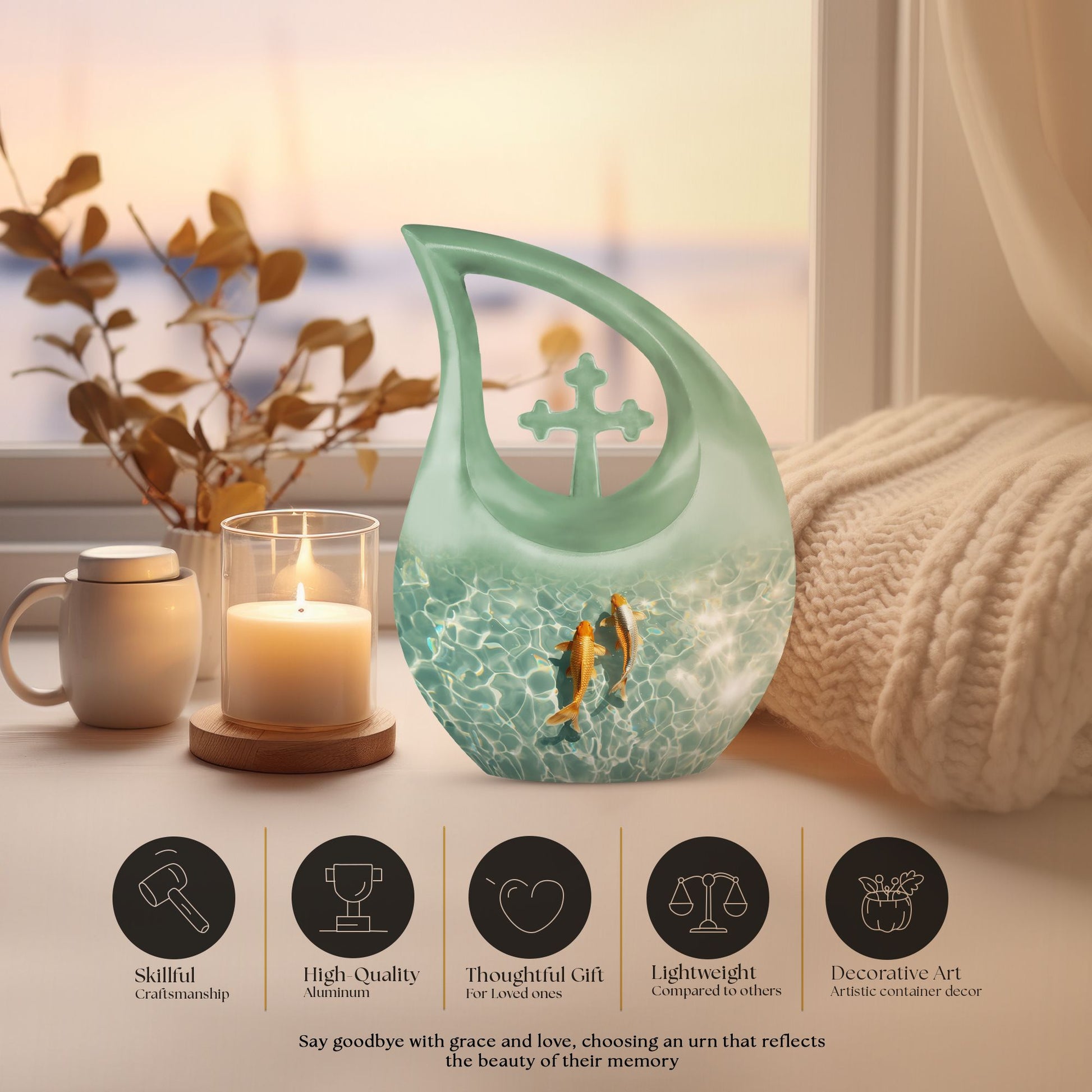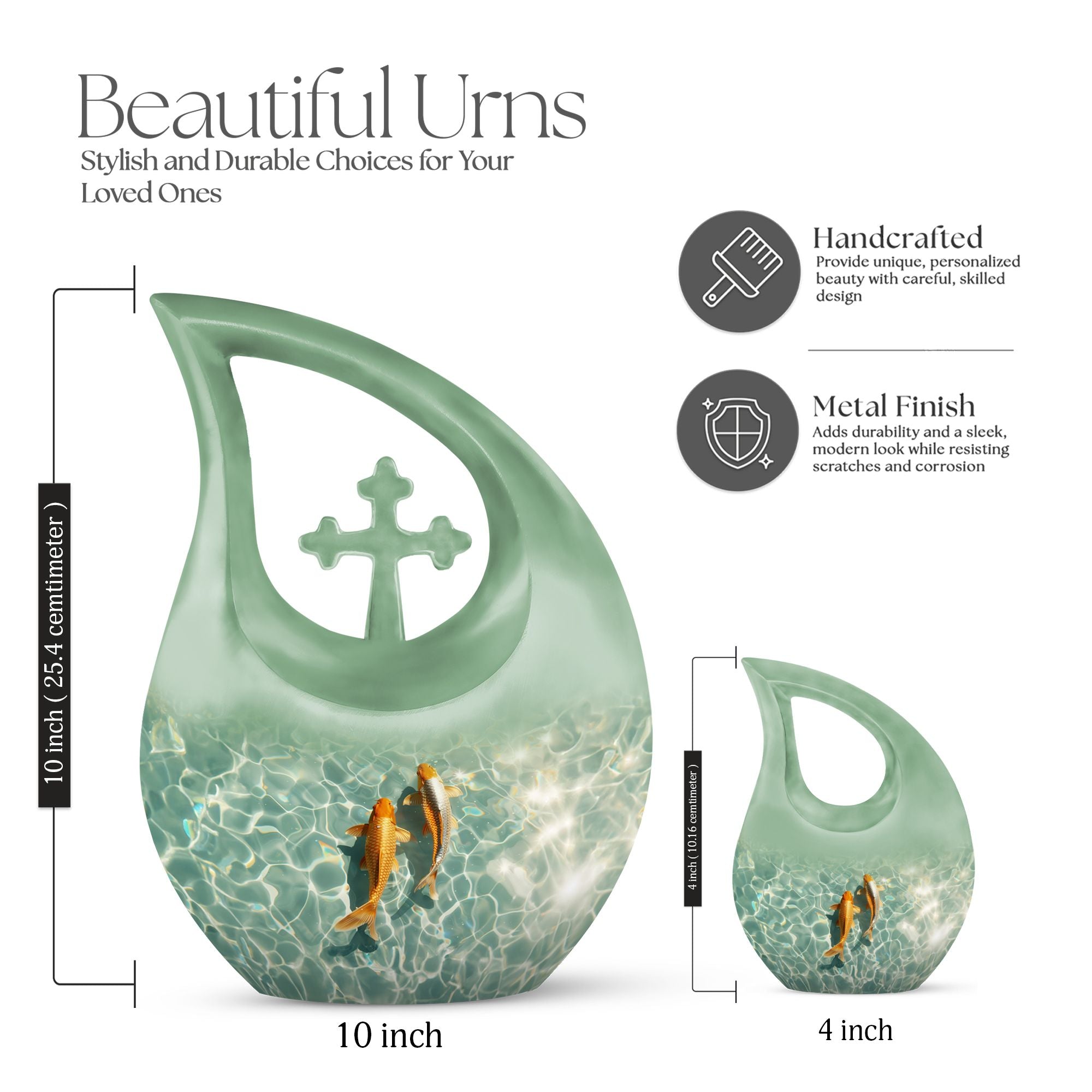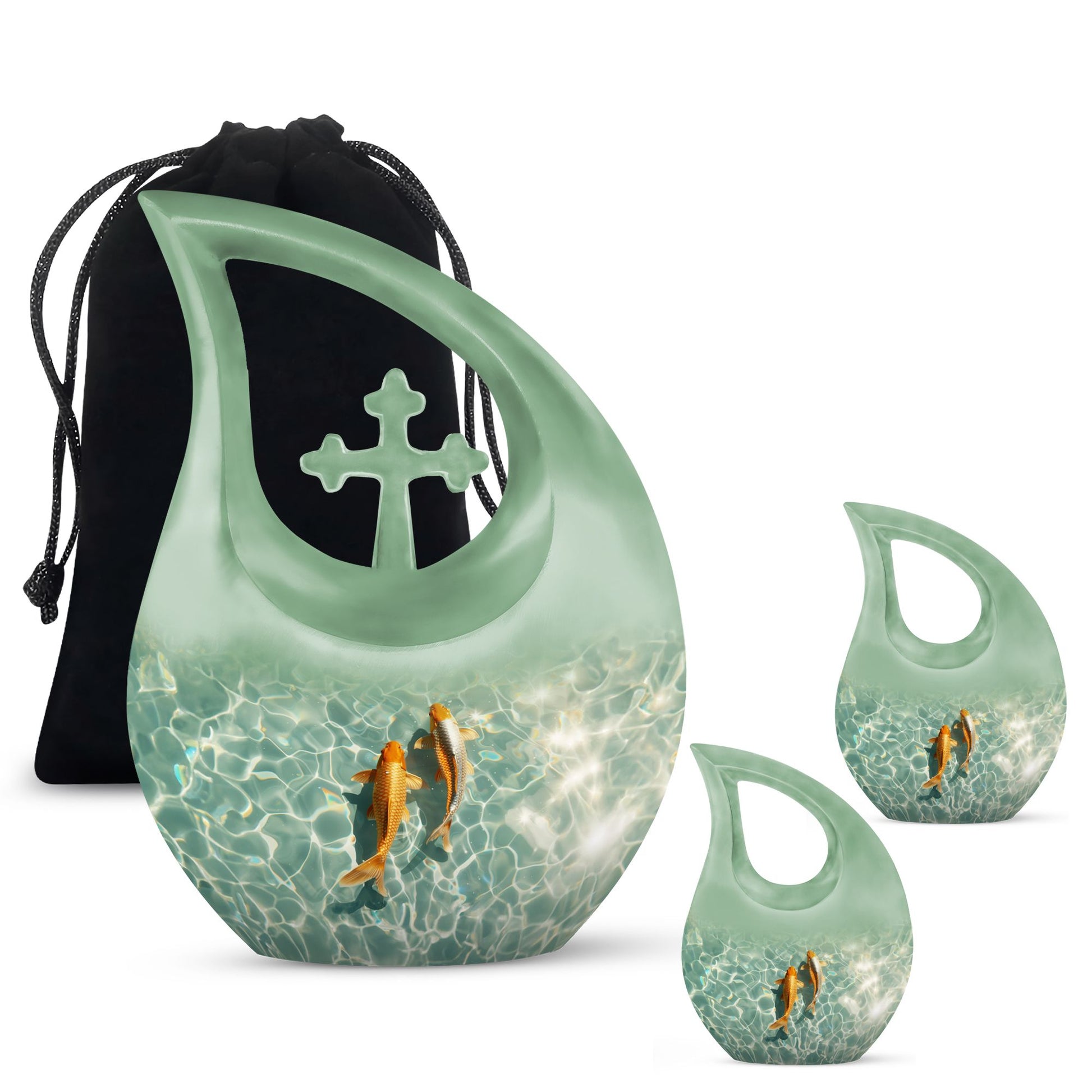 Celebrate the memory of a loved one with our premium-quality, 'Large Gold Fish Urn.' Crafted meticulously with utmost precision from durable aluminium, this 10-inch urn notably stands out in the array of memorial urns available in the market. Complete with a thematic, stunning gold fish design and a 'Cross Drop' feature on its surface, it exudes a serene and peaceful aura. It boasts a substantial capacity of 200 cubic inches, comfortably accommodating cremation ashes. Weighing 3.3 pounds, this urn is also portable, making it a fitting keepsake for cherished memories. It also offers customization options where names can be elegantly engraved on the exterior. Your purchase also includes a velvet pouch, an ideal containment for the ashes. Our Gold Fish Urn combines affordability and quality, ensuring an eternal resting place for your beloved. Make a search for 'Affordable Cremation And Burial Urn' or 'Ashes Keepsake' to explore this and other exquisite urn offerings.