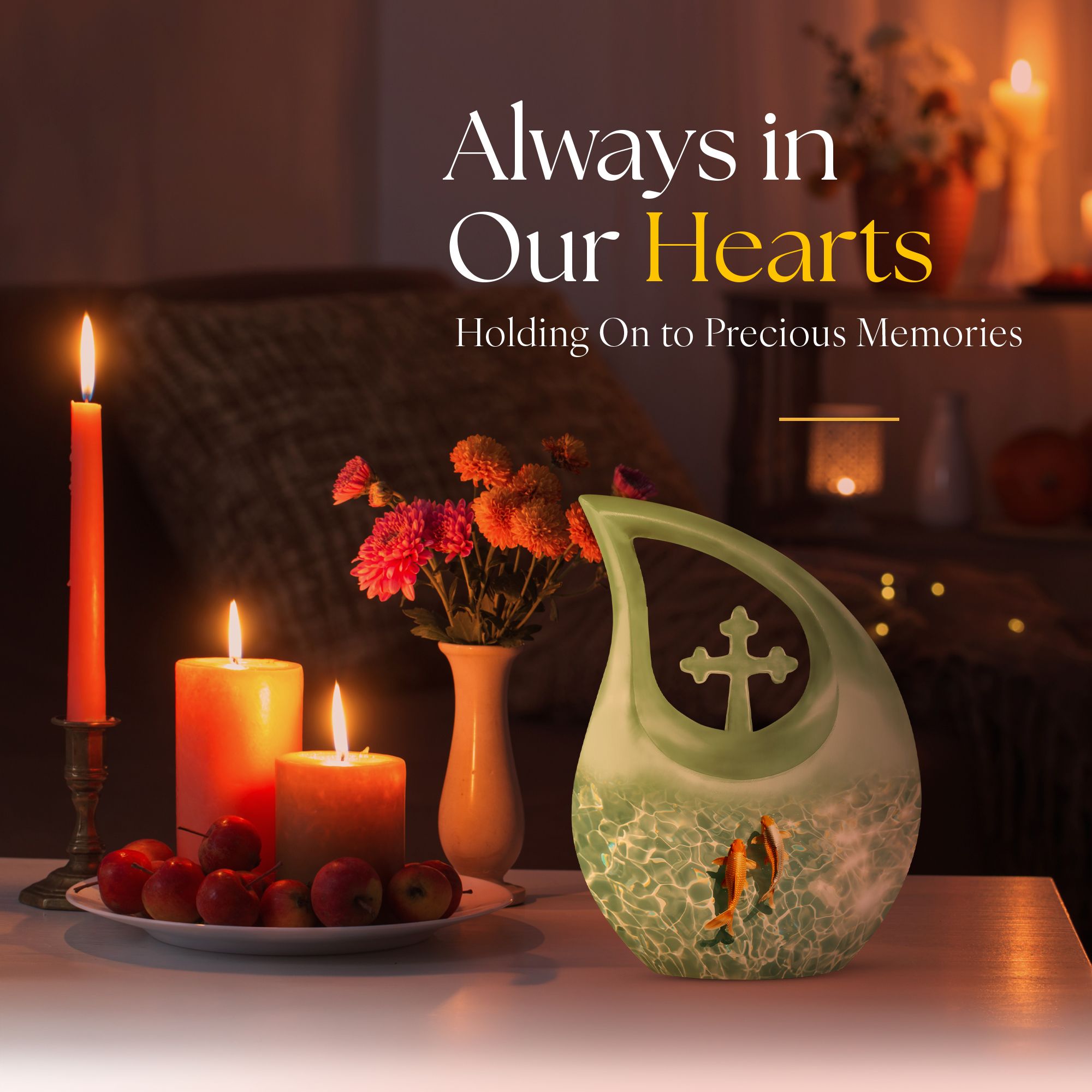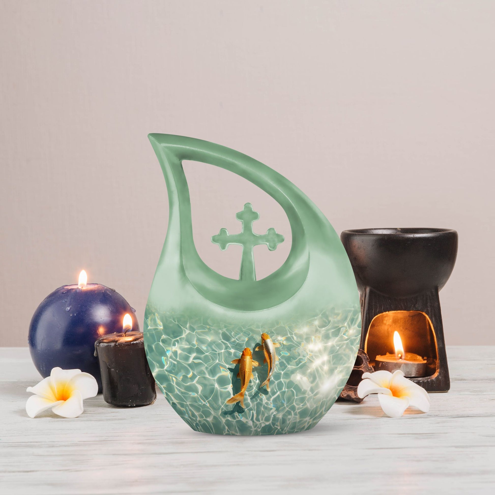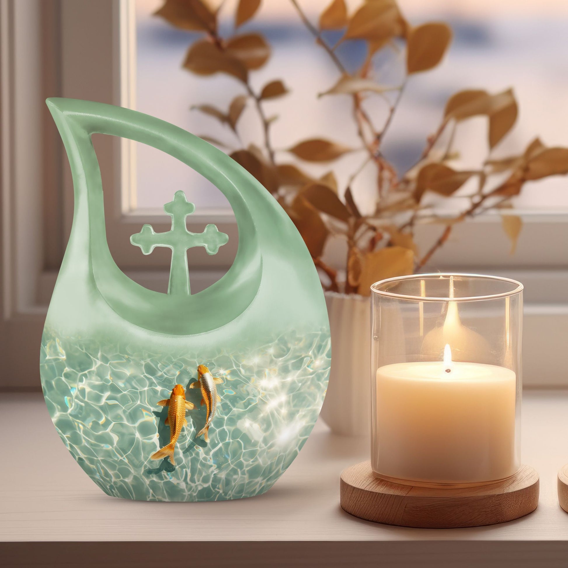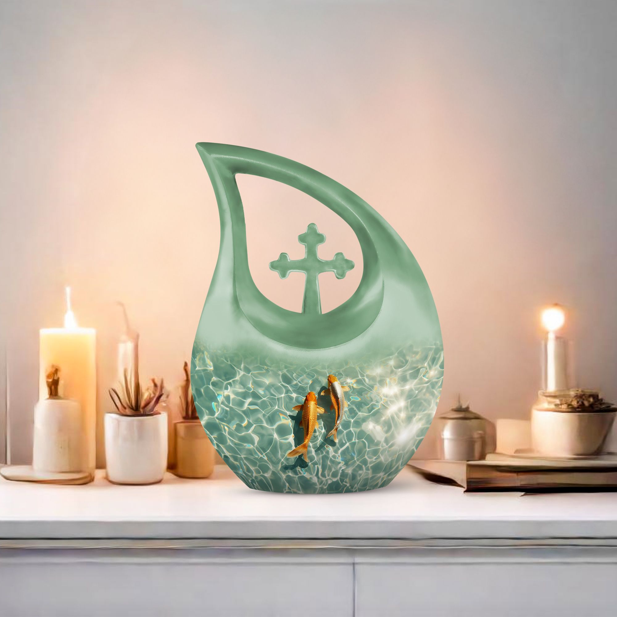 Celebrate the memory of a loved one with our premium-quality, 'Large Gold Fish Urn.' Crafted meticulously with utmost precision from durable aluminium, this 10-inch urn notably stands out in the array of memorial urns available in the market. Complete with a thematic, stunning gold fish design and a 'Cross Drop' feature on its surface, it exudes a serene and peaceful aura. It boasts a substantial capacity of 200 cubic inches, comfortably accommodating cremation ashes. Weighing 3.3 pounds, this urn is also portable, making it a fitting keepsake for cherished memories. It also offers customization options where names can be elegantly engraved on the exterior. Your purchase also includes a velvet pouch, an ideal containment for the ashes. Our Gold Fish Urn combines affordability and quality, ensuring an eternal resting place for your beloved. Make a search for 'Affordable Cremation And Burial Urn' or 'Ashes Keepsake' to explore this and other exquisite urn offerings.