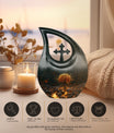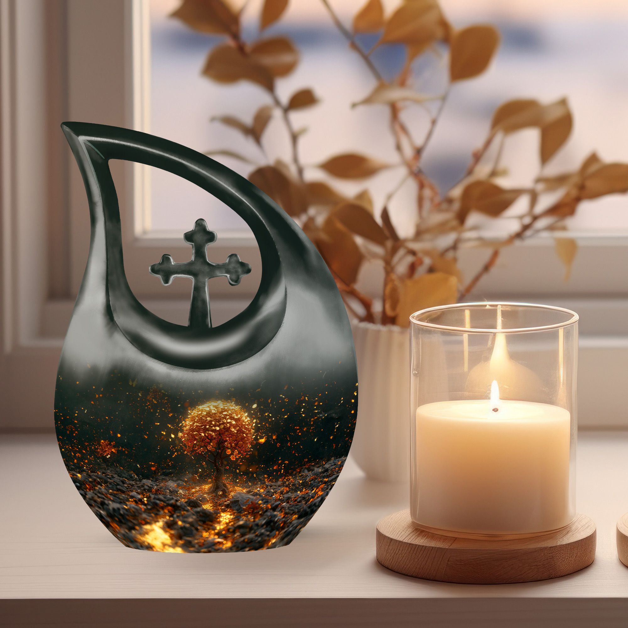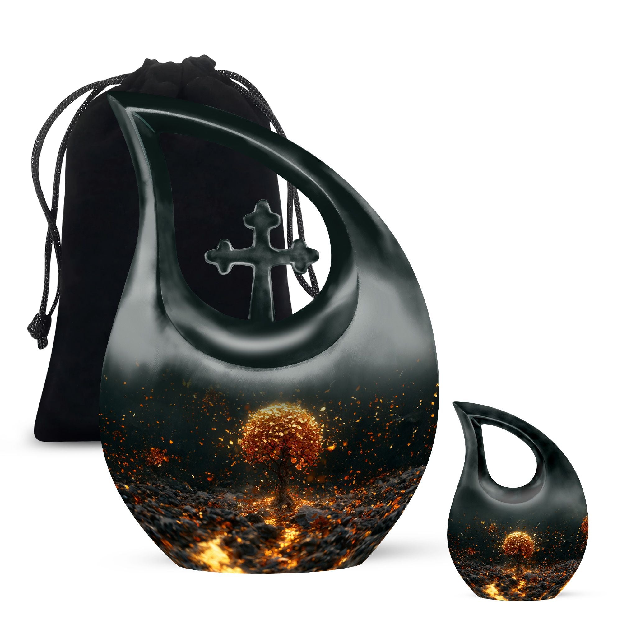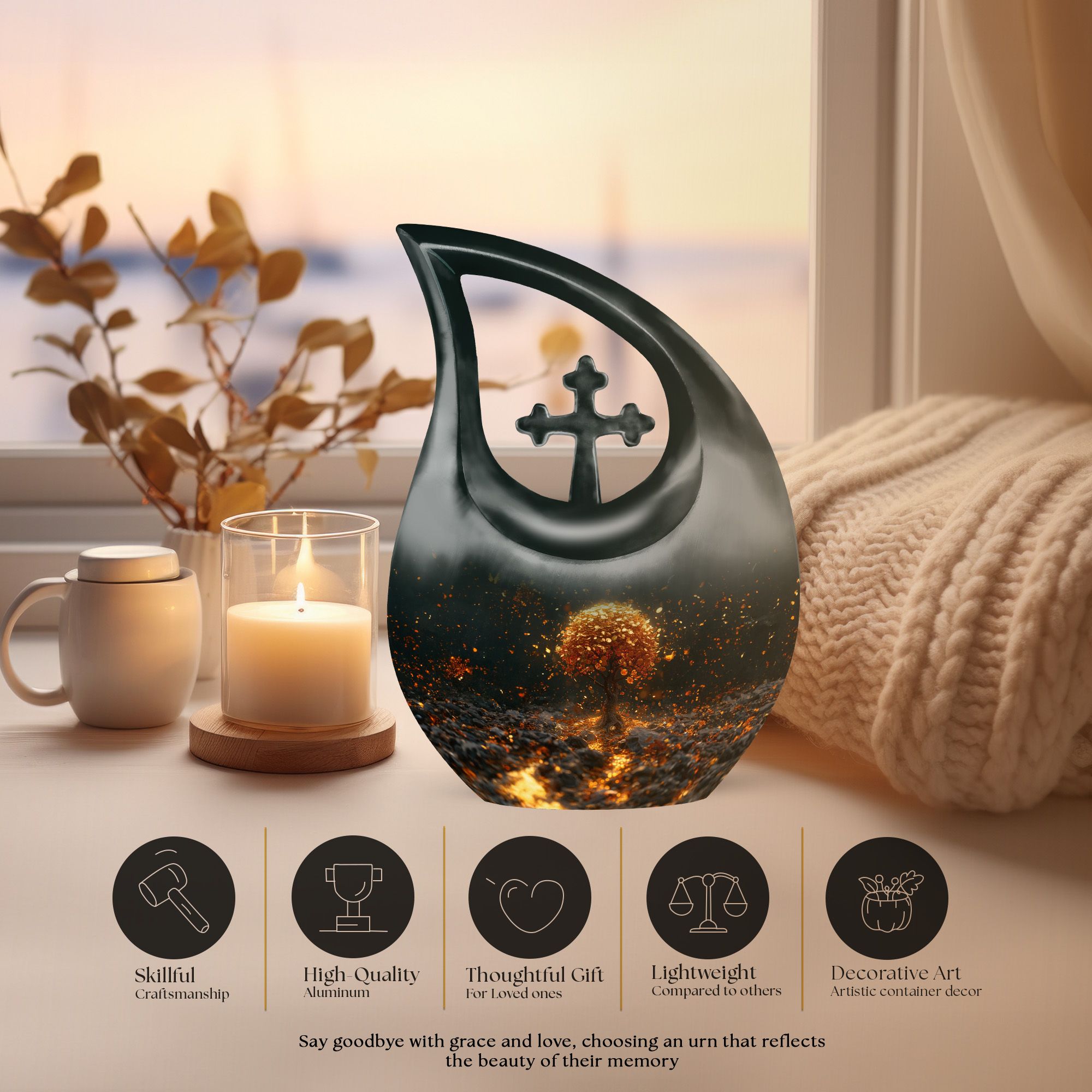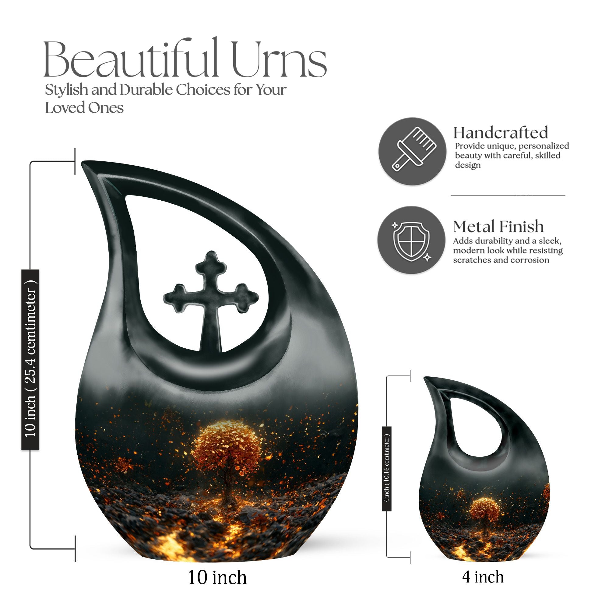 Treasure those precious memories with our Tree Of Life Urn, a symbol of eternal growth and rebirth. Stretching beyond the usual while retaining an affordable price, our 10-inch memorial urn is a beautifully hewn from premium aluminium, lending exceptional durability and shine. It carries an approximate weight of 3.3 pounds, housing up to 200 cubic inches of memories encapsulated. It features a unique Cross Drop theme harmoniously merging with the Tree Of Life symbolism, reflecting a journey towards peace and tranquility. The urn comes neatly packed alongside a velvet pouch catering to the safe containment of ashes. Further adding to its value is the option of personalization- engrave names that echo in eternity. For those seeking urns for ashes for adults or seeking a meaningful urn for sale that respects your budget and emotional quotient, our Tree Of Life urn easily fills that niche. If you're considering a cheap cremation urn that doesn't compromise on sentiment, our Tree Of Life urn is the epitome of love everlasting.