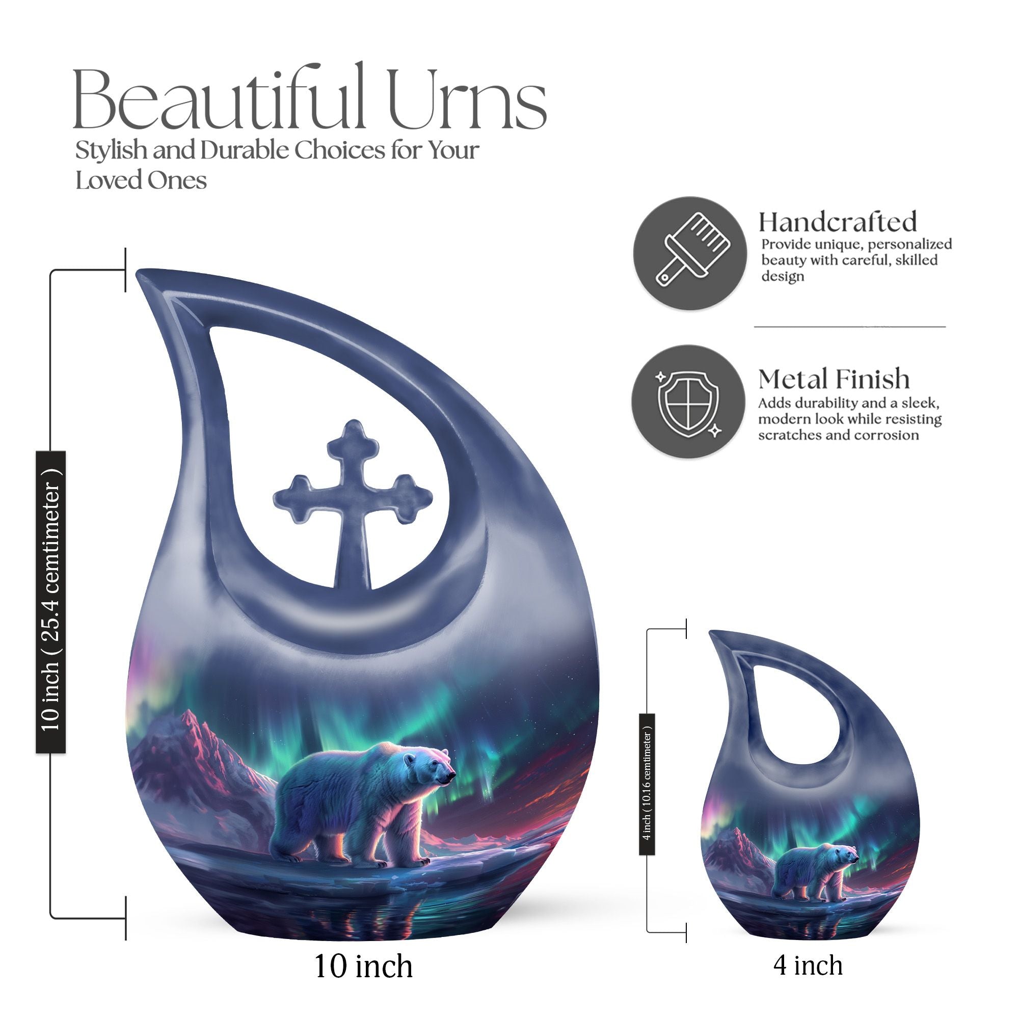 Handcrafted from durable aluminium, this beautifully detailed urn features a serene polar bear motif symbolizing strength, purity, and gentle protection. Its polished finish and secure screw-top lid make it ideal for those needing cremation urns for ashes for women, adult urns for women, or adult urns for men & women. Designed as a full-size 10-inch memorial piece, it provides dependable long-term protection while adding beauty and meaning to any remembrance space.