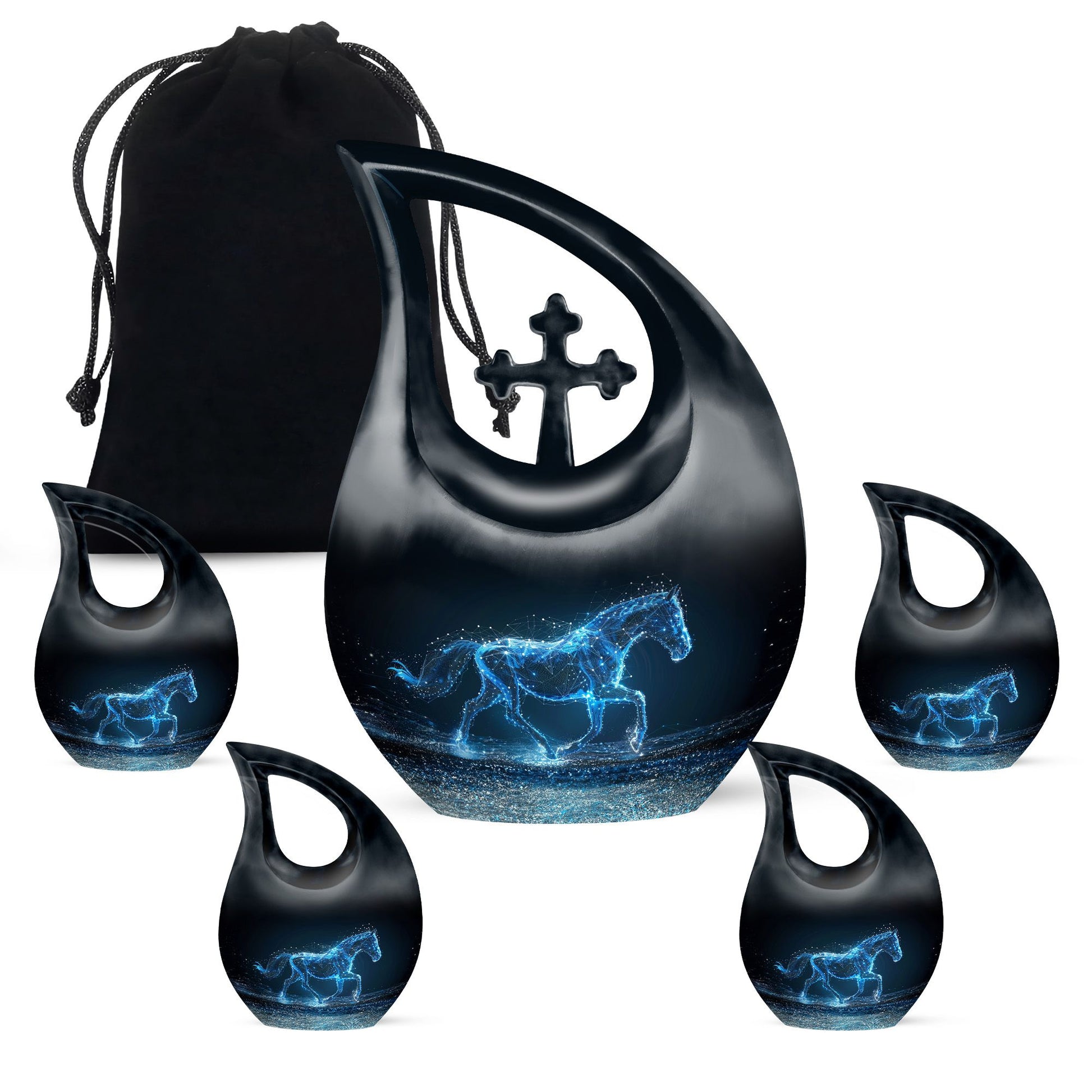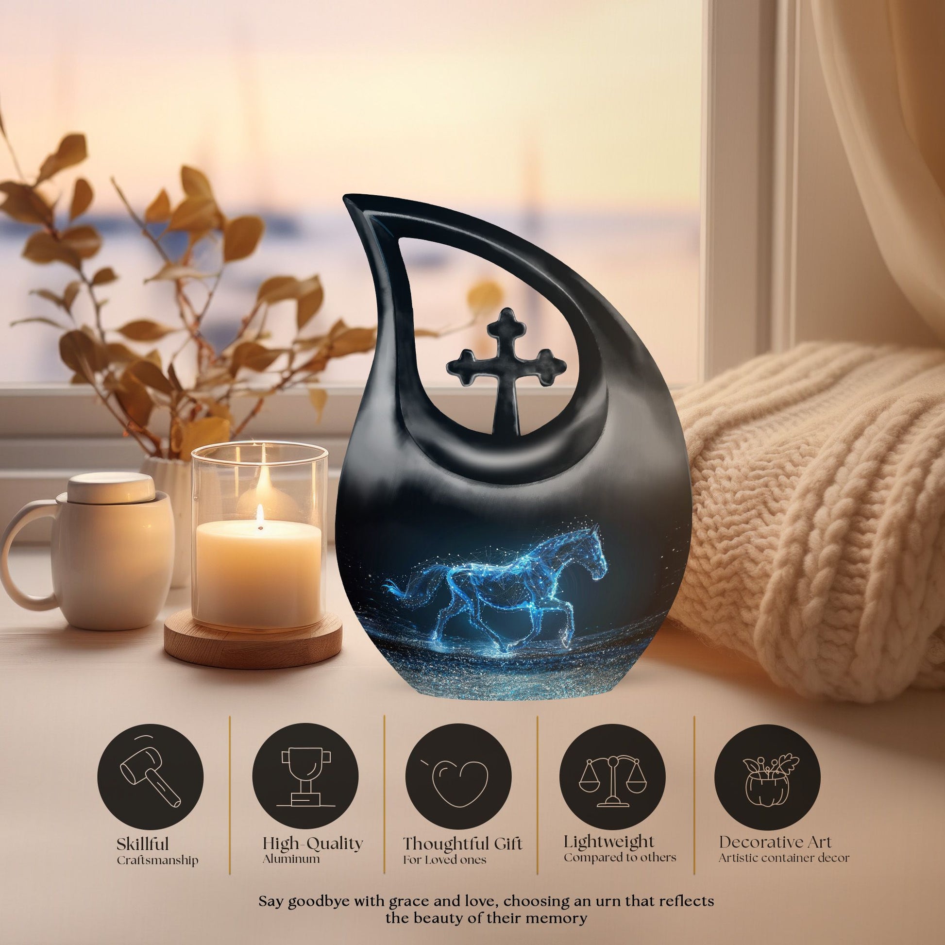 Crafted from durable aluminium, this 10-inch urn features a striking running horse motif symbolizing freedom, courage, and enduring spirit. Its smooth blue finish and secure screw-top lid ensure long-term protection, making it ideal as a large cremation urn, large human ashes urn, or urns for ashes adult male large. The spacious 200-cubic-inch capacity offers reliable room for full adult remains, while its craftsmanship and detailing create a dignified piece for home display, burial, or ceremony.