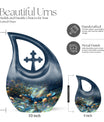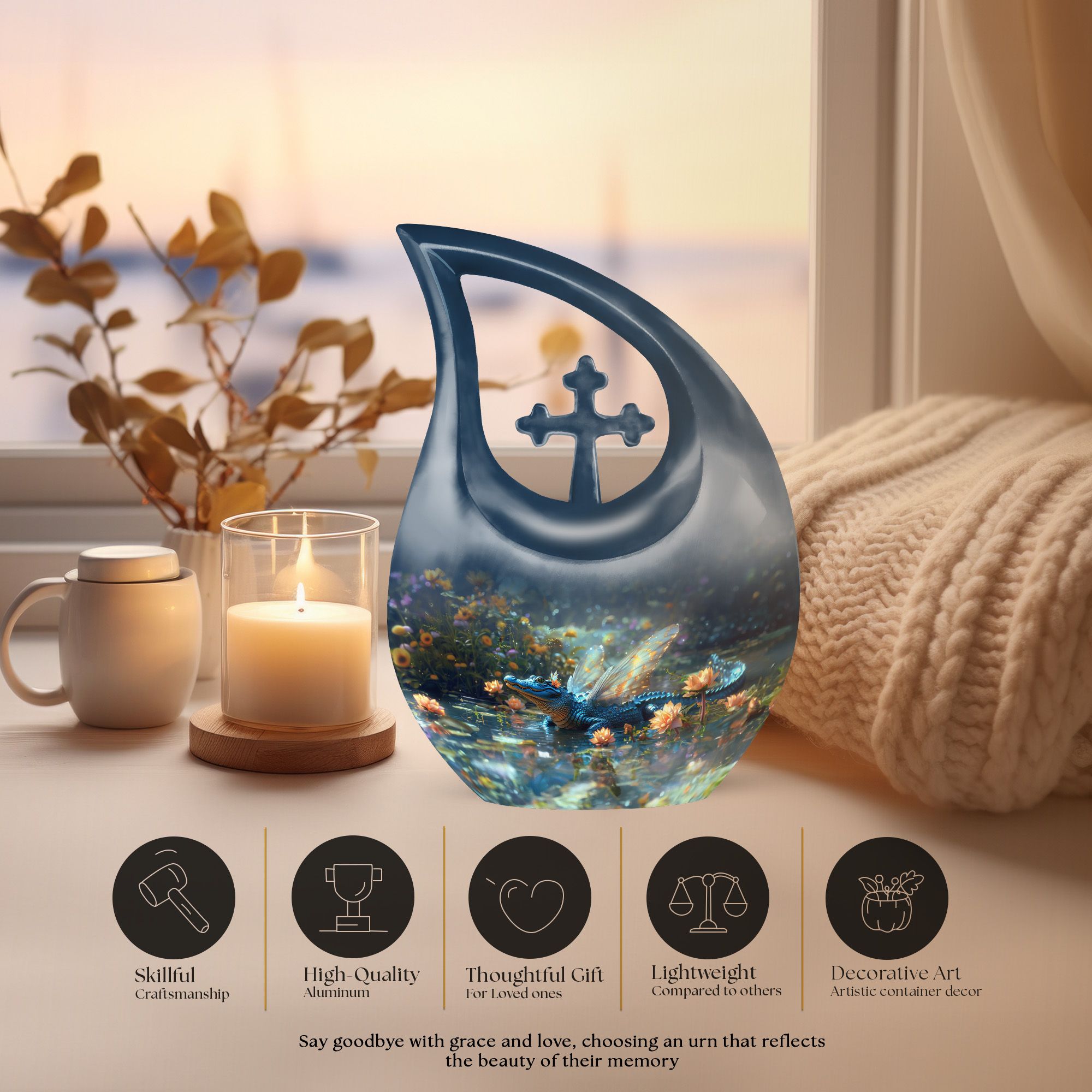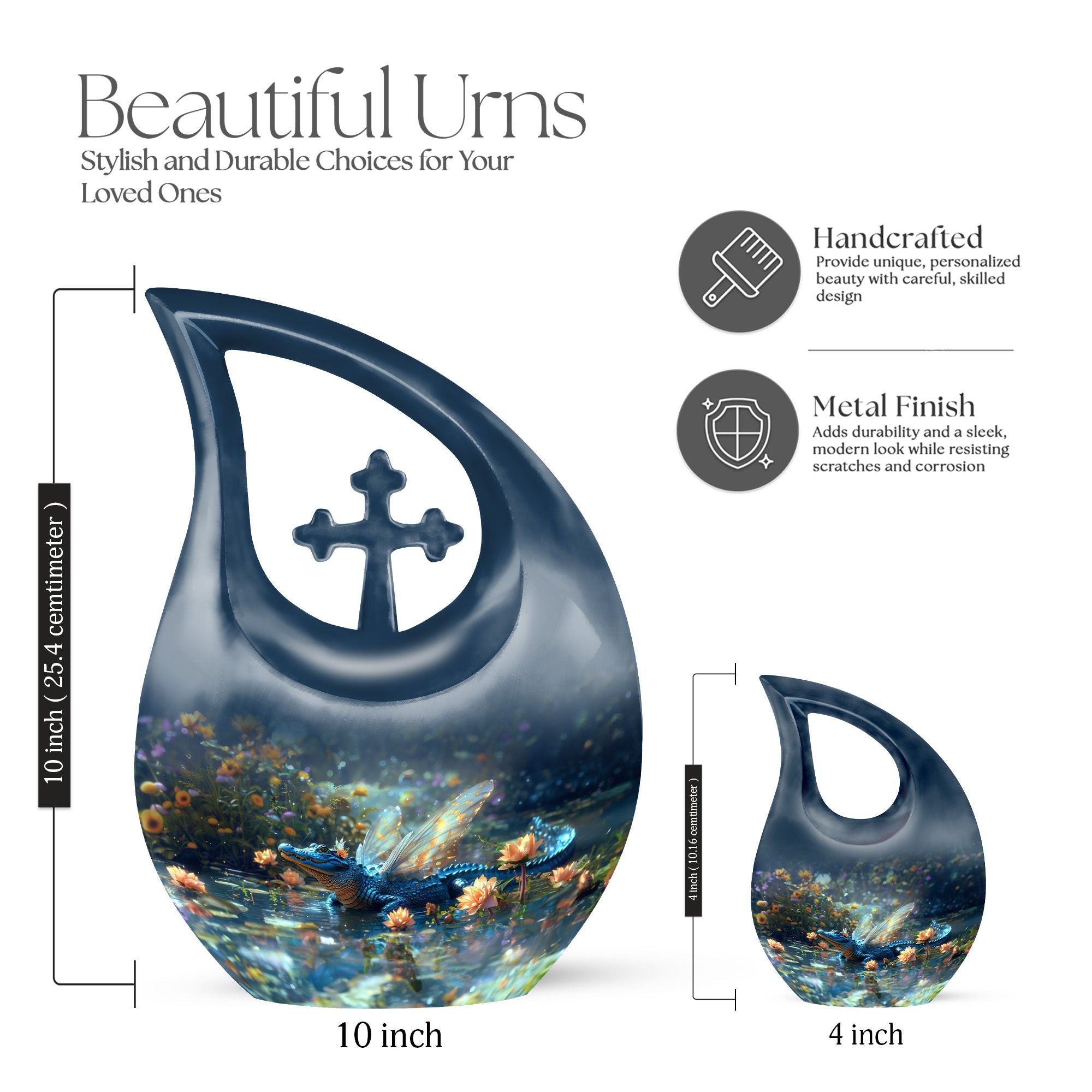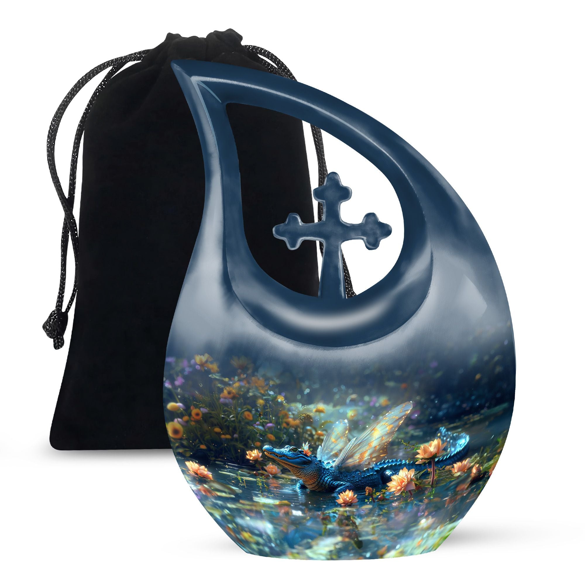 Experience a unique and elegant way to commemorate your loved one with this Alaigator Urn. This 10-inch, full size urn for human ashes stands out with its majestic Alaigator theme and striking Cross Drop design. Each piece is crafted meticulously in Aluminium, ensuring unmatched durability and beauty that last a lifetime. With a weight of 3.3 pounds, it possesses a generous capacity of 200 cubic inches, making it suitable for use as a burial urn. One noteworthy feature is the option for personalization; you can choose to engrave names to add a touch of sentimentality and honor the memory of the departed. Each urn comes packed in a velvet pouch designed for secure containment of ashes, adding an extra layer of protection to your precious memorial. This custom Mom Urn redefines traditional memorial urns and small keepsake urns with its uncommon elegance. Cherish the memory of your loved ones in the most unique and beautiful way with this versatile urn, popularly chosen amongst unusual urns for ashes.
