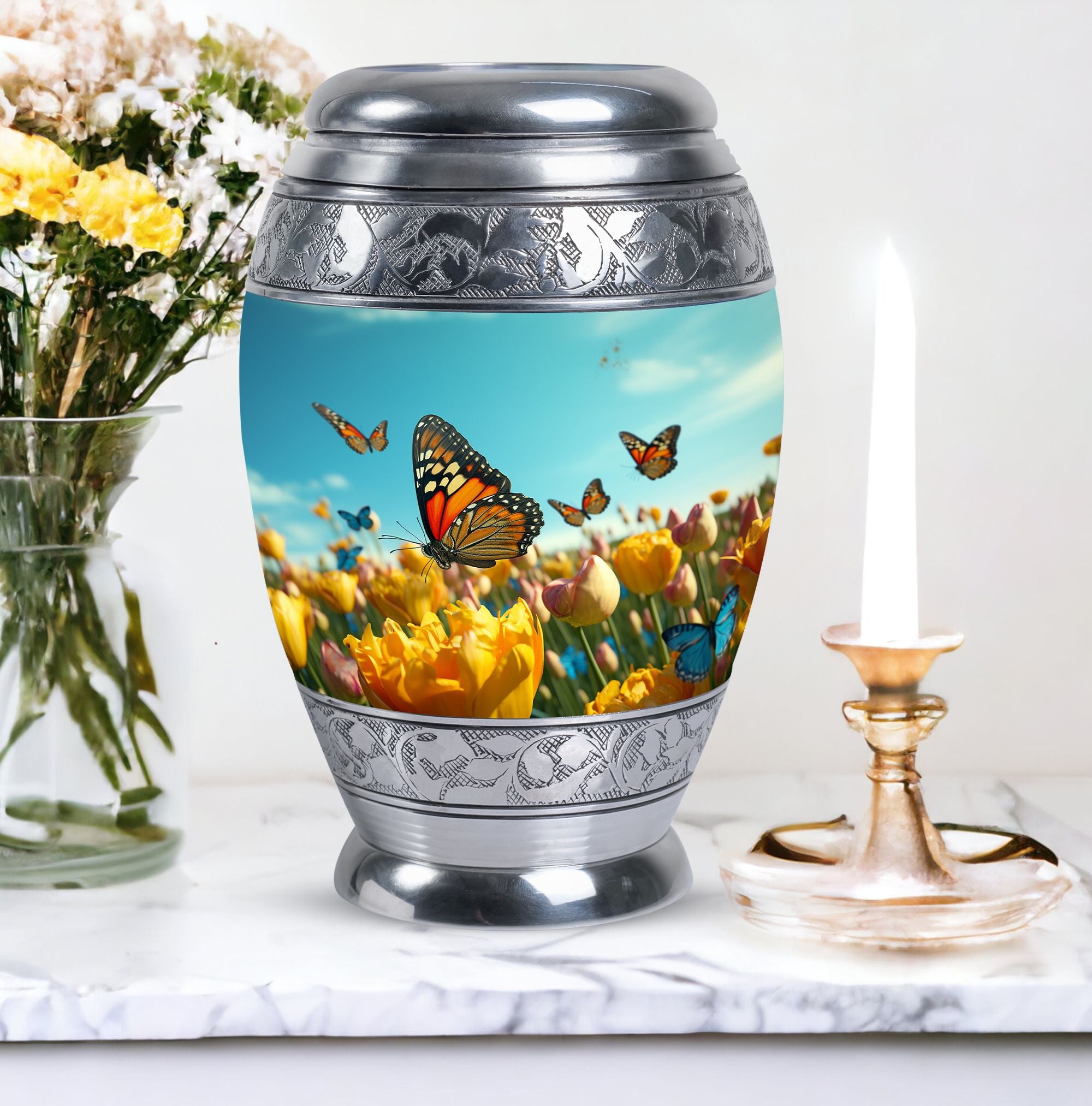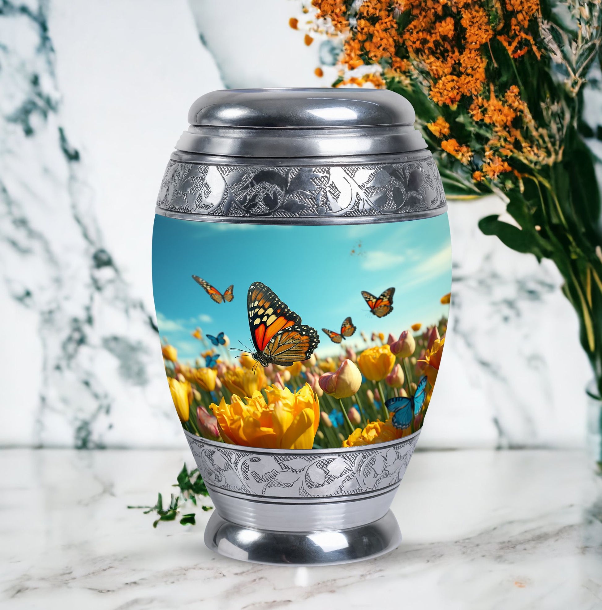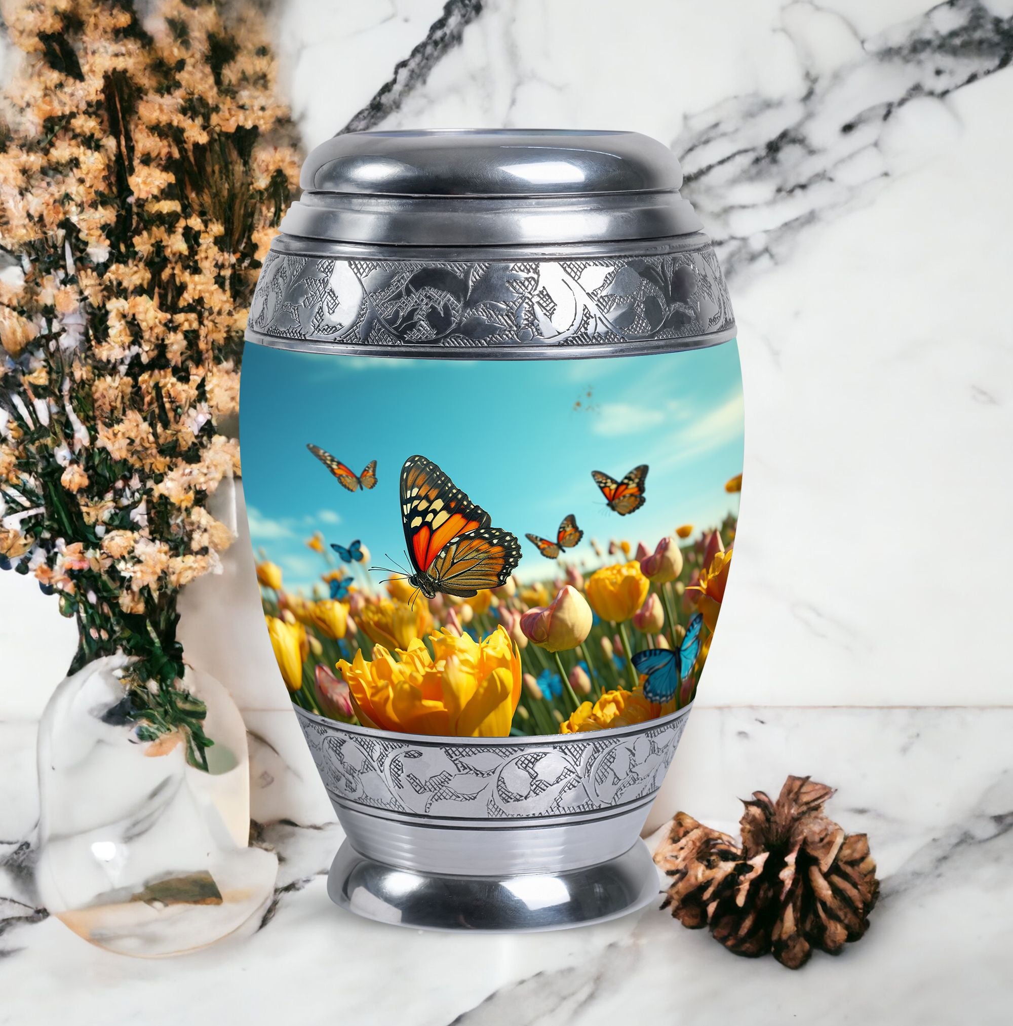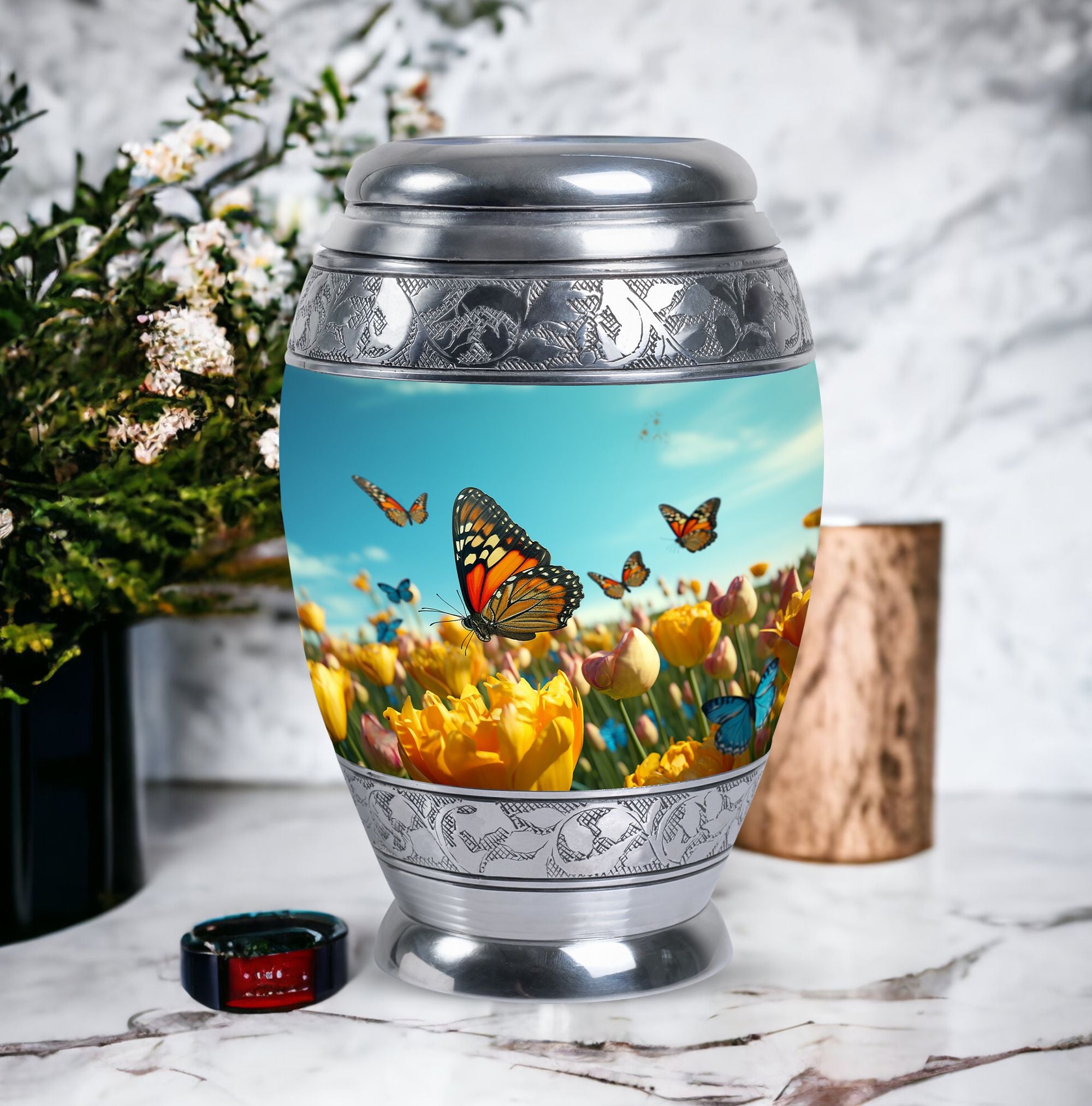 Preserve the memories of your loved ones with our Monar_Urn Butterflies Urn, specially designed for adults. With its large capacity of 200 cubic inches, this urn is ample to hold the remains, preserving unique elements of a well-lived life. Crafted with meticulous care from durable aluminum, this urn harmoniously blends traditional style with modern design aesthetics. It measures a generous 10 inches in height and 7 inches in diameter. This package includes a velvet pouch for secure containment of ashes and a set of essential care and handling instructions. Furthermore, for a heartfelt touch, we offer an opportunity to personalize the urn with engraved names. As it's a part of our 'large urns' category, this product serves as a perfect commemorative display piece honoring your loved one's journey. The butterflies on the urn symbolize a hopeful transition, bringing a comforting sense of peace and continuity. Ideal for those searching for 'Urns For Human Ashes Large' and 'men Urns For Human Ashes'.