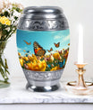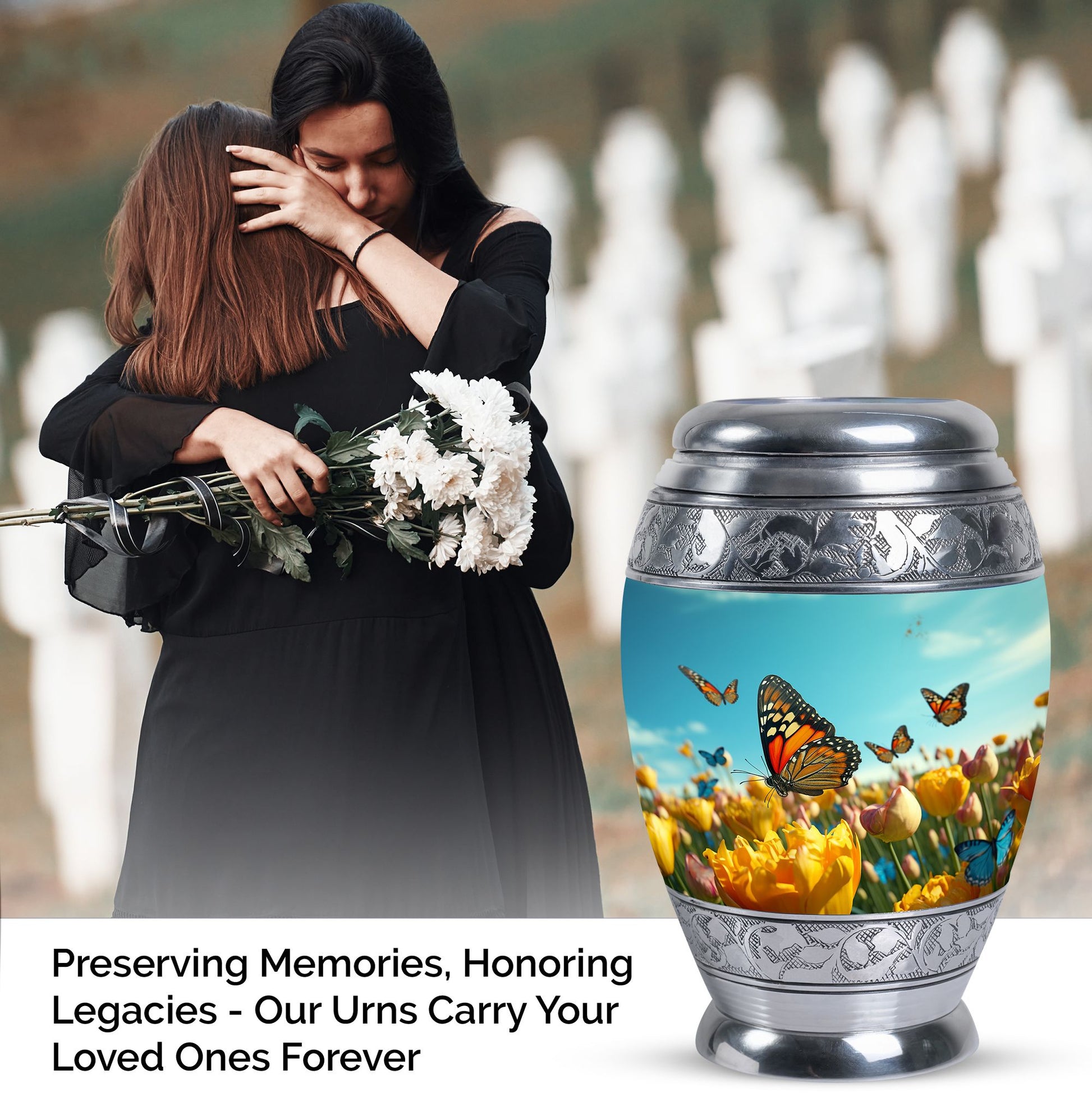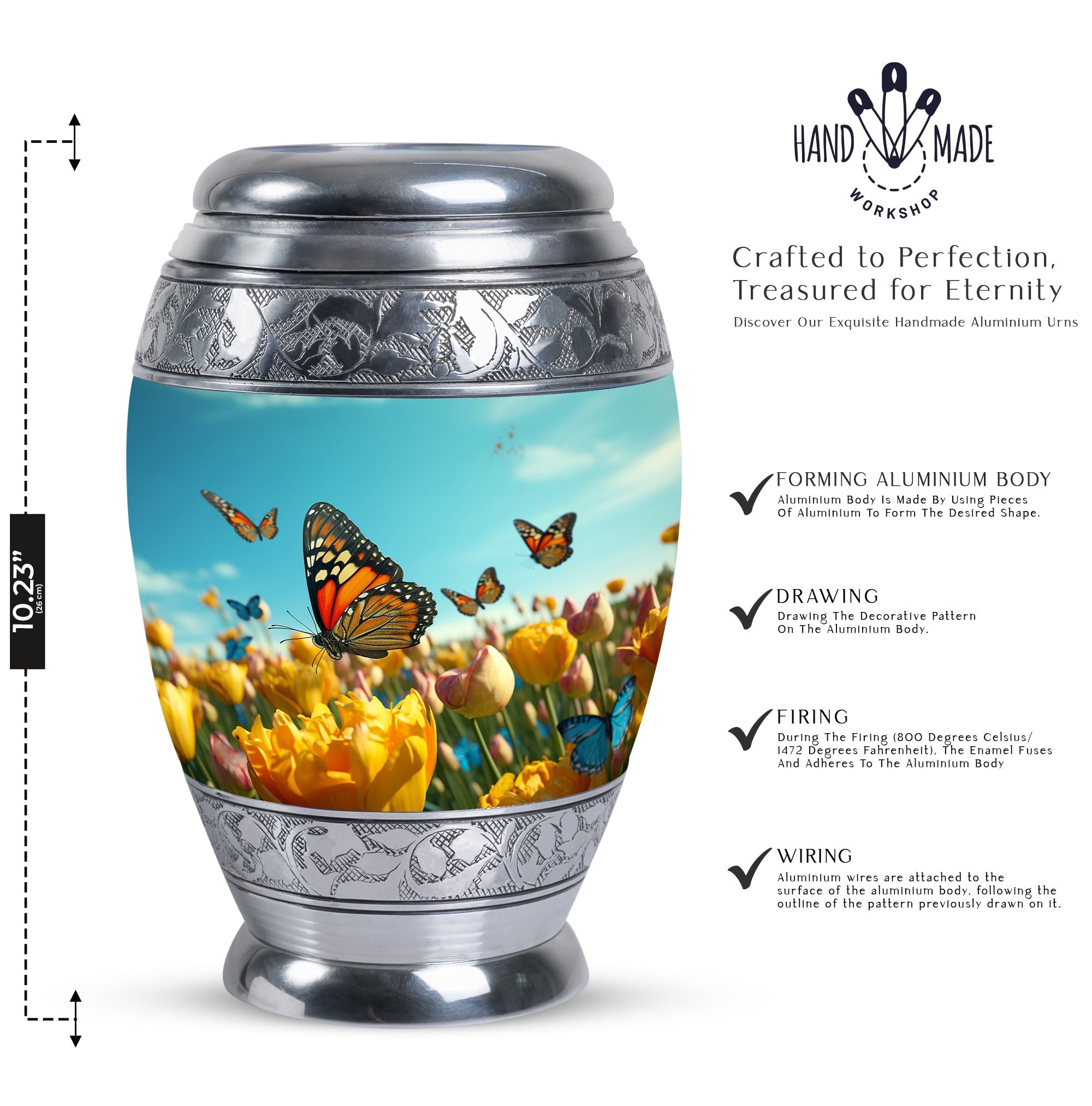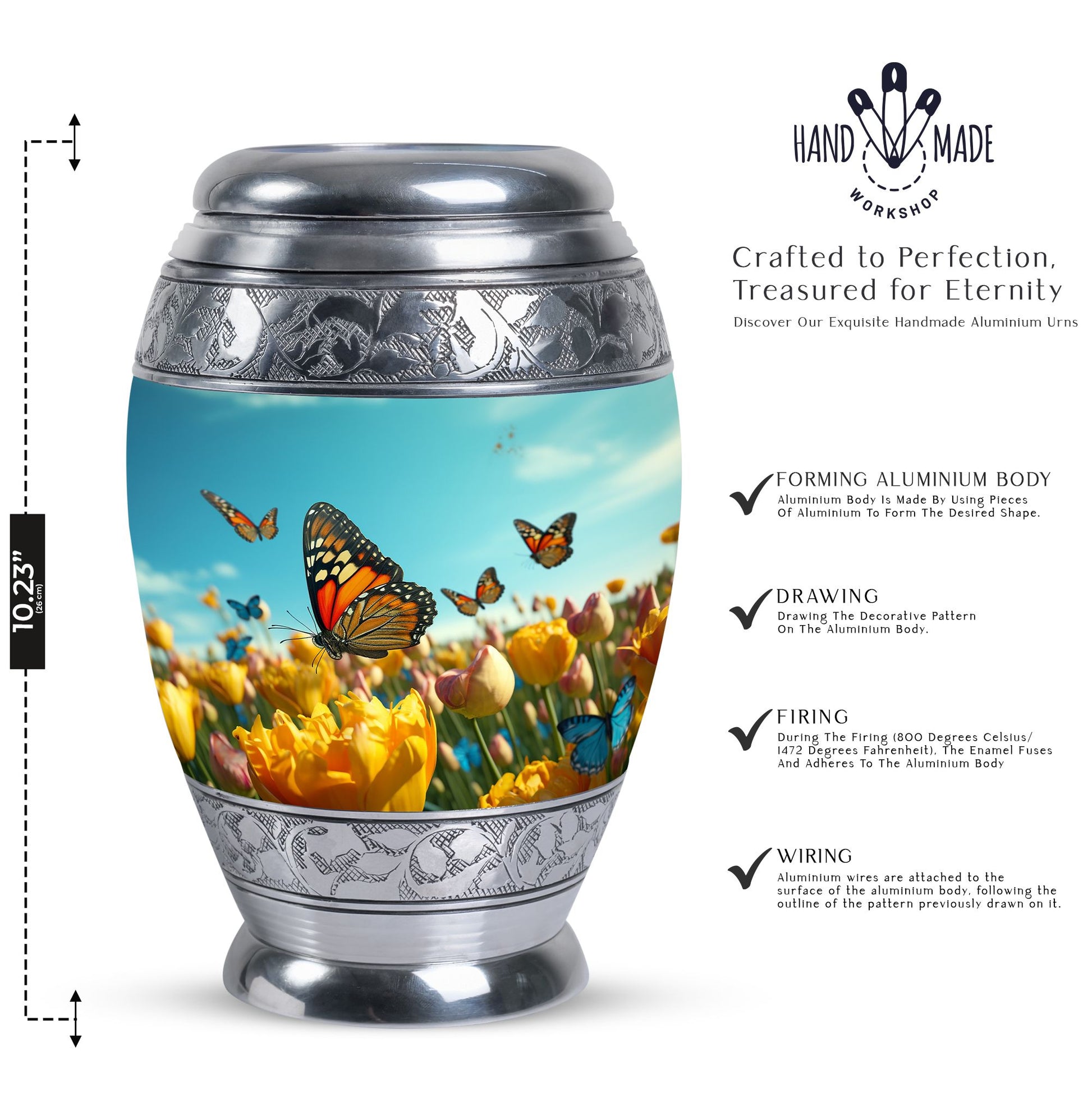 Preserve the memories of your loved ones with our Monar_Urn Butterflies Urn, specially designed for adults. With its large capacity of 200 cubic inches, this urn is ample to hold the remains, preserving unique elements of a well-lived life. Crafted with meticulous care from durable aluminum, this urn harmoniously blends traditional style with modern design aesthetics. It measures a generous 10 inches in height and 7 inches in diameter. This package includes a velvet pouch for secure containment of ashes and a set of essential care and handling instructions. Furthermore, for a heartfelt touch, we offer an opportunity to personalize the urn with engraved names. As it's a part of our 'large urns' category, this product serves as a perfect commemorative display piece honoring your loved one's journey. The butterflies on the urn symbolize a hopeful transition, bringing a comforting sense of peace and continuity. Ideal for those searching for 'Urns For Human Ashes Large' and 'men Urns For Human Ashes'.