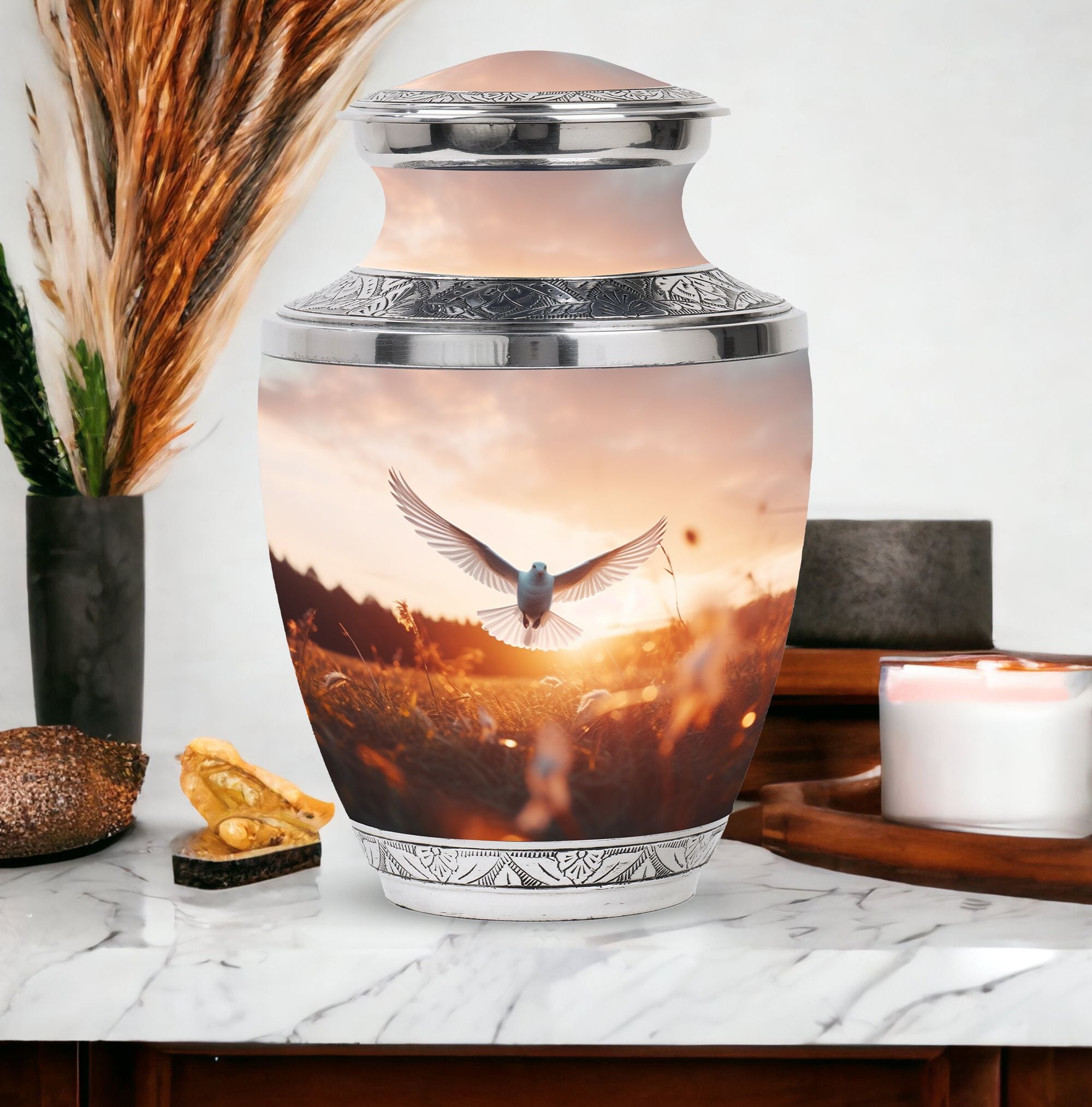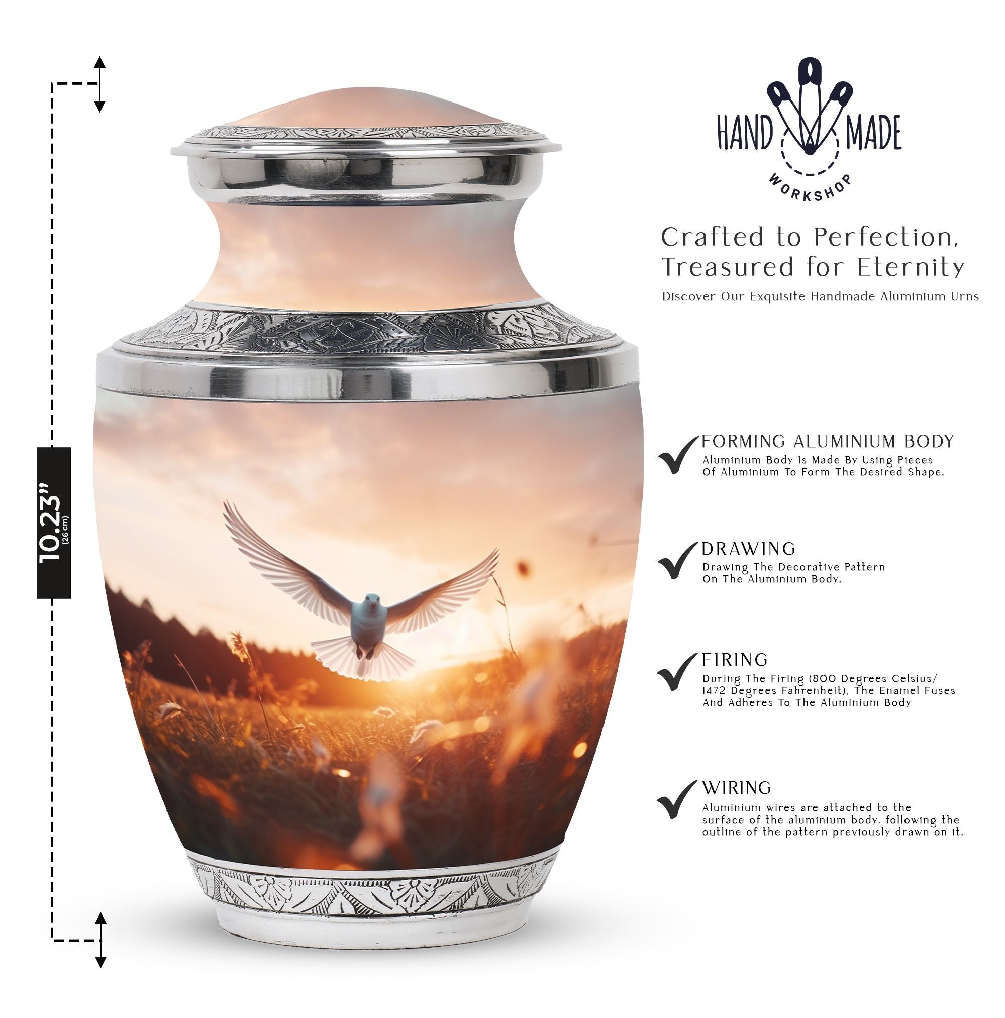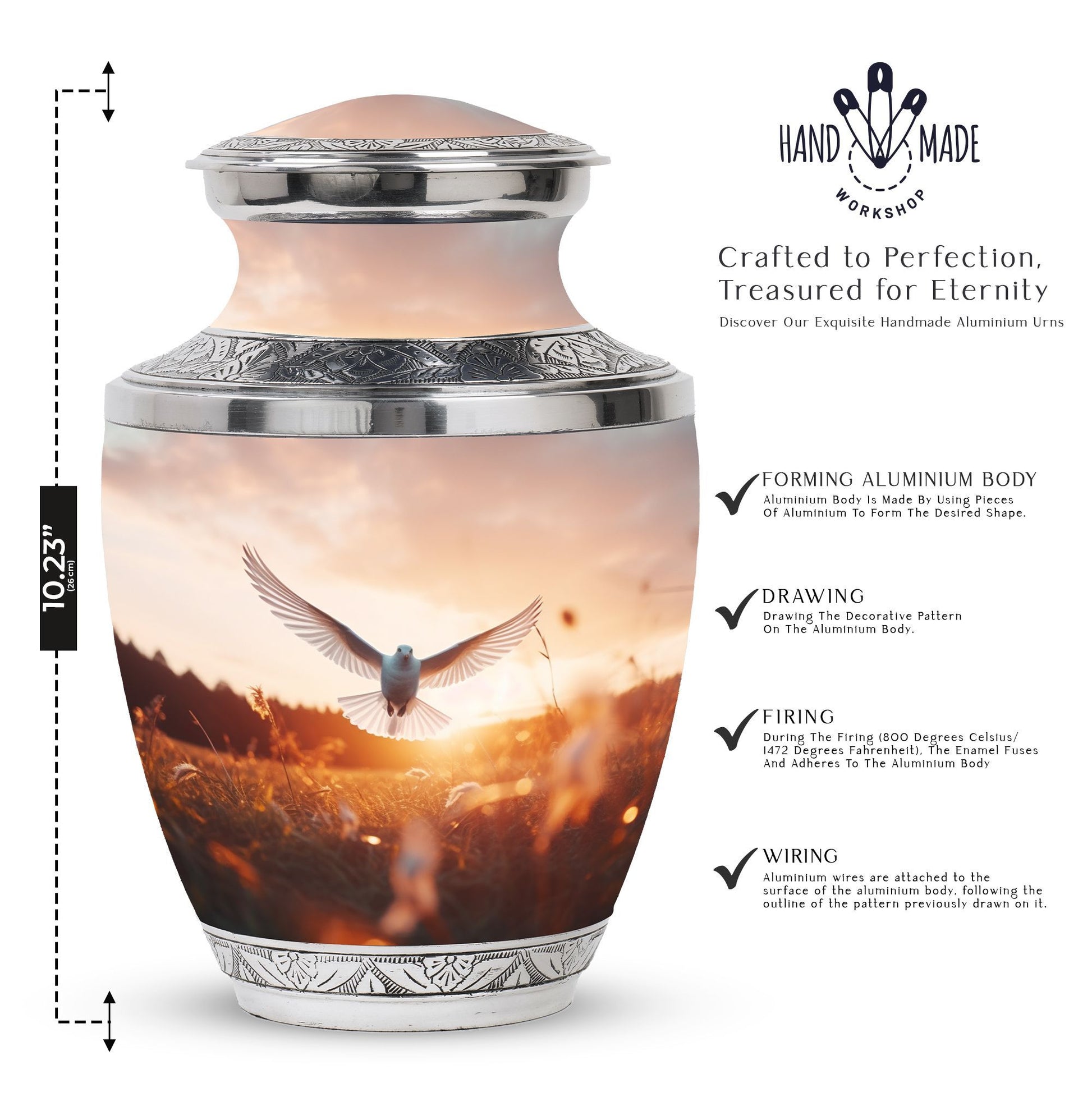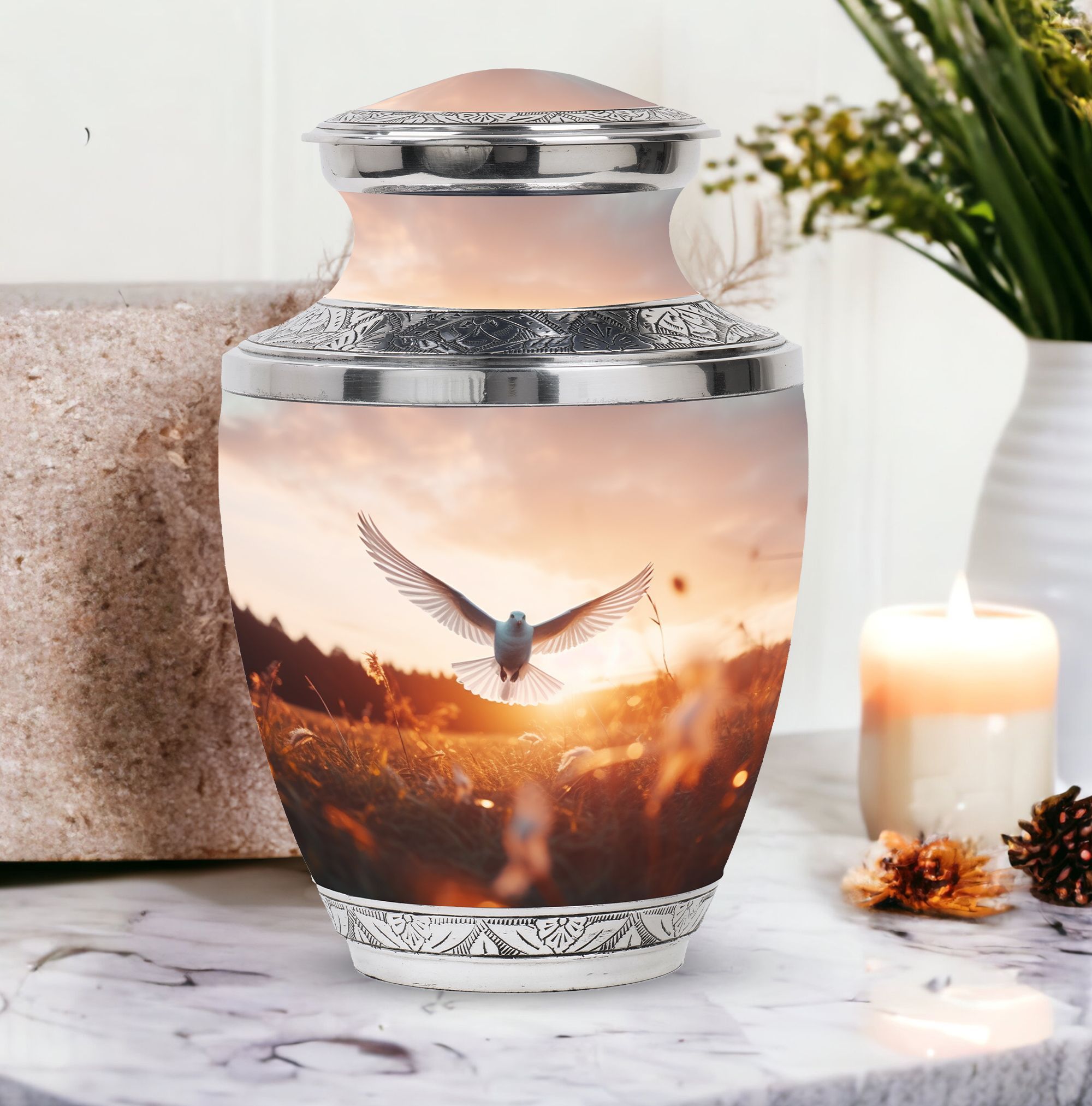 Discover the perfect solution for your loved one's final resting place with our Dove Urns for Ashes. These Funeral Urns, thoughtfully designed, measure a comprehensive 10 inches in height. Cast from robust aluminium, these Large Urns are handcrafted to ensure a weight of a secure 3.3 pounds, and their significant capacity of 200 cubic inches can respectfully hold your loved one's remains. Upon purchase of a cremation urn, a velvet pouch is included for the delicate containment of ashes, further emphasizing the care we place in this sensitive moment. Add a personal touch to your urn by making use of our customization option, which allows you to engrave names on these Metal Urns for Human Ashes. Break away from the norm by choosing our Funeral Ashes Containers and experience the modern twist to the well-known Classic Urn design. Keywords such as 'Custom Cremation Urns' and 'Modern Urns for Ashes' add relevance to your search for a remarkable final resting place for your loved one.