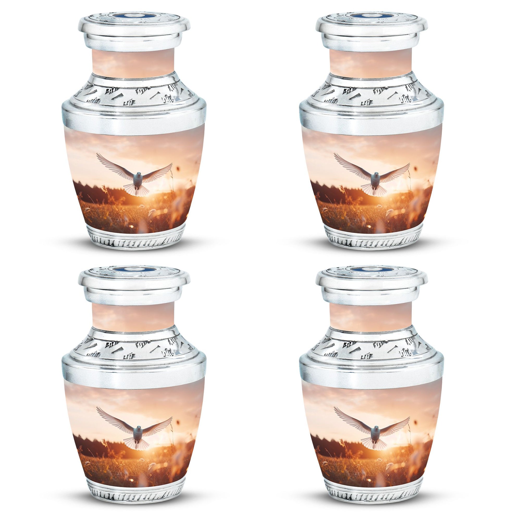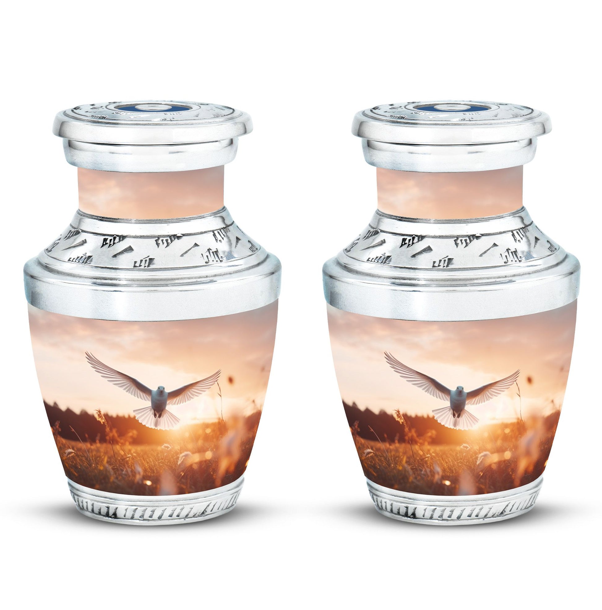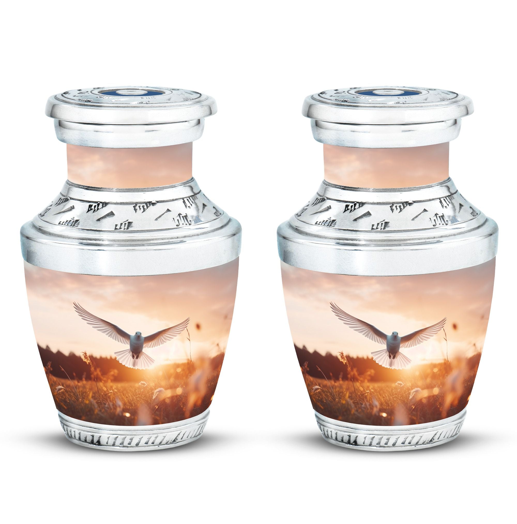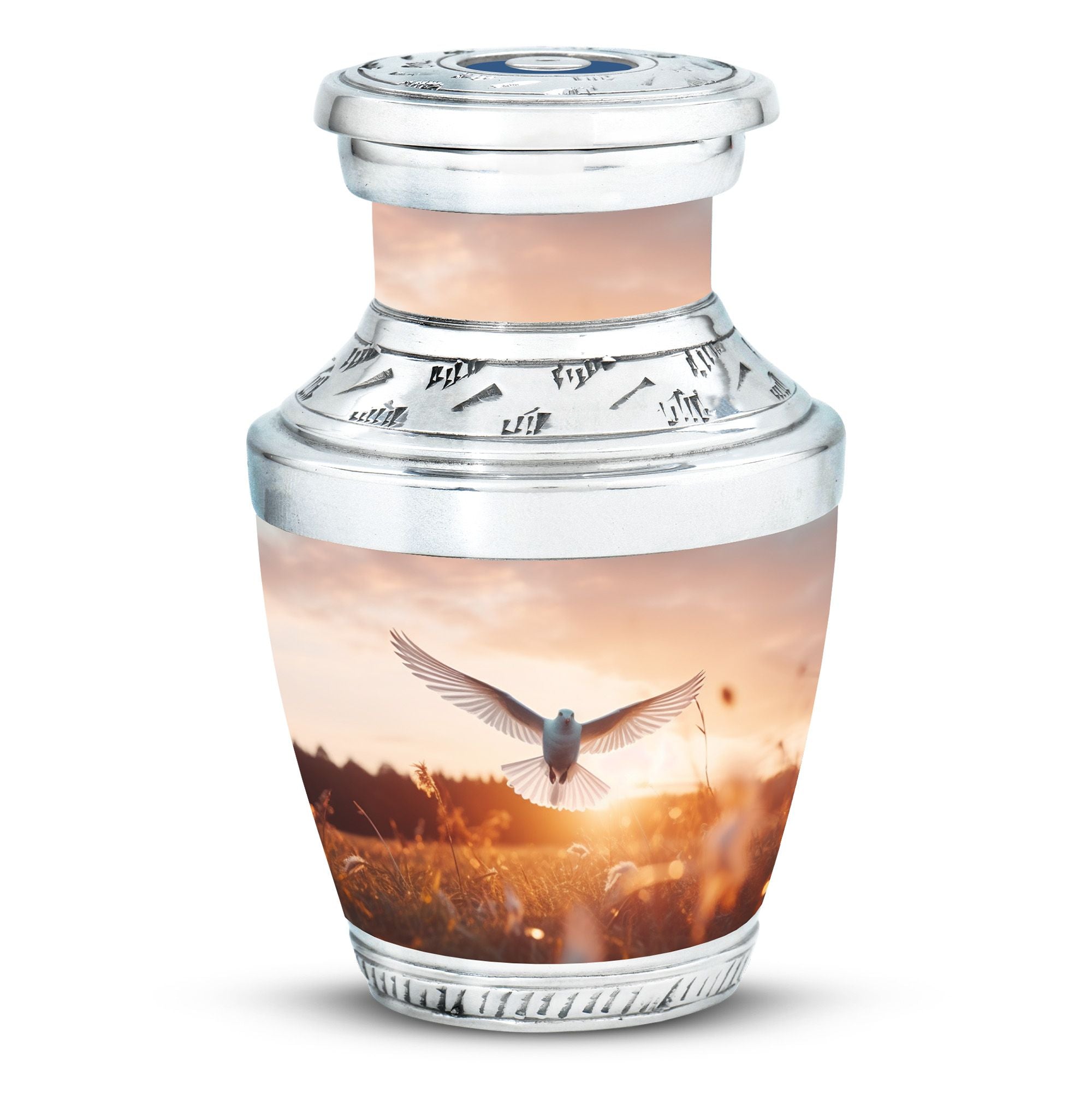 Discover the perfect solution for your loved one's final resting place with our Dove Urns for Ashes. These Funeral Urns, thoughtfully designed, measure a comprehensive 10 inches in height. Cast from robust aluminium, these Large Urns are handcrafted to ensure a weight of a secure 3.3 pounds, and their significant capacity of 200 cubic inches can respectfully hold your loved one's remains. Upon purchase of a cremation urn, a velvet pouch is included for the delicate containment of ashes, further emphasizing the care we place in this sensitive moment. Add a personal touch to your urn by making use of our customization option, which allows you to engrave names on these Metal Urns for Human Ashes. Break away from the norm by choosing our Funeral Ashes Containers and experience the modern twist to the well-known Classic Urn design. Keywords such as 'Custom Cremation Urns' and 'Modern Urns for Ashes' add relevance to your search for a remarkable final resting place for your loved one.