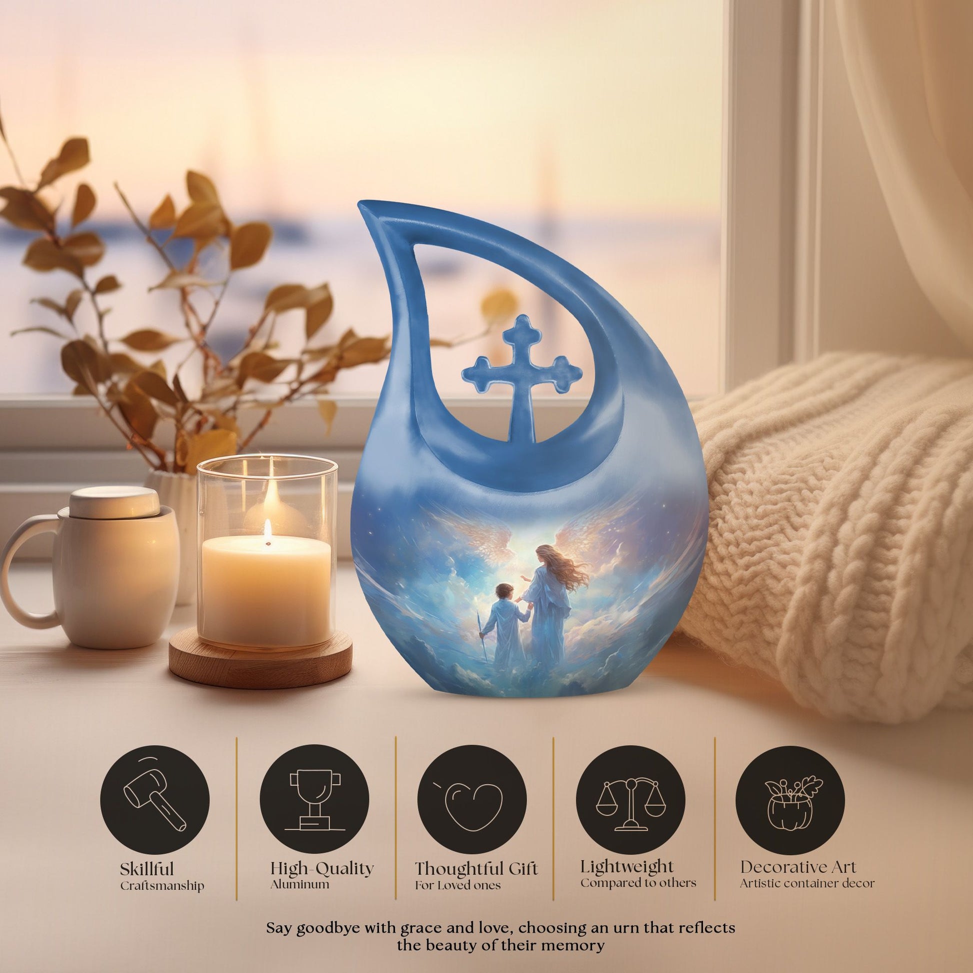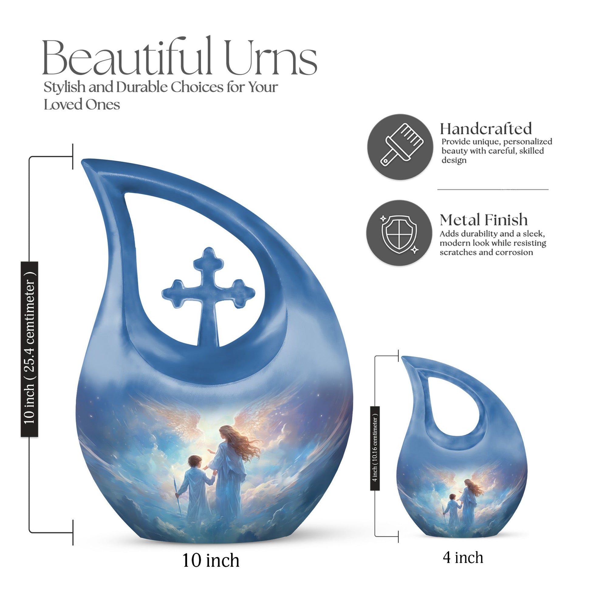 Crafted from durable aluminium, this 10-inch urn features a soft celestial glow and a beautifully detailed angel motif, honoring a mother’s nurturing spirit. The secure screw-top lid ensures long-term safety, while the matching keepsake options allow families to share memories. This set is ideal for those seeking keepsake urns for human ashes, a central keepsake urn, or coordinating memorial keepsakes for ashes.