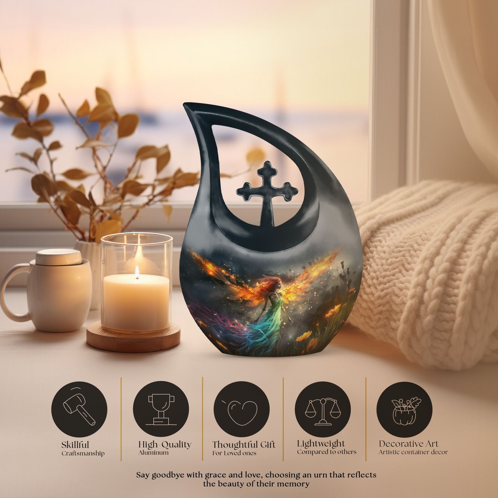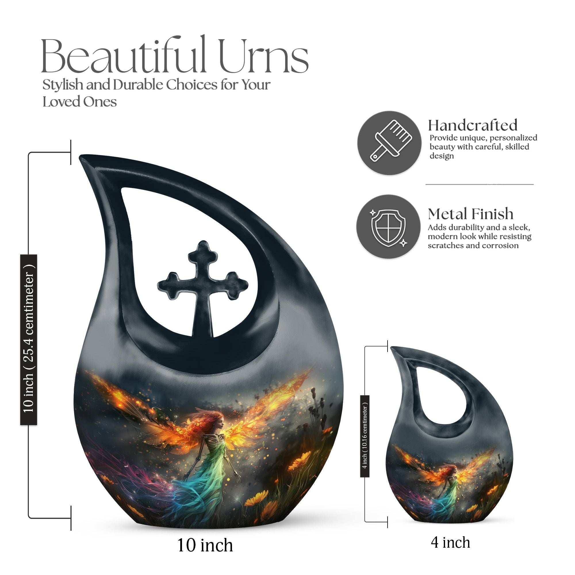 Crafted from premium aluminium, this 10 inch urn features a vivid Fire Angel motif with radiant highlights blending into a serene woodland scene. Its durable construction and secure screw-top lid ensure safe preservation of ashes, whether displayed at home or paired with an urn with keepsake combo for shared remembrance. This design is ideal for those needing keepsake urns for human ashes adult, full-size memorials, or heartfelt ash urns for humans keepsake collections.
