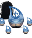 Crafted from durable aluminium, this 10-inch urn features a calming blue-sky gradient with angelic artwork symbolizing eternal protection. Built with a secure screw-top lid, it ensures safe preservation of ashes, making it an ideal choice for families seeking a dignified memorial along with coordinating mini keepsake urns, mini urn for human ashes, or complete mini urn set for ashes collections.