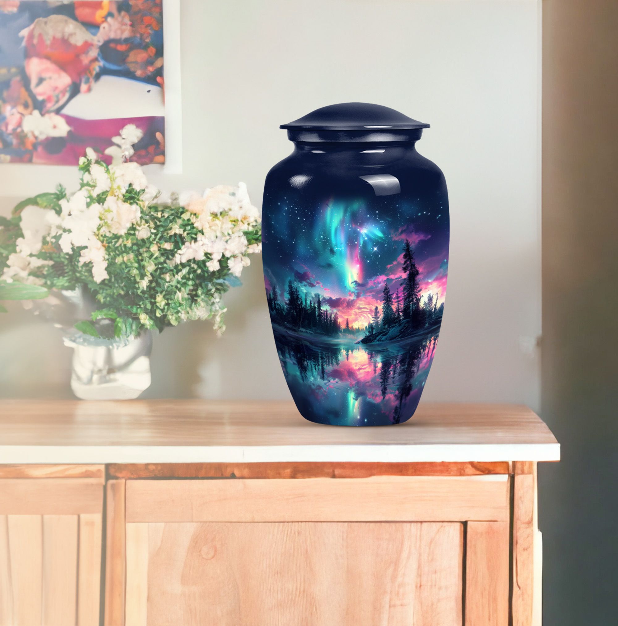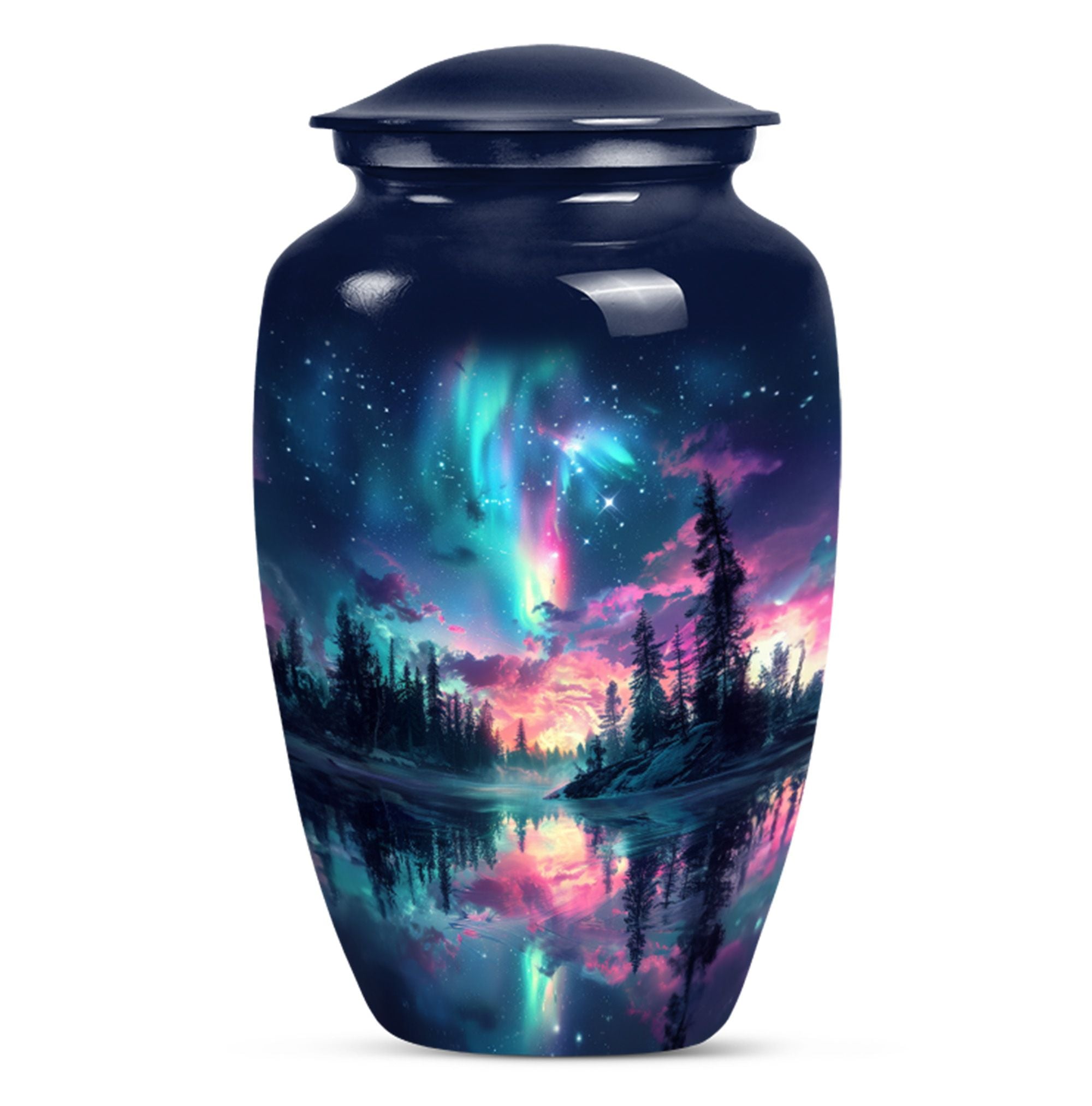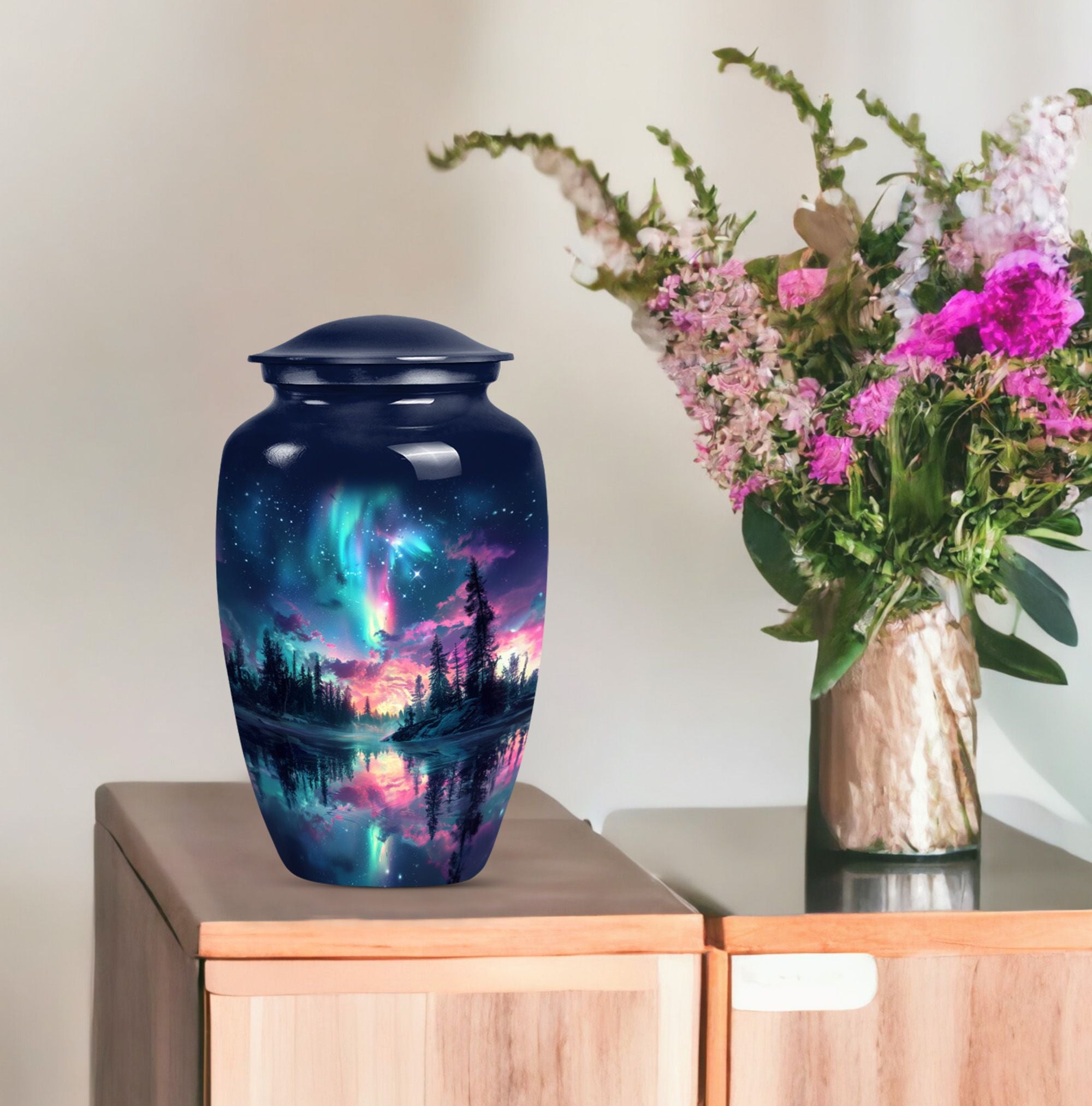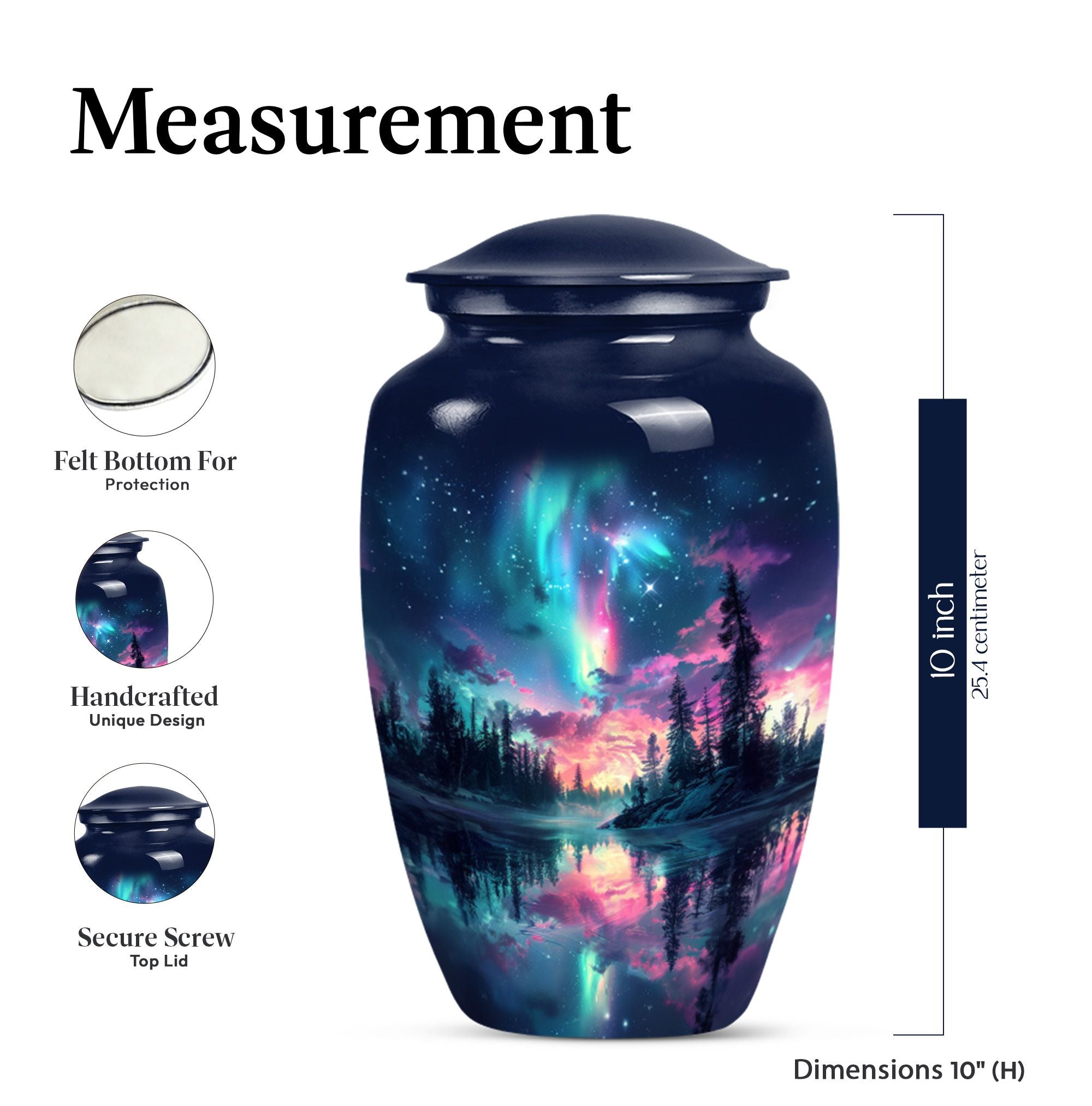 Honor your cherished loved one with our beautiful and capacious 'Aurora Borealis' funeral urn, an ideal resting place for the ashes of adults or seniors. Exquisitely handcrafted from robust aluminium, this large urn is not just an urn, but a timeless tribute that preserves precious memories. With a majestic height of 10 inches and a weight of 3.3 pounds, it can hold up to 200 cubic inches of ashes. A velvet pouch accompanies the urn, ensuring the safe containment of ashes. The urn portrays an elegant butterfly theme, signifying the soul's triumphant flight to eternal liberation. You can personalize this urn with the engraved names of the departed, making it more unique to your loved one. The keywords capturing the essence of this memorial urn include arora borealis urn, urns for human ashes, memorial urns, and urns for cremation ashes. Its design is a signature blend of classic and innovative modern urns, embodying the profound respect you bear for the departed soul.