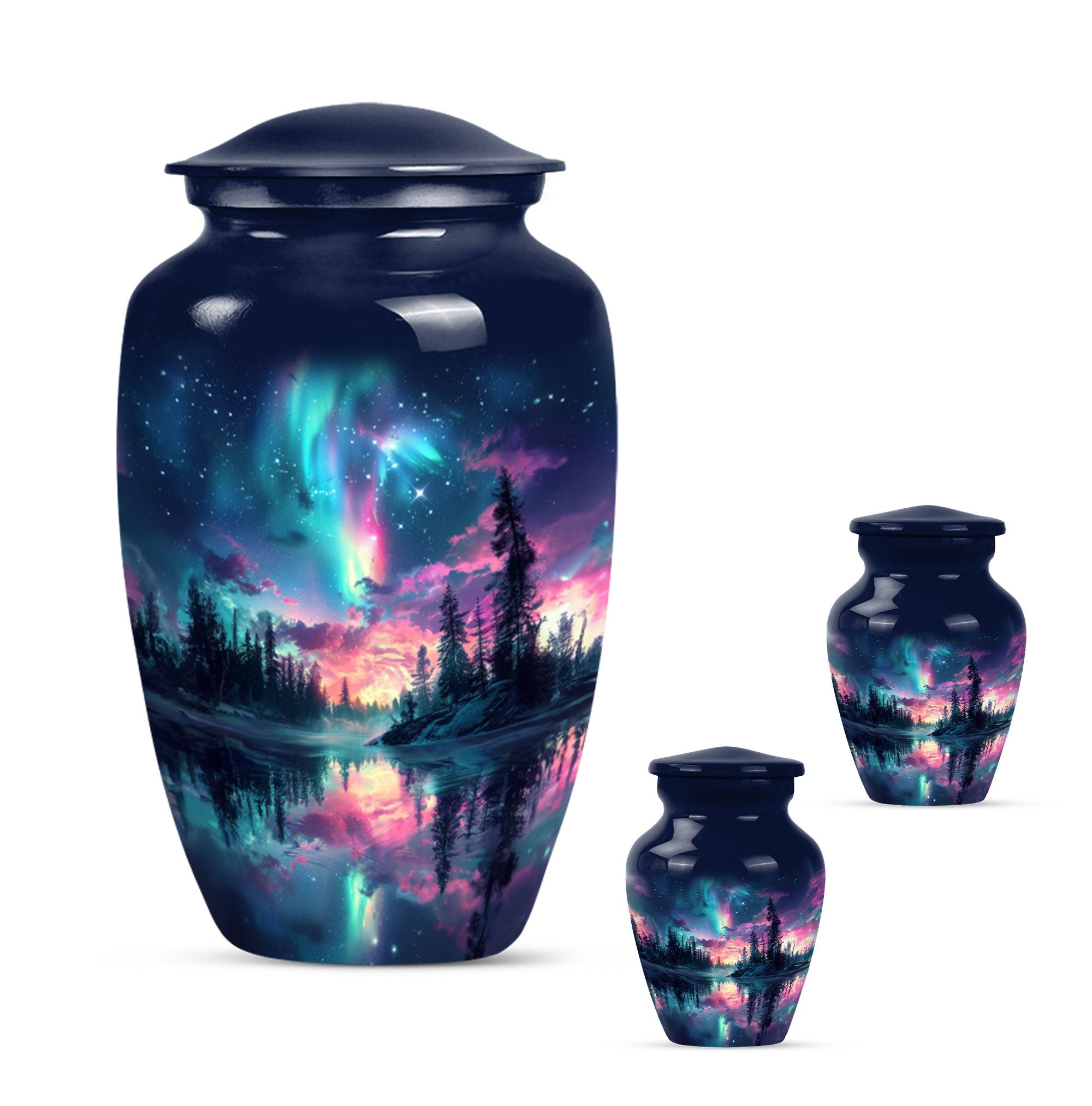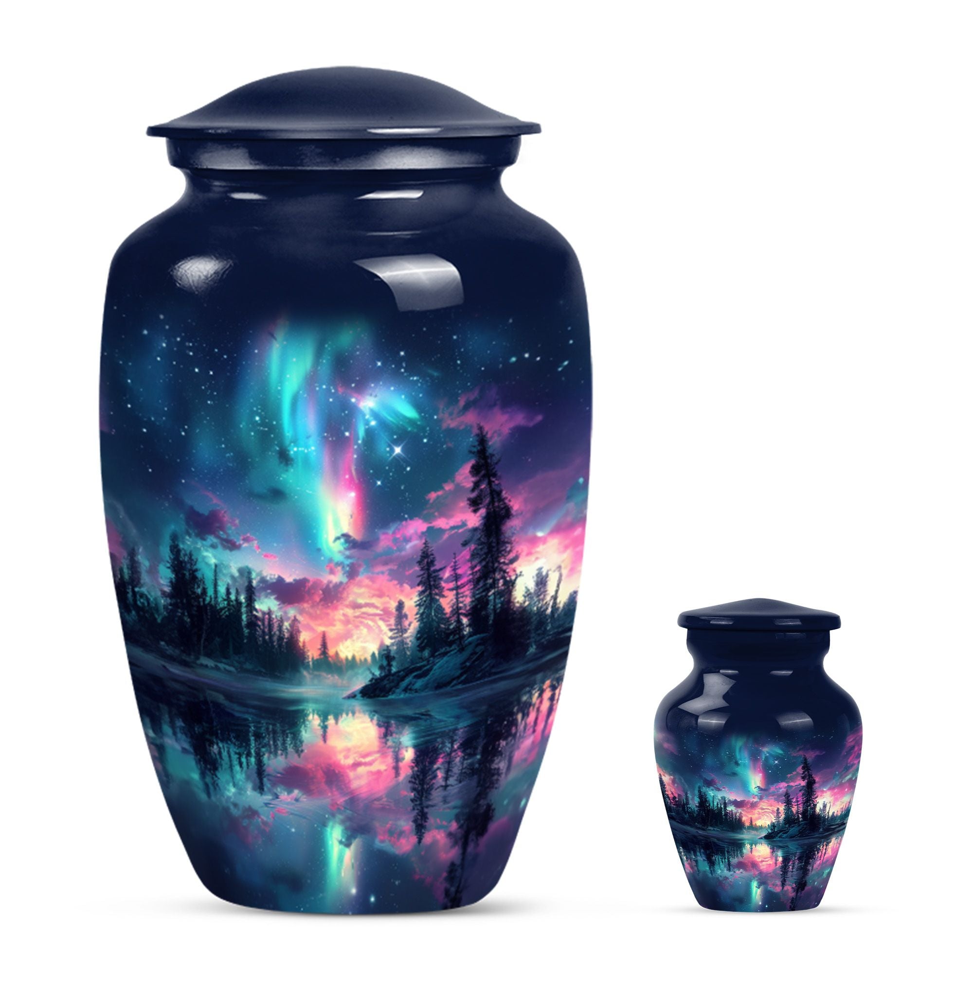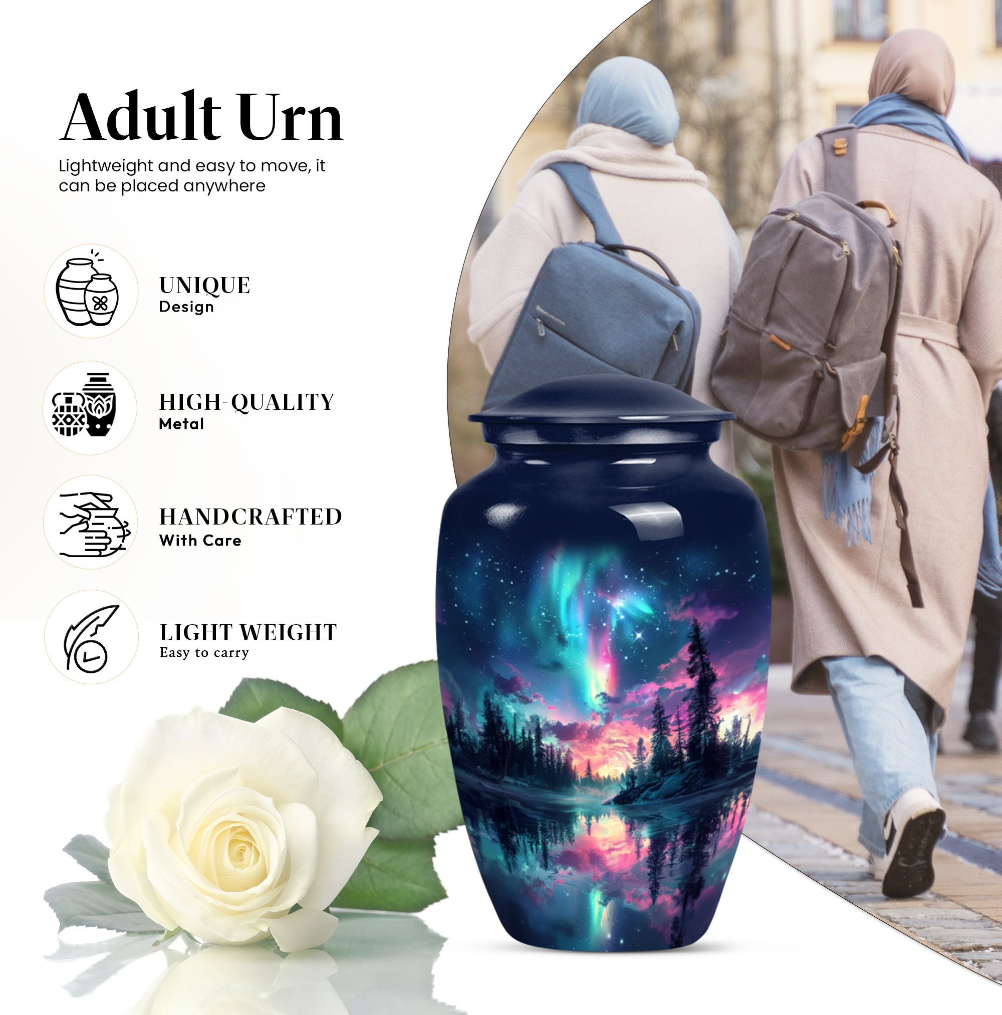 Honor your cherished loved one with our beautiful and capacious 'Aurora Borealis' funeral urn, an ideal resting place for the ashes of adults or seniors. Exquisitely handcrafted from robust aluminium, this large urn is not just an urn, but a timeless tribute that preserves precious memories. With a majestic height of 10 inches and a weight of 3.3 pounds, it can hold up to 200 cubic inches of ashes. A velvet pouch accompanies the urn, ensuring the safe containment of ashes. The urn portrays an elegant butterfly theme, signifying the soul's triumphant flight to eternal liberation. You can personalize this urn with the engraved names of the departed, making it more unique to your loved one. The keywords capturing the essence of this memorial urn include arora borealis urn, urns for human ashes, memorial urns, and urns for cremation ashes. Its design is a signature blend of classic and innovative modern urns, embodying the profound respect you bear for the departed soul.