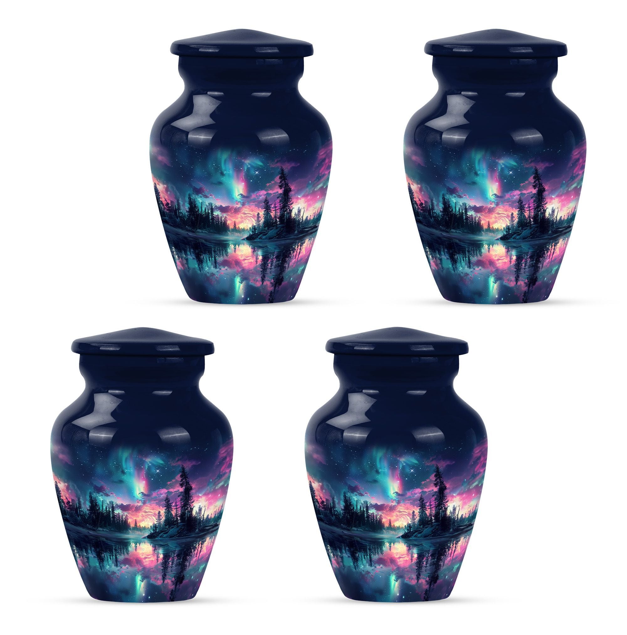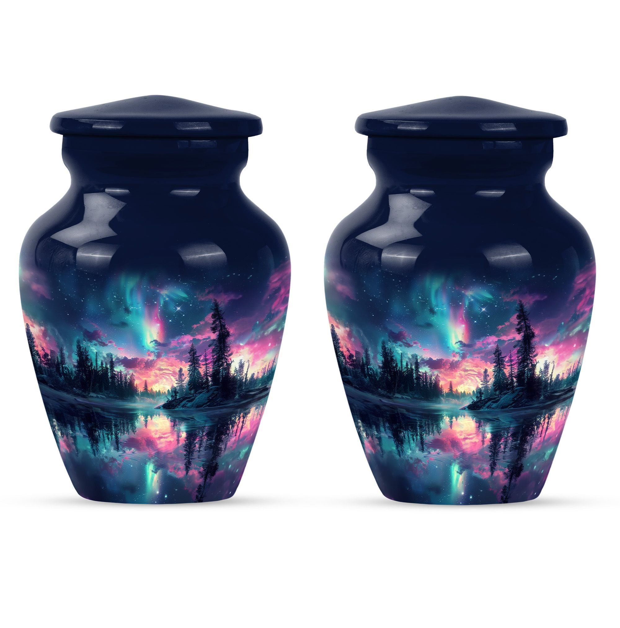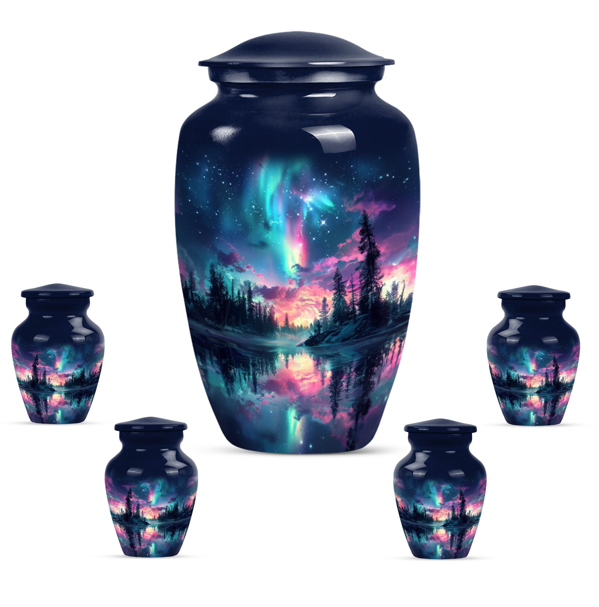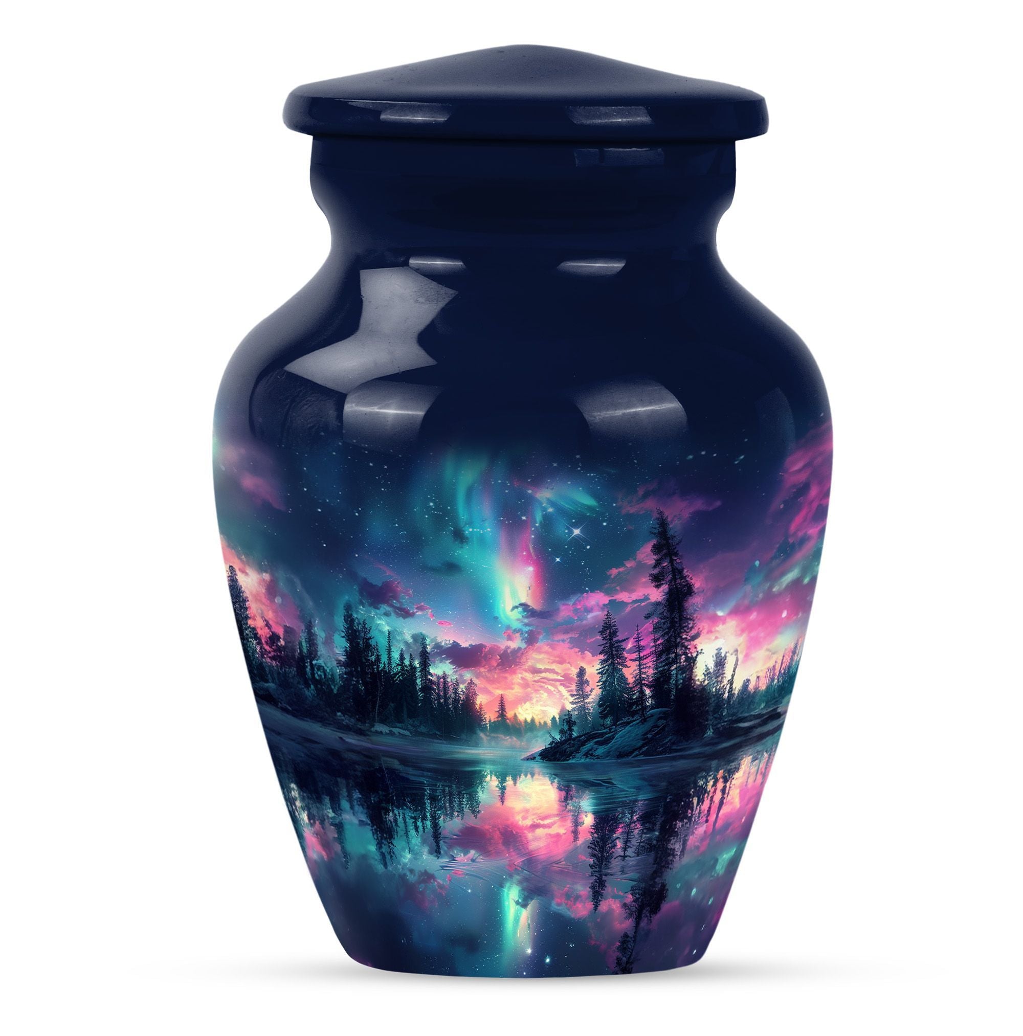 Honor your cherished loved one with our beautiful and capacious 'Aurora Borealis' funeral urn, an ideal resting place for the ashes of adults or seniors. Exquisitely handcrafted from robust aluminium, this large urn is not just an urn, but a timeless tribute that preserves precious memories. With a majestic height of 10 inches and a weight of 3.3 pounds, it can hold up to 200 cubic inches of ashes. A velvet pouch accompanies the urn, ensuring the safe containment of ashes. The urn portrays an elegant butterfly theme, signifying the soul's triumphant flight to eternal liberation. You can personalize this urn with the engraved names of the departed, making it more unique to your loved one. The keywords capturing the essence of this memorial urn include arora borealis urn, urns for human ashes, memorial urns, and urns for cremation ashes. Its design is a signature blend of classic and innovative modern urns, embodying the profound respect you bear for the departed soul.