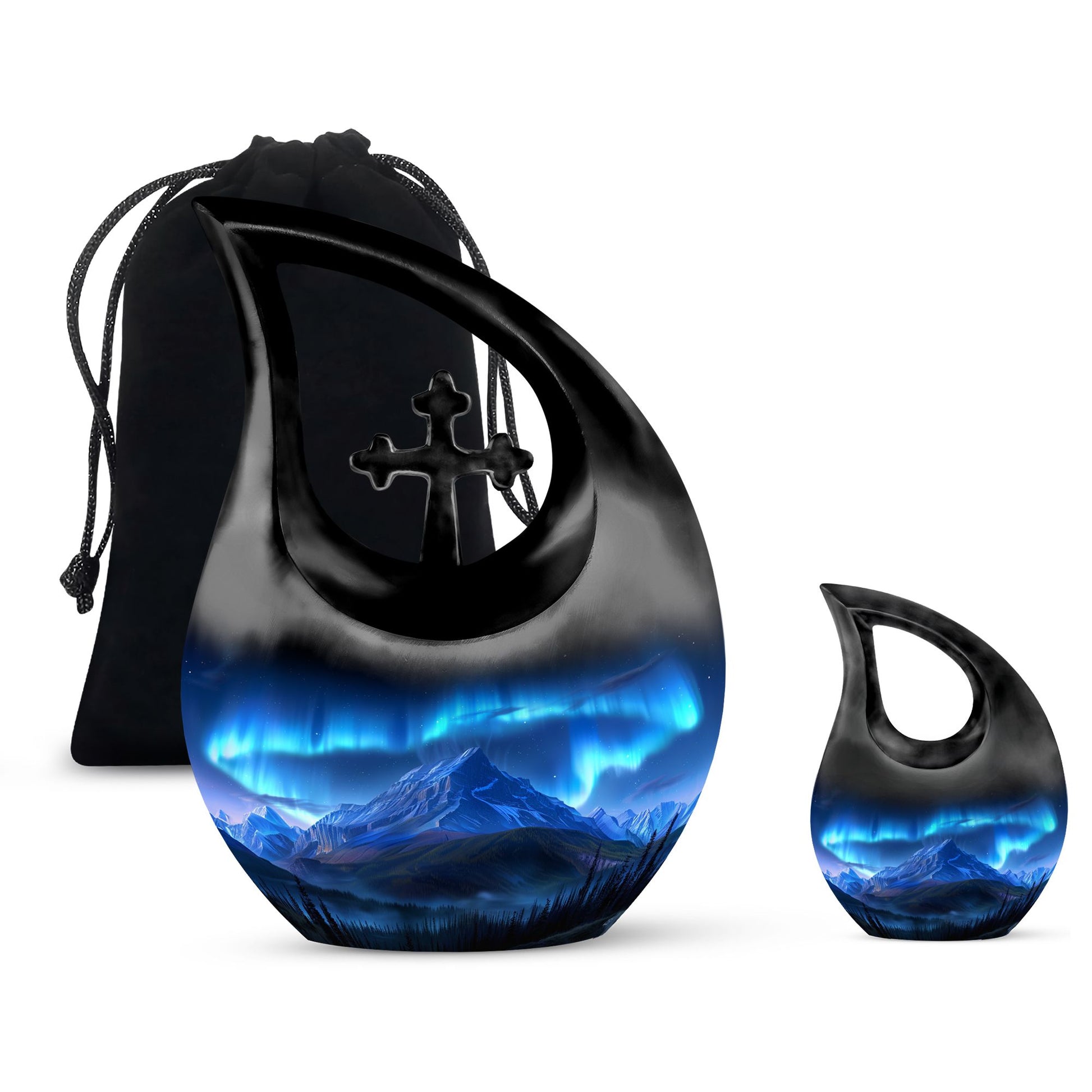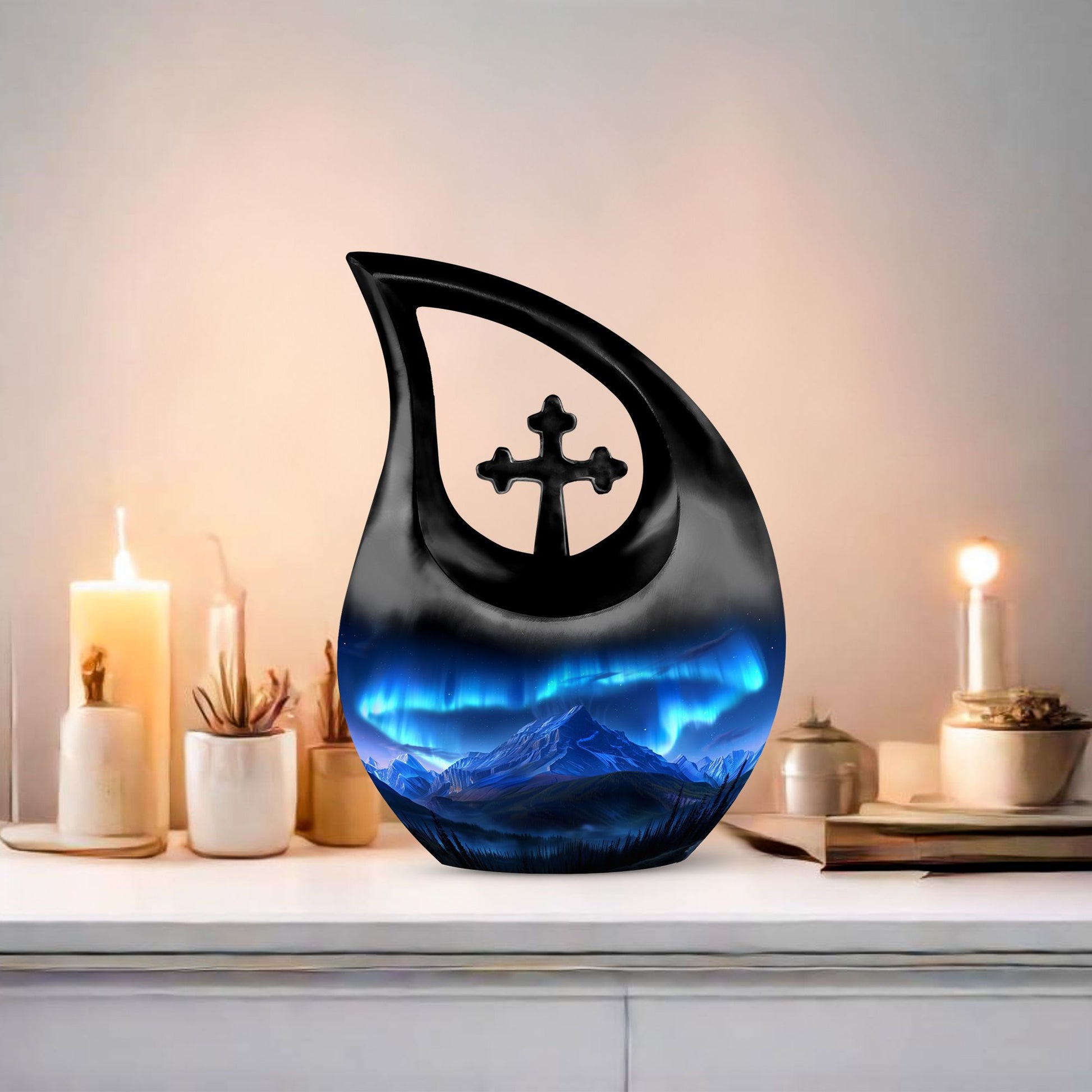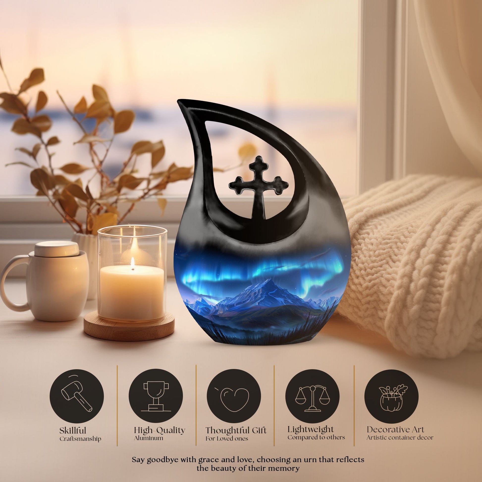 Discover your unique commemoration with our Arora Borealis Urn. This 10-inch urn, shadowcast in sturdy aluminium, fuses tradition with unmatched artistry. Its captivating cross drop motif echoes sentiments of solace and remembrance. At 3.3 pounds, this majestic memento secures up to 200 cubic inches of precious memories - an ideal pick amongst large urns. Its customization feature exemplifies this dedication by allowing the engraving of names, making it one of the most meaningful customized urns for ashes for adults. Safeguarded in an accompanying velvet pouch, it assures the delicate containment of ashes, reflecting the profundity of your love. A representative cremation monument, this urn resonates with your need for unique urns for dad or anyone dearly missed. Make your peace with this memorial urn for human ashes, a poignant reminder of the afterglow of a cherished life.