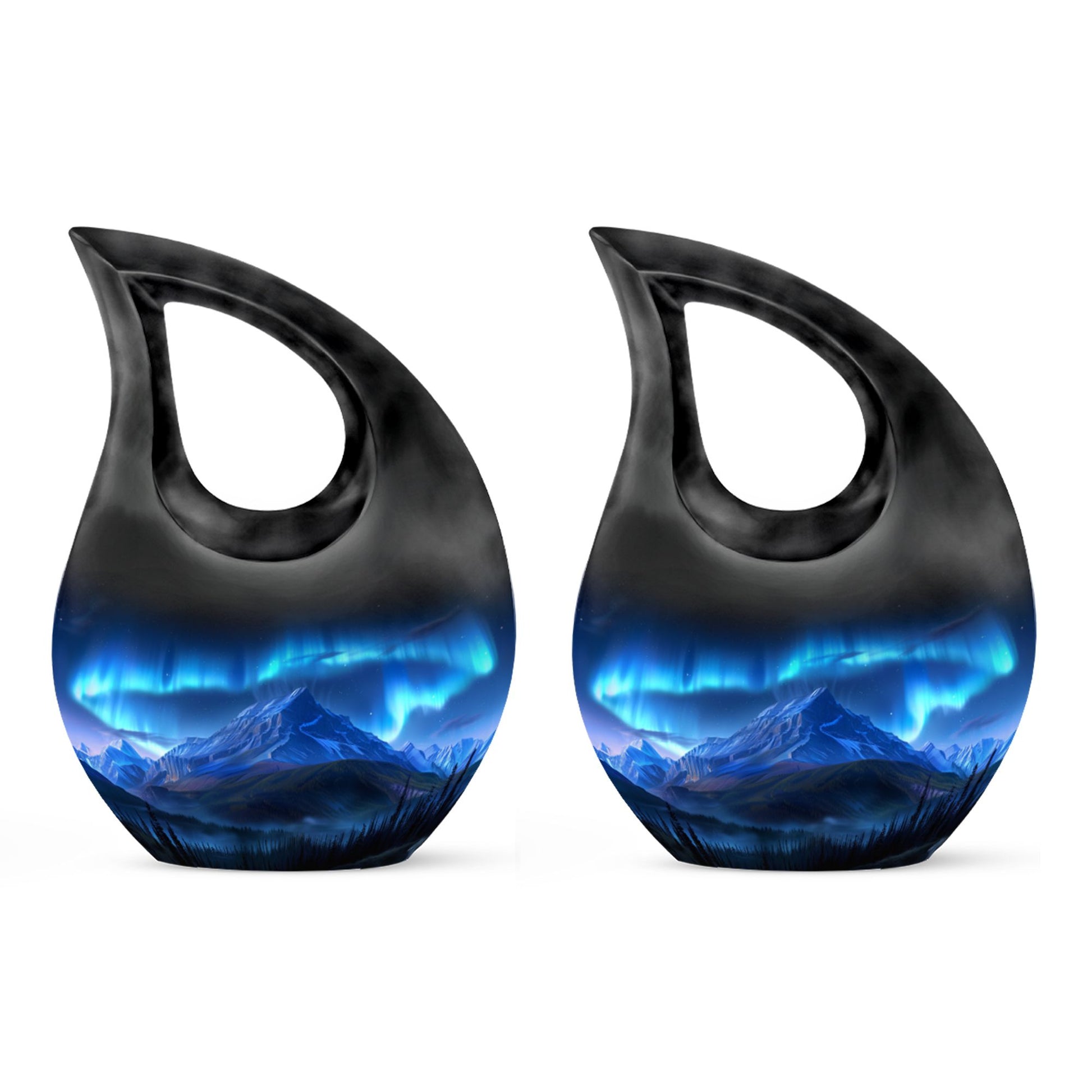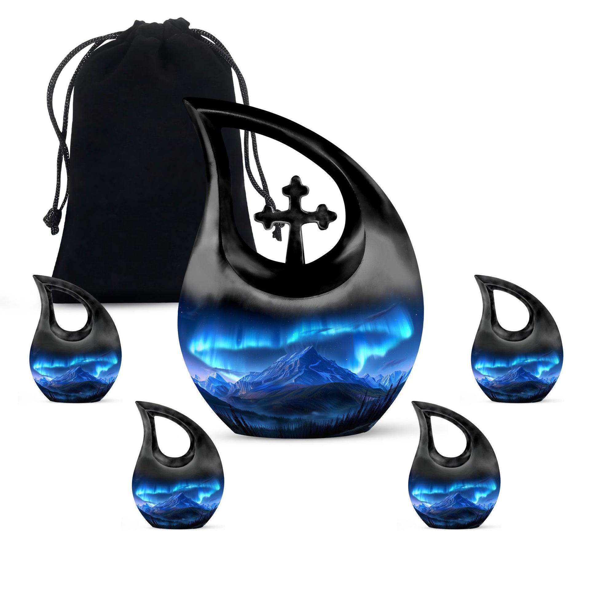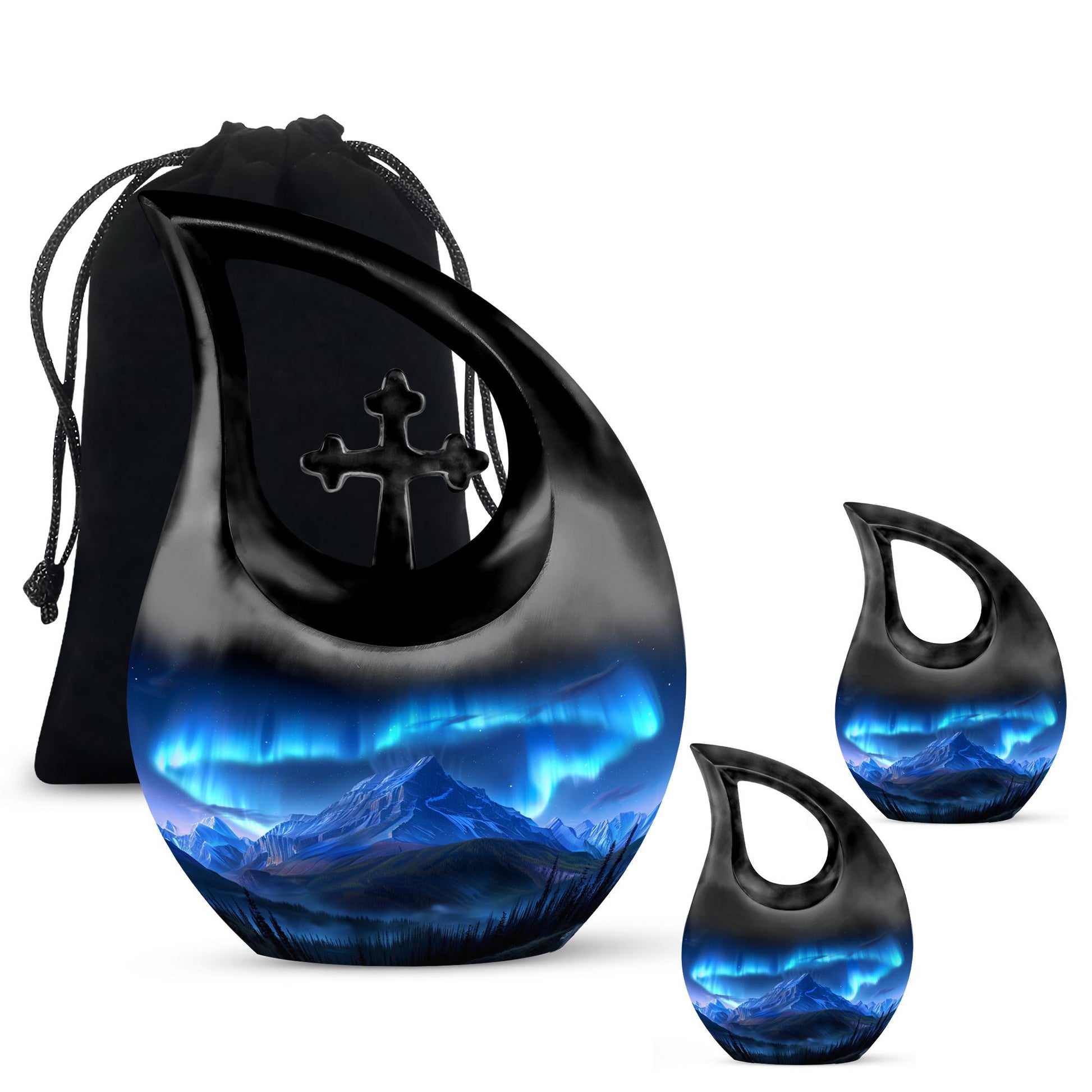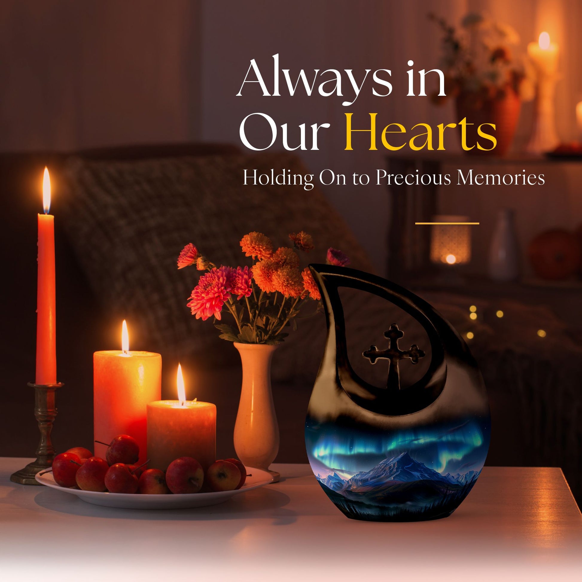 Discover your unique commemoration with our Arora Borealis Urn. This 10-inch urn, shadowcast in sturdy aluminium, fuses tradition with unmatched artistry. Its captivating cross drop motif echoes sentiments of solace and remembrance. At 3.3 pounds, this majestic memento secures up to 200 cubic inches of precious memories - an ideal pick amongst large urns. Its customization feature exemplifies this dedication by allowing the engraving of names, making it one of the most meaningful customized urns for ashes for adults. Safeguarded in an accompanying velvet pouch, it assures the delicate containment of ashes, reflecting the profundity of your love. A representative cremation monument, this urn resonates with your need for unique urns for dad or anyone dearly missed. Make your peace with this memorial urn for human ashes, a poignant reminder of the afterglow of a cherished life.