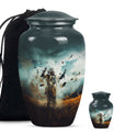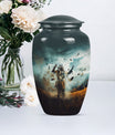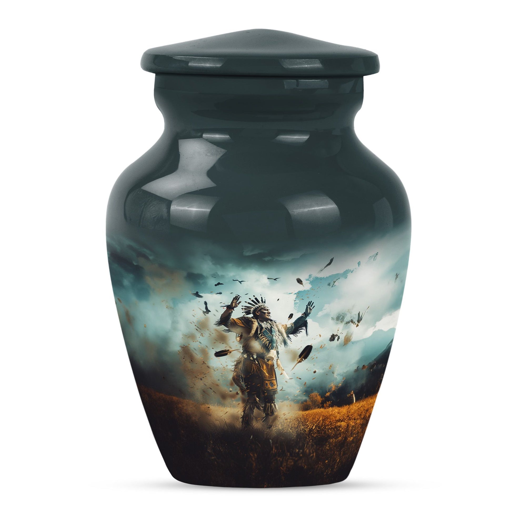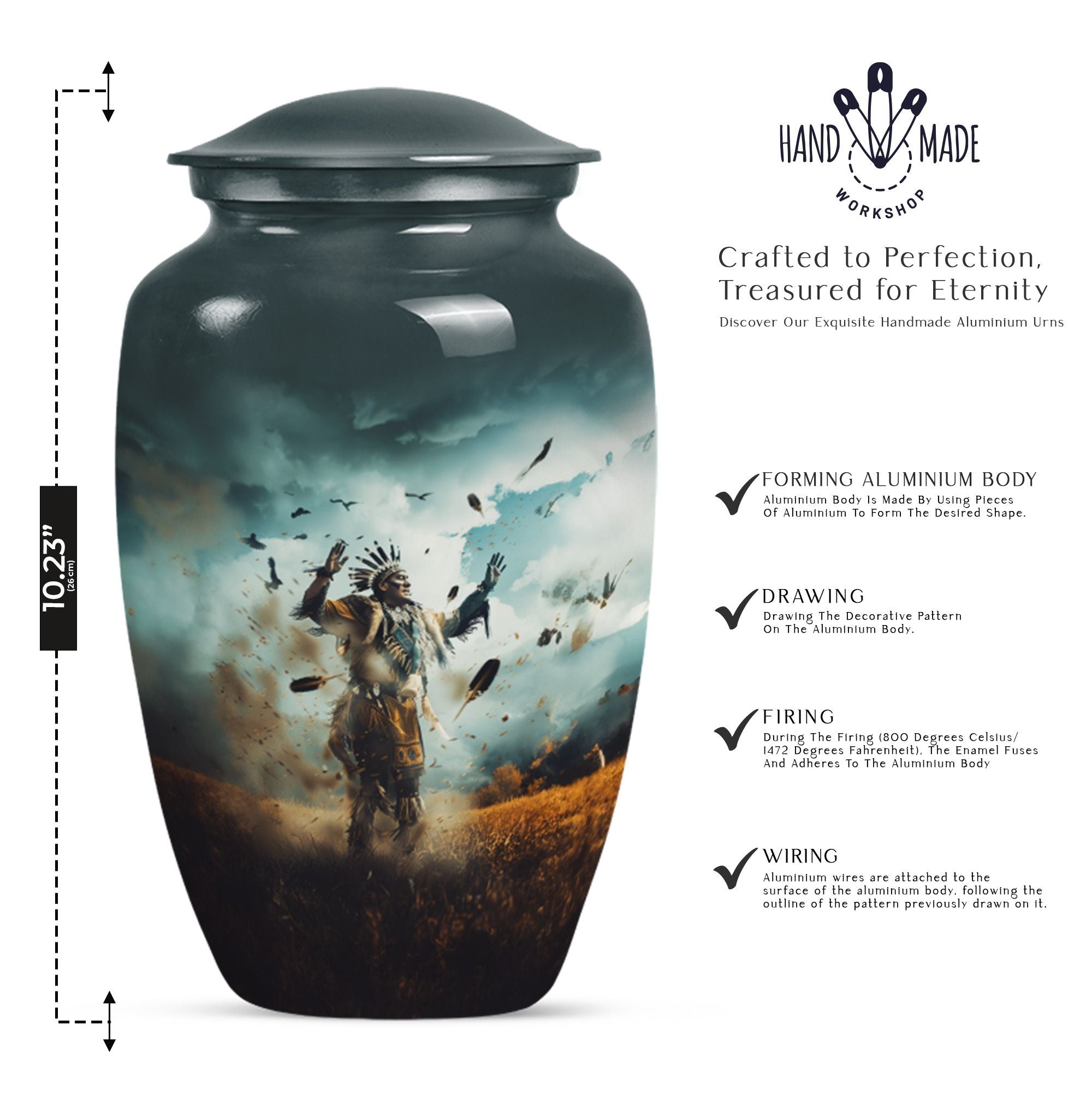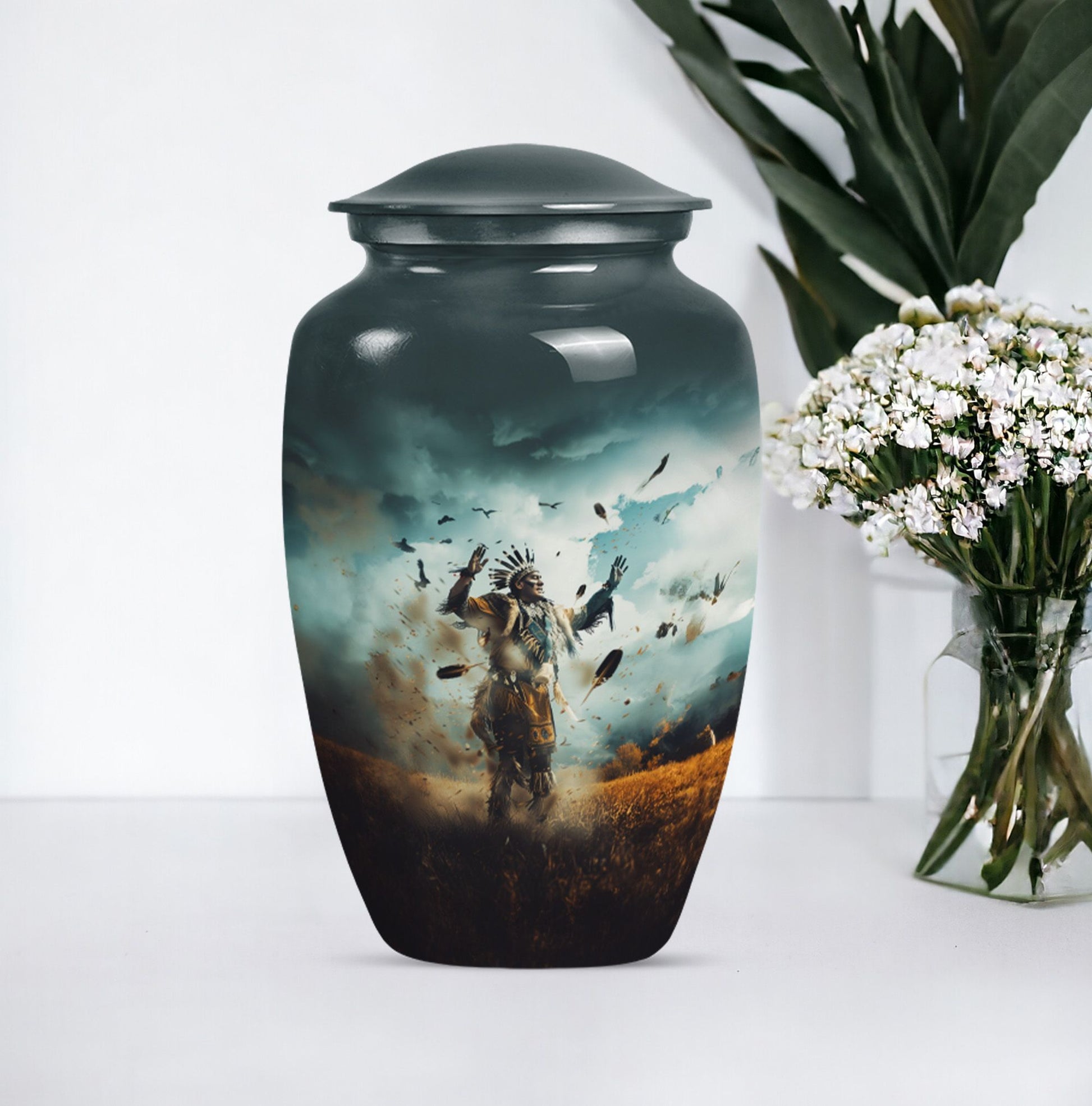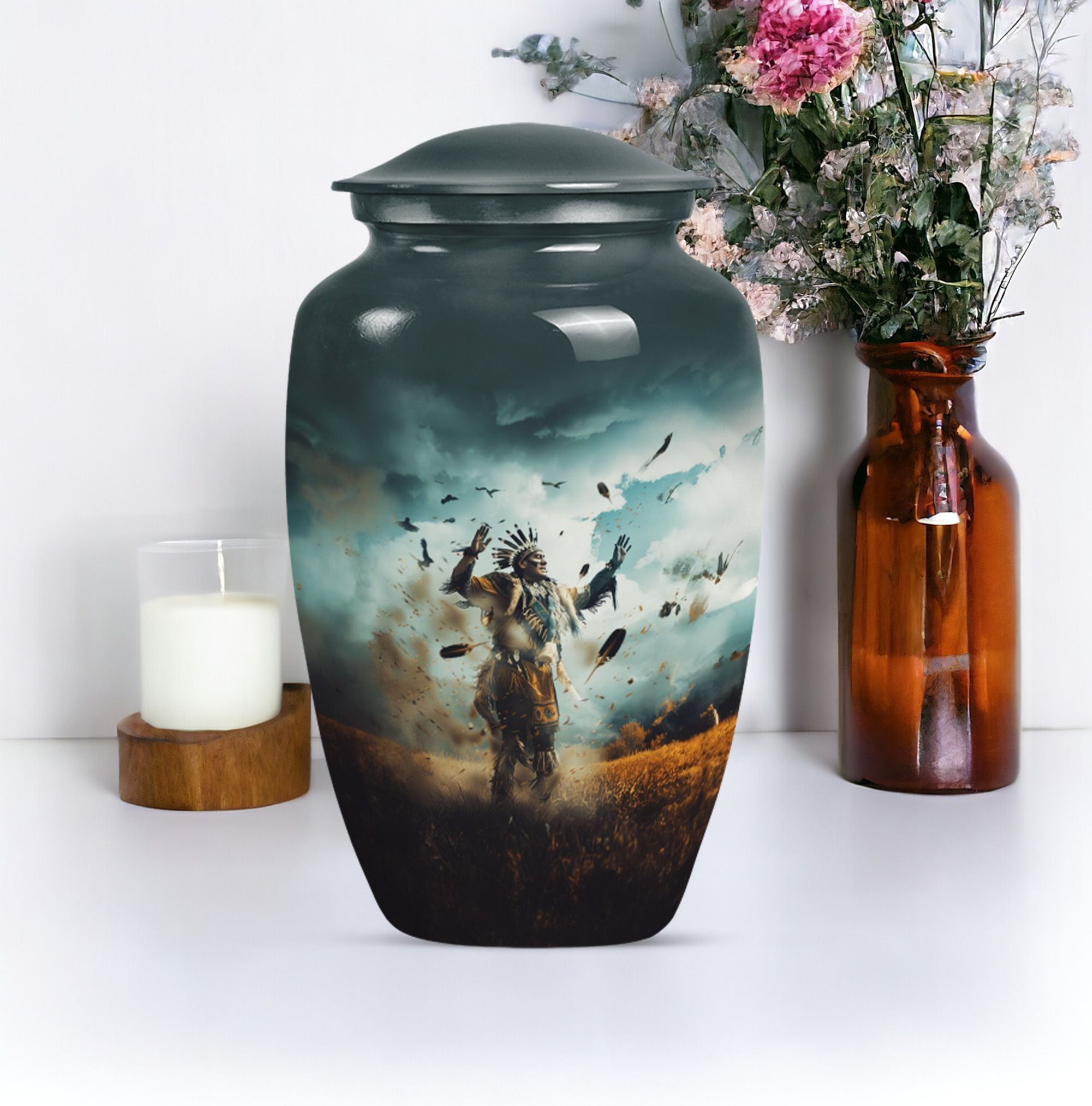 Honor the memory of your departed loved ones with this exquisite Native American Urn. Its abstract theme and classic design shaped from quality aluminium resound with solemnity and respect. Measuring at 10" in height, this memorial burial urn demonstrates sturdiness with its 3.3 lbs. weight, offering a notable capacity of 200 cubic inches to securely hold the ashes. The large size of the urn makes it an appropriate selection for adults. This product stands out for its customization feature, where buyers are presented with the opportunity to personalize the urn with the engraved names of departed loved ones, further enhancing its value as a memorial item. Included in your purchase is a beautiful, soft velvet pouch for containment of ashes, ensuring both respect and convenience. While often searched terms such as 'funeral ash urn', 'funeral burial', 'cremation urns for humans', and 'funeral urns for adult ashes men', properly reflect this product, it is the emotional weight and spiritual comfort it brings that sets it apart. Channel the spirit of memory and revere your loved one with this unique, quality urn.