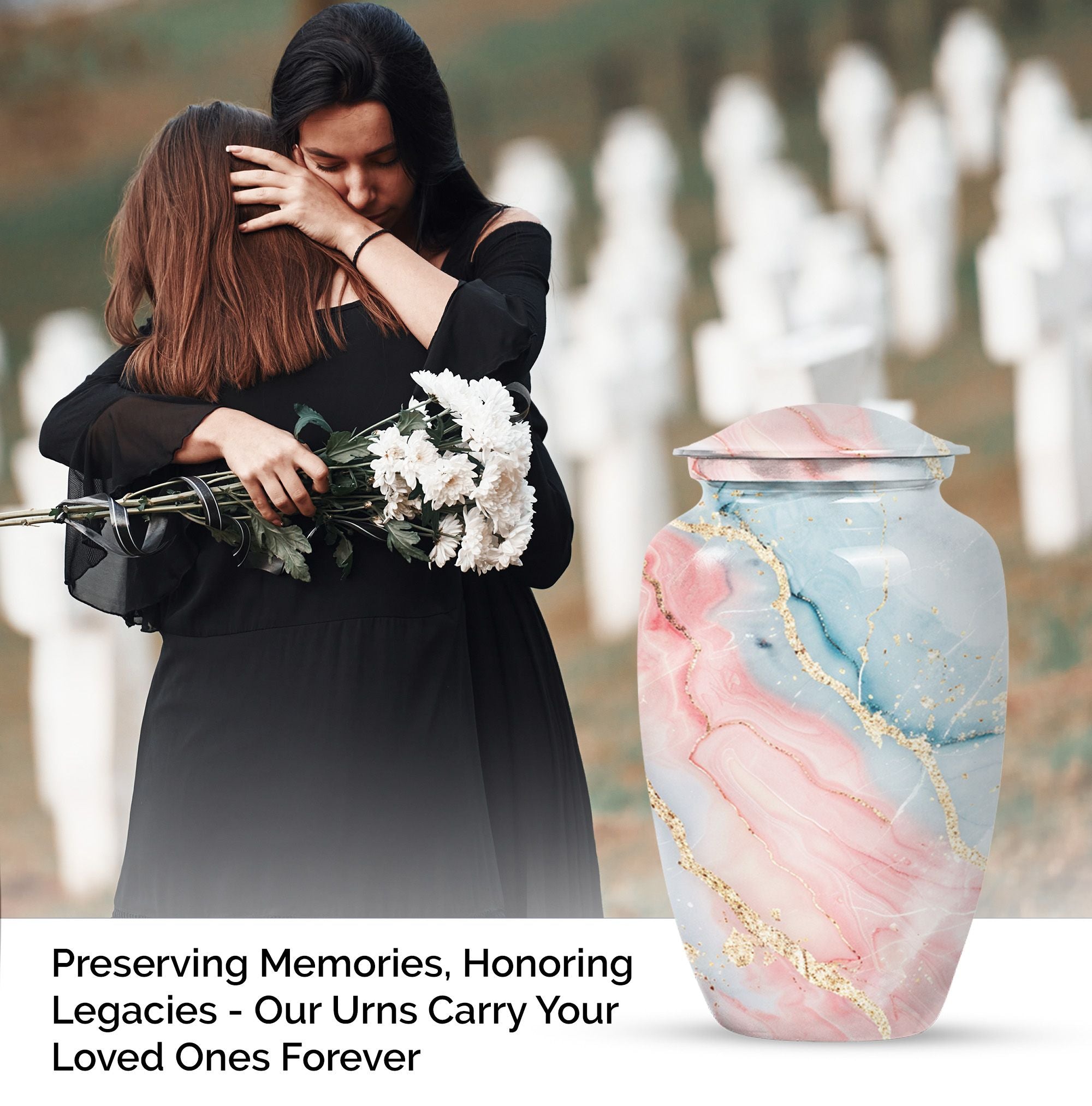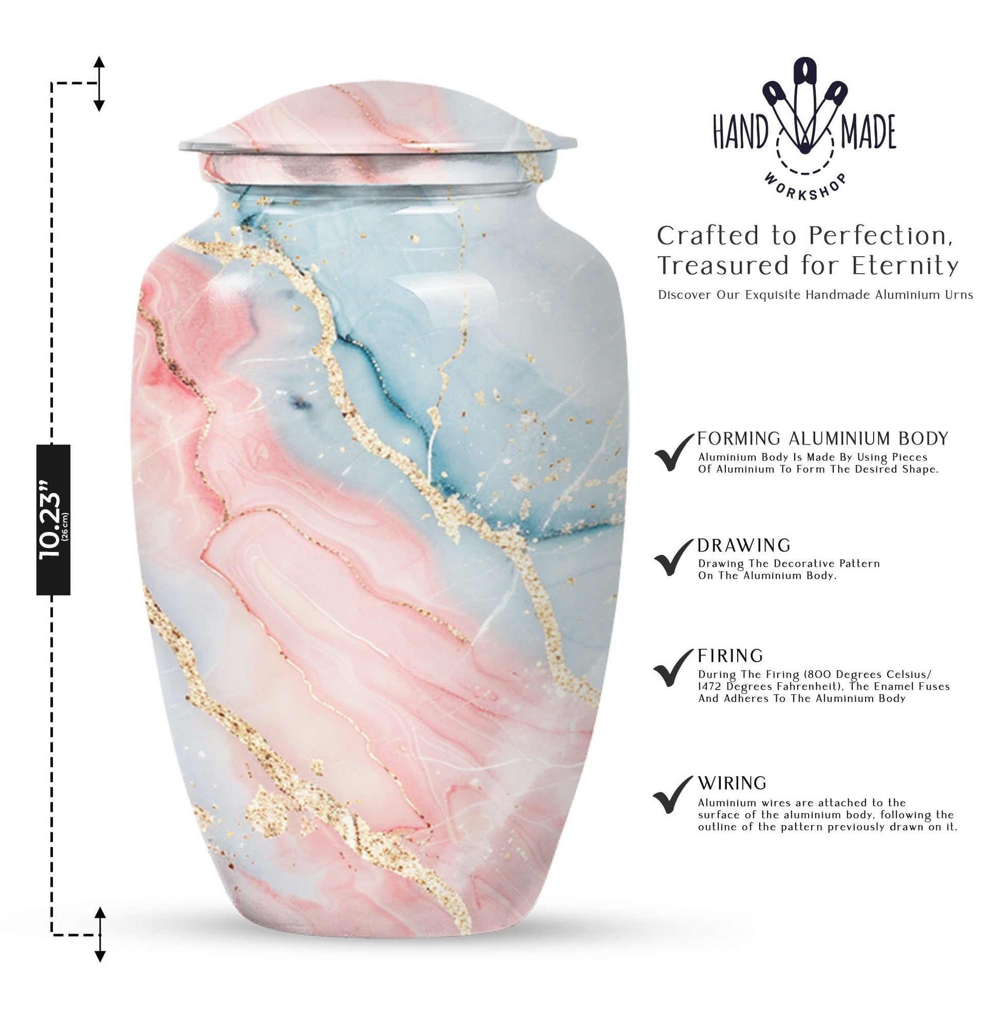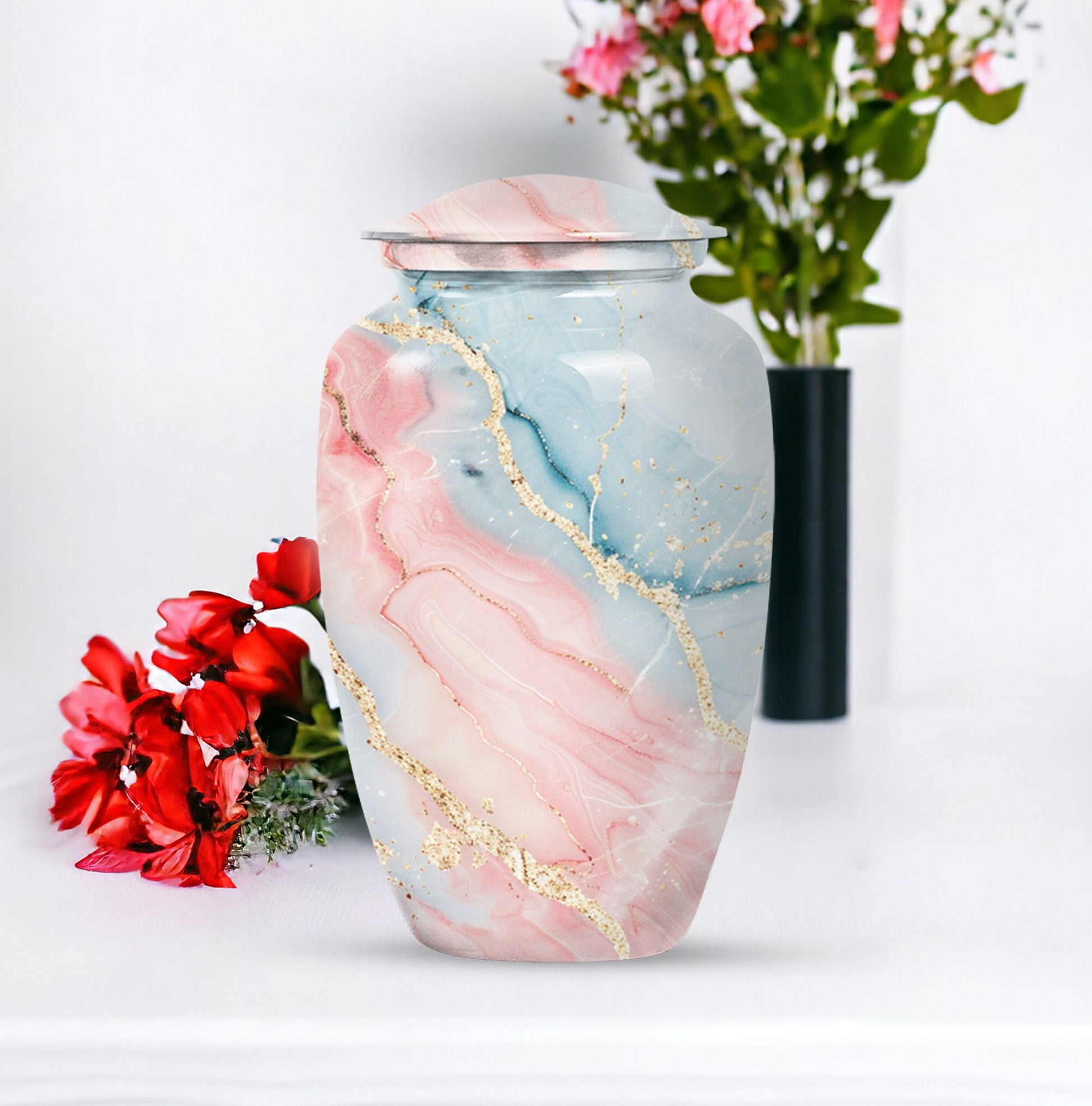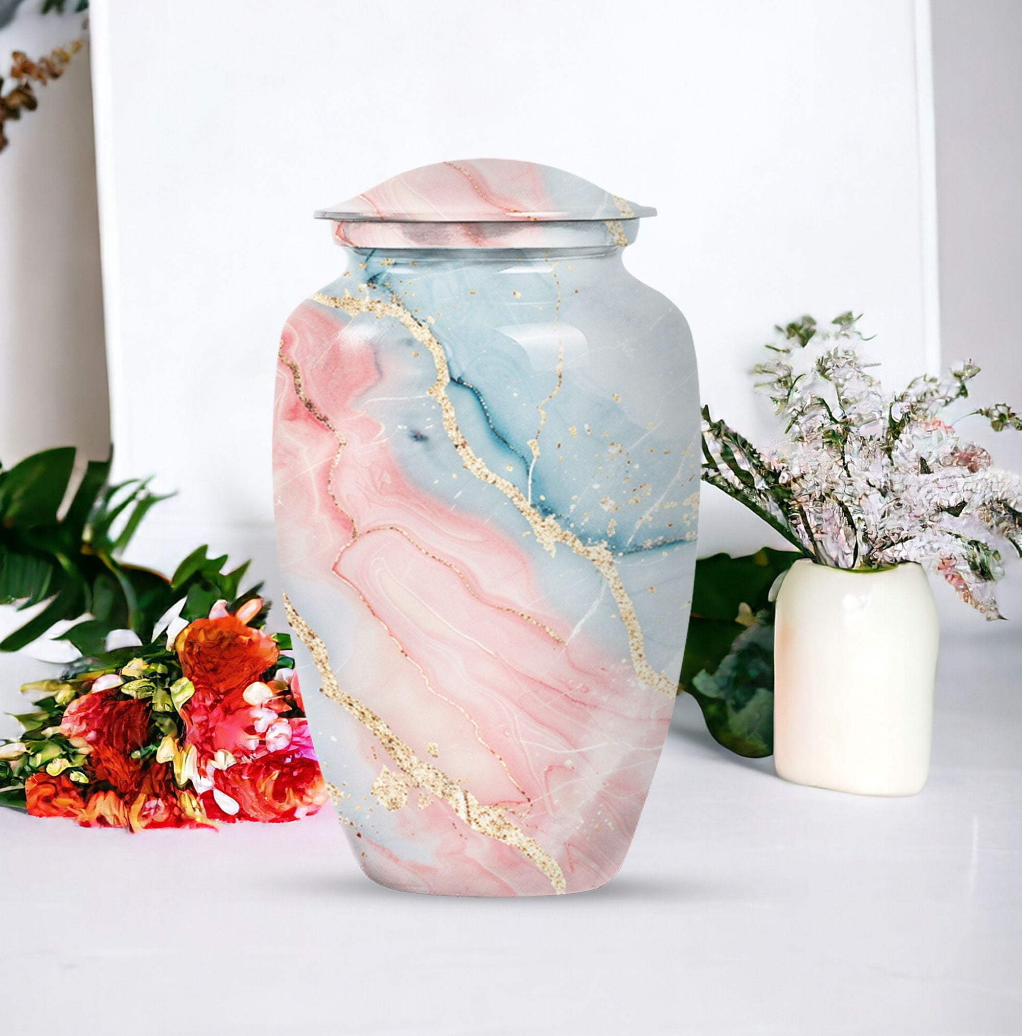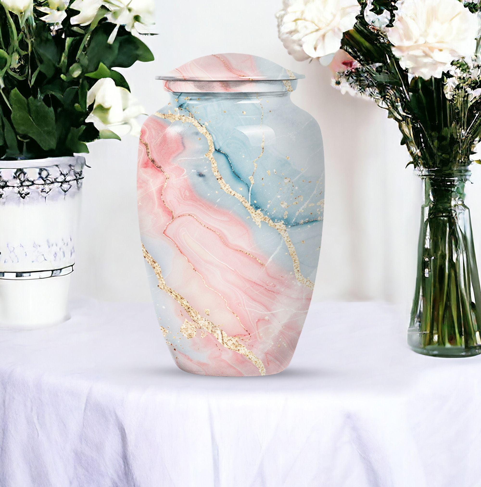 Explicitly designed for those seeking something beyond the ordinary, this Abstract-themed Artistic Design Urn emanates an aura of solemnity and profound respect. Crafted from high-quality Aluminium, this large-sized 'Classic Urn' cremation urn weighs a solid 3.3 pounds and stands 10 inches tall. Its substantial capacity of 200 cubic inches makes it perfect for secure containment of adult male ashes. The urn also caters to personal sentiments, offering the ability to engrave names on it. Its bold stature and aesthetic motif not only serve as a chic décor piece but also provide a heartfelt symbol of remembrance. Accompanied by a plush velvet pouch, this cremation urn for human ashes simplifies the usually complex process of ash storage. Perfect for burial ceremonies or as adult-size funeral urns for women, this piece signifies a breathtaking union of artistry and solace.