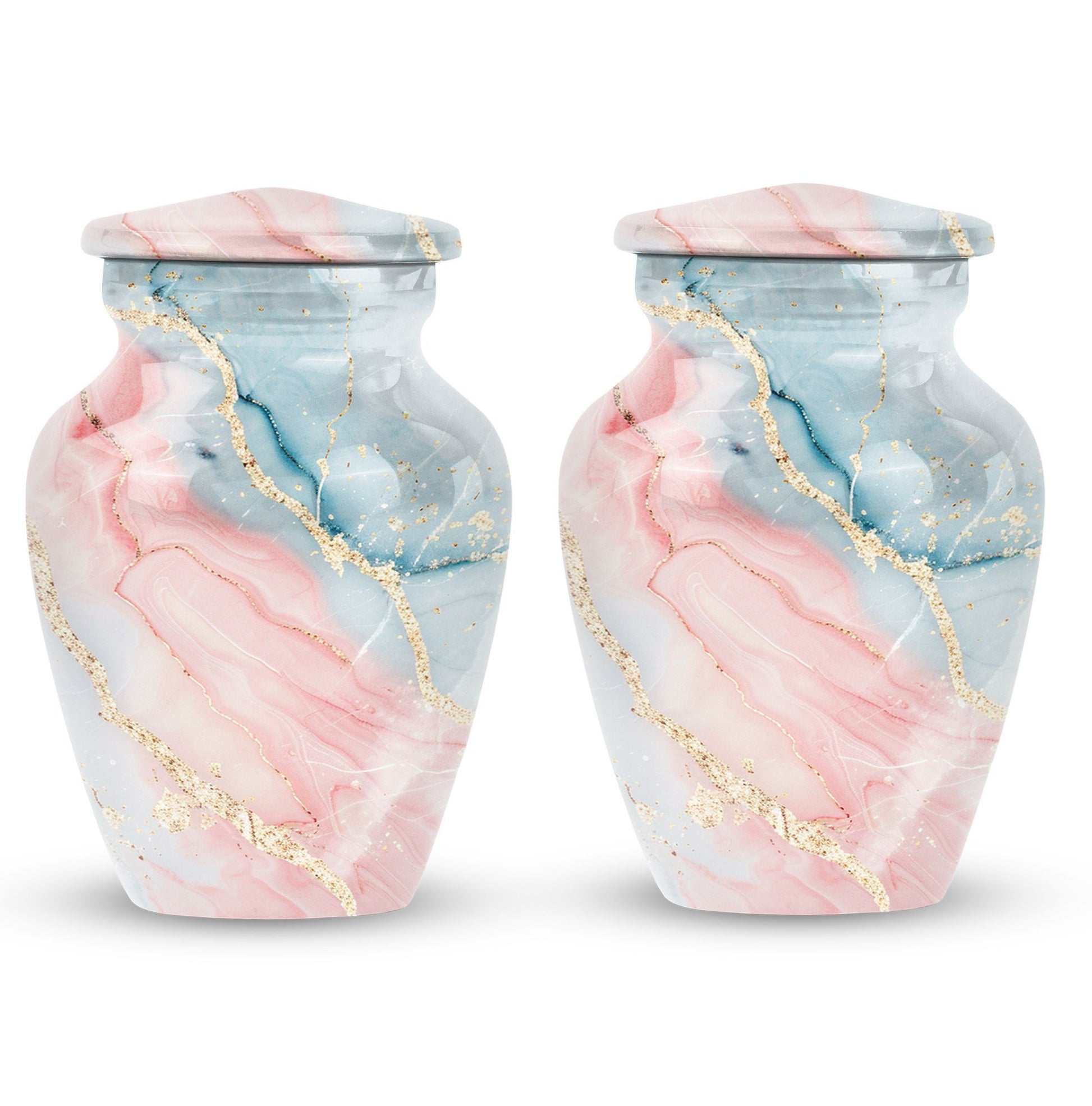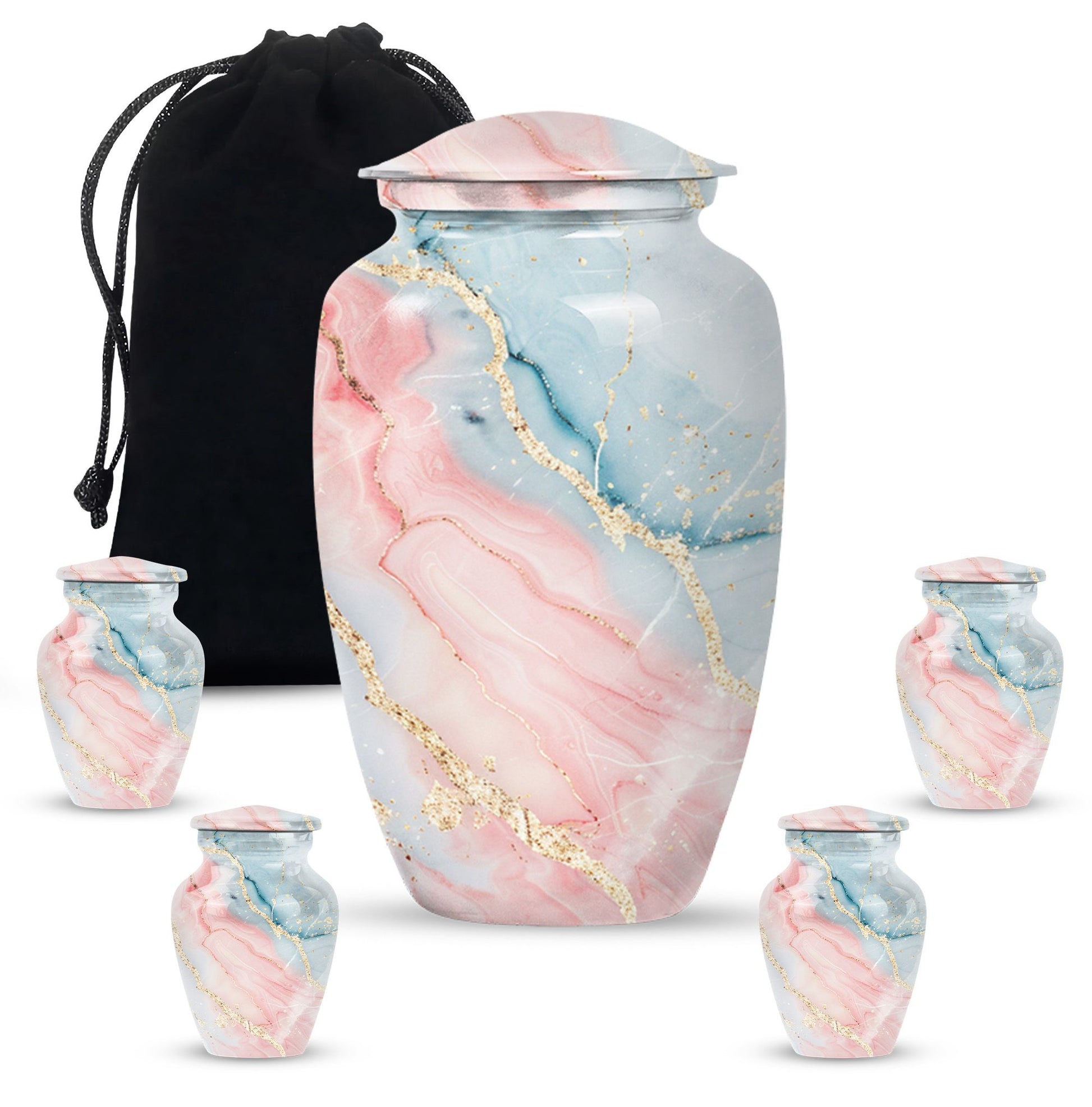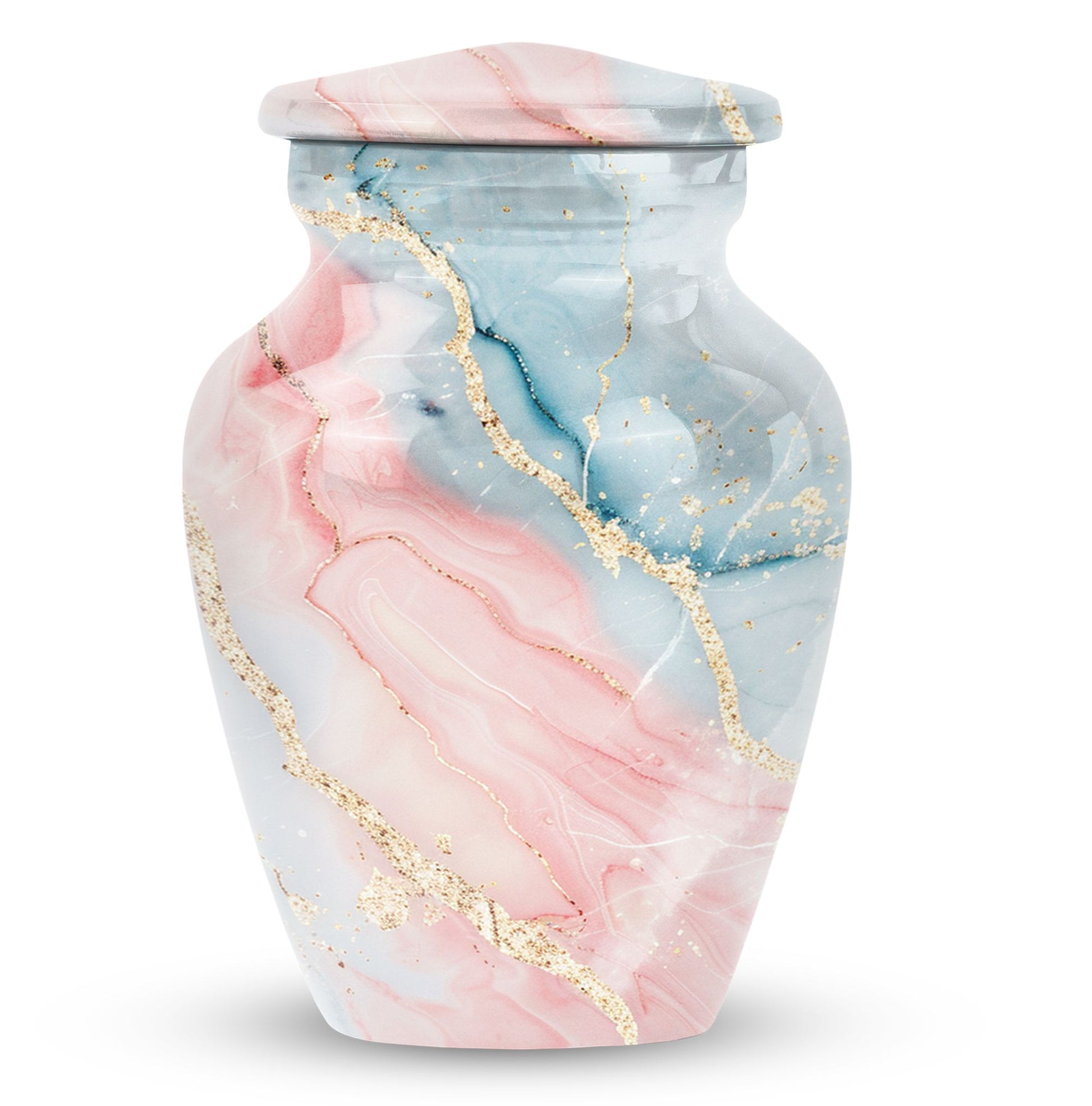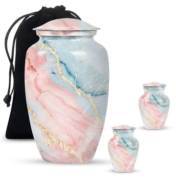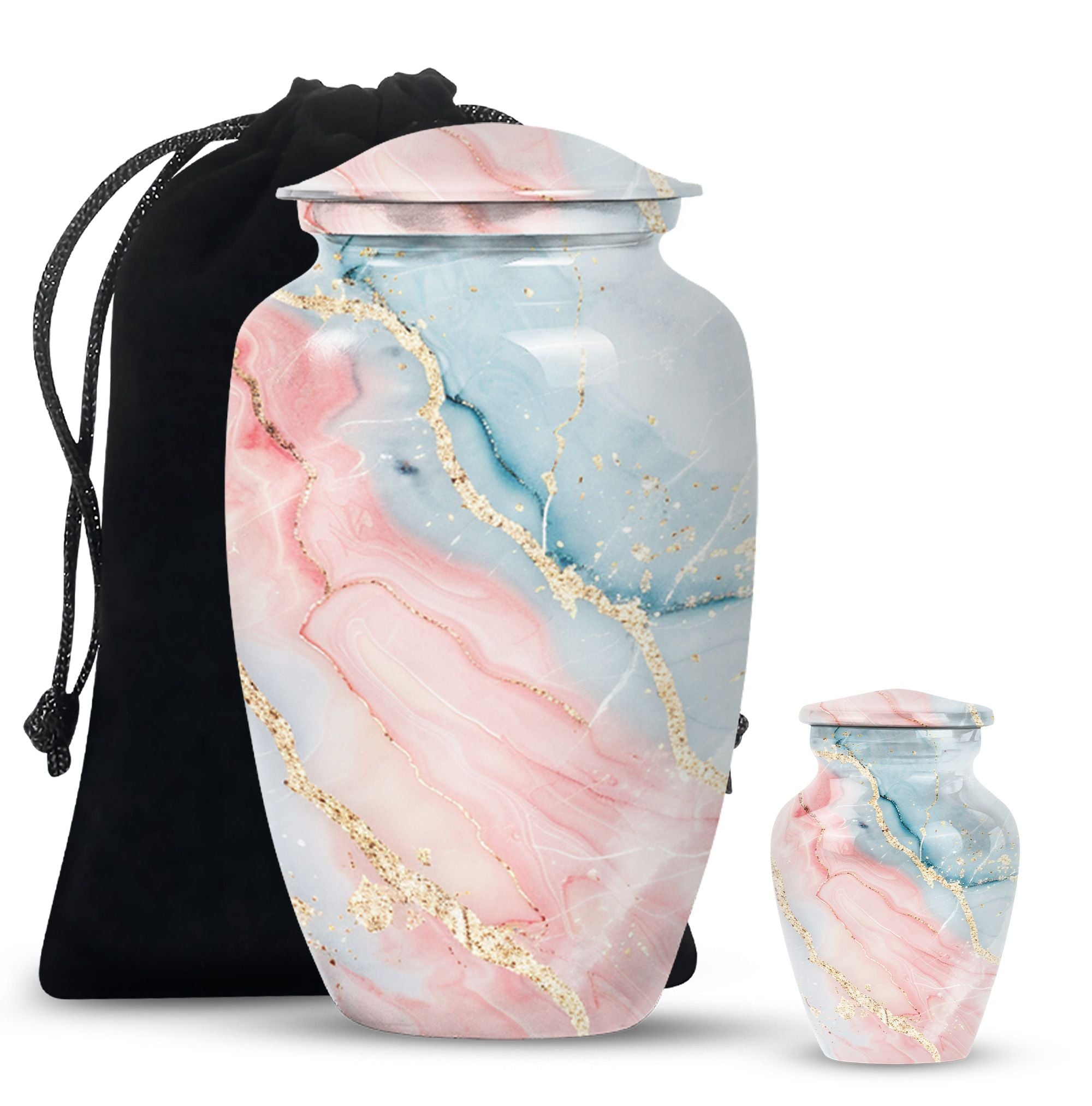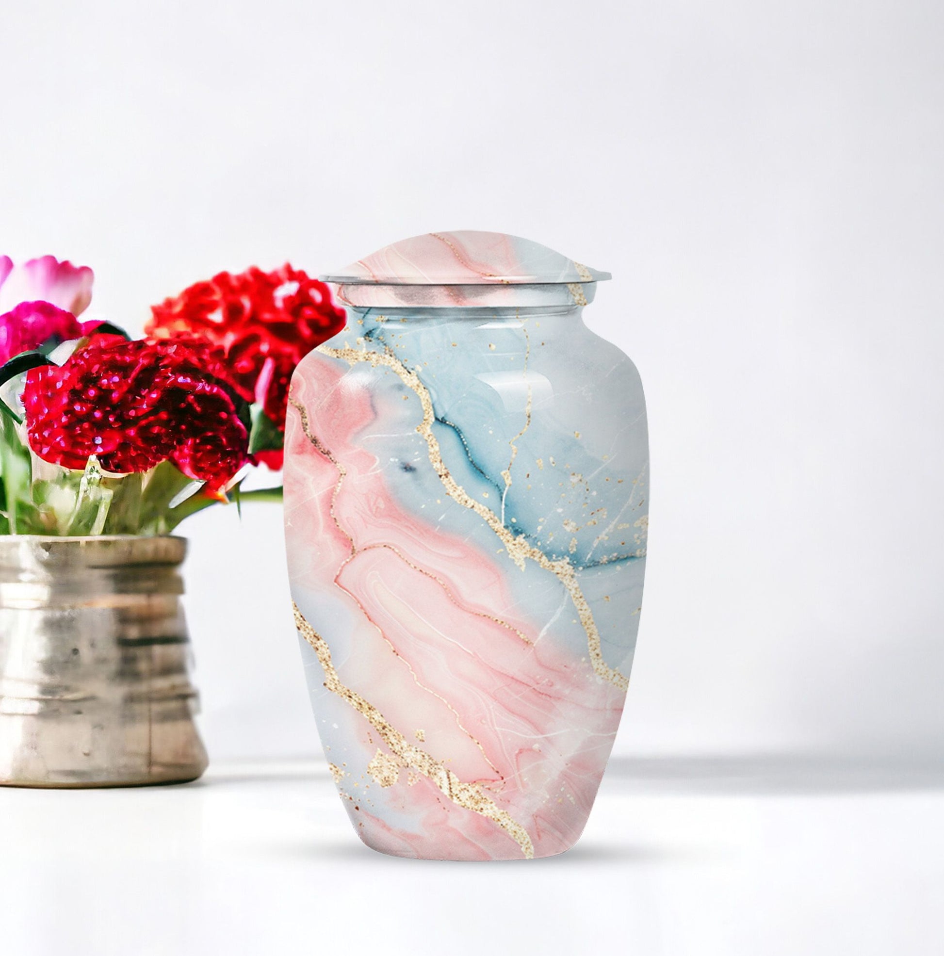 Explicitly designed for those seeking something beyond the ordinary, this Abstract-themed Artistic Design Urn emanates an aura of solemnity and profound respect. Crafted from high-quality Aluminium, this large-sized 'Classic Urn' cremation urn weighs a solid 3.3 pounds and stands 10 inches tall. Its substantial capacity of 200 cubic inches makes it perfect for secure containment of adult male ashes. The urn also caters to personal sentiments, offering the ability to engrave names on it. Its bold stature and aesthetic motif not only serve as a chic décor piece but also provide a heartfelt symbol of remembrance. Accompanied by a plush velvet pouch, this cremation urn for human ashes simplifies the usually complex process of ash storage. Perfect for burial ceremonies or as adult-size funeral urns for women, this piece signifies a breathtaking union of artistry and solace.