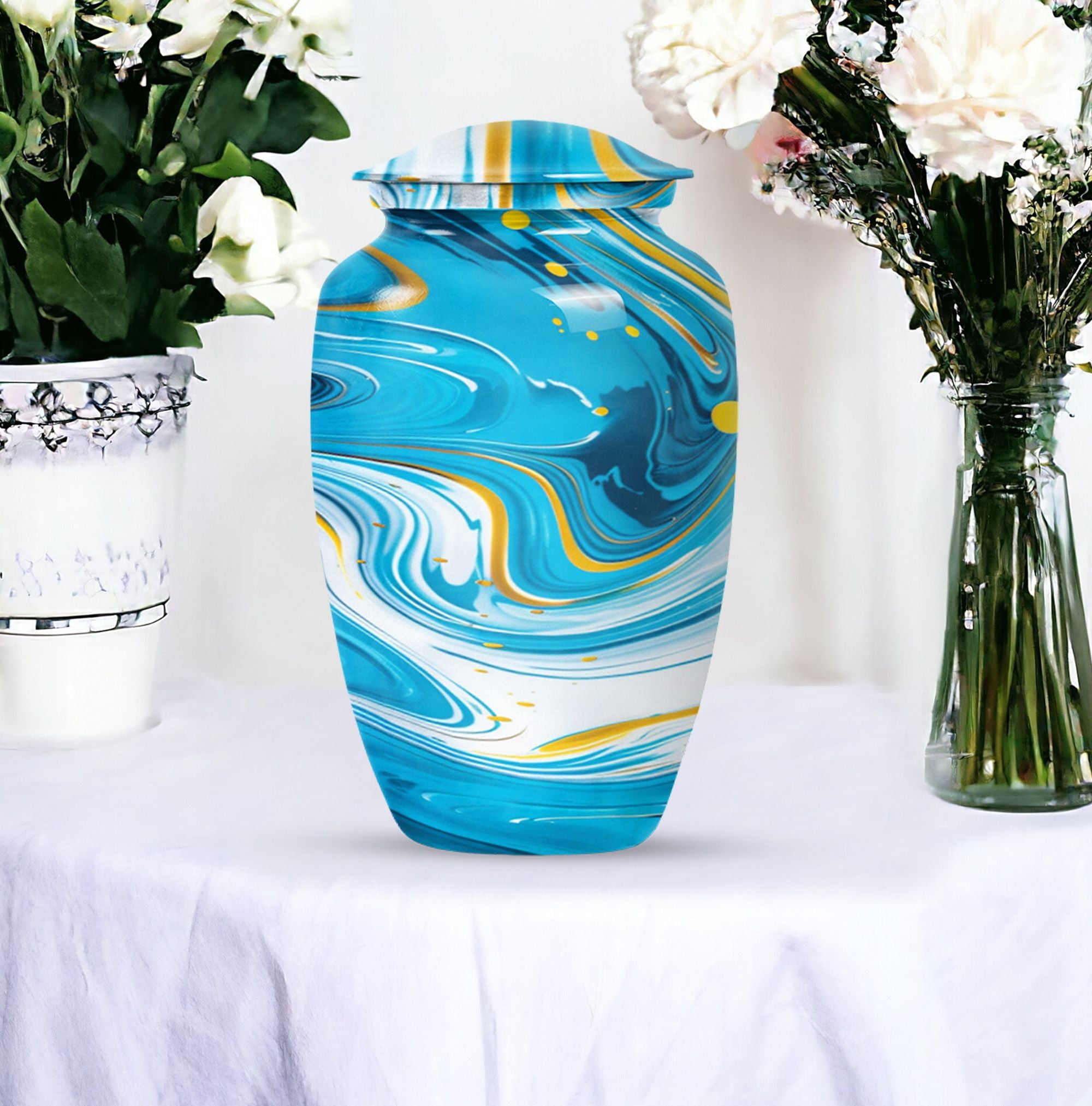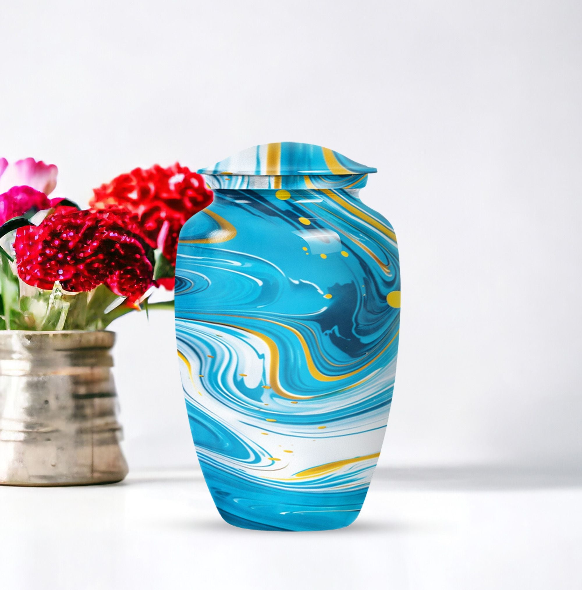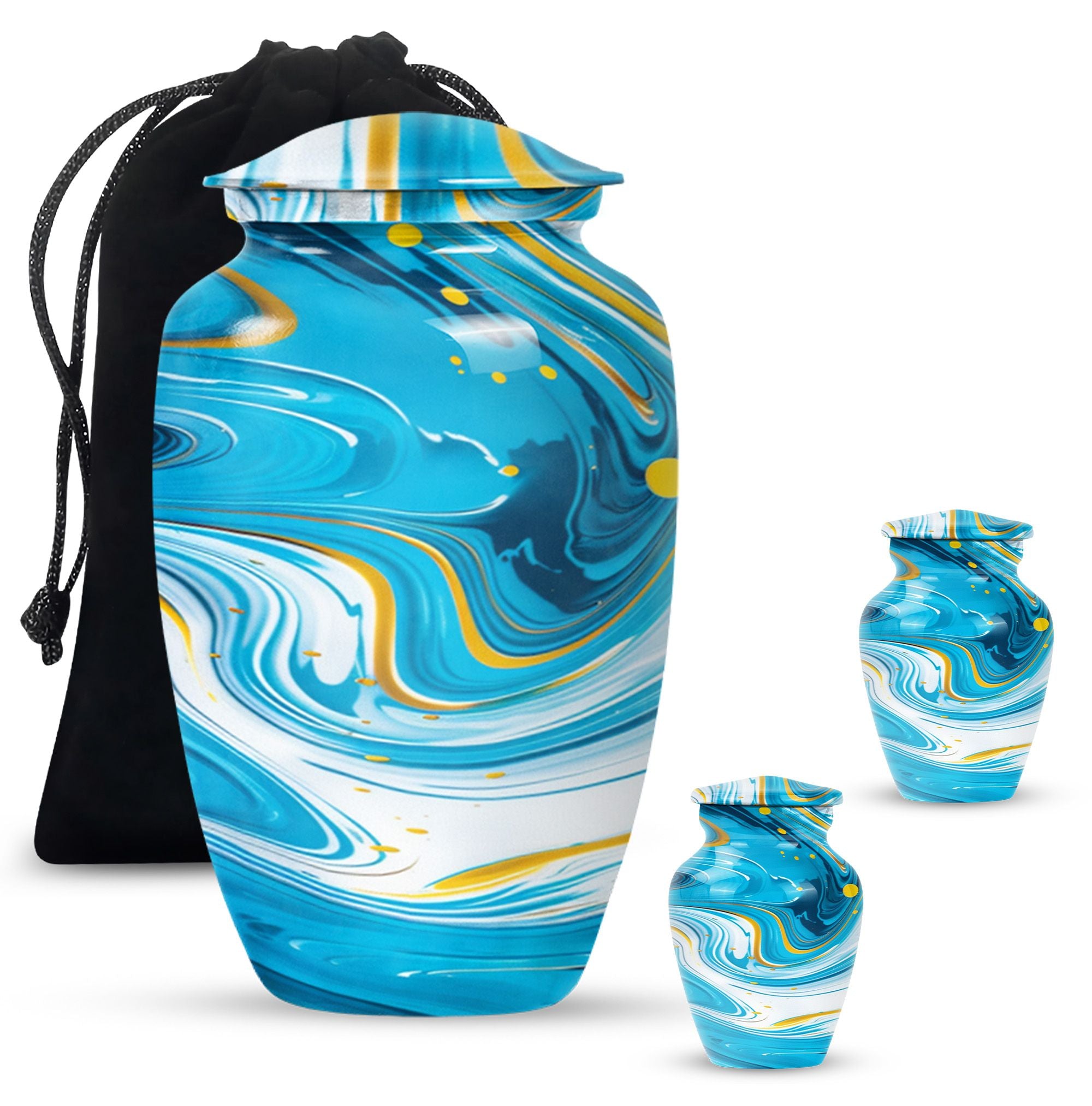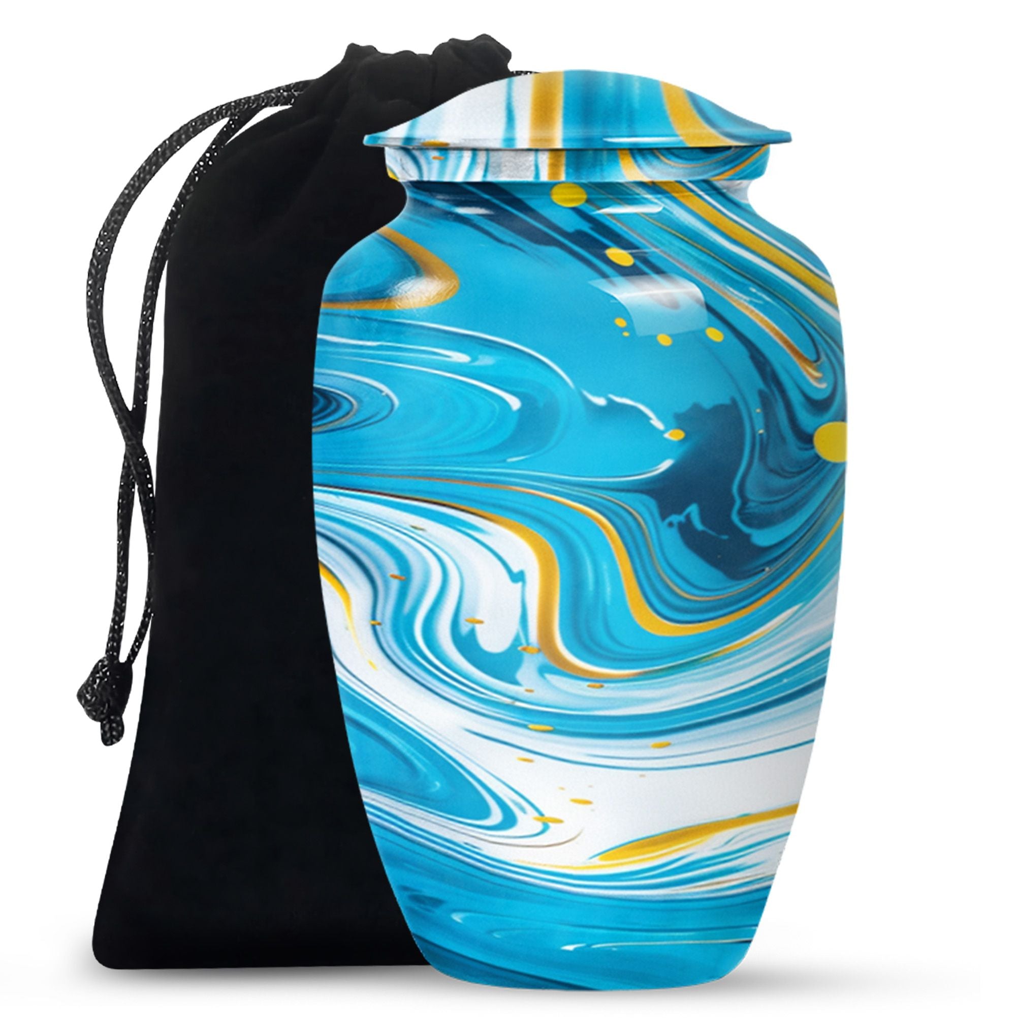 Immerse yourself in the deep spirituality and tranquillity that our 'Classic Urn' offers. As a work of art, it perfectly represents a distinctive and abstract theme. The Artistic Design Urn is handcrafted from top-notch aluminium, perfect for seniors and adults looking for cremation dad urn offerings. It’s a large urn with a size of 10 inches, demonstrating an impressive capacity of 200 cubic inches. With a moderate weight of just 3.3 pounds, this cremation urn is easy to handle. What makes it more unique is the possibility to personalize it with engraved names. Not just an urn, but it's your heartfelt tribute. The package comes with a velvet pouch, providing discreet containment for ashes. Experience the affordable urns that magically combine minimalism, luxury, and deep sentimental values. Please note: avoid limited to Burial urns for adult men ashes or human urns, explore our large urn in iridescent metal collection for a wider range of choices.