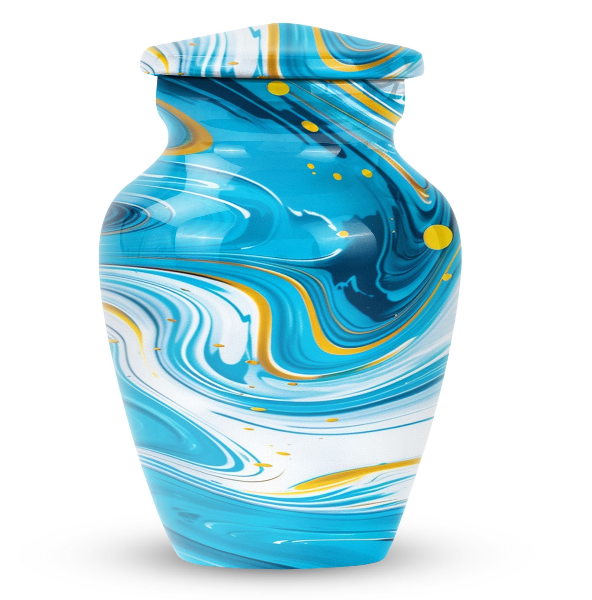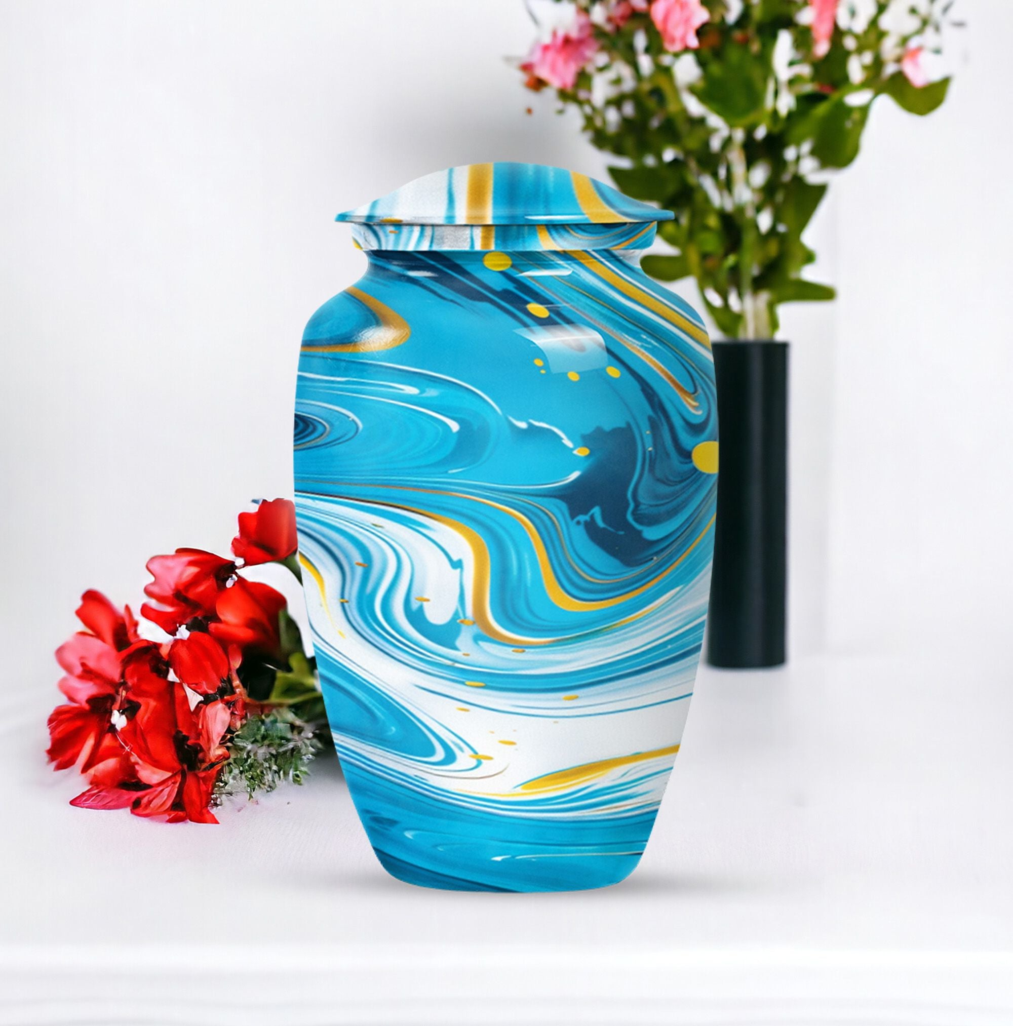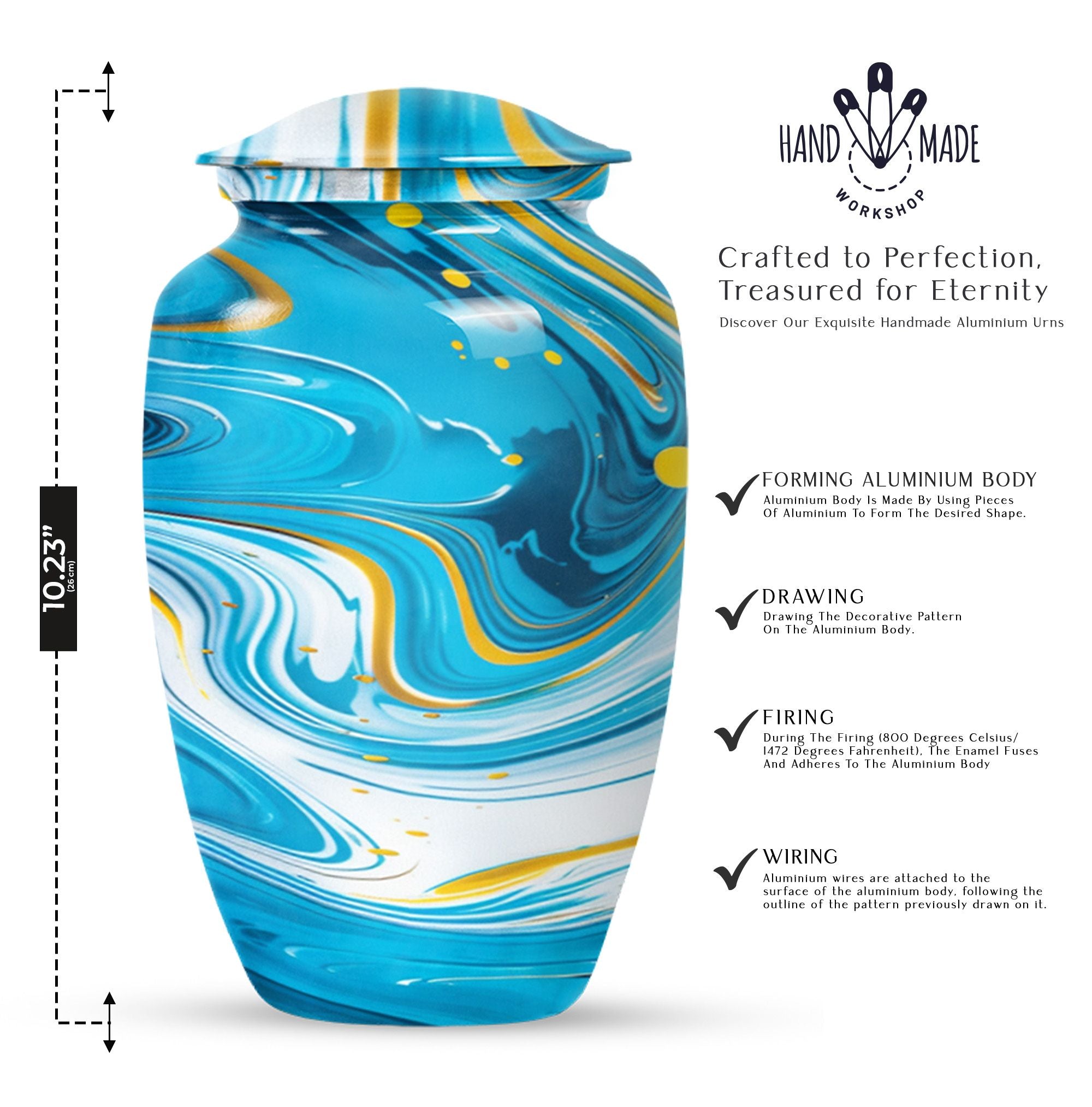 Immerse yourself in the deep spirituality and tranquillity that our 'Classic Urn' offers. As a work of art, it perfectly represents a distinctive and abstract theme. The Artistic Design Urn is handcrafted from top-notch aluminium, perfect for seniors and adults looking for cremation dad urn offerings. It’s a large urn with a size of 10 inches, demonstrating an impressive capacity of 200 cubic inches. With a moderate weight of just 3.3 pounds, this cremation urn is easy to handle. What makes it more unique is the possibility to personalize it with engraved names. Not just an urn, but it's your heartfelt tribute. The package comes with a velvet pouch, providing discreet containment for ashes. Experience the affordable urns that magically combine minimalism, luxury, and deep sentimental values. Please note: avoid limited to Burial urns for adult men ashes or human urns, explore our large urn in iridescent metal collection for a wider range of choices.