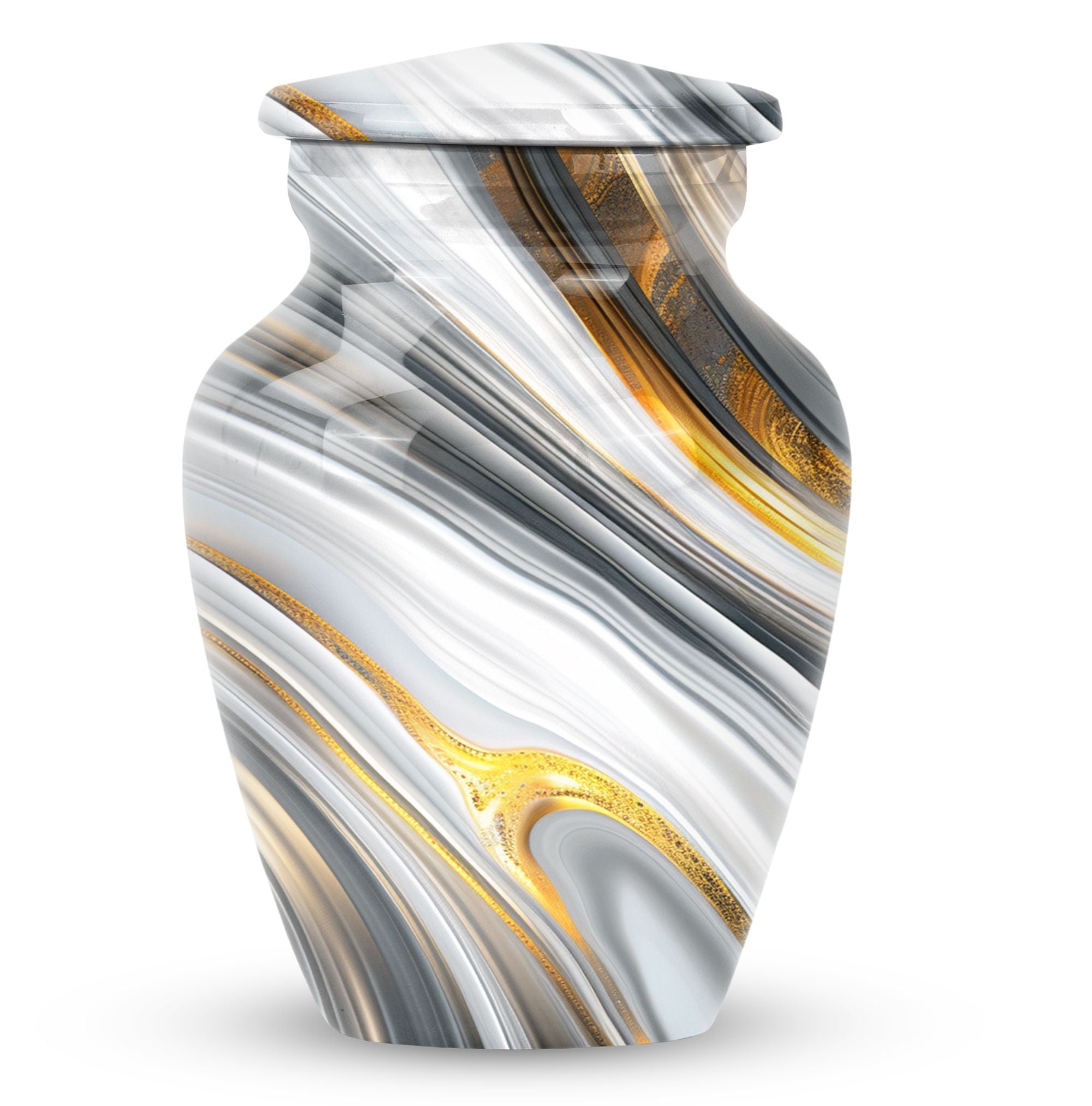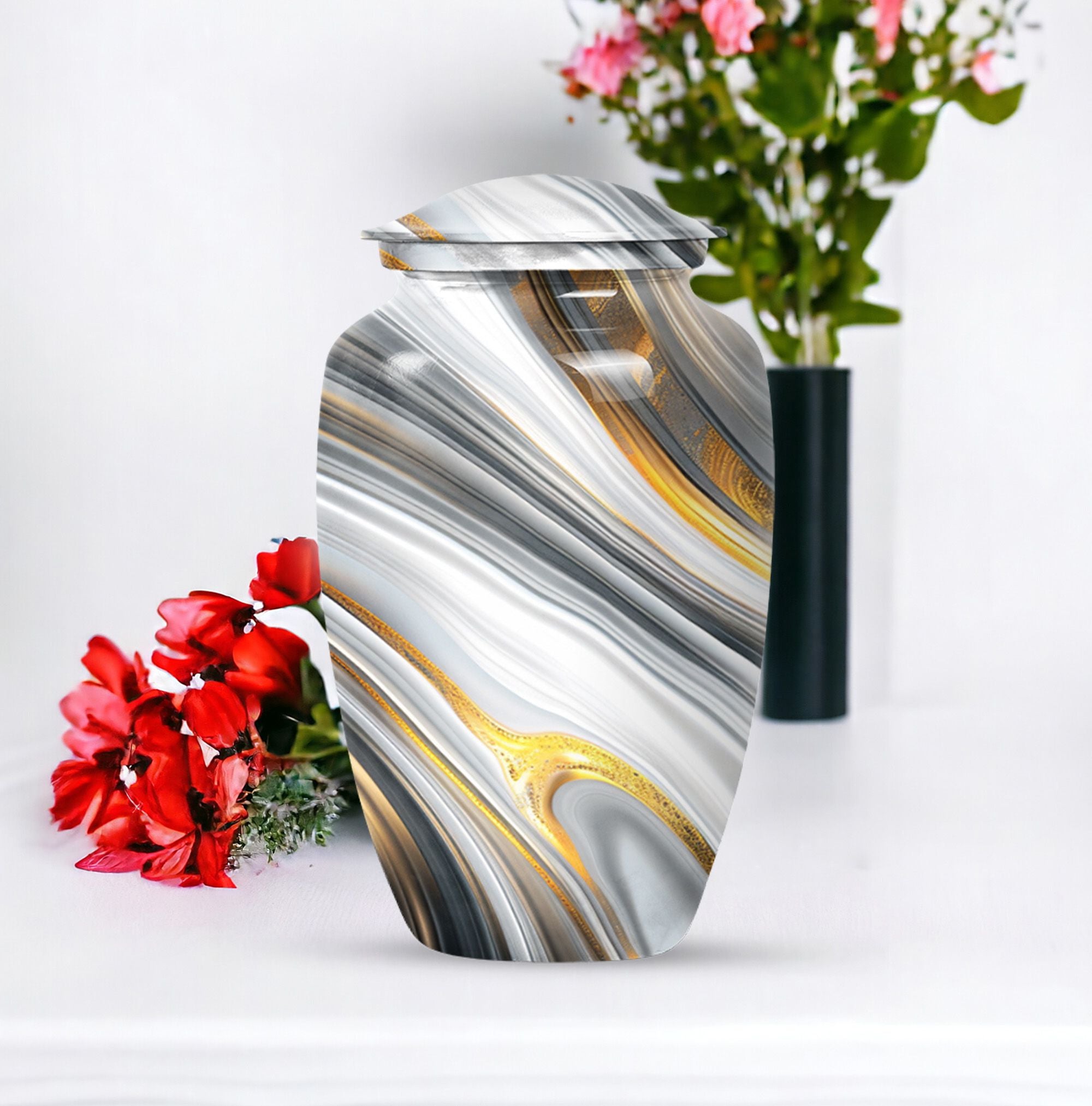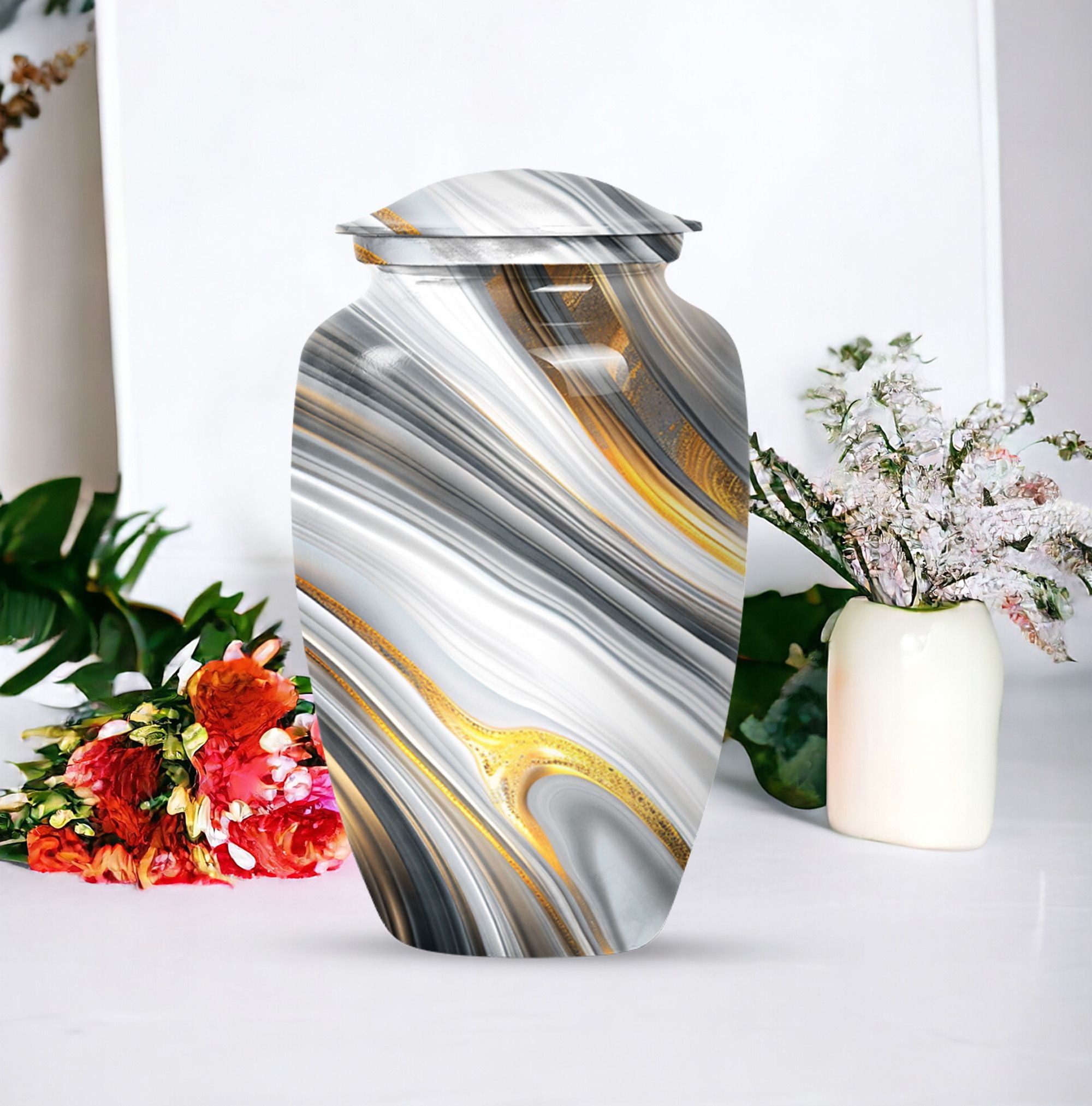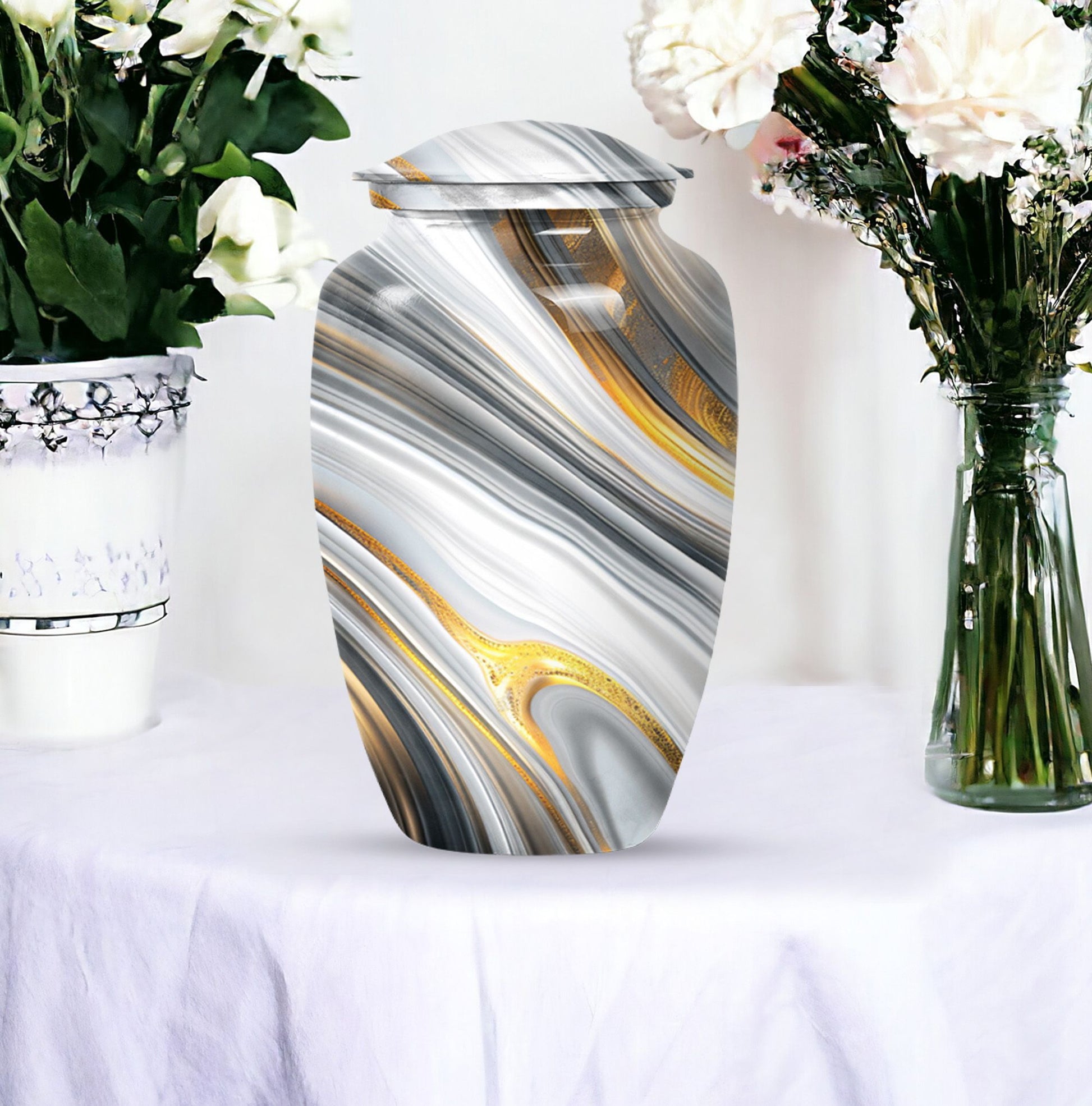 Pay your respects to a cherished one with the captivating and Abstract-themed 'Classic Urn'—a splendid piece of Artistic Design Urn offering a creative fusion of art, culture, and reverence. Emanating a sense of tranquility and calm, this Large Aluminium Urn, comfortable at a wieldable weight of 3.3 pounds, stands grand at 10 inches tall. Its carefully crafted dimensions provide a plentiful capacity of 200 cubic inches, making it an ideal resting place for adult ashes. Complementing its captivating appeal, the urn enables personalized customizations, allowing engraved names for a more intimate remembrance. The urn package comes with a luxurious velvet pouch, ensuring an elegant containment for the memorial ashes. With keywords like 'Elegant urns', 'Funeral urn for men's ashes', and 'adult ashes men', the urn is easy to discover for your refined search. This memorial urn merges aesthetics and memories, presenting a loving homage with unparallel dignity.