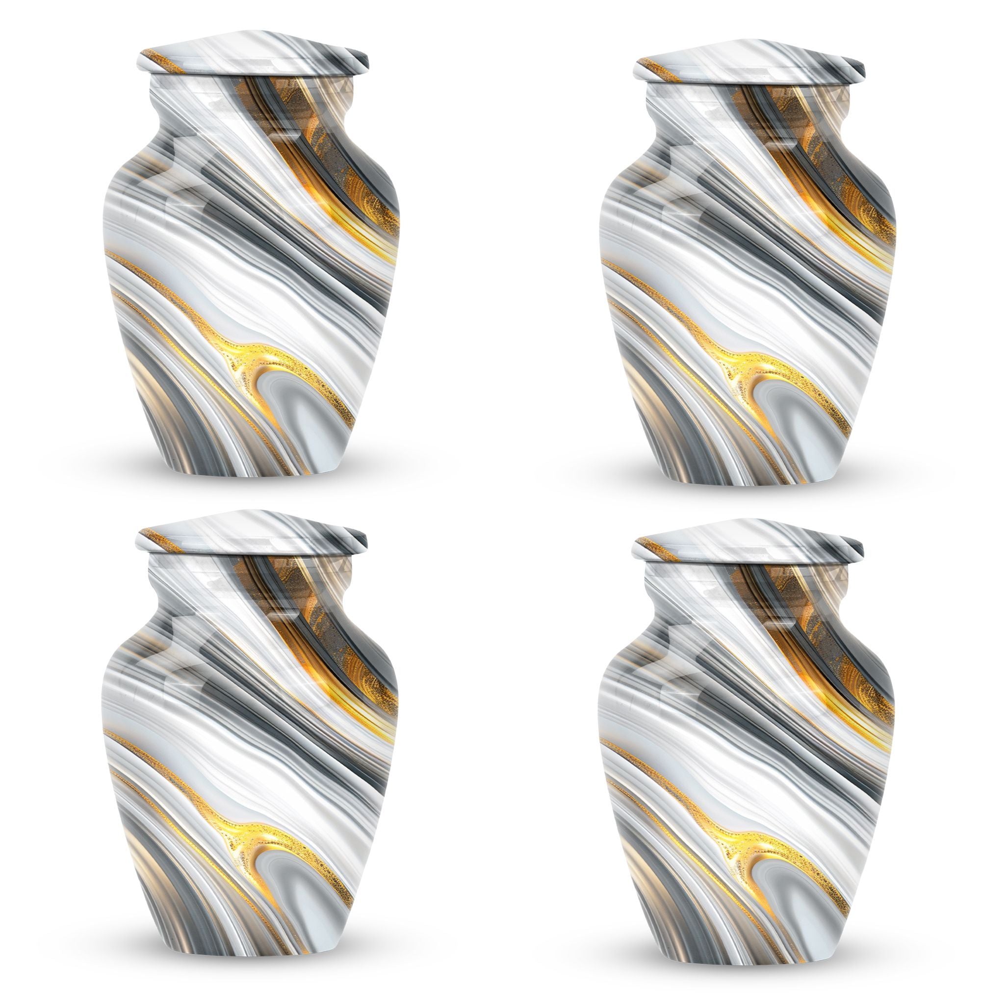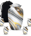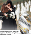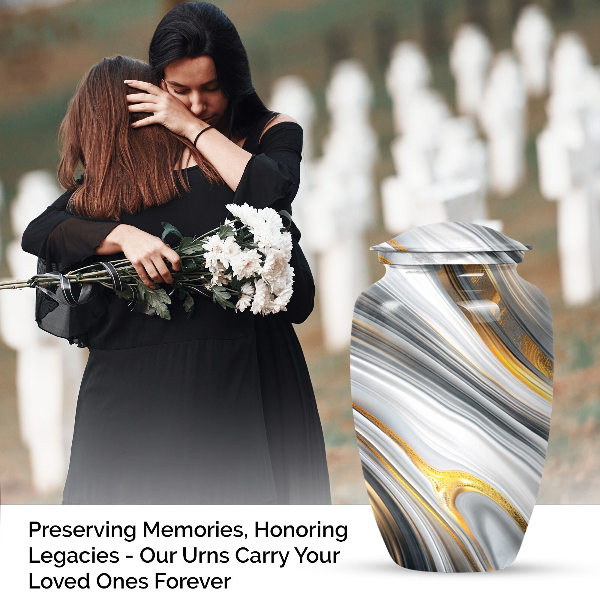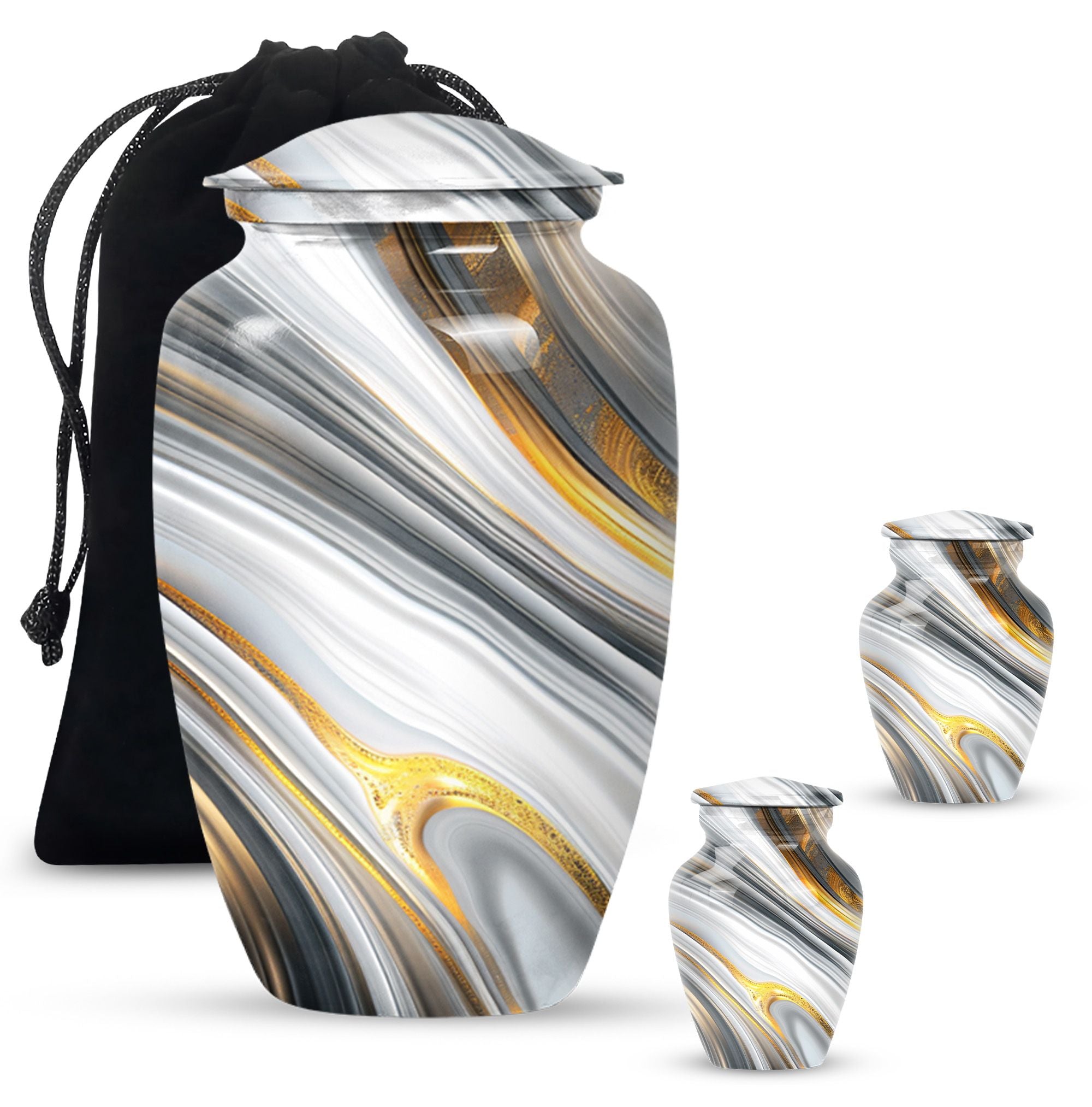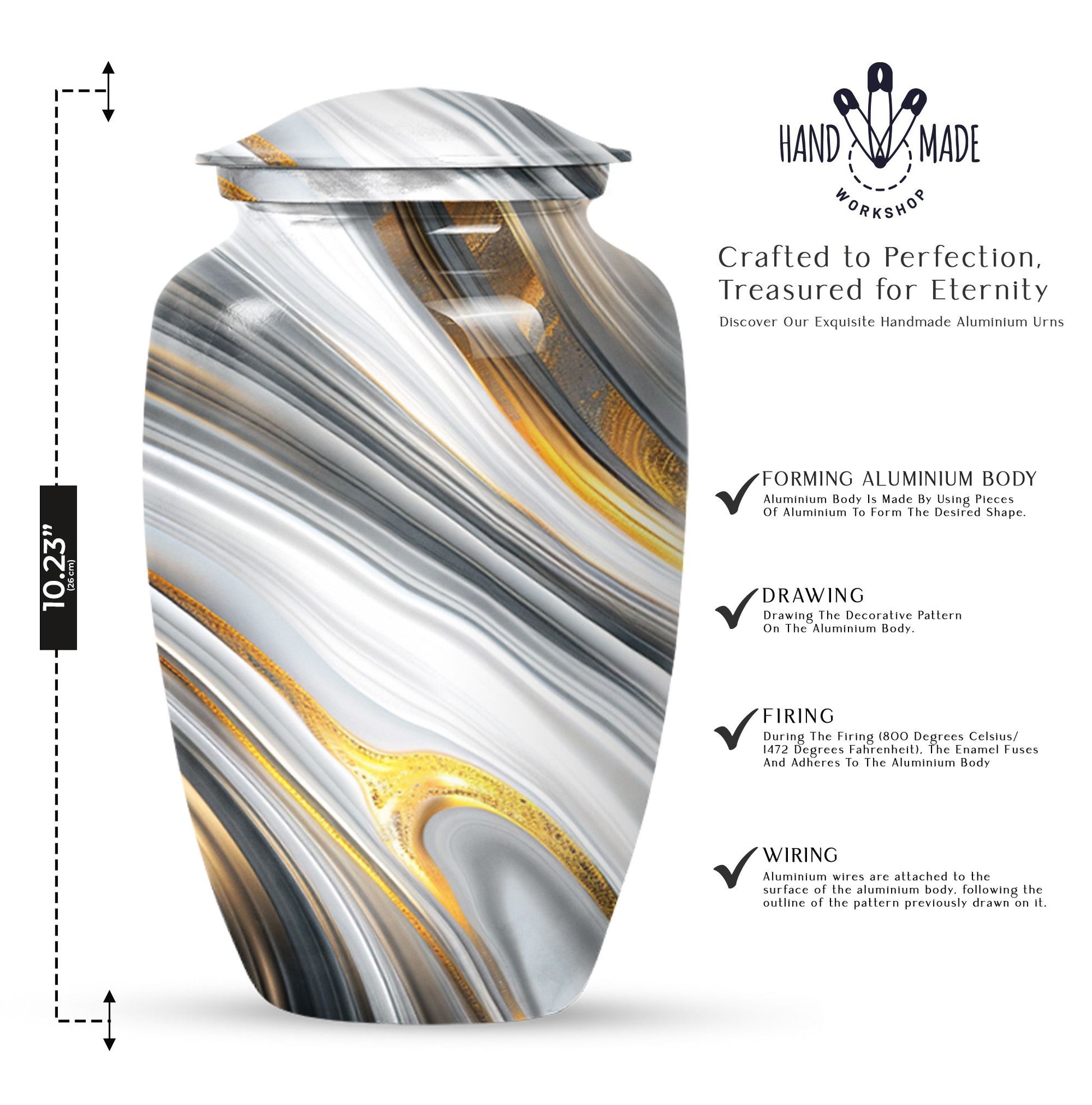 Pay your respects to a cherished one with the captivating and Abstract-themed 'Classic Urn'—a splendid piece of Artistic Design Urn offering a creative fusion of art, culture, and reverence. Emanating a sense of tranquility and calm, this Large Aluminium Urn, comfortable at a wieldable weight of 3.3 pounds, stands grand at 10 inches tall. Its carefully crafted dimensions provide a plentiful capacity of 200 cubic inches, making it an ideal resting place for adult ashes. Complementing its captivating appeal, the urn enables personalized customizations, allowing engraved names for a more intimate remembrance. The urn package comes with a luxurious velvet pouch, ensuring an elegant containment for the memorial ashes. With keywords like 'Elegant urns', 'Funeral urn for men's ashes', and 'adult ashes men', the urn is easy to discover for your refined search. This memorial urn merges aesthetics and memories, presenting a loving homage with unparallel dignity.