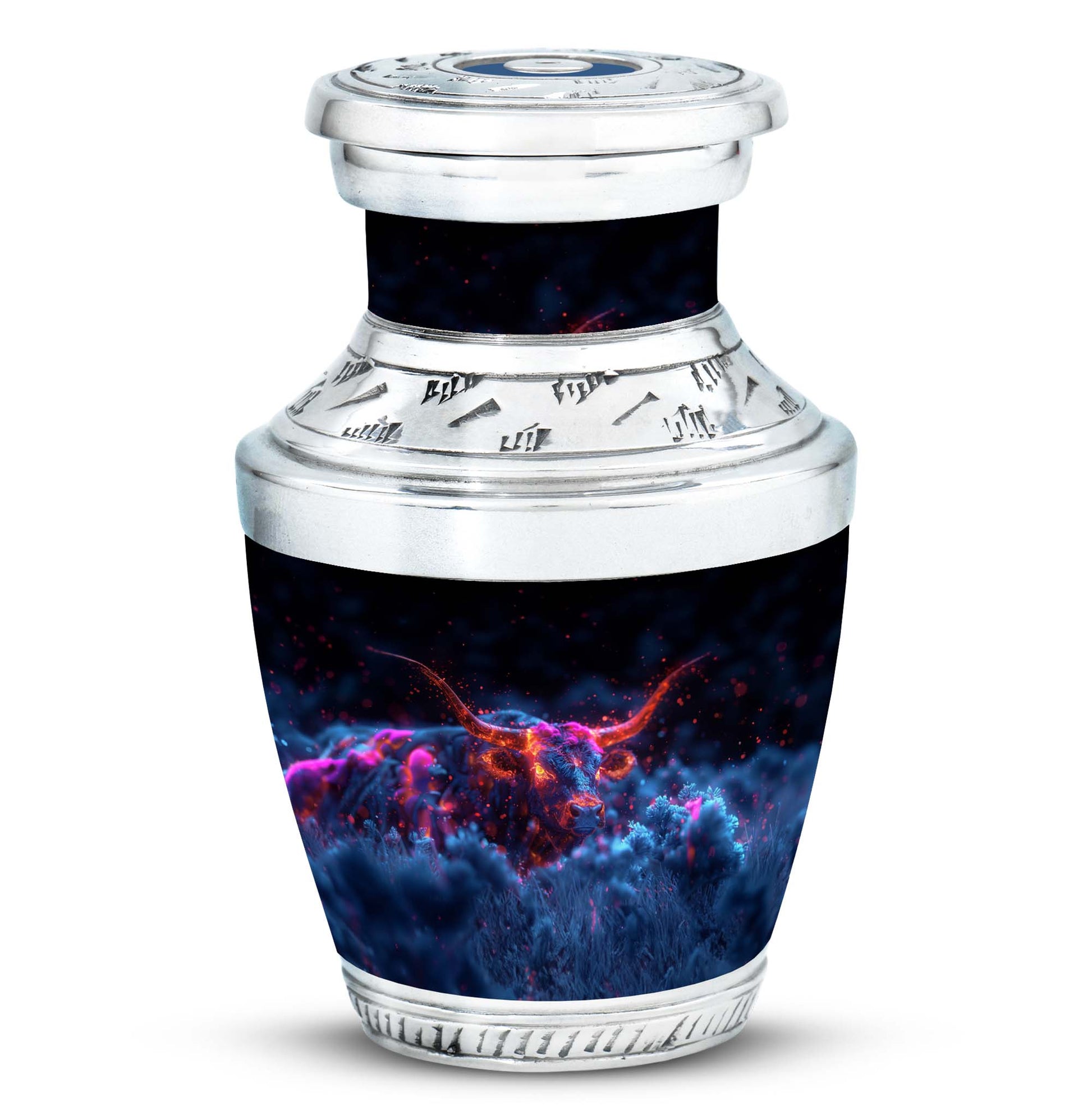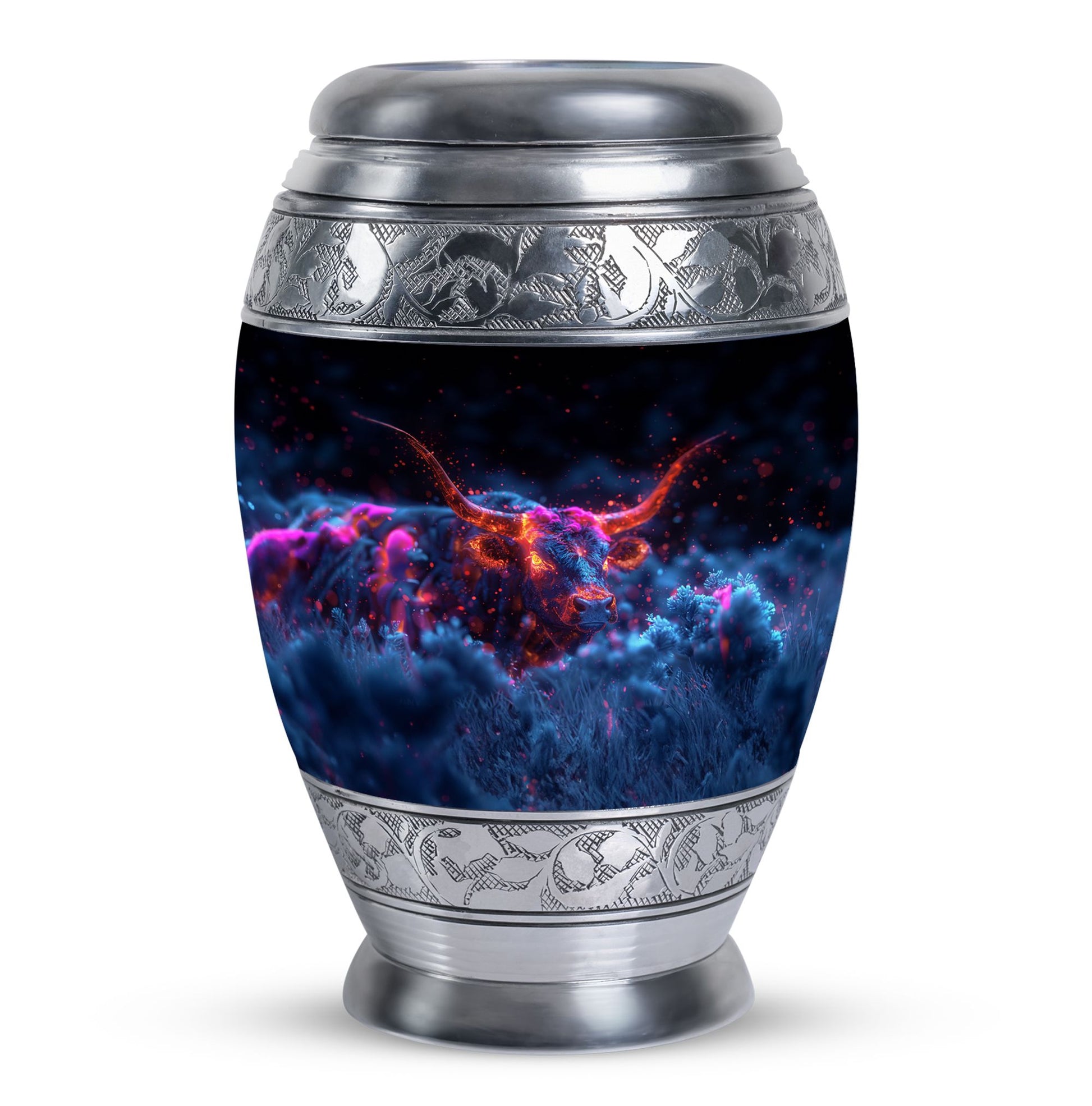Handcrafted with precision from premium aluminum, this urn showcases exquisite artistry and durability. Its sleek metallic finish and intricate bull motif make it ideal for those seeking large decorative urn or funeral urns for human ashes adult. The secure screw-top lid ensures ashes are safely preserved, while the spacious interior offers ample capacity, making it a dignified large urn for human ashes. Whether placed at home or used for memorial services, it embodies elegance and reverence.