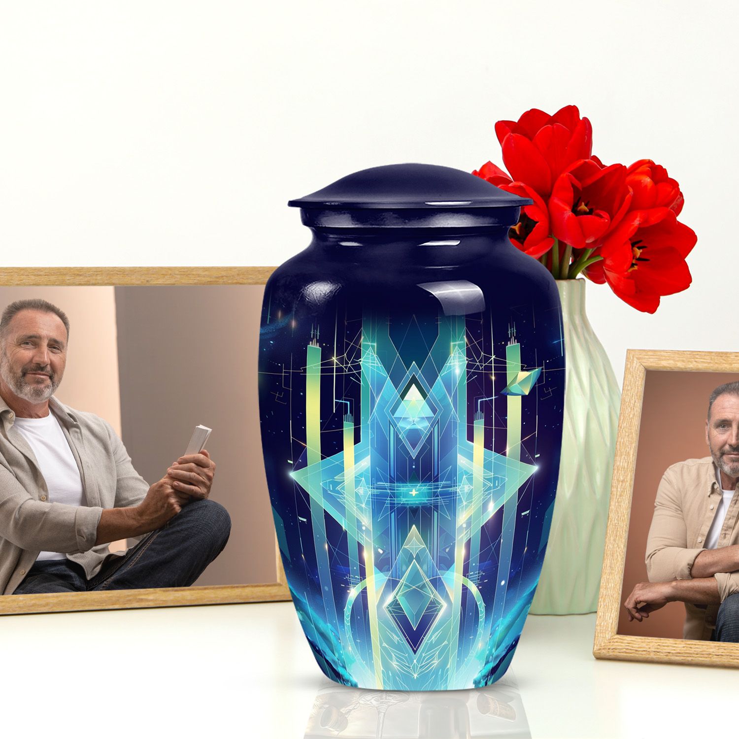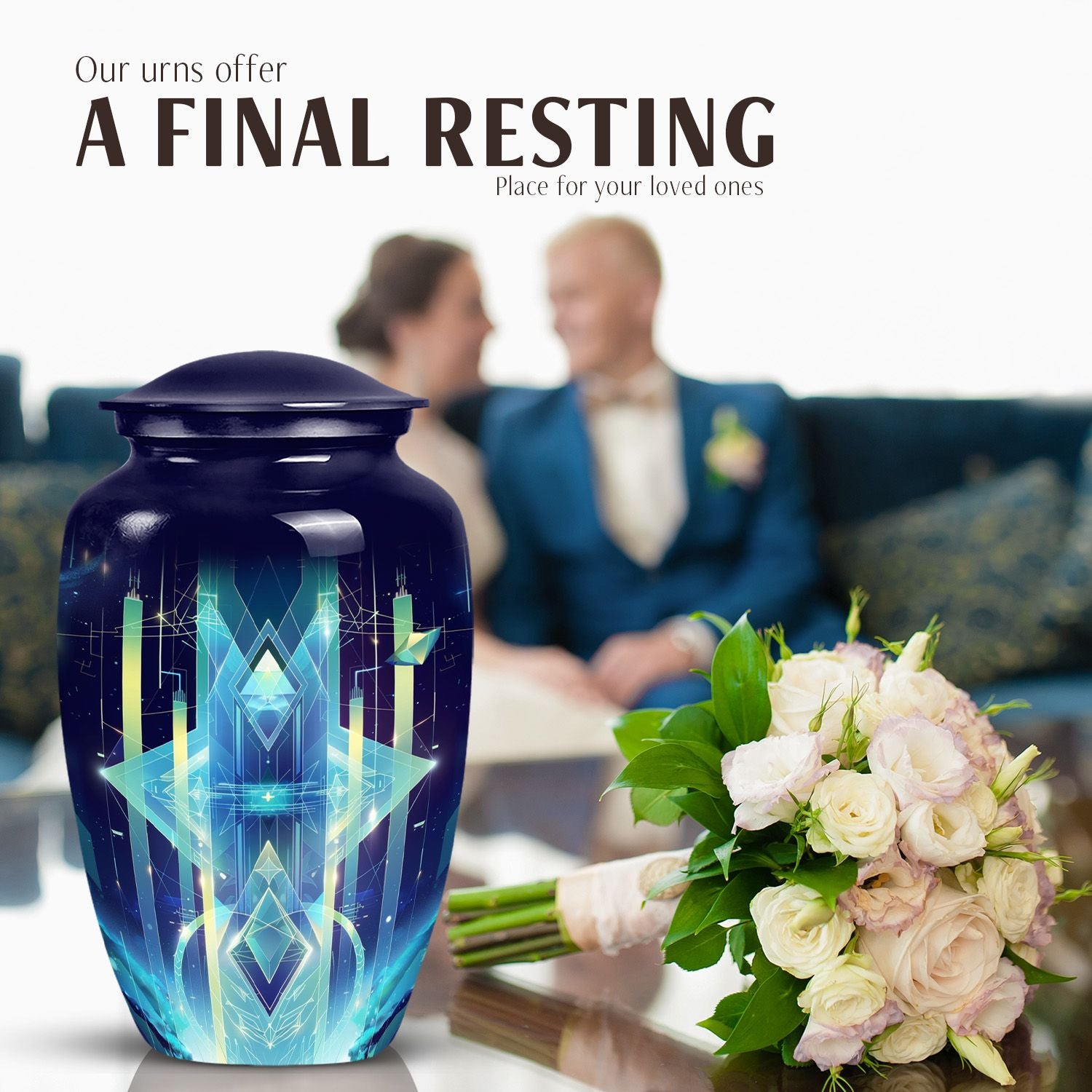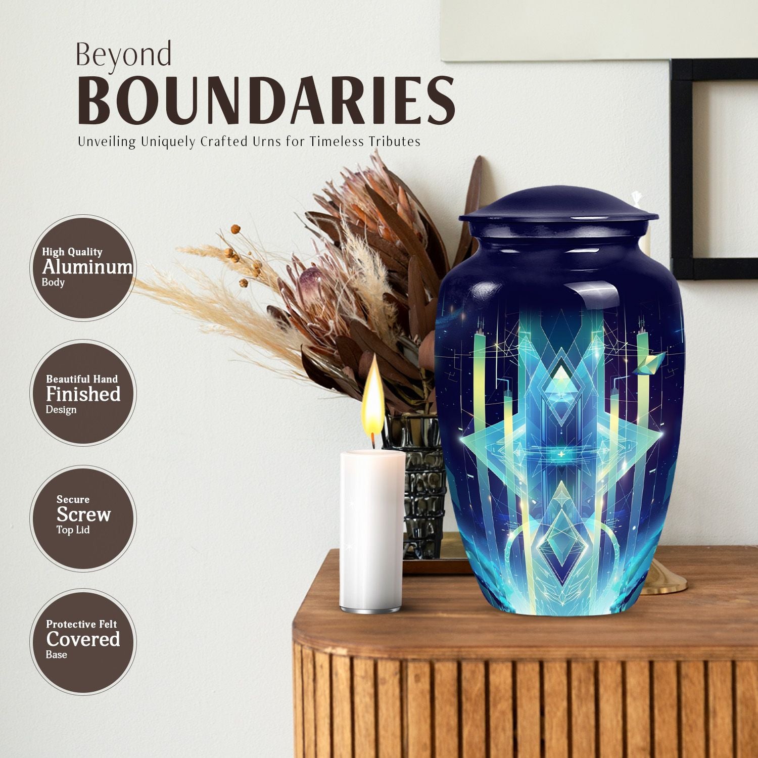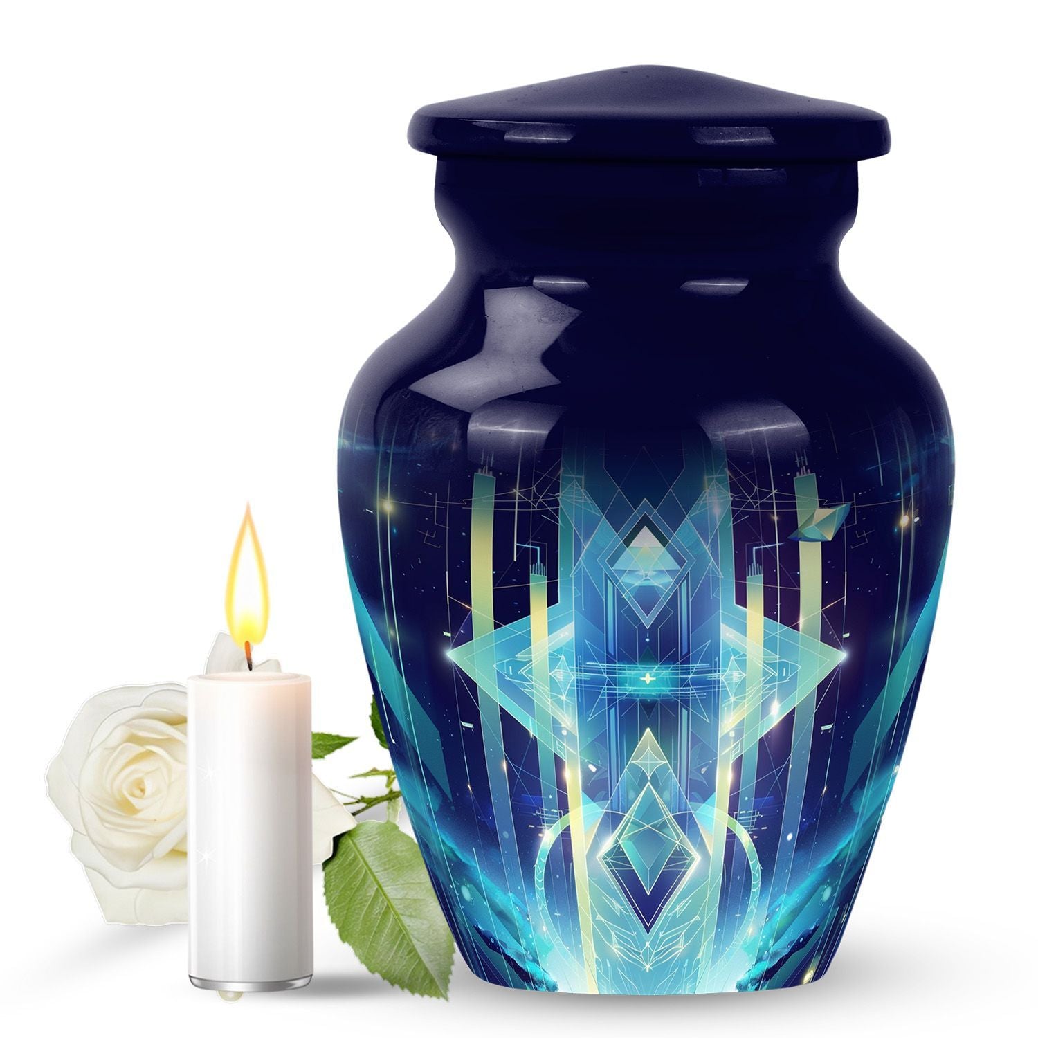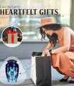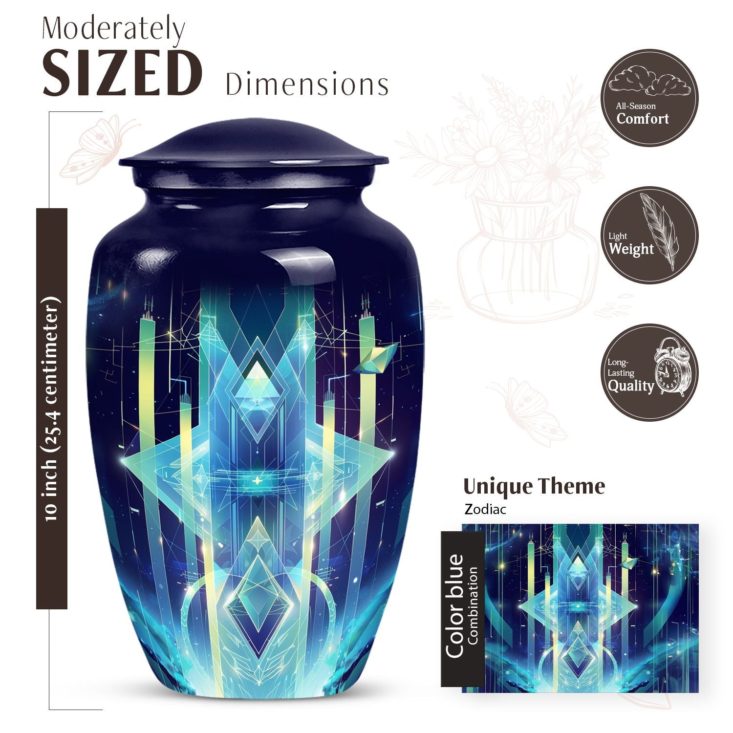Transform the way you honor your loved ones with our meticulously crafted 10-inch Zodiac Urn. Made from high-quality aluminium and embodying an abstract theme, this cremation urn serves as a timeless tribute and an elegant home for your loved one's ashes. Weighing a solid 3.3 pounds and standing 10 inches tall, this large urn impeccably merges durability with a classic aesthetic. It also has an impressive capacity of 200 cubic inches, ensuring ample space for the remains. Additionally, our zodiac urn comes with a velvet pouch for an added layer of protection and discreet containment of the ashes. For an intimate touch, choose our personalization option and have names finely engraved on the urn. Not just another burial urn, ours celebrates life and love in the most personal and profound way. Keep in mind, our cremation urn isn't just a material item, it's a vessel that holds precious memories, making it a profound purchase rather than a common consumer product. Whether for funeral or burial purposes, consider our zodiac urn—an iridescent metal symbol of love and respect.