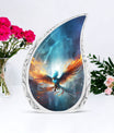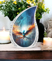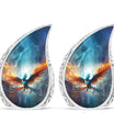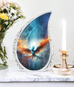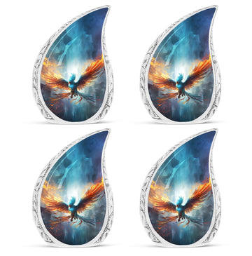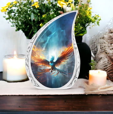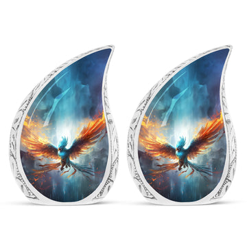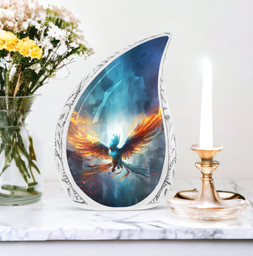 Honour the memory of your loved ones with our Blue Phoenix Cremation Urn. Specifically intended for adults, this large urn represents the epitome of classic design in the category of memorial urns, ensuring dignity while beautifully safekeeping precious earthly remains. Fabricated from high-quality Aluminium, the urn weighs 3.3 pounds and stands at 10 inches in height, offering a generous capacity of 200 cubic inches. As a tangible sign of remembrance, it's sized ideally at 3 inches. The package comes complete with a delicate velvet pouch, optimally suited for the safe containment of ashes, enhancing the sanctity of this vital memorial item. Further, we offer the ability to personalize your cremation urn with engraved names, making each urn as unique as the life it commemorates. This urn is more than an ashes holder; it can serve as a decorative urn, blending seamlessly with your home decor. Treasure the memories of your loved ones in an enduring and profound manner with these blue phoenix urns for mom's ashes or celebratory decorative urns for human ashes.