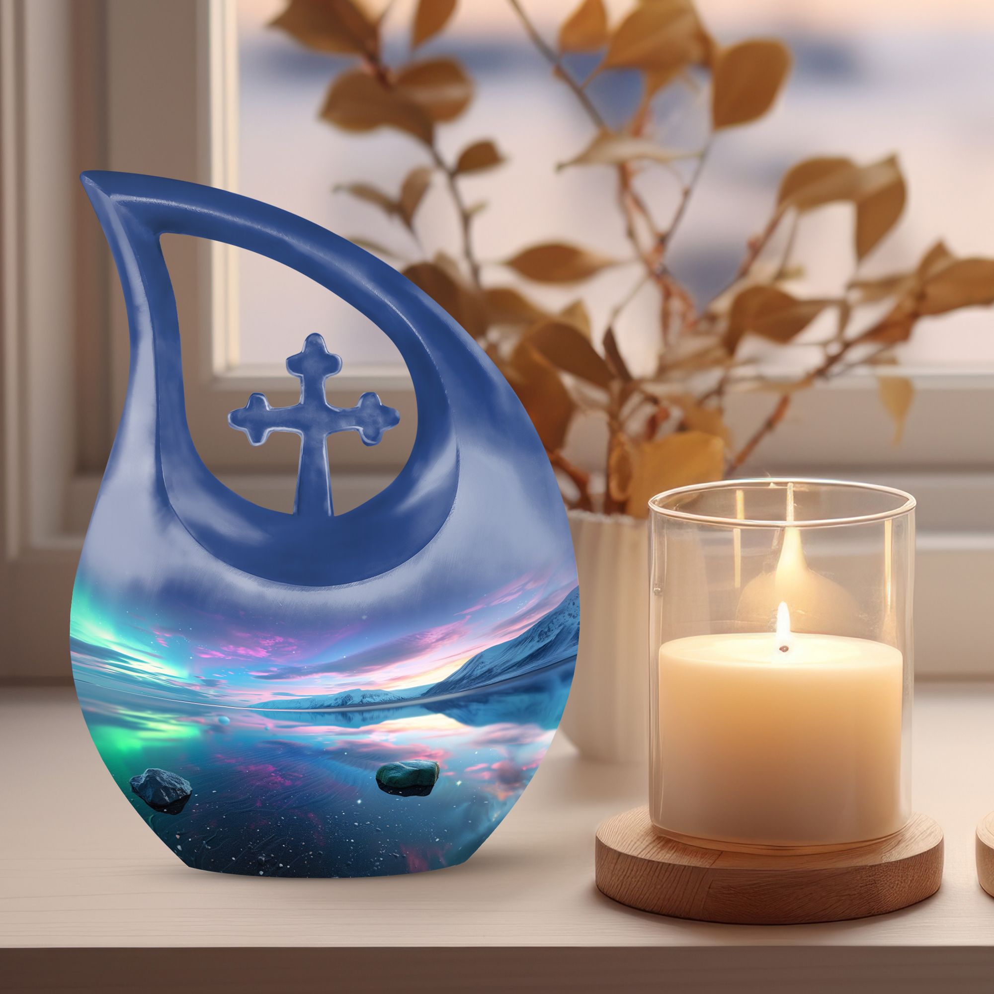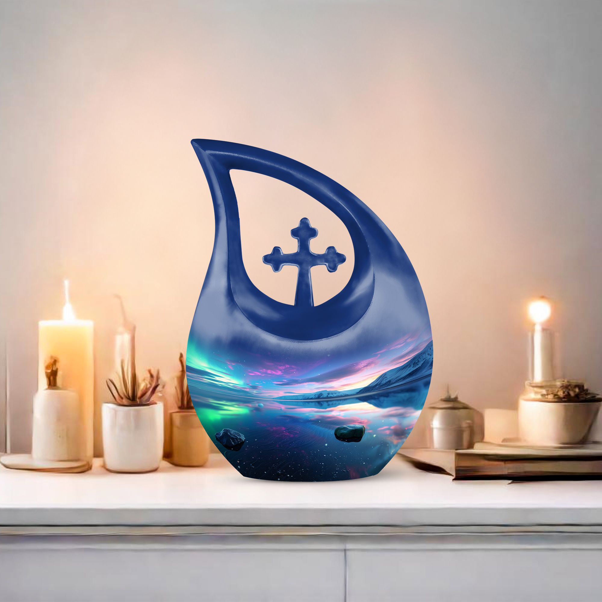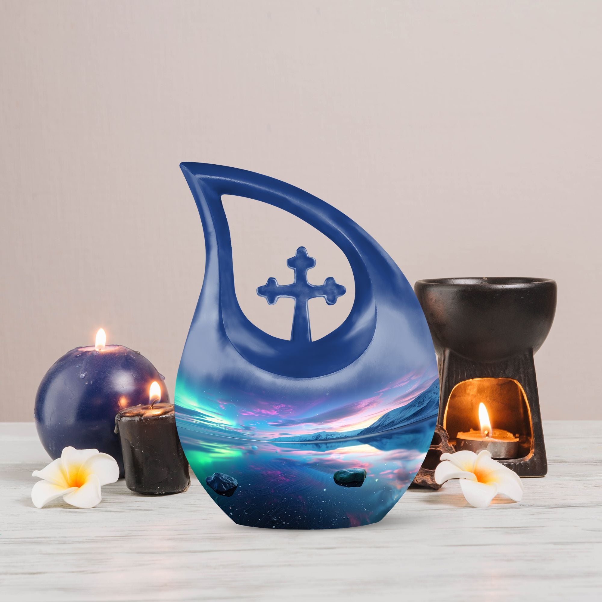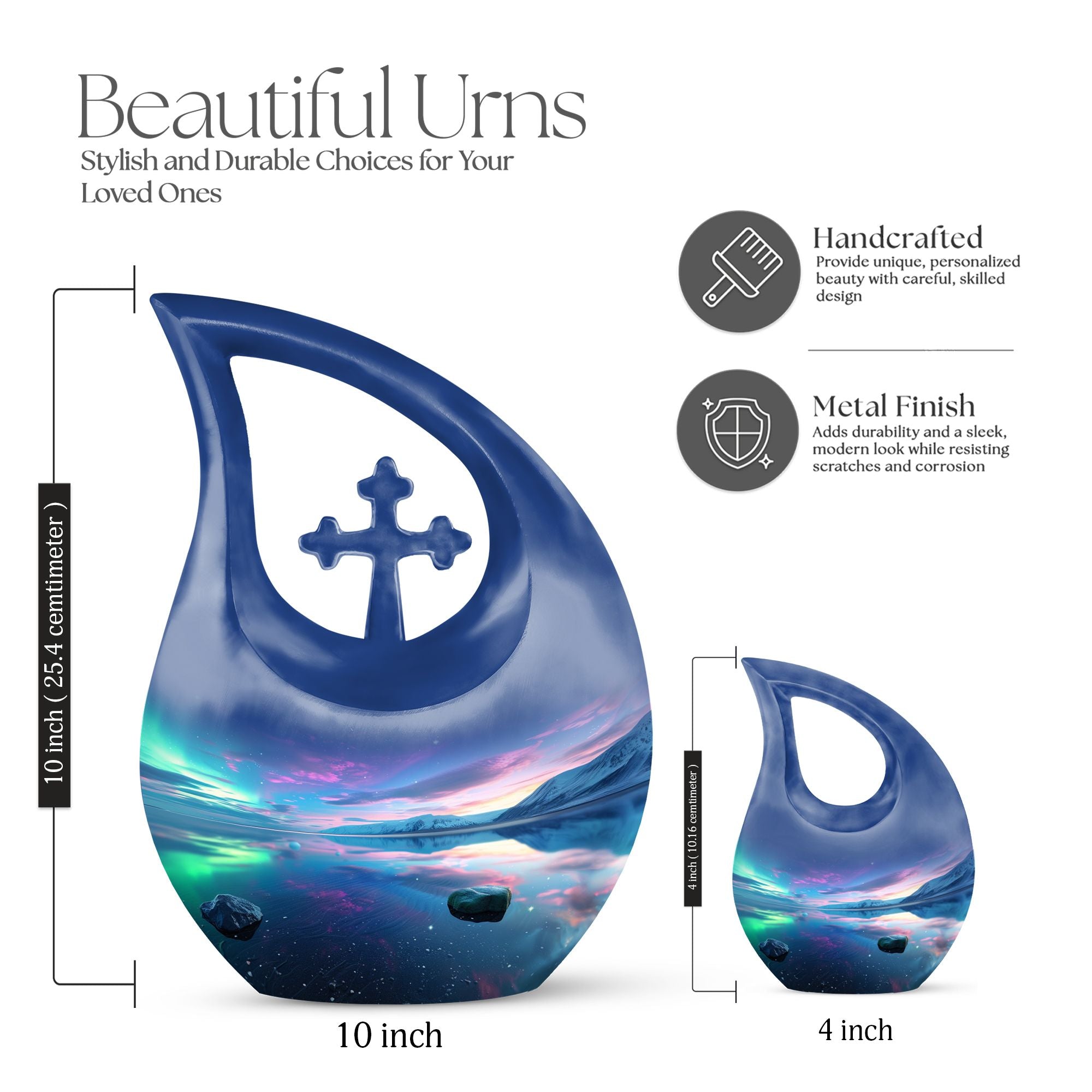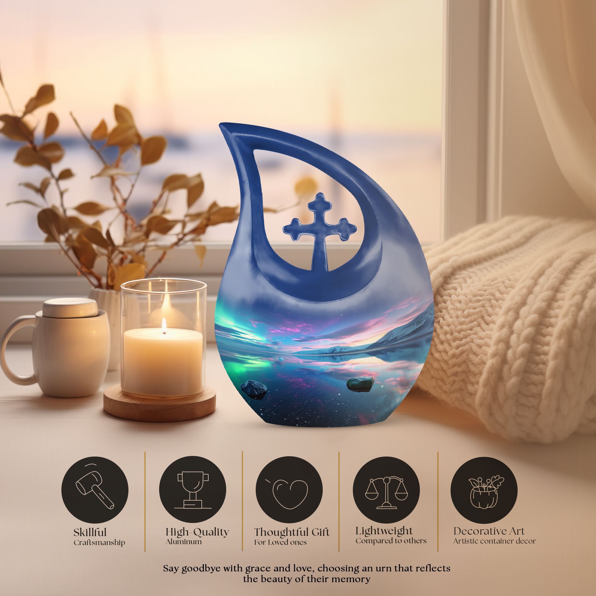 Find eternal tranquillity with our exceptional Arora Borealis Memorial Urn, riveting homage to your loved ones. In an uncommon 'Cross Drop' design, this stunning 10-inch urn crafted from durable aluminium material, radiates an ethereal ambience. Weighing just 3.3 pounds, the urn is efficient to hold up to 200 cubic inches of ashes, offering a large capacity for remembrance. Not just a symbolic piece, its design authentically reflects the notion of love and remembrance. Comes with a fine velvet pouch for containment of ashes, adding an extra layer of respect and preservation. The unique, radiant Arora Borealis theme befits every devoted ceremony. Furthermore, you can personalize this gem of a memorial urn with engraved names, infusing an intimate touch to your tribute. Let's honour the journey of life and love, remember with respect. Seek solace in our range offering distinct funeral urns, custom urns, and much more on our topnotch collection of memorial urns. A remarkable amalgamation of respect, design and personal touch.
