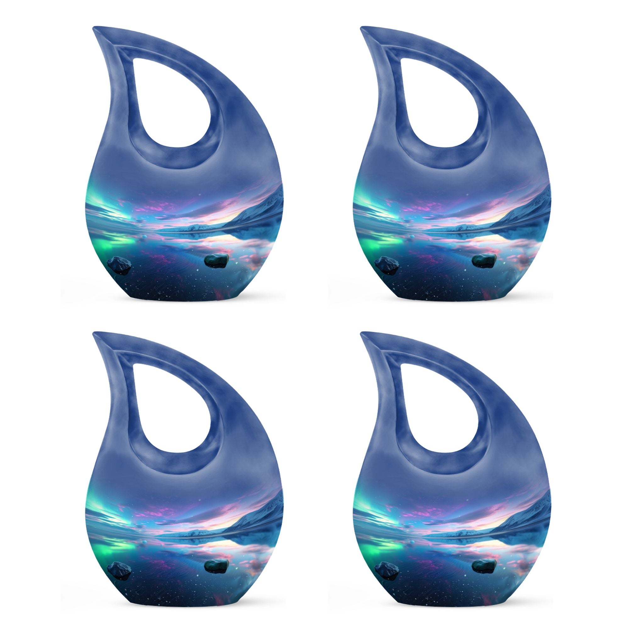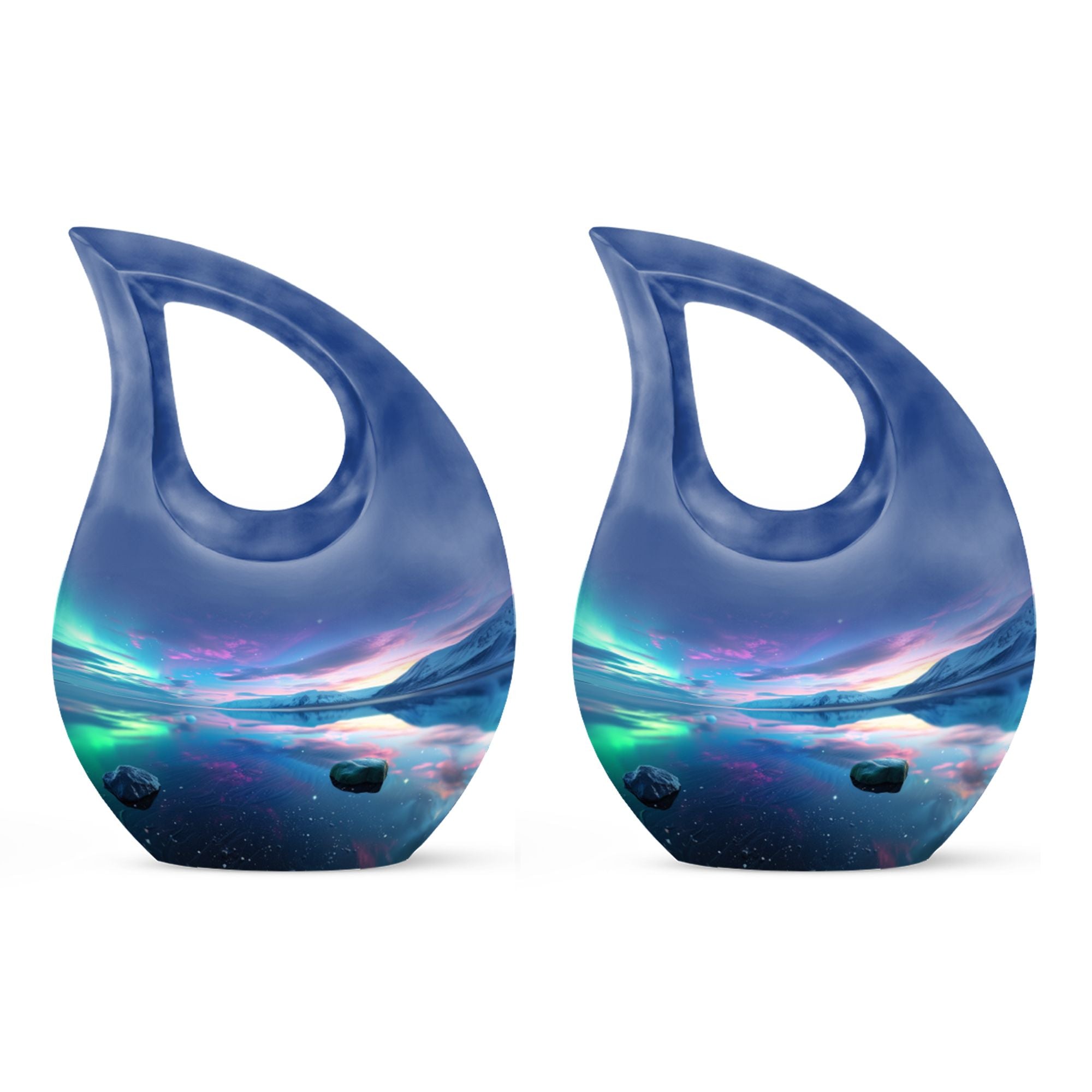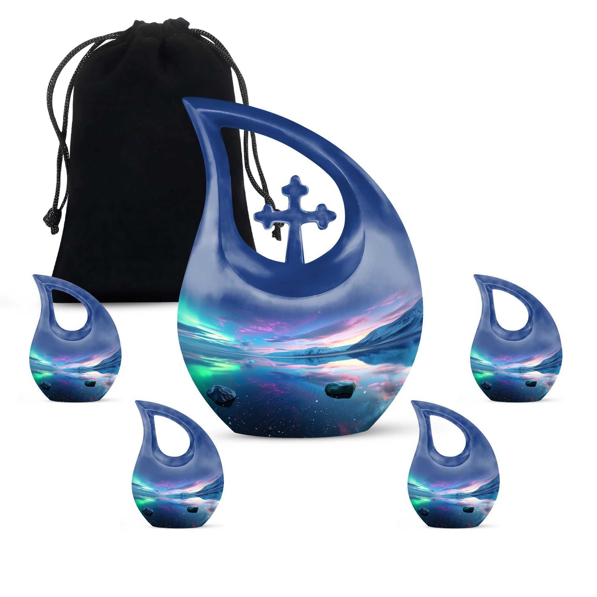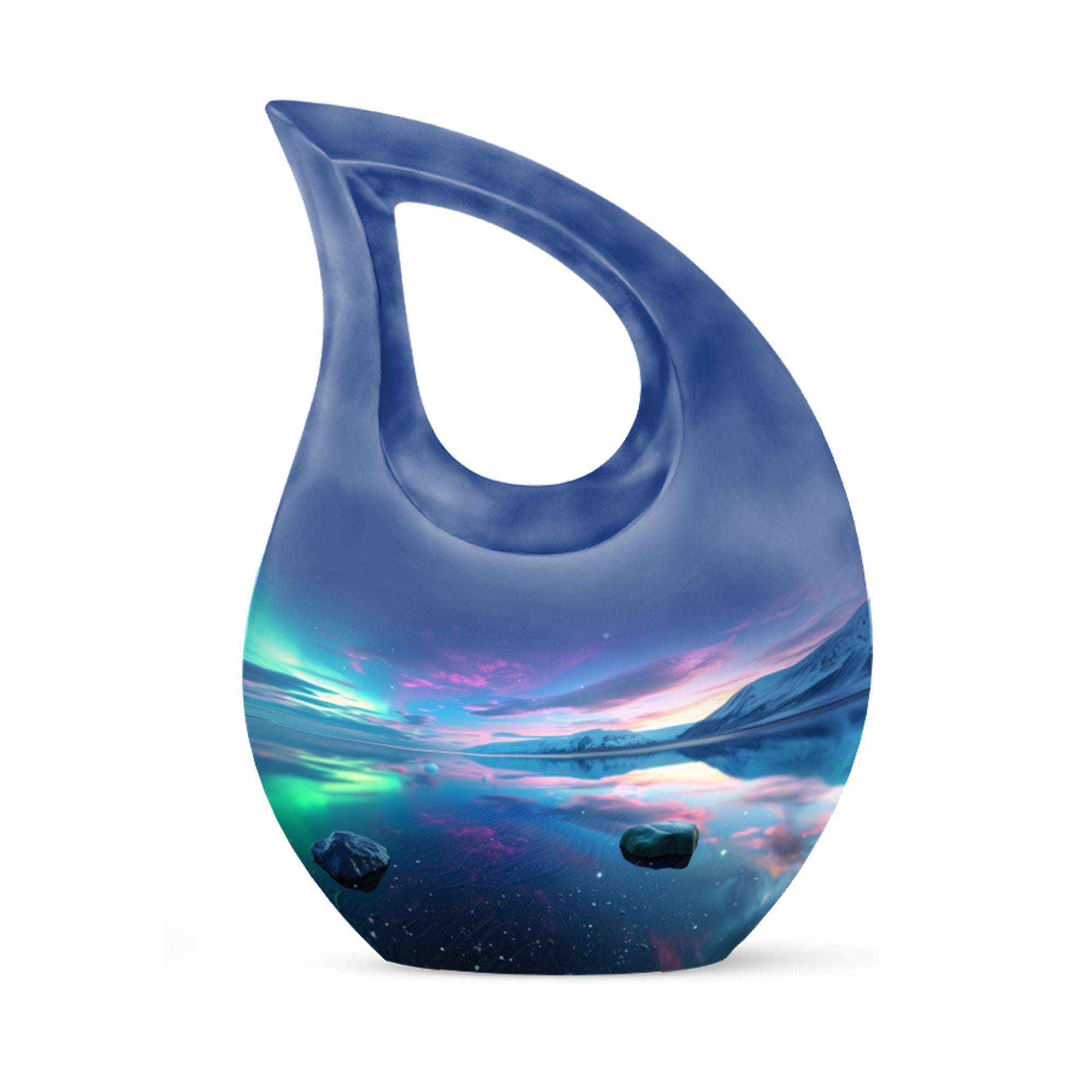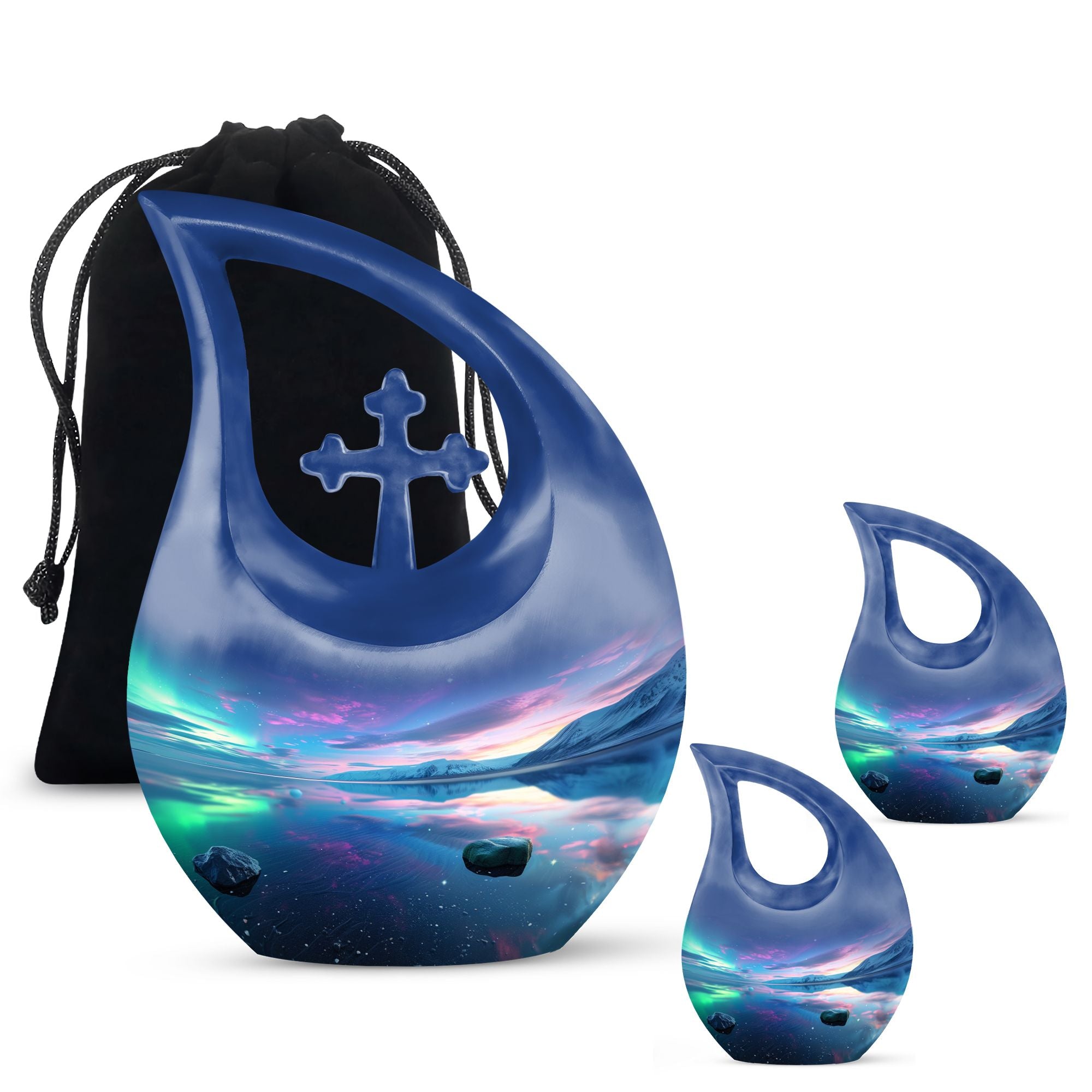 Find eternal tranquillity with our exceptional Arora Borealis Memorial Urn, riveting homage to your loved ones. In an uncommon 'Cross Drop' design, this stunning 10-inch urn crafted from durable aluminium material, radiates an ethereal ambience. Weighing just 3.3 pounds, the urn is efficient to hold up to 200 cubic inches of ashes, offering a large capacity for remembrance. Not just a symbolic piece, its design authentically reflects the notion of love and remembrance. Comes with a fine velvet pouch for containment of ashes, adding an extra layer of respect and preservation. The unique, radiant Arora Borealis theme befits every devoted ceremony. Furthermore, you can personalize this gem of a memorial urn with engraved names, infusing an intimate touch to your tribute. Let's honour the journey of life and love, remember with respect. Seek solace in our range offering distinct funeral urns, custom urns, and much more on our topnotch collection of memorial urns. A remarkable amalgamation of respect, design and personal touch.