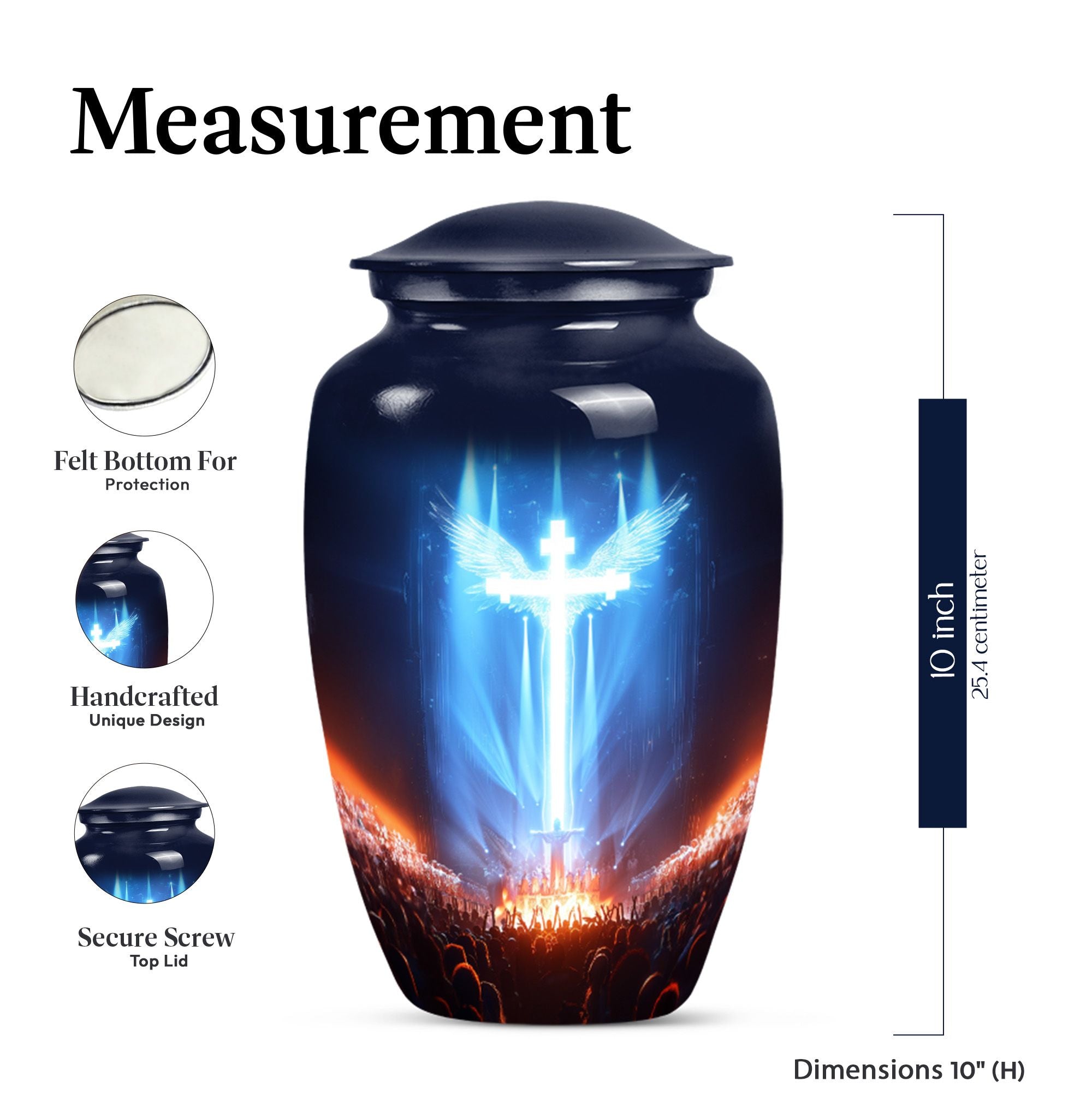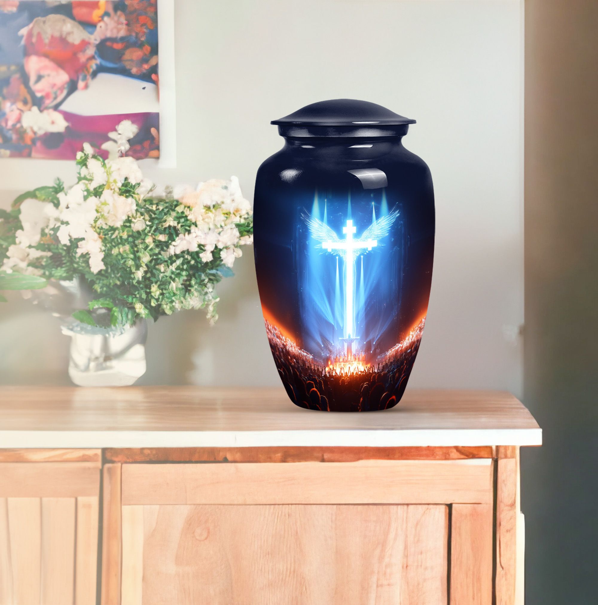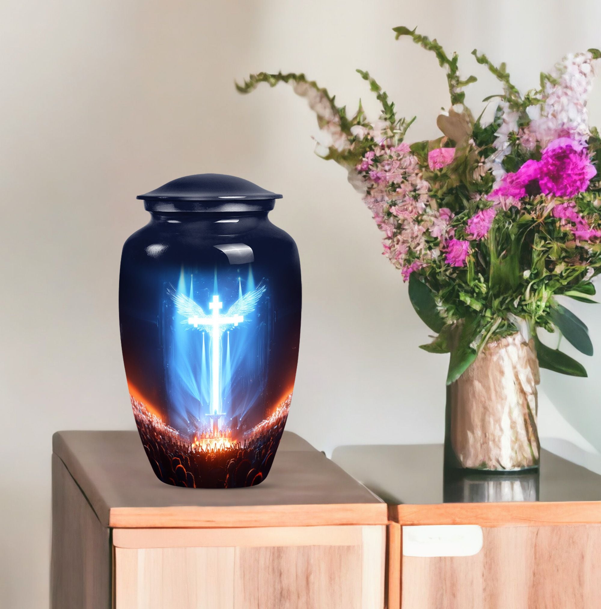 Witness the beauty of respect and honor radiated by this large, 10-inch cross urn, capturing the solemnity and honor of a memorial ceremony. Skilfully crafted from high-quality Aluminium, this funeral urn for human ashes flaunts an Aurora Borealis theme, adopting the majestic hues of the northern lights. Its robust construction ensures a durable weight of 3.3 pounds, ensuring it stands steady to cherish memories for years to come. Our urn is not just a vessel; it's a calming and thoughtful piece of art that integrates seamlessly with any environment. It comfortably holds up to 200 cubic inches of ashes, offering a fitting remembrance. Adding a personal touch, you can customize this urn with engraved names, letting the warmth and undying love persist. The urn is enclosed with a soft, velvet pouch perfect for containment of ashes. Exemplifying unique solidarity, our urn is a perfect match for those seeking non-traditional memorial forever urns or human cremation urns.