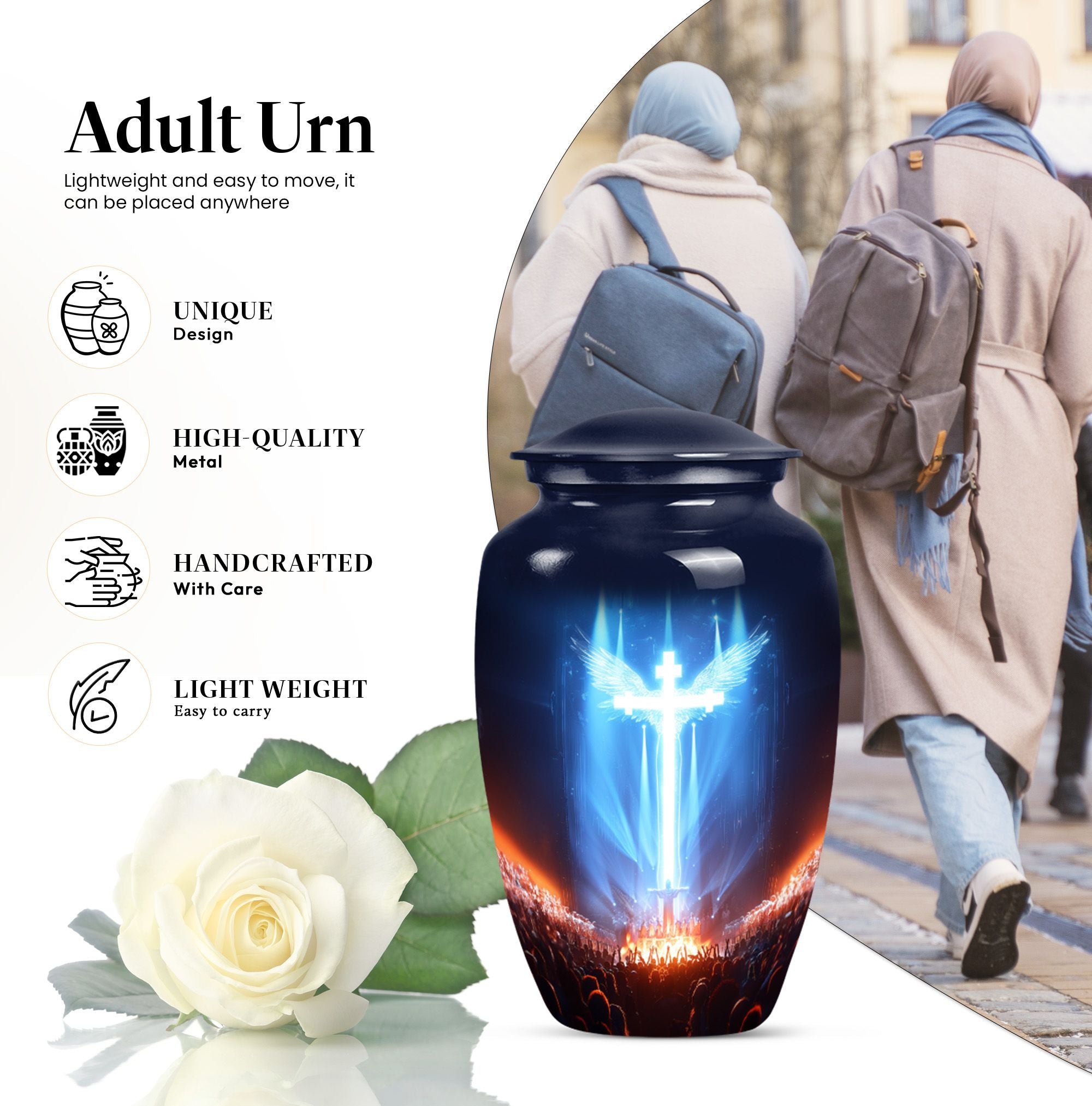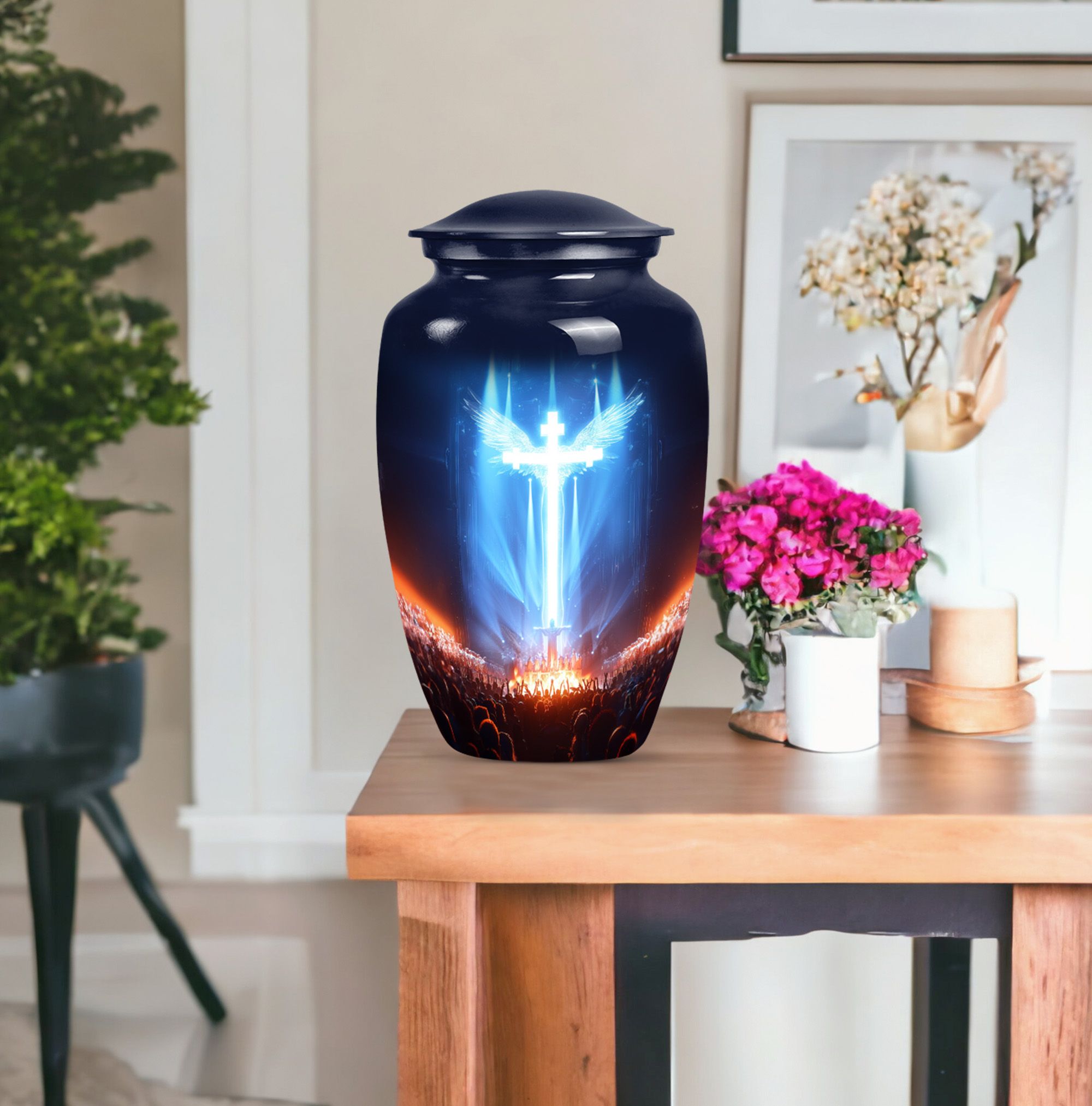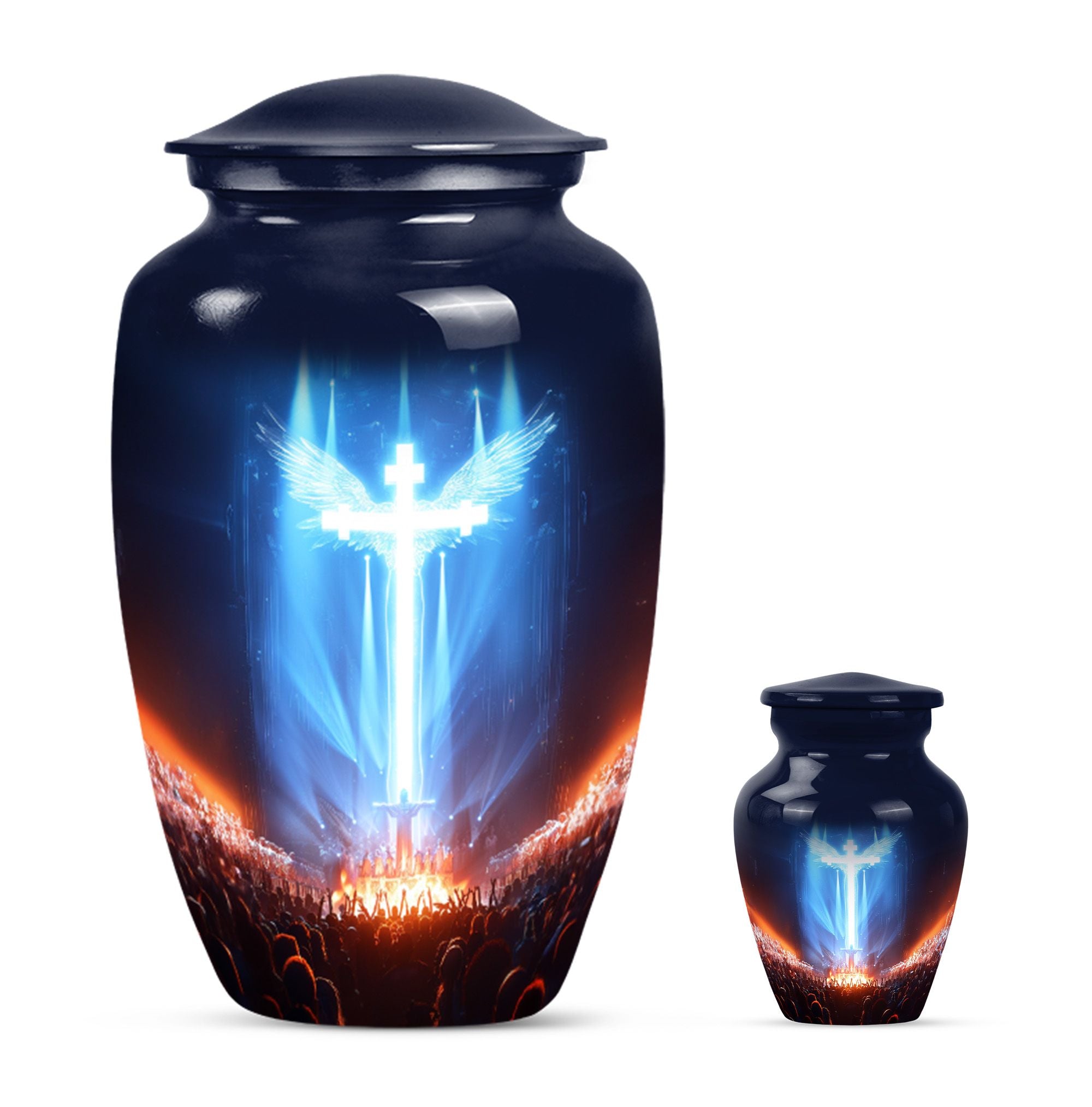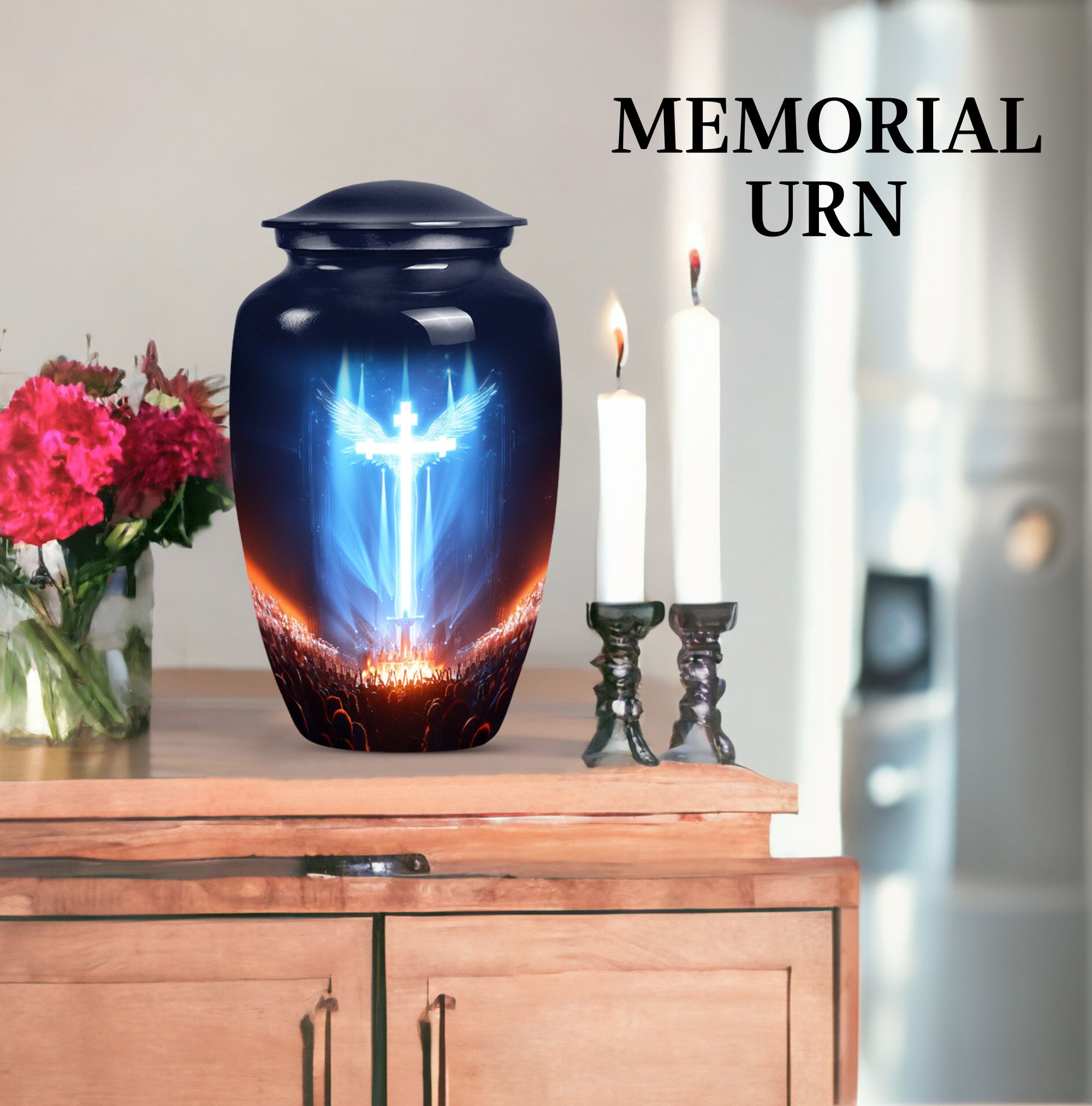 Witness the beauty of respect and honor radiated by this large, 10-inch cross urn, capturing the solemnity and honor of a memorial ceremony. Skilfully crafted from high-quality Aluminium, this funeral urn for human ashes flaunts an Aurora Borealis theme, adopting the majestic hues of the northern lights. Its robust construction ensures a durable weight of 3.3 pounds, ensuring it stands steady to cherish memories for years to come. Our urn is not just a vessel; it's a calming and thoughtful piece of art that integrates seamlessly with any environment. It comfortably holds up to 200 cubic inches of ashes, offering a fitting remembrance. Adding a personal touch, you can customize this urn with engraved names, letting the warmth and undying love persist. The urn is enclosed with a soft, velvet pouch perfect for containment of ashes. Exemplifying unique solidarity, our urn is a perfect match for those seeking non-traditional memorial forever urns or human cremation urns.