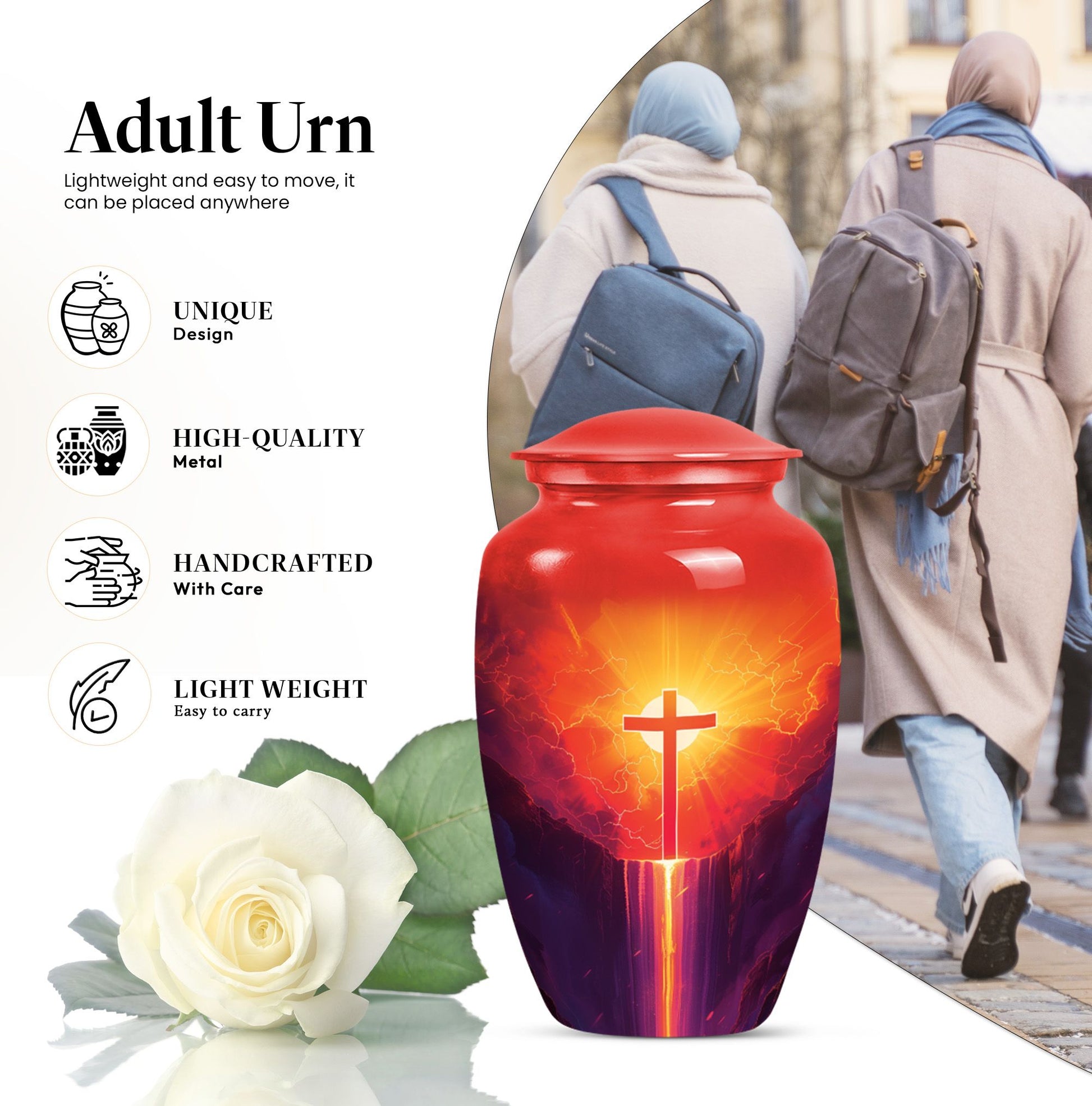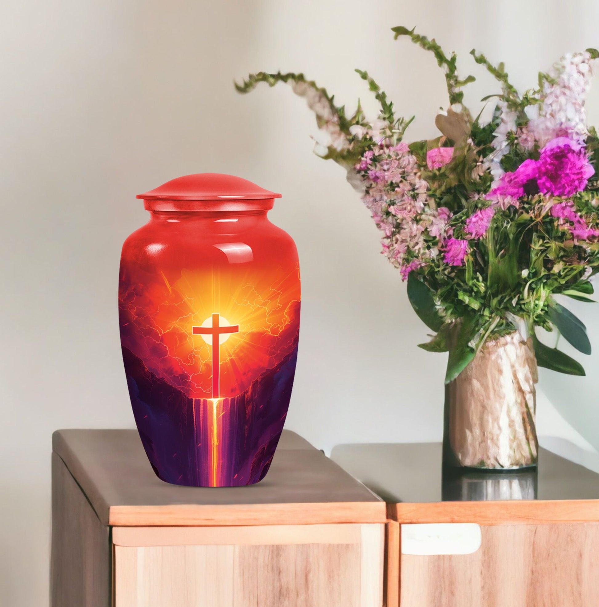 Our bespoke 10-inch Cross Urn is a dignified and respectful choice to preserve the memories of your departed loved ones. This large urn, weighing 3.3 pounds, has been intricately crafted from high-quality aluminum, ensuring longevity and durability. The aesthetic theme of Aurora Borealis provides an appealing celestial touch, commenced with a classic urn design that will seamlessly fit any decor. With a generous capacity, it can accommodate up to 200 cubic inches of cremains, sufficient for adult ashes. The urn is easily customizable, allowing for engraved names to add a personal touch. It comes coupled with a Velvet pouch intended for the safe containment of ashes, ensuring your cherished memories remain secure. This cremation urn beautifully encapsulates memorial burial essence, making it a significant artifact during periods of remembrance. Opt for this cross urn for a solemn, unique, and personal way to celebrate a life lived and loved. Ideal for funeral burials, it is a fitting tribute for adults and seniors.